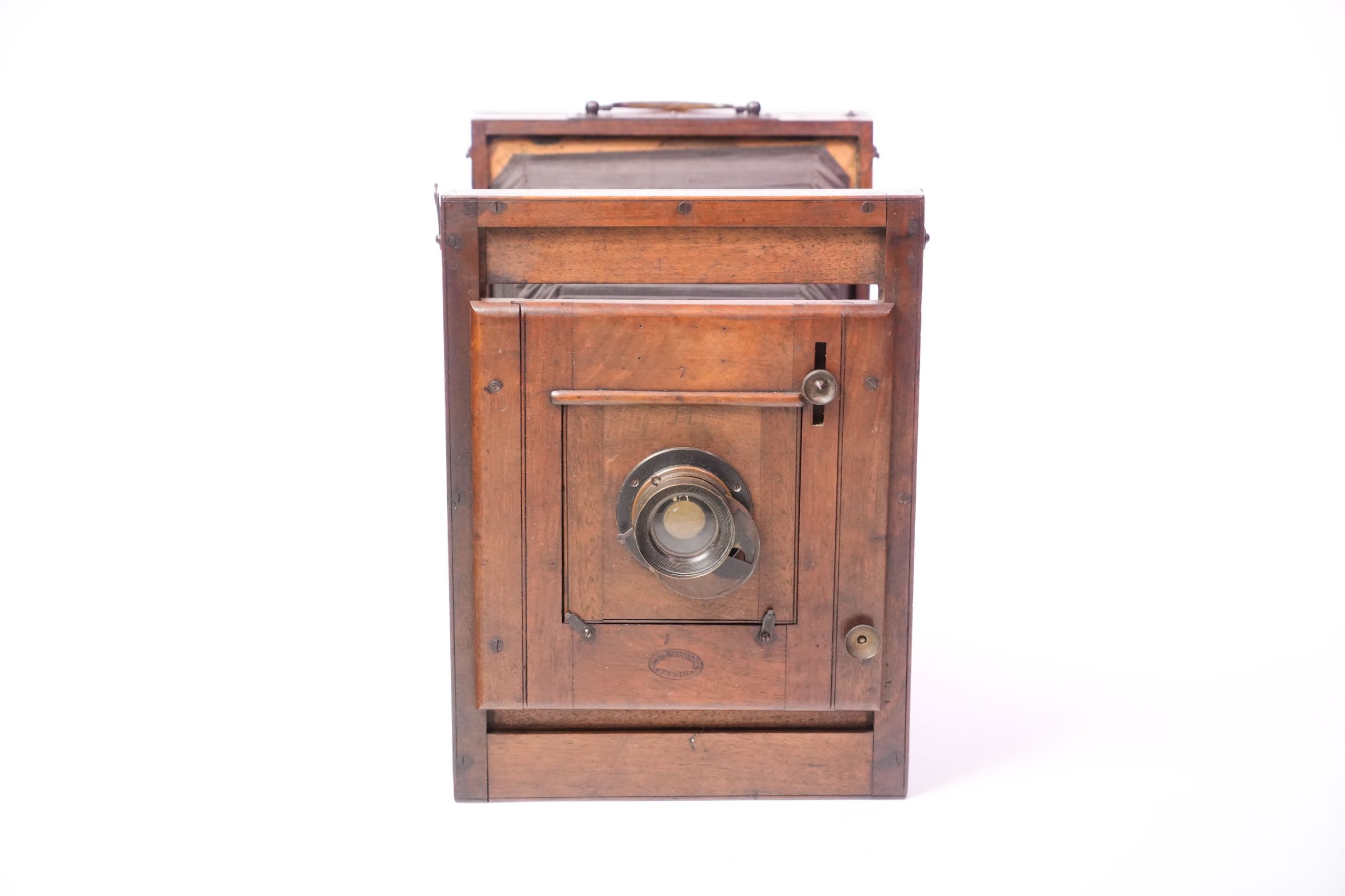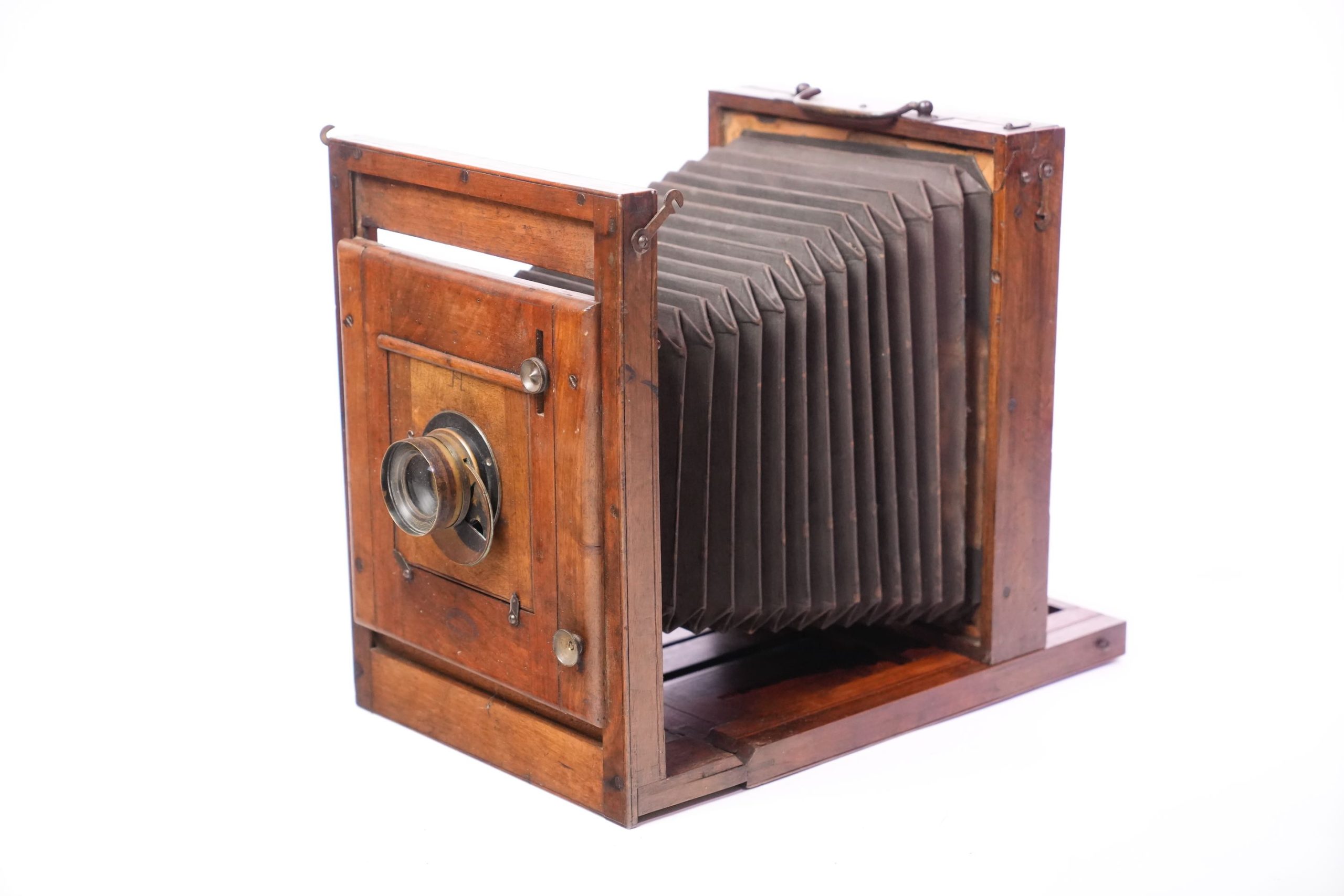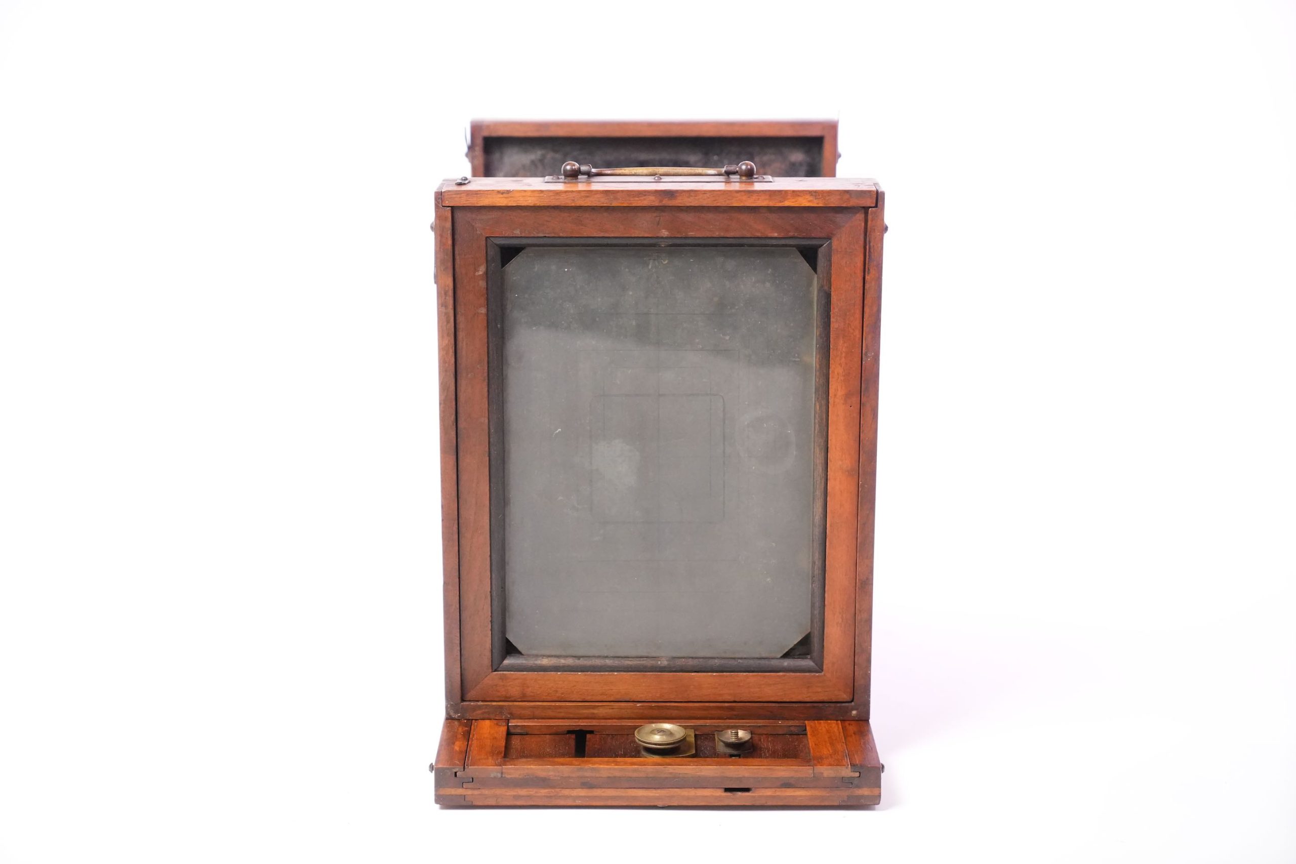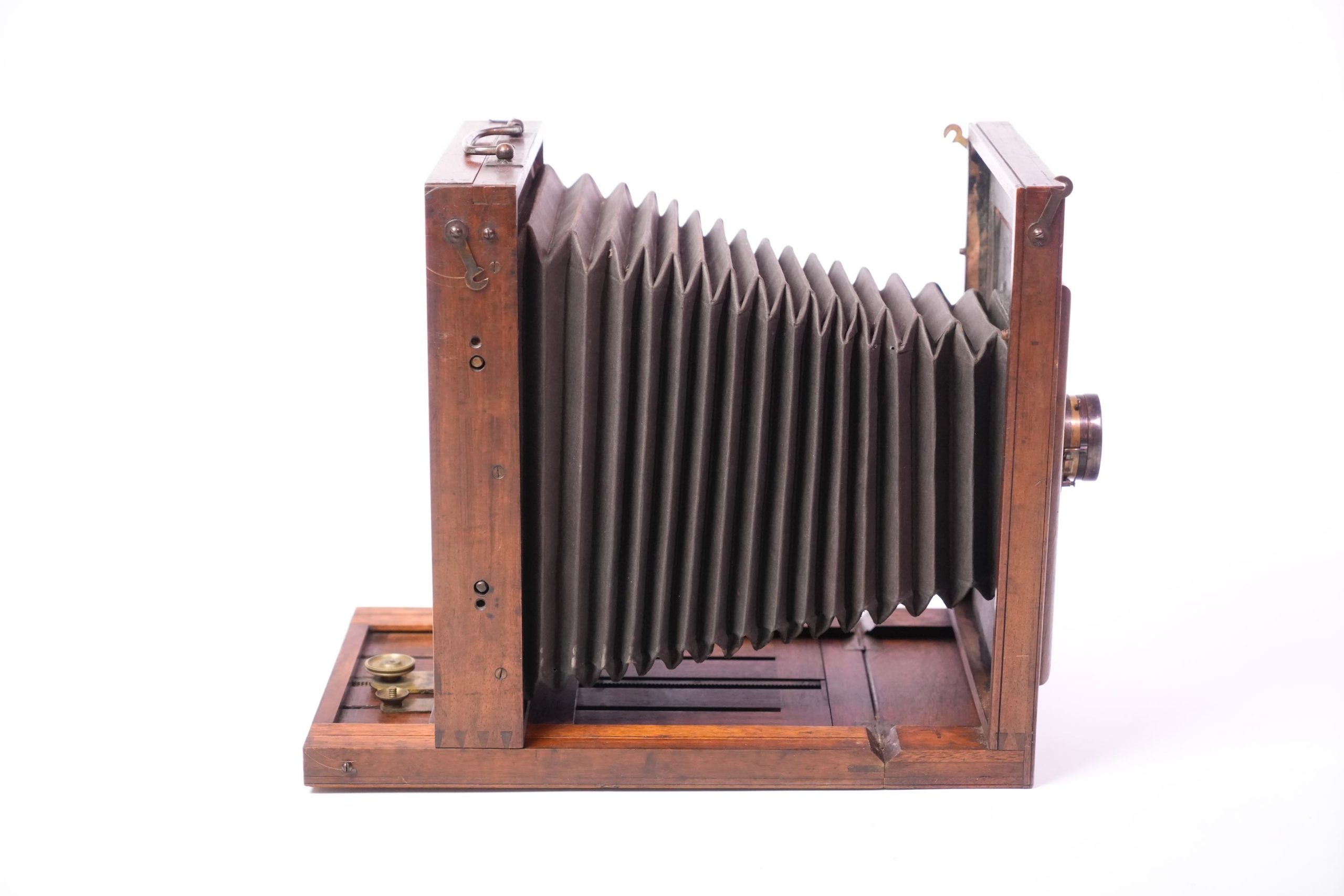 Chambre photographique d’époque au collodion sec, format 18 × 24 cm, vers 1870 Appareil de grand format typique de la transition entre le procédé au collodion humide et l’avènement des plaques au gélatino-bromure d’argent. Entièrement réalisé en noyer ciré avec ferrures en laiton poli, cet appareil combine élégance artisanale et précision fonctionnelle. Le soufflet noir permet le tirage variable pour la mise au point, tandis que la planchette avant accueille un objectif grand angle en laiton équipé d’un diaphragme rotatif. L’appareil est accompagné de 2 châssis doubles en bois pour plaques 18×24 cm, utilisés dans les ateliers ou pour la photographie d’extérieur.