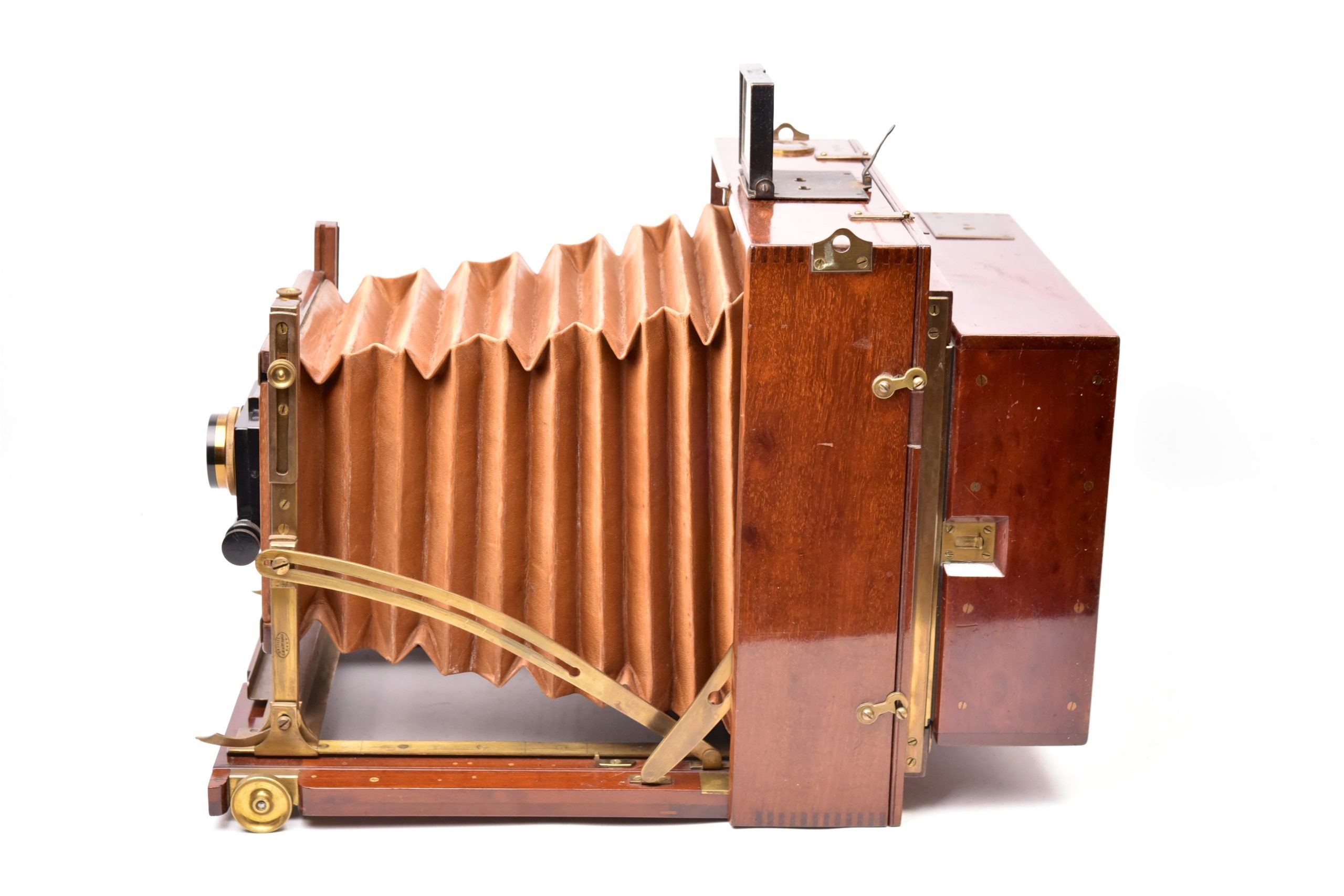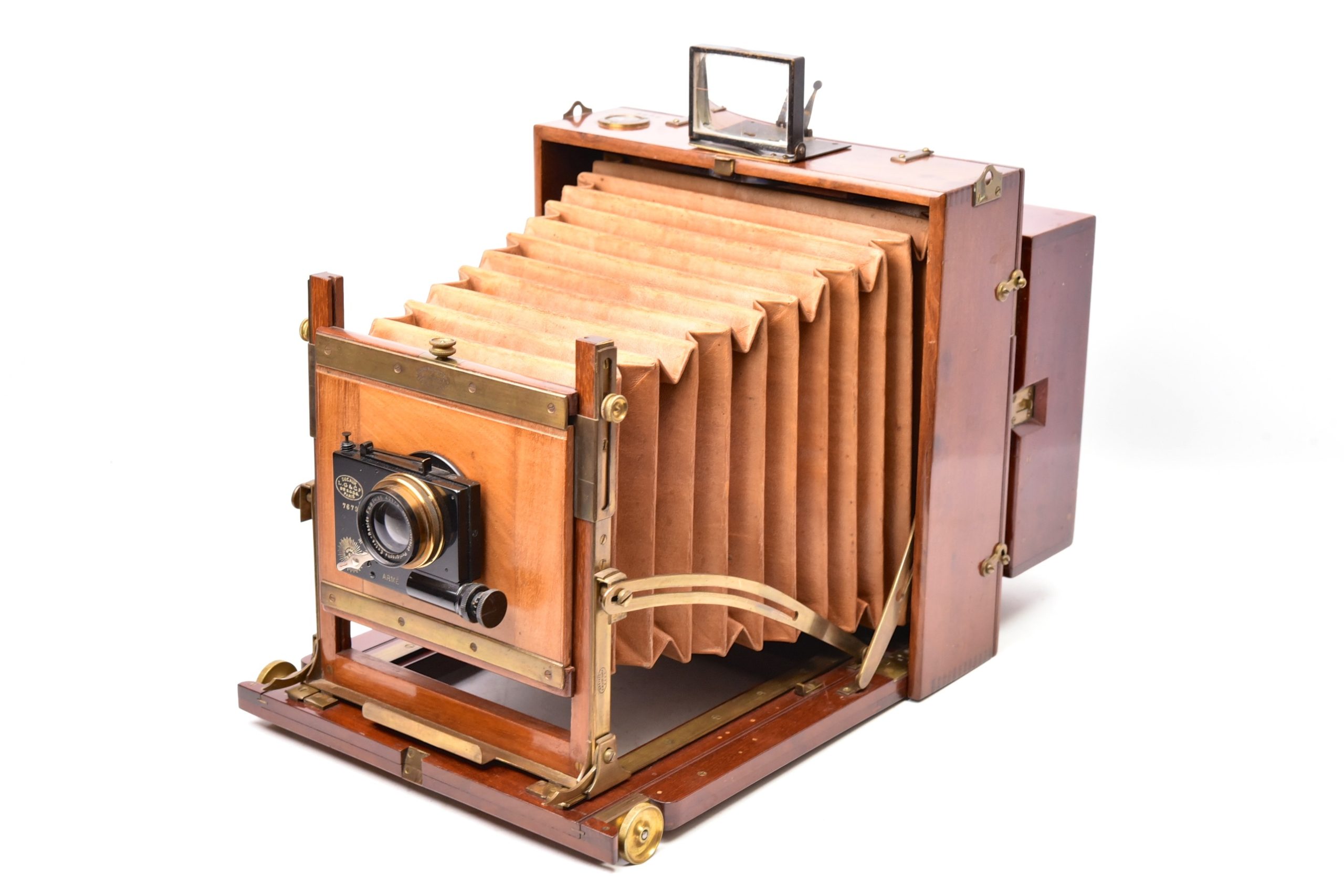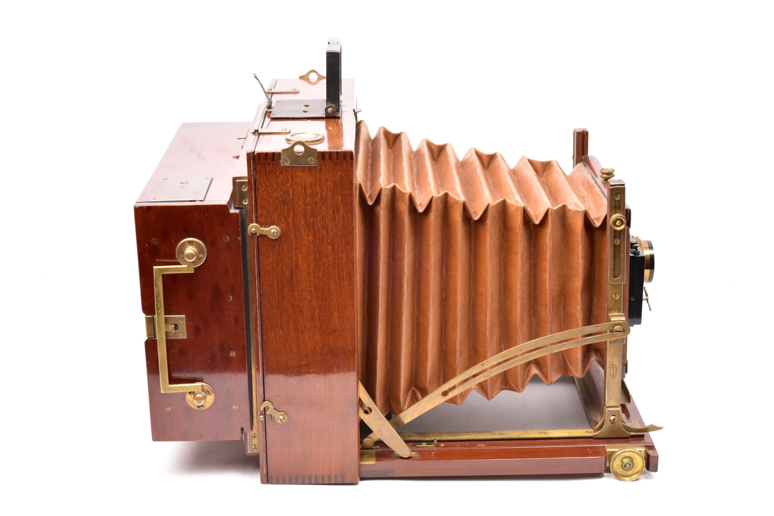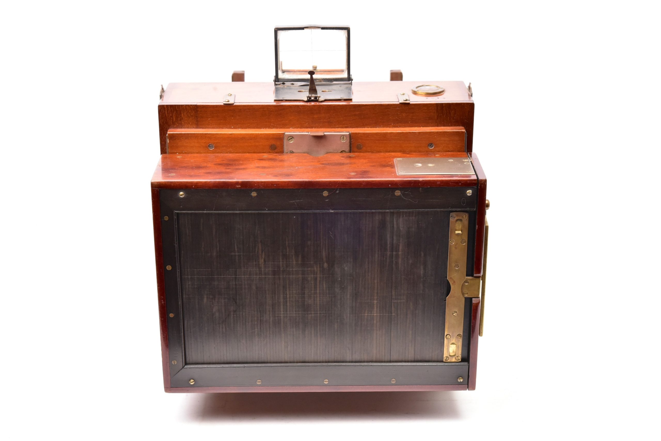 Chambre carrée Gaumont "Folding-Block-System". Ébénisterie en bel acajou. Long tirage. Dos carré permettant la prise de vue en hauteur ou en largeur par simple renversement du cadre mobile à l’arrière. Soufflet havane en peau à coins non rabattus. Très grand décentrement vertical possible. La chambre est équipée du rare dos Magasin 13x18 brevet Hanau. Elle possède un objectif Lacour Berthiot Périgraphe Extra-rapide 1:6,8 F=135, monté sur obturateur pneumatique Decaux. Vers 1905. Très bel appareil.