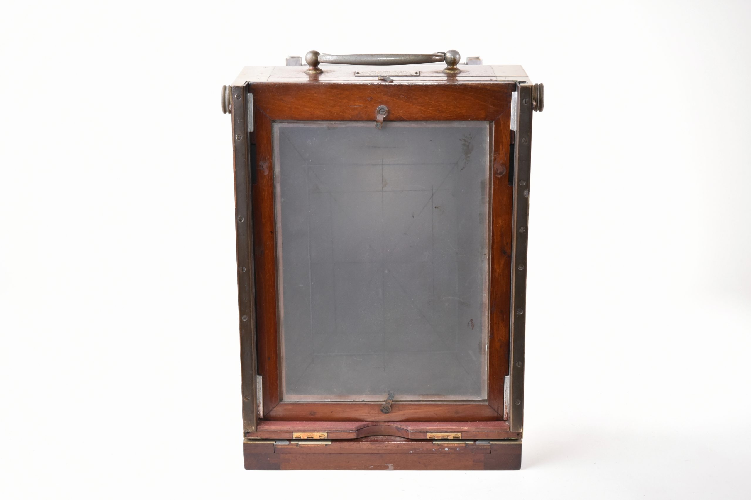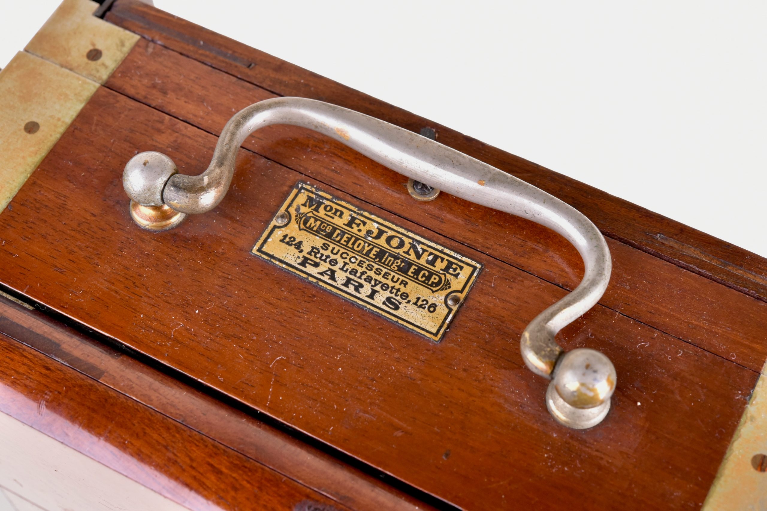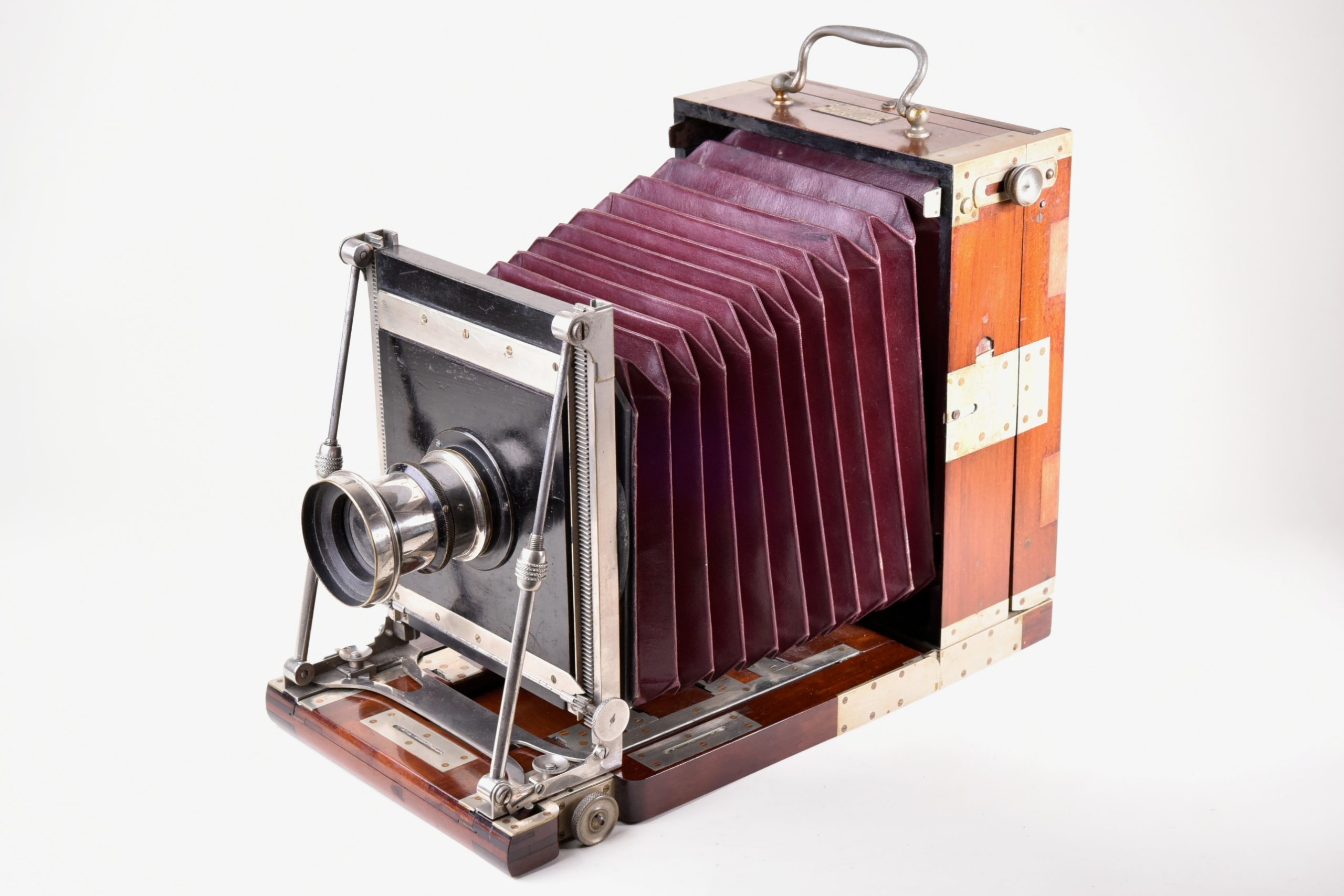 Chambre photographique « Jonte Touriste » 13x18, de type N°8. Elle a obtenu la médaille d’or à l’exposition universelle de Paris de 1889 ; la plus haute récompense en ébénisterie photographique. Cette chambre se recommande par son fonctionnement d’une précision absolue. Elle est entièrement construite en acajou verni, avec ferrures nickelées, soufflet cuir rouge, décentrement à crémaillère, bascule avant, cadre arrière pivotant à gauche et à droite. Glace dépolie quadrillée, niveau, écrou au pas du Congrès. Le modèle que nous proposons est celui perfectionné avec bascule arrière; il porte la plaque à l’enseigne de Maurice Deloye successeur de la Maison Jonte à partir de 1897. Très bel état.