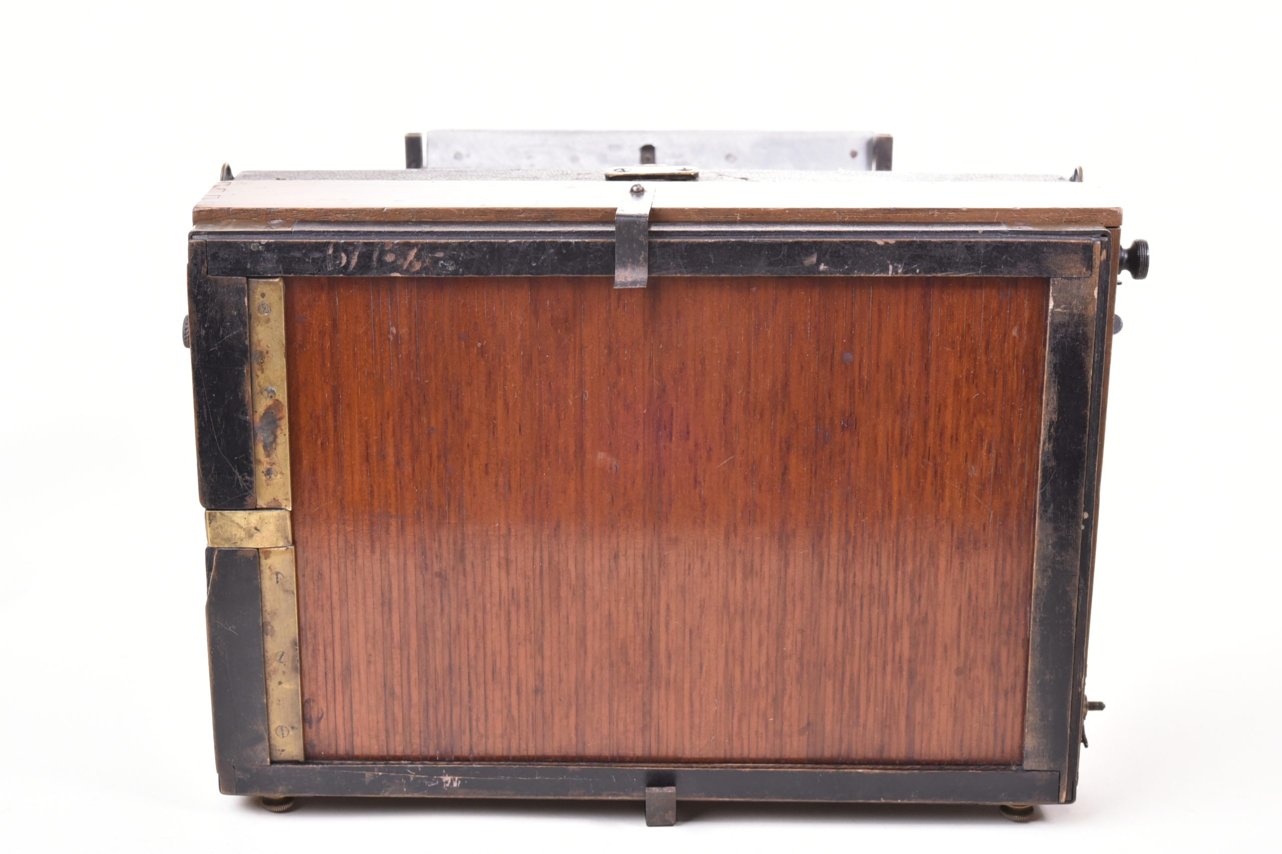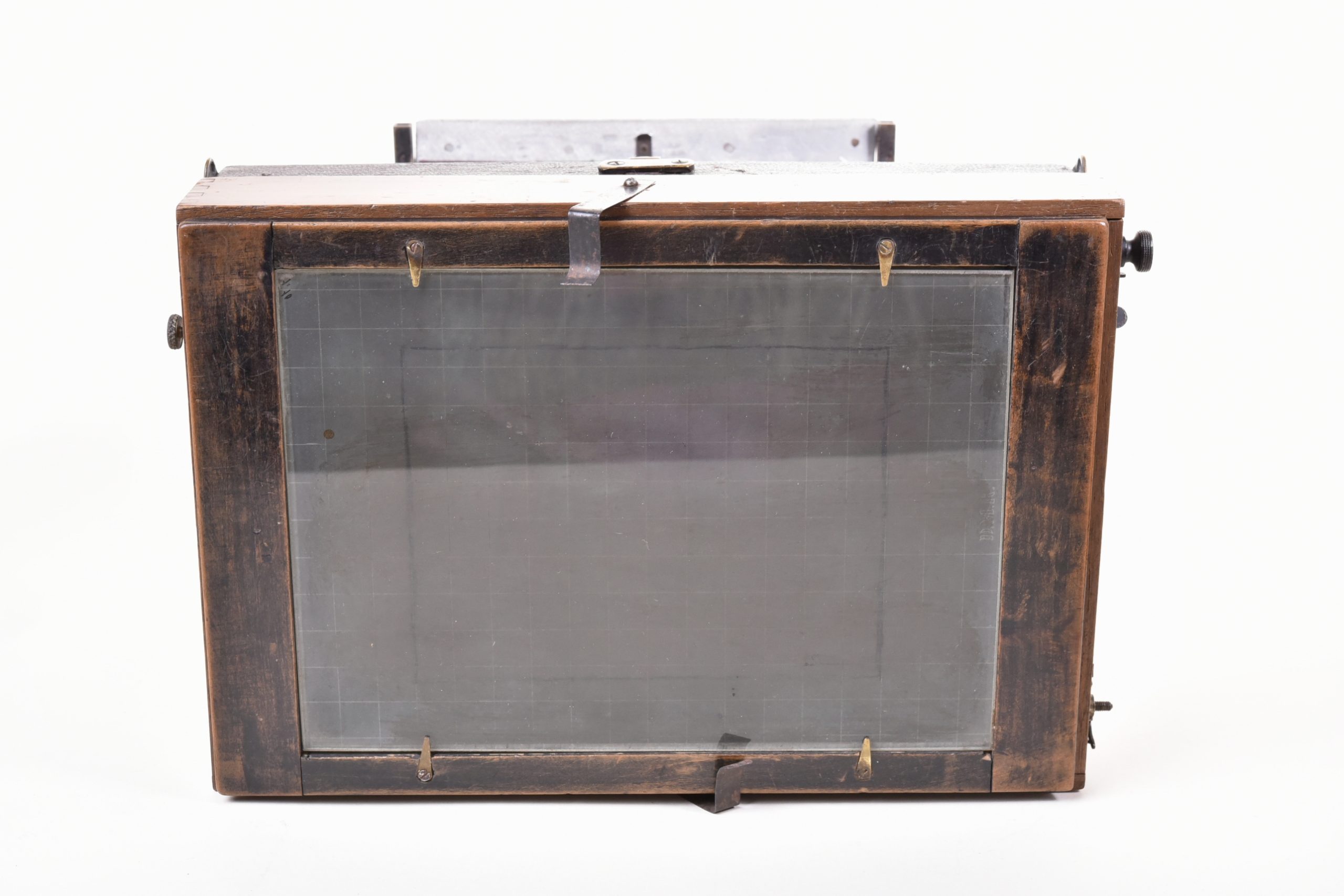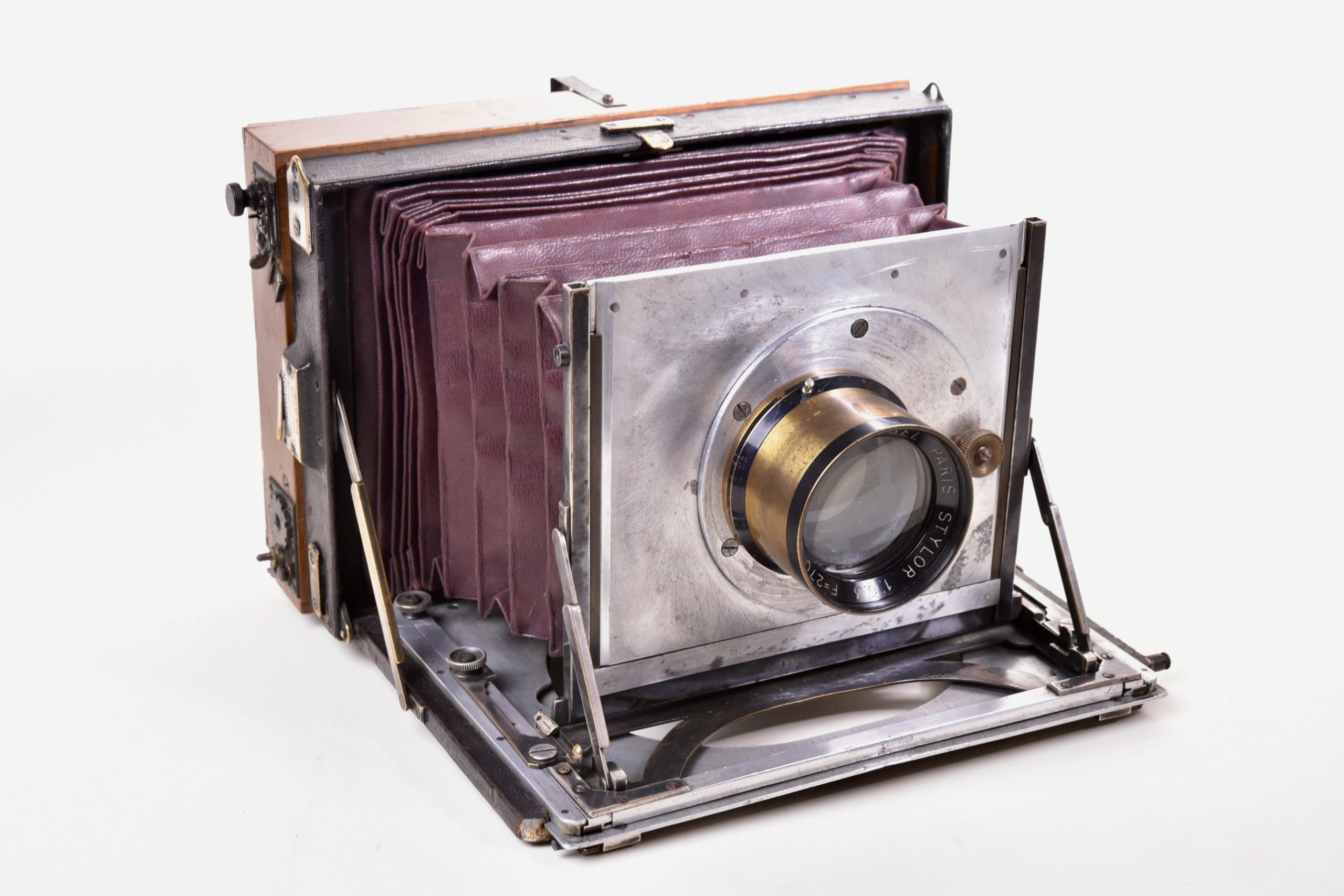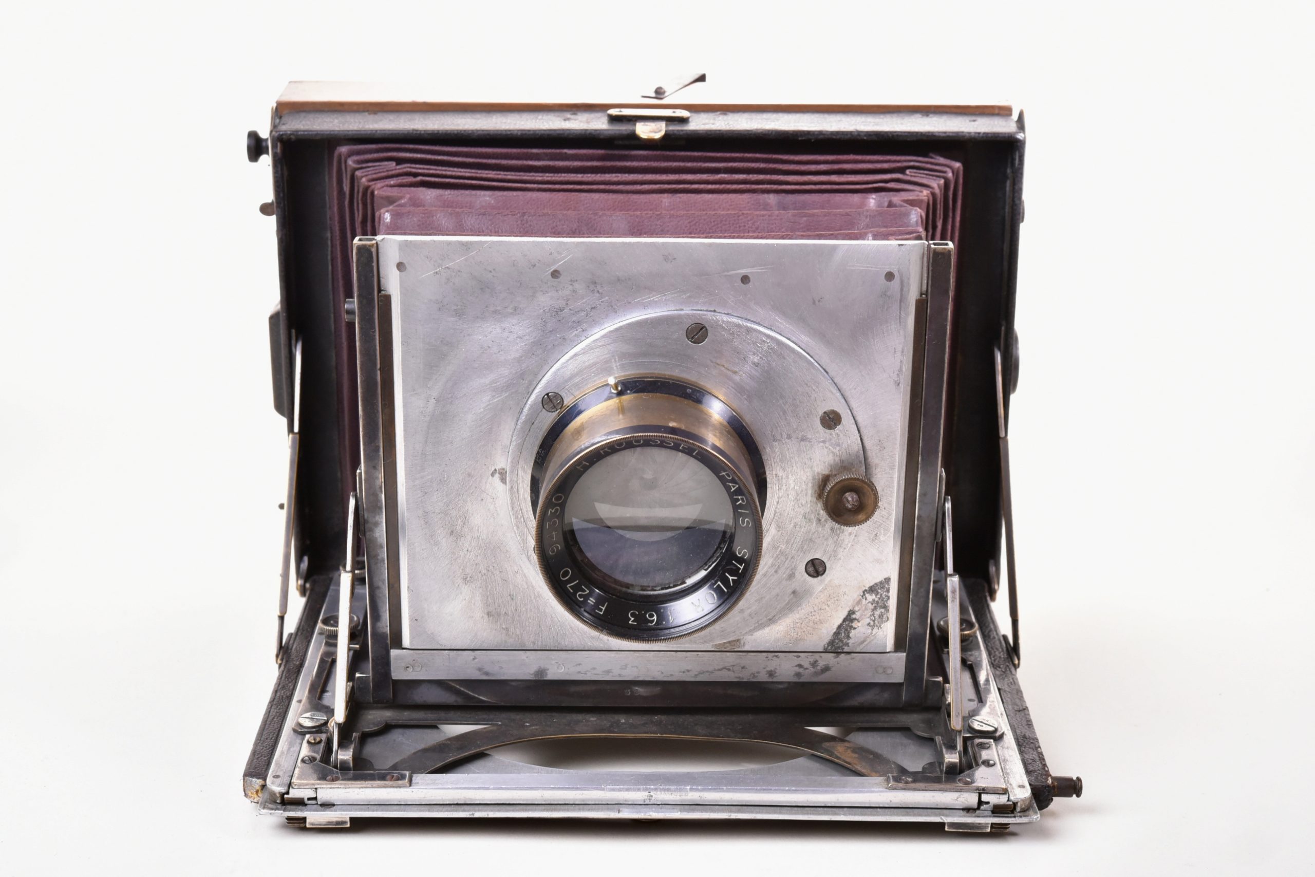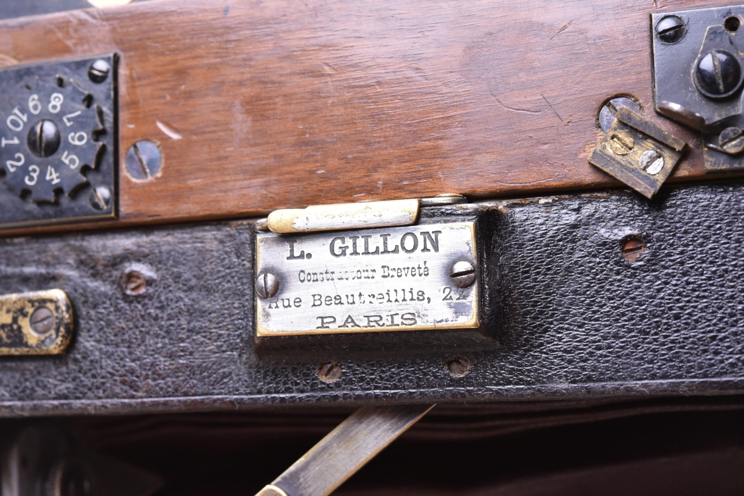 Chambre photographique métallique extra-plate Gillon. Format 13x18 horizontal. Le corps et l’abattant sont en aluminium gainé maroquin brun foncé. Les autres pièces métalliques sont en laiton nickelé. Cette chambre date de 1892 environ. A l’époque le concept est nouveau ; elle est relativement plus légère et moins encombrante que les autres du même format. Gillon a présenté un tel concept de chambre photographique à la Société Française de Photographie le 6 novembre 1891 et 1<sup>er</sup> avril 1892. La chambre est munie d’un objectif Roussel Stylor 1 :6,3 de focale 27 cm et d’un obturateur focal à rideau placé à l’arrière. La chambre porte la plaque « L. Gillon – Constructeur Breveté – Rue Beautreille, 22, Paris ». Présence d’un châssis à doubles volets articulés et du cadre avec verre dépoli. Appareil peu courant.