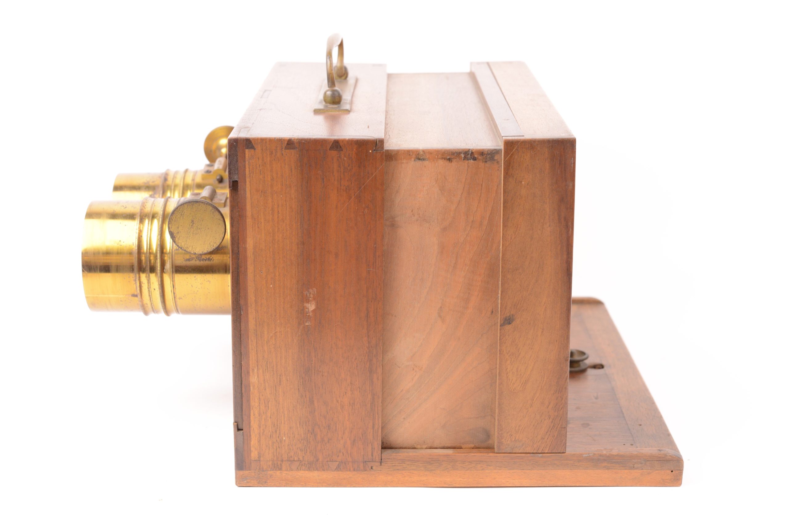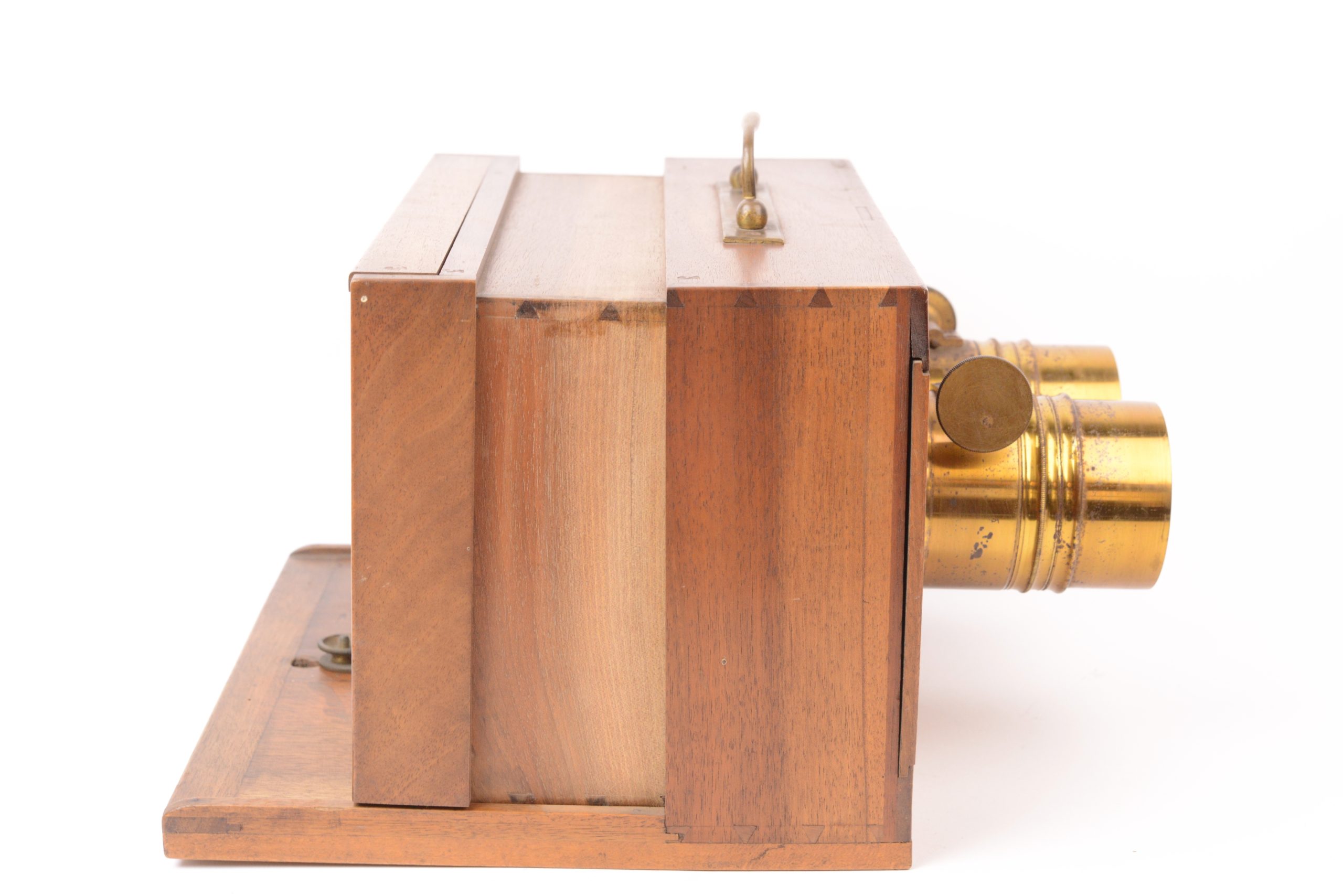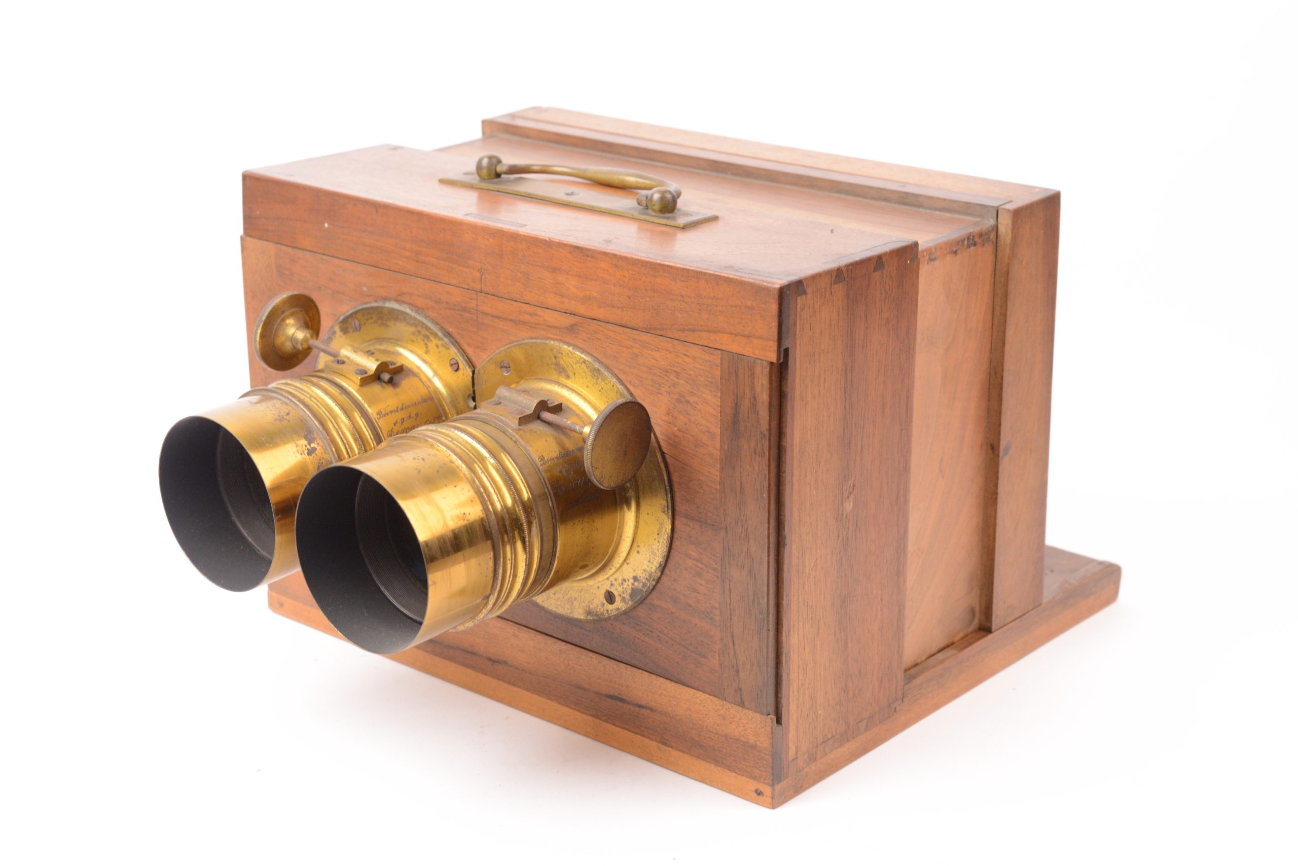 Chambre photographique stéréoscopique à tiroir Derogy. Belle fabrication traditionnelle française. Ébénisterie en noyer avec assemblages par queues d’aronde. Format 9x18 cm. Objectifs réglables par molette agissant sur crémaillère portant mentions « <em>Brevet d’invention s.g.d.g.  Derogy Opticien à Paris</em> ». Cadre arrière amovible portant verre dépoli. Poignée de transport en laiton. Vers 1850 /55. Très bel état.