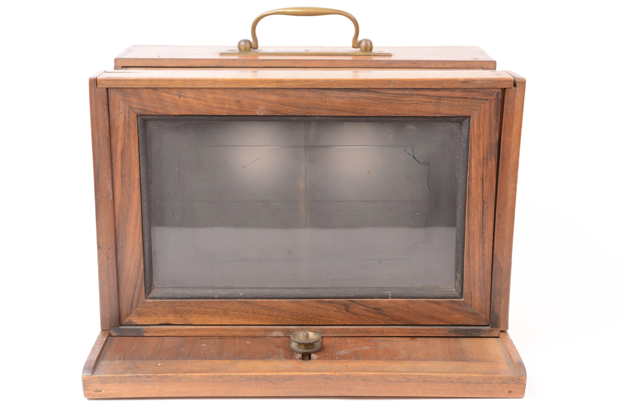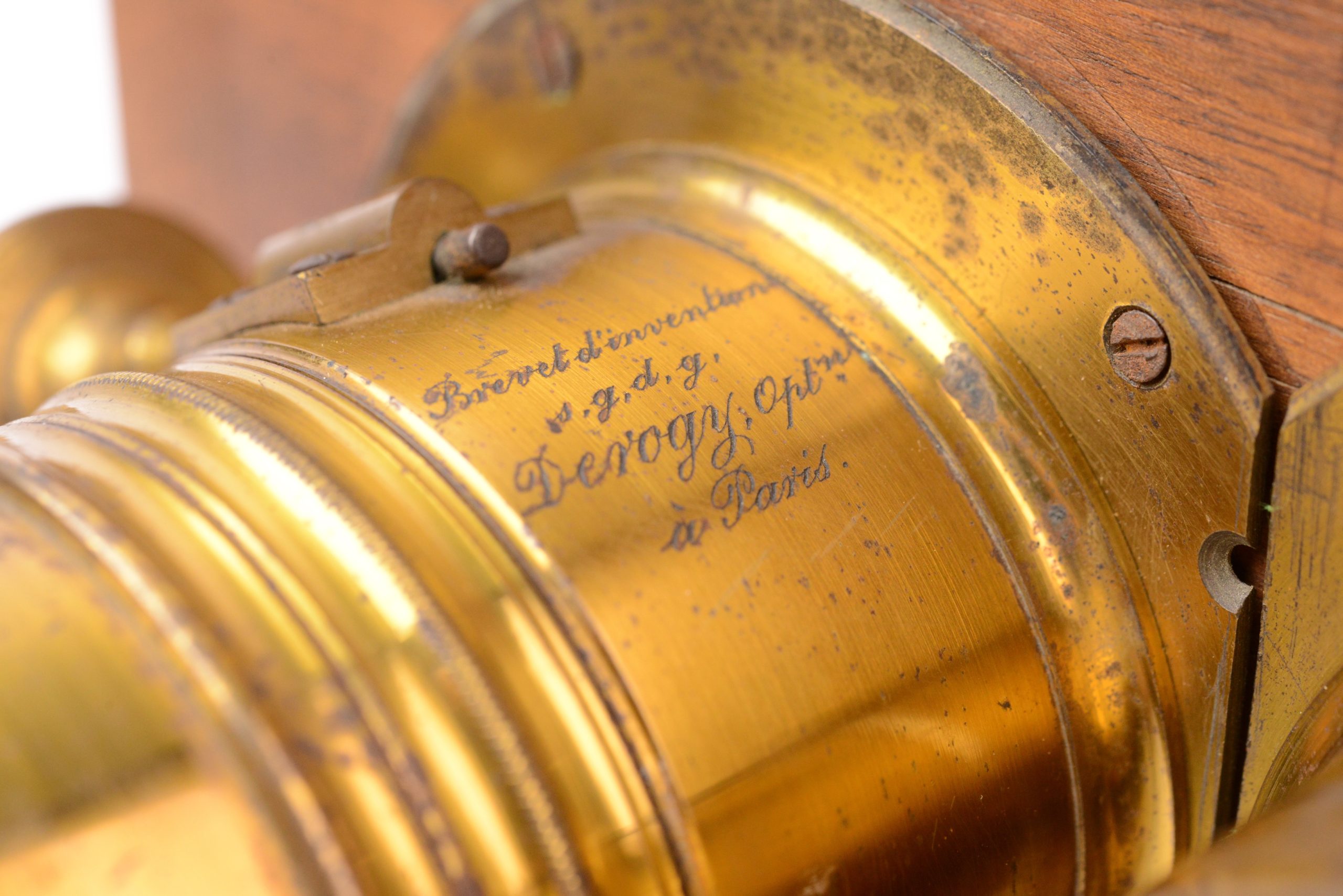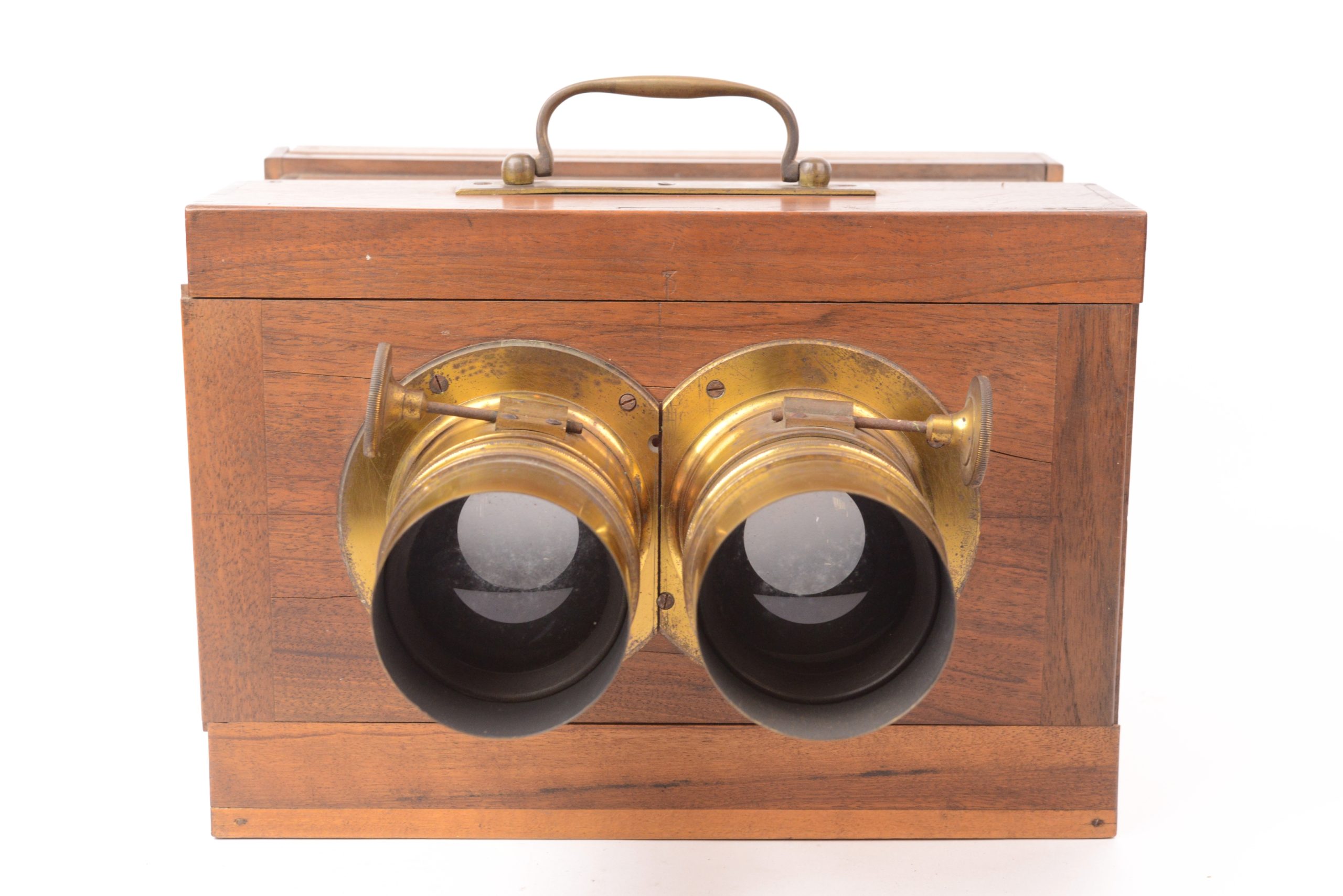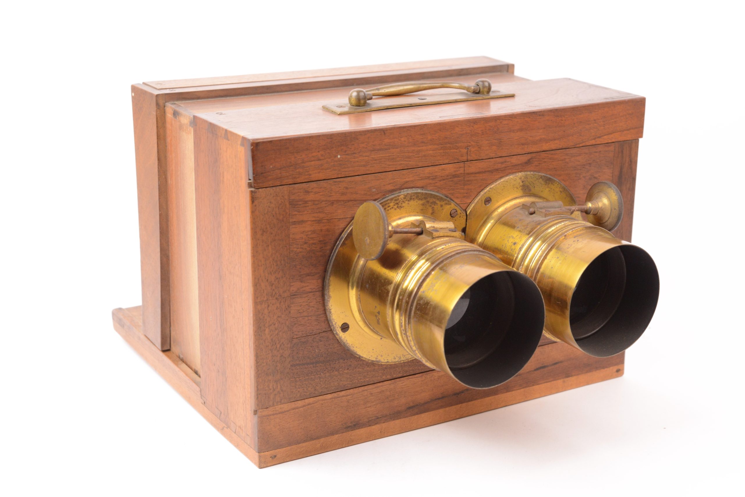 Chambre photographique stéréoscopique à tiroir Derogy. Belle fabrication traditionnelle française. Ébénisterie en noyer avec assemblages par queues d’aronde. Format 9x18 cm. Objectifs réglables par molette agissant sur crémaillère portant mentions « <em>Brevet d’invention s.g.d.g.  Derogy Opticien à Paris</em> ». Cadre arrière amovible portant verre dépoli. Poignée de transport en laiton. Vers 1850 /55. Très bel état.
