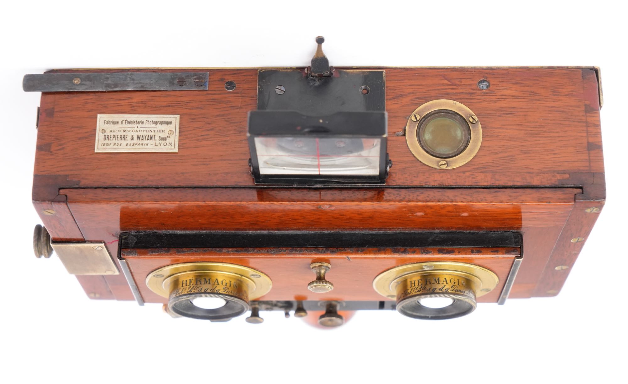 <div class="available-middle-text">Singulière chambre photographique du fabriquant lyonnais Drepierre et Wayant. Outre la qualité de l'ébénisterie on peut noter le fait que cette chambre n'offre aucun tirage. La distance n'est pas modifiable et a du être calculée par rapport aux objectifs grand angle Hermagis qui l'équipent. Au niveau des fonctionnalités on retrouve un obturateur, une planchette d'objectifs amovible, un niveau à bulle, un viseur pliant et une poignée qui vient se visser sous l'appareil.</div>