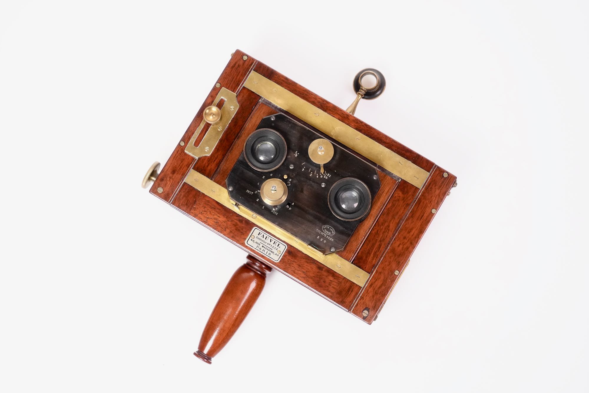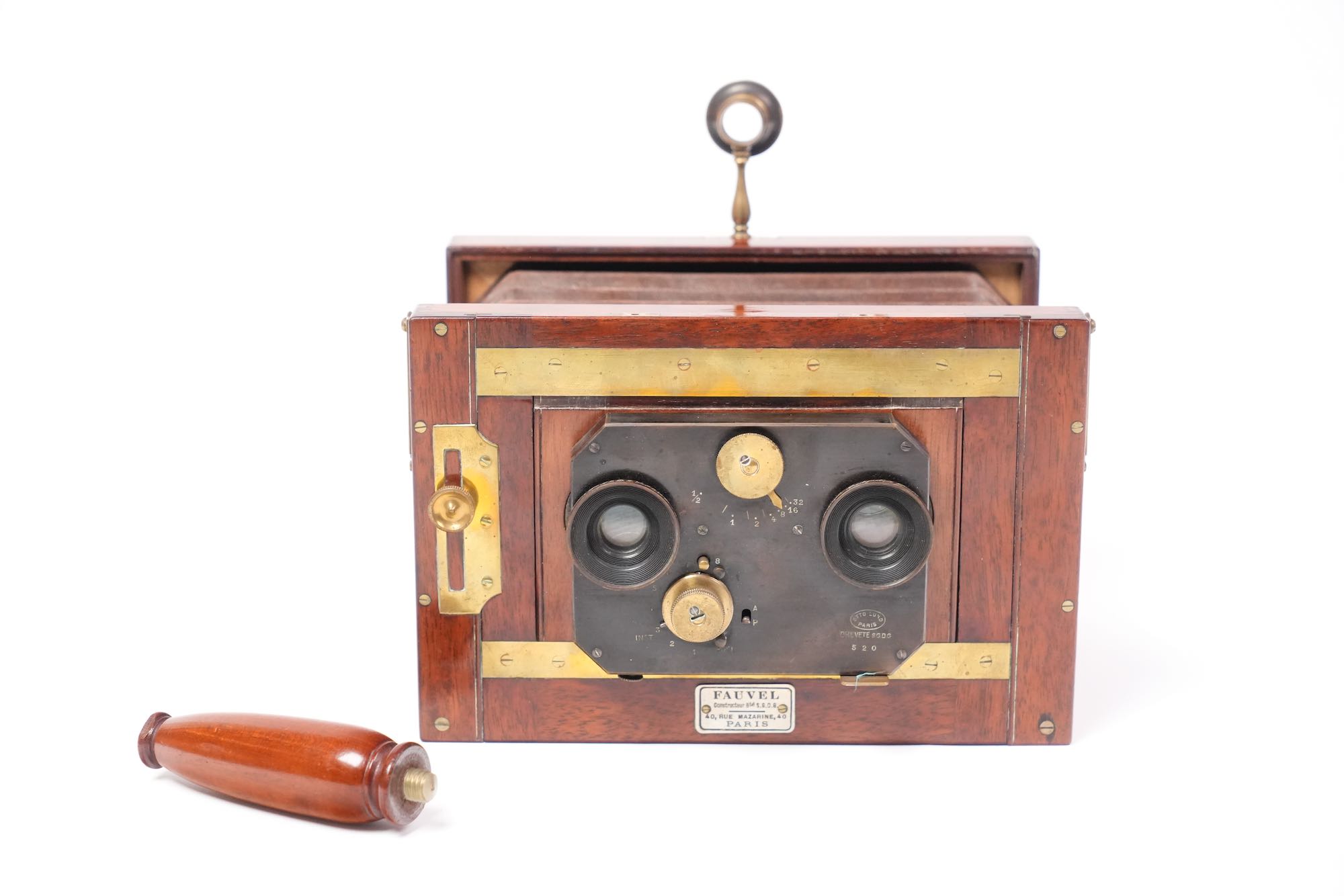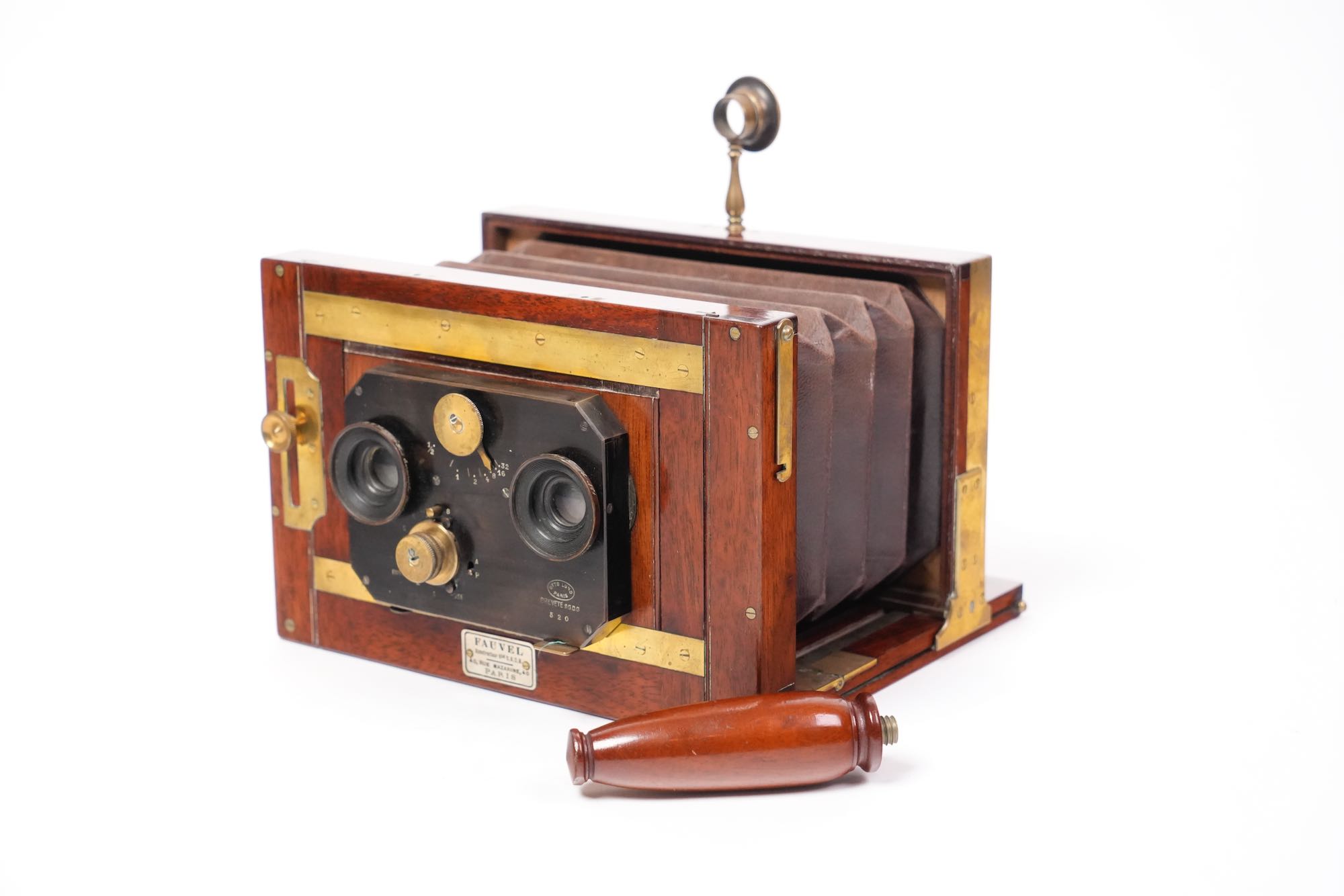 Rare chambre stéréoscopique en acajou et laiton, construite par Fauvel, opticien et fabricant d’appareils photographiques établi 19, passage des Panoramas à Paris, vers 1890–1900. Cet appareil de qualité supérieure illustre le savoir-faire français de la fin du XIXᵉ siècle dans la conception de chambres destinées à la photographie stéréoscopique.