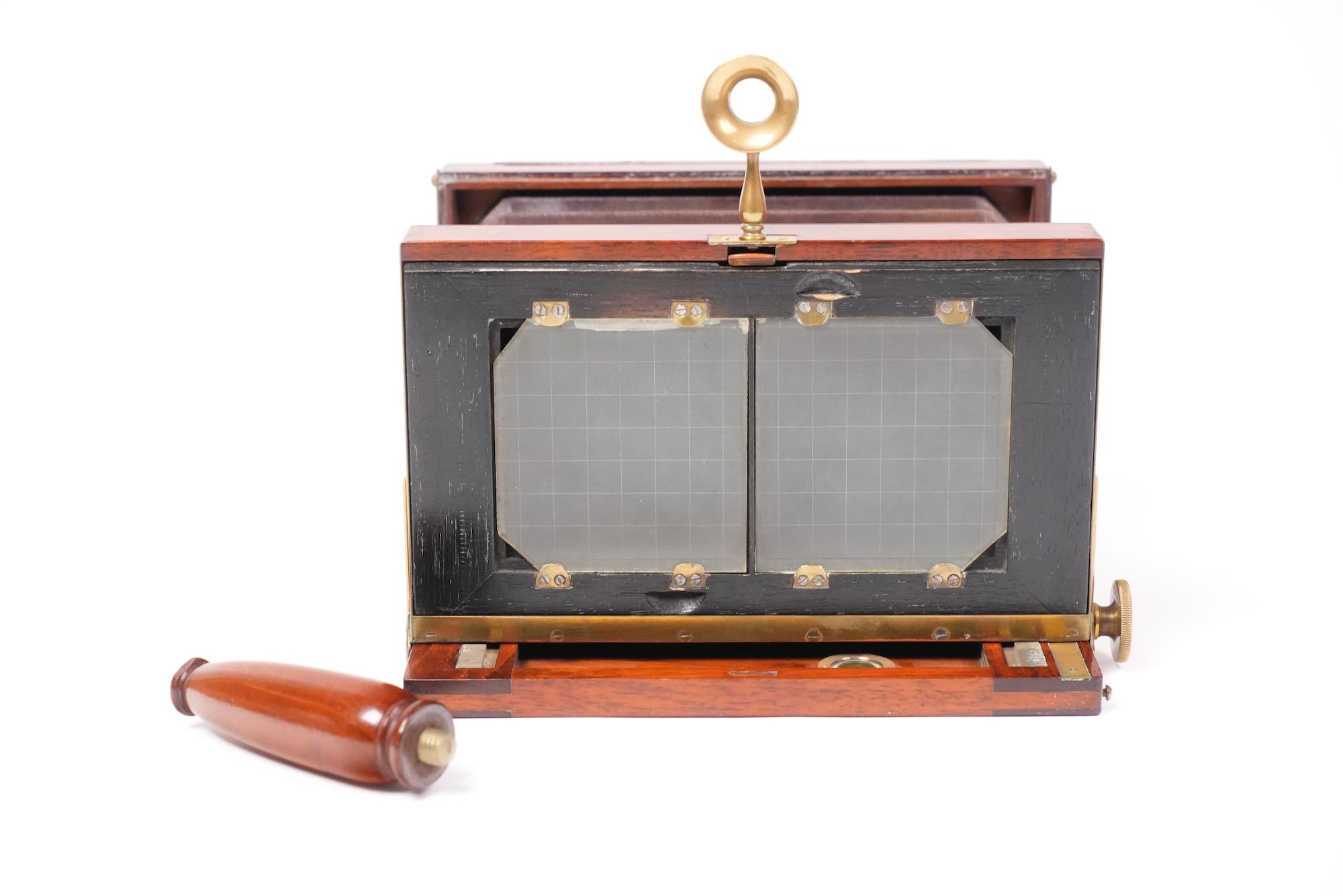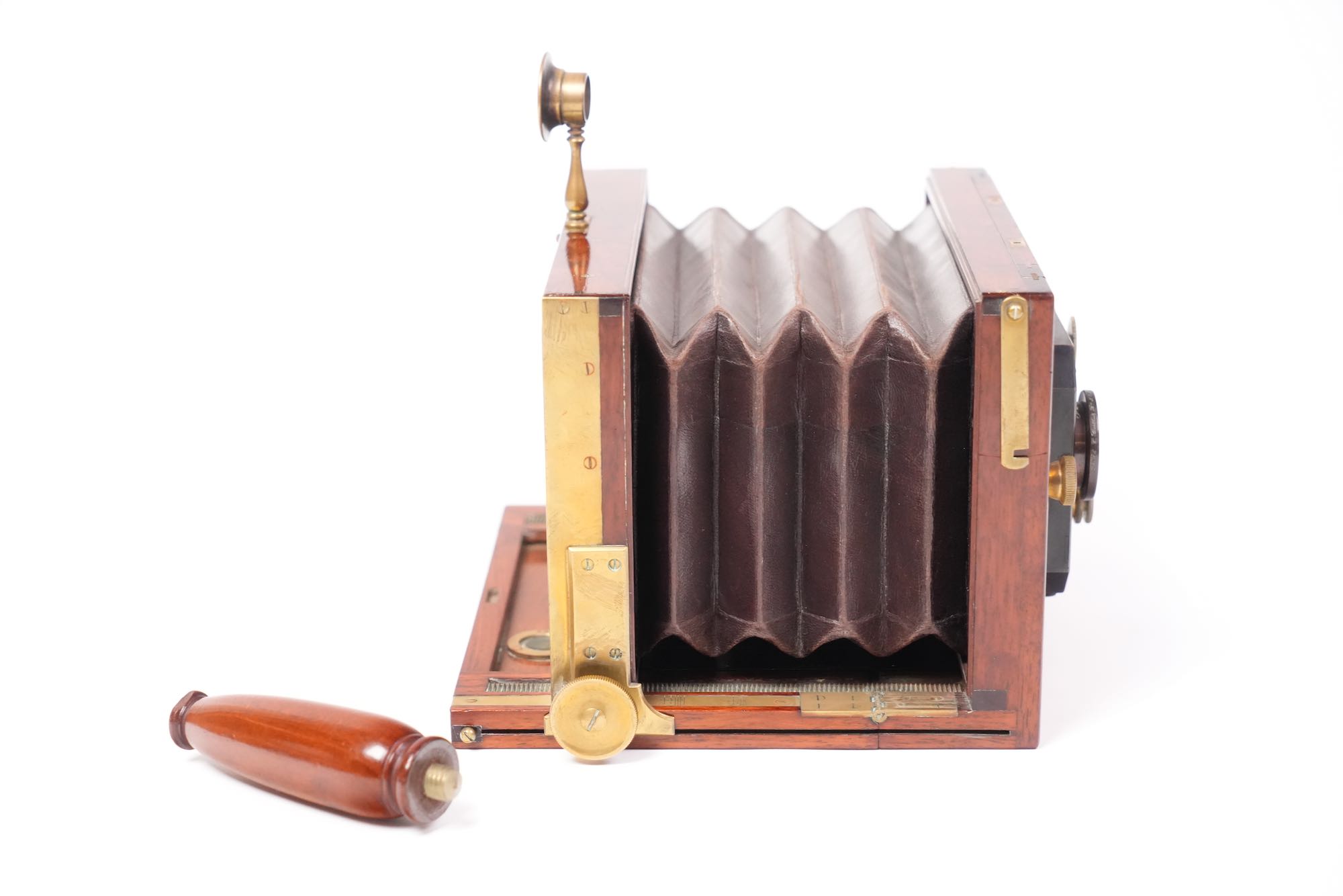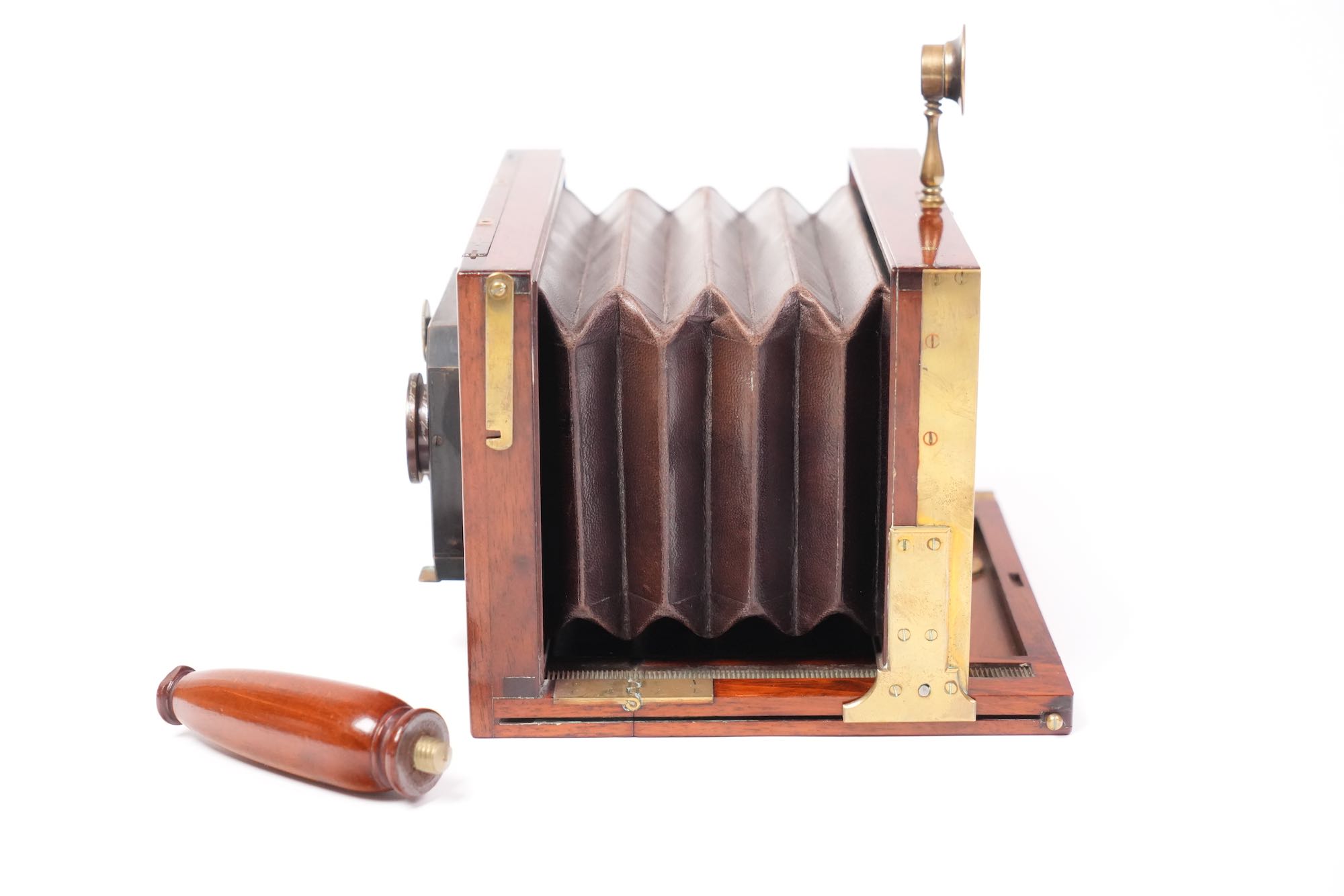 L’appareil est équipé d’un jeu de deux objectifs Hermagis montés sur une planchette frontale en ébène, avec commandes indépendantes d’obturation et de diaphragme, ainsi qu’un viseur rabattable. Le corps pliant à soufflet en cuir, encadré de pièces de laiton poli, se replie dans un boîtier compact muni d’une poignée en bois tourné amovible, typique des appareils portatifs de l’époque.