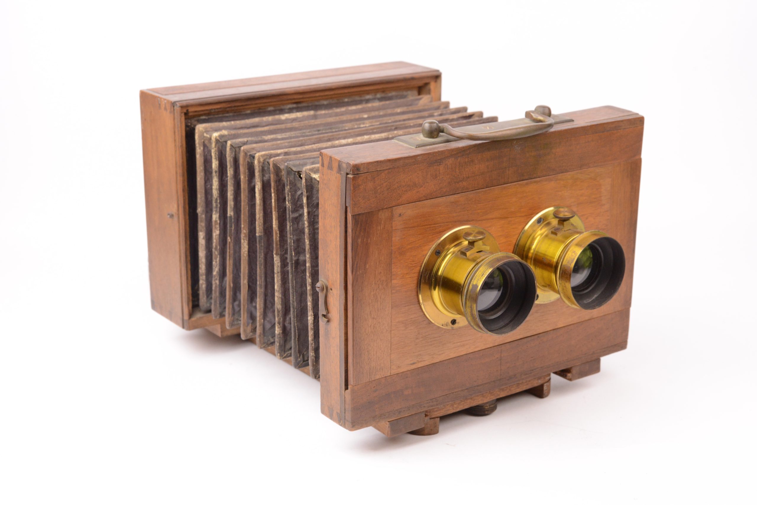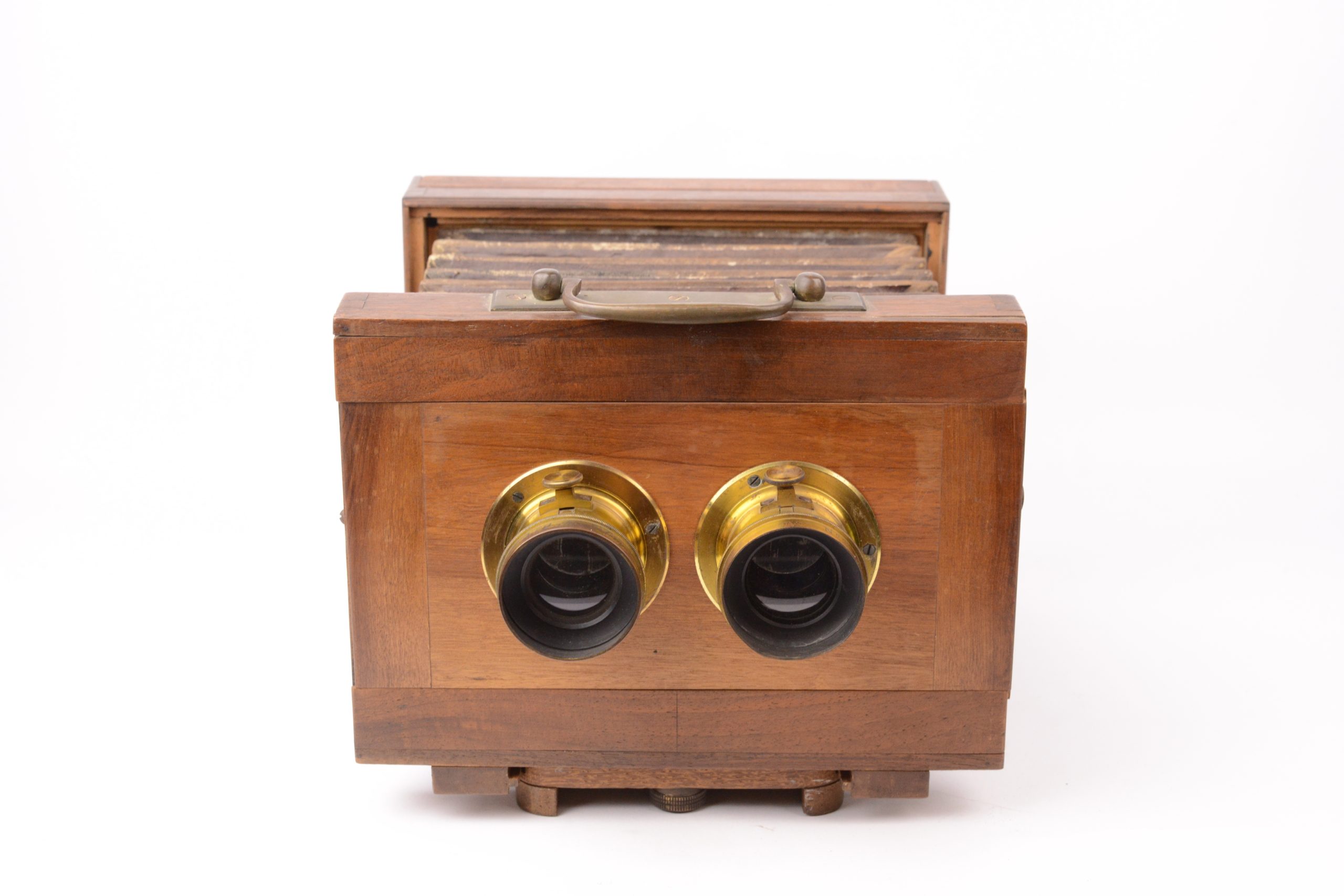 Chambre stéréoscopique monorail Darlot. Epoque collodion, vers 1855/1860. Paire d'objectif A. Darlot Hémisphérique Rapide. Belle construction traditionnelle française en vieux noyer, avec assemblage par queues d’aronde. Soufflet d’époque, rigide, à coins non rabattus, en cuir et papier. Les corps avant et arrière prennent place tous deux sur le support monorail sur lequel ils se positionnent par vis papillon. Cadre amovible portant verre dépoli. Bel état.