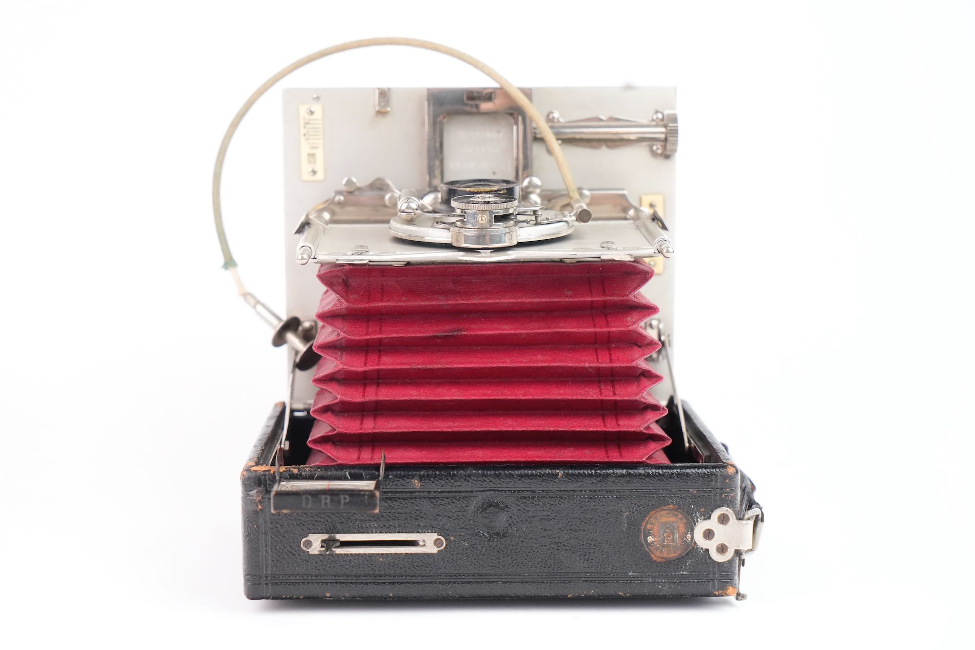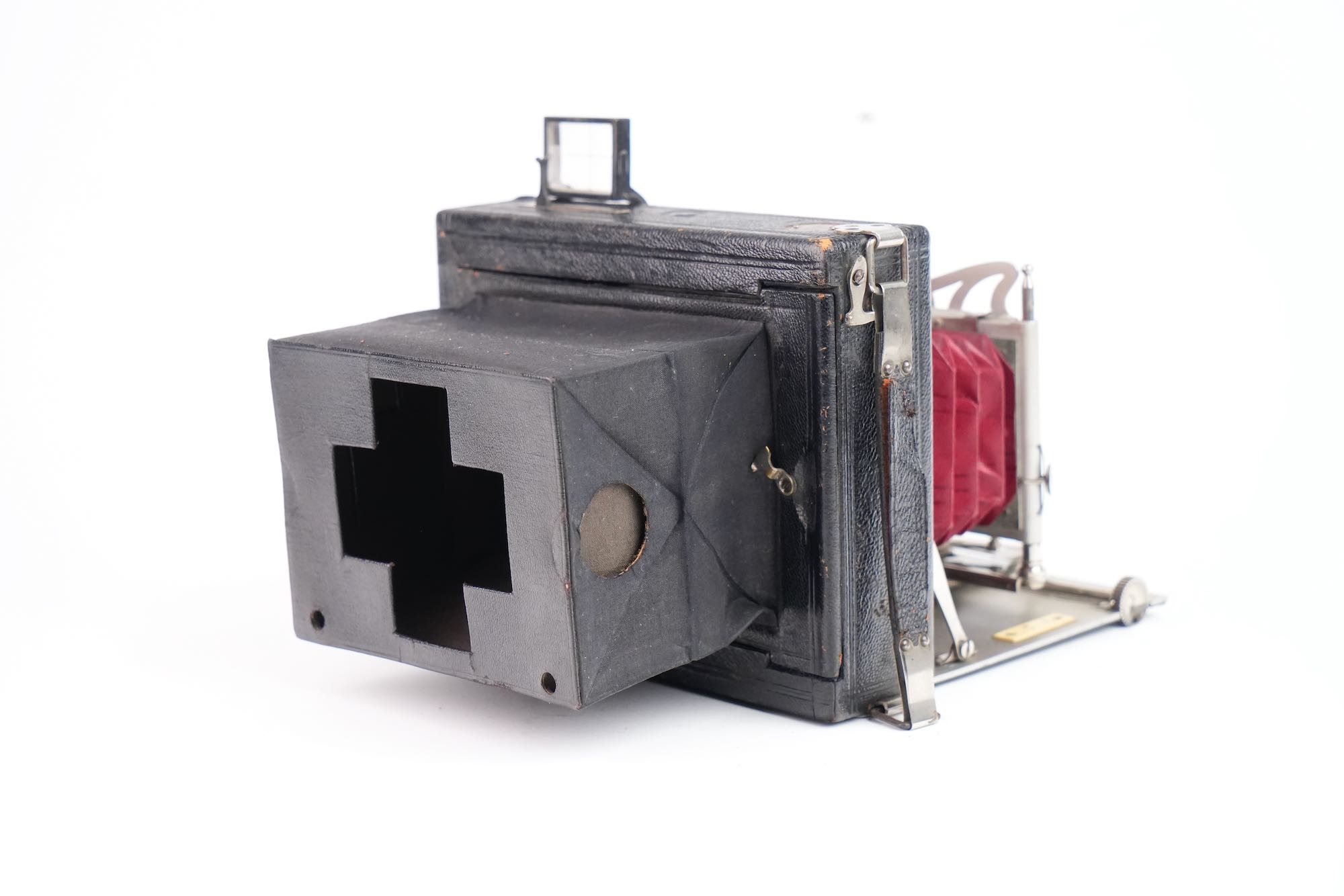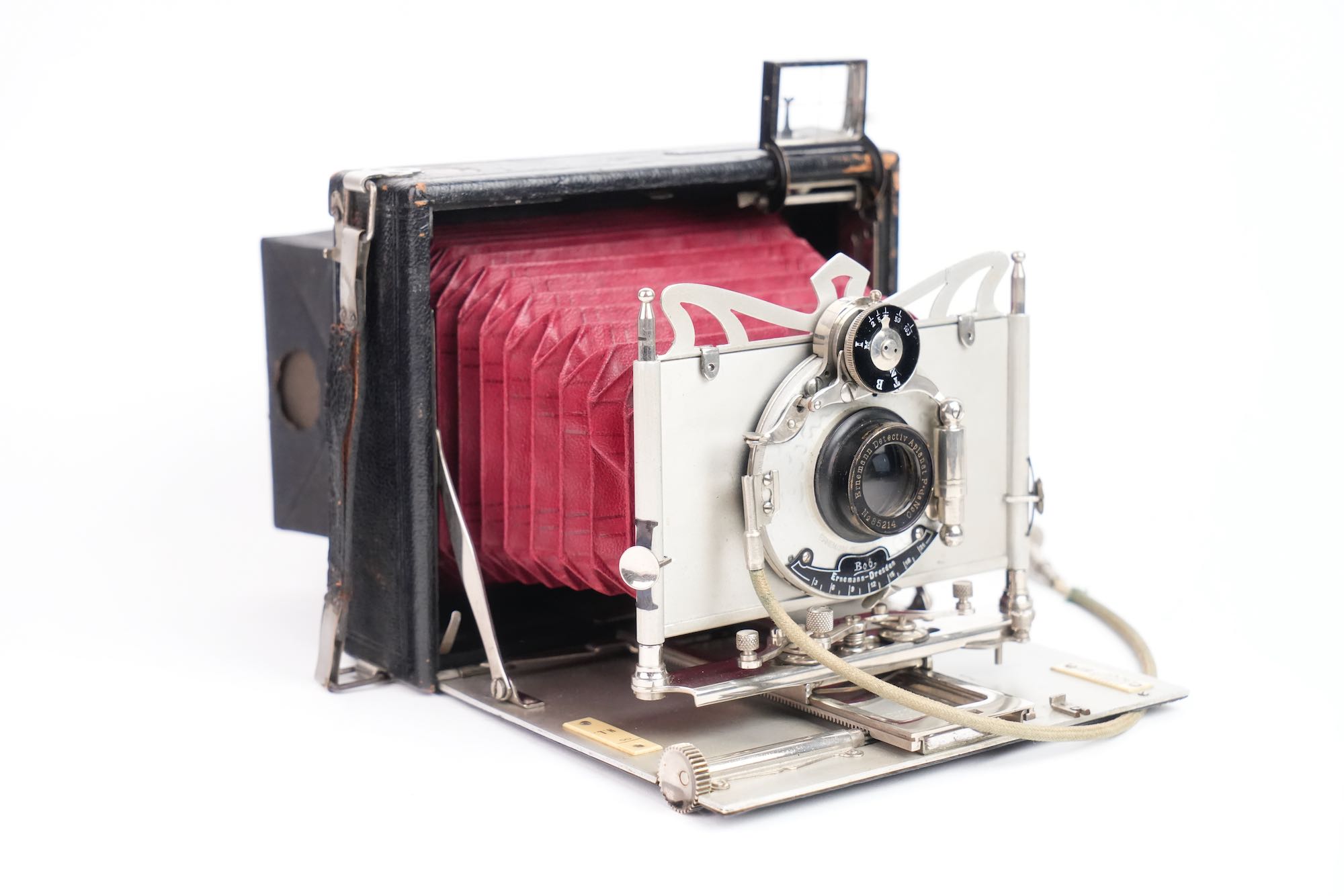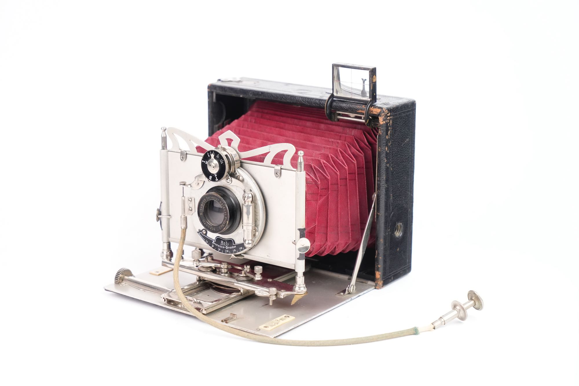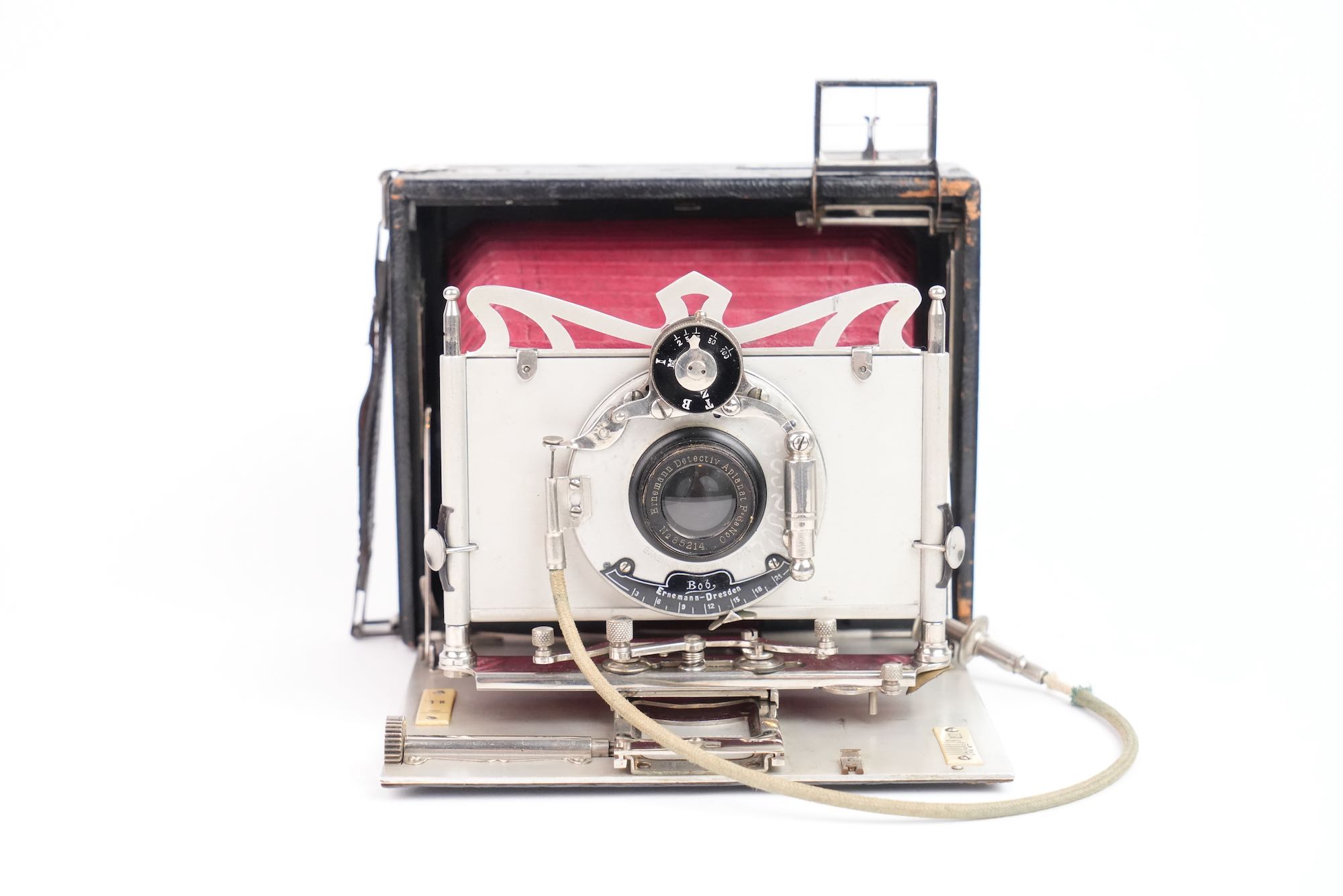 L’Ernemann Heag XII, appareil photographique pliant à plaques au format 9×12 cm horizontal, fabriqué par la firme allemande Ernemann à Dresde vers 1910–1915, avant la création de Zeiss Ikon. Construit sur un châssis en bois gainé avec une façade métallique nickelée, il se distingue par son soufflet rouge, équipé d’un objectif Ernemann Detektiv-Aplanat f/6,8 monté sur obturateur central “Bob” avec déclenchement par poire pneumatique.