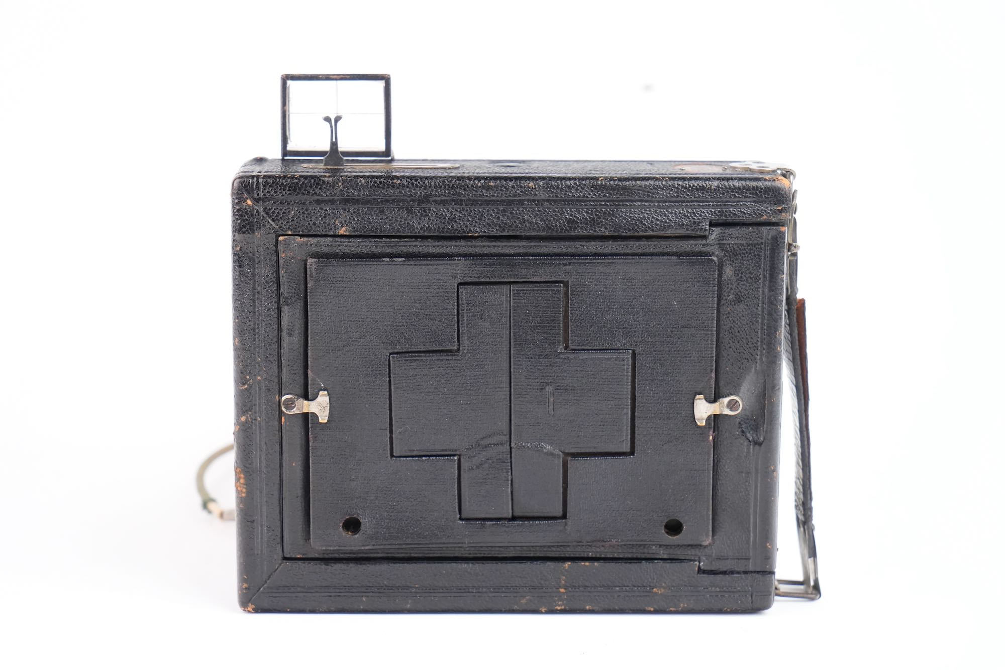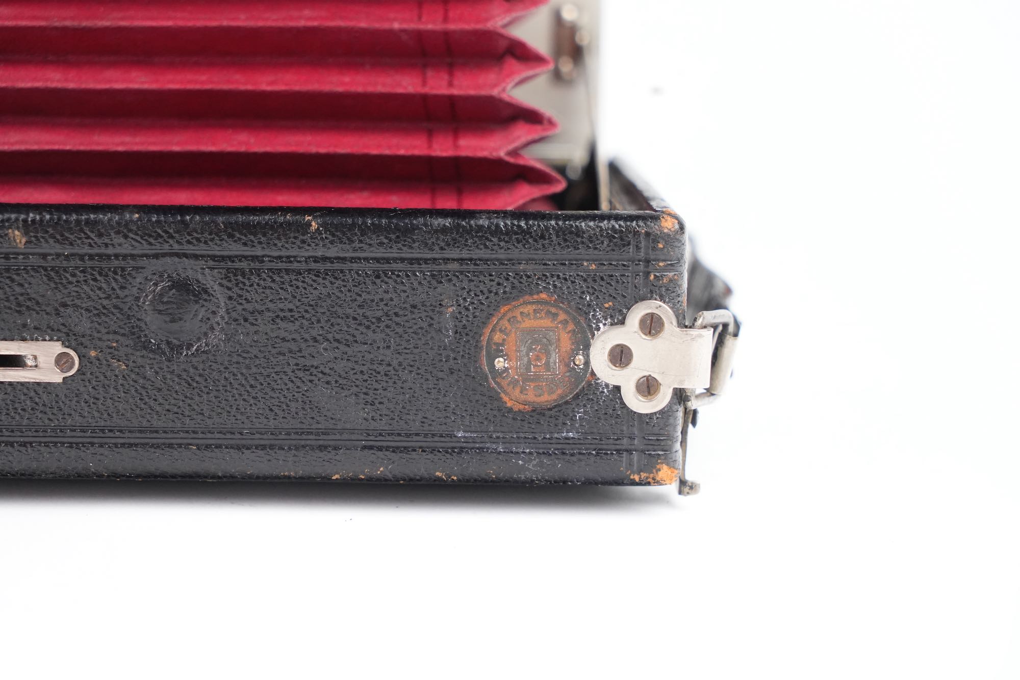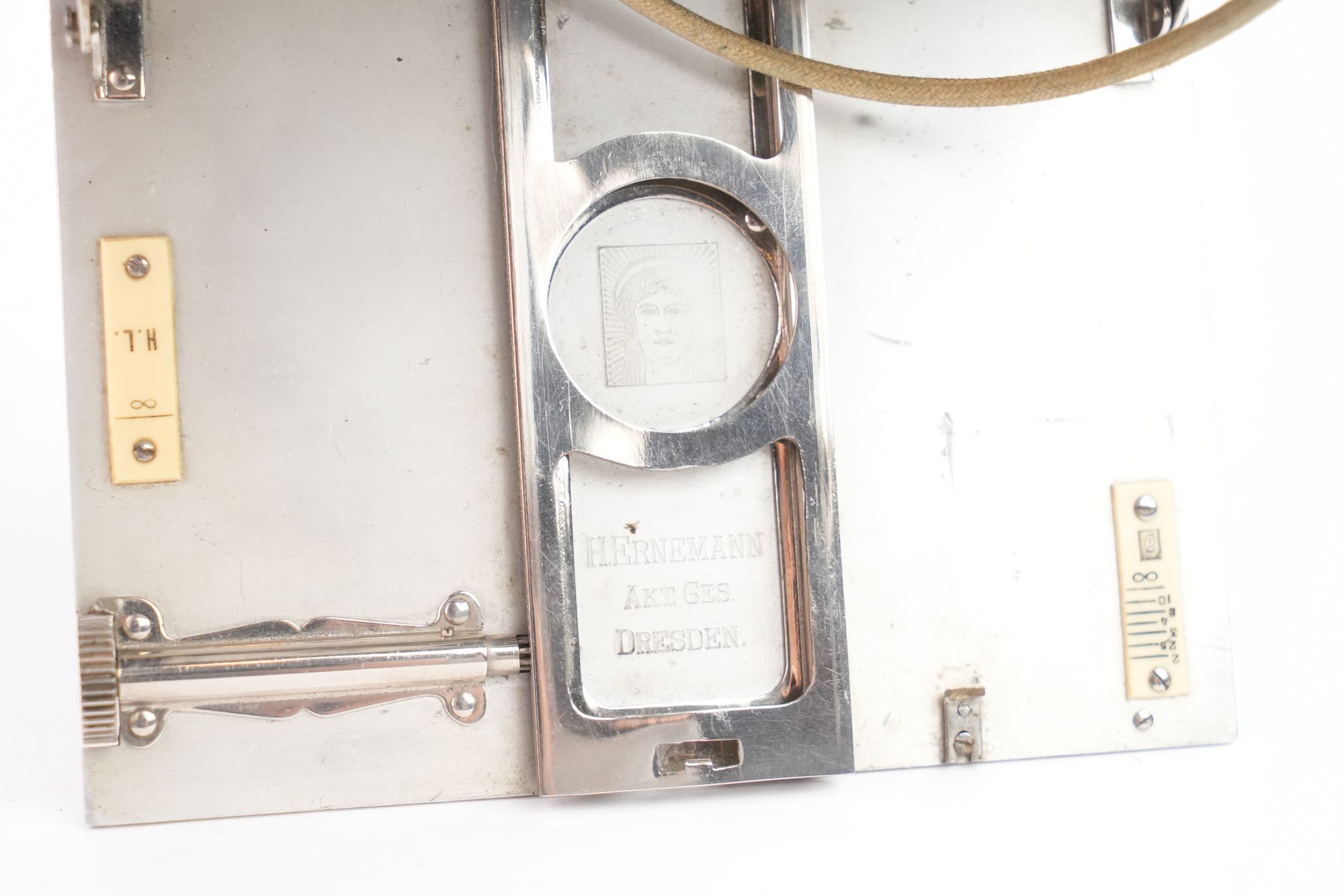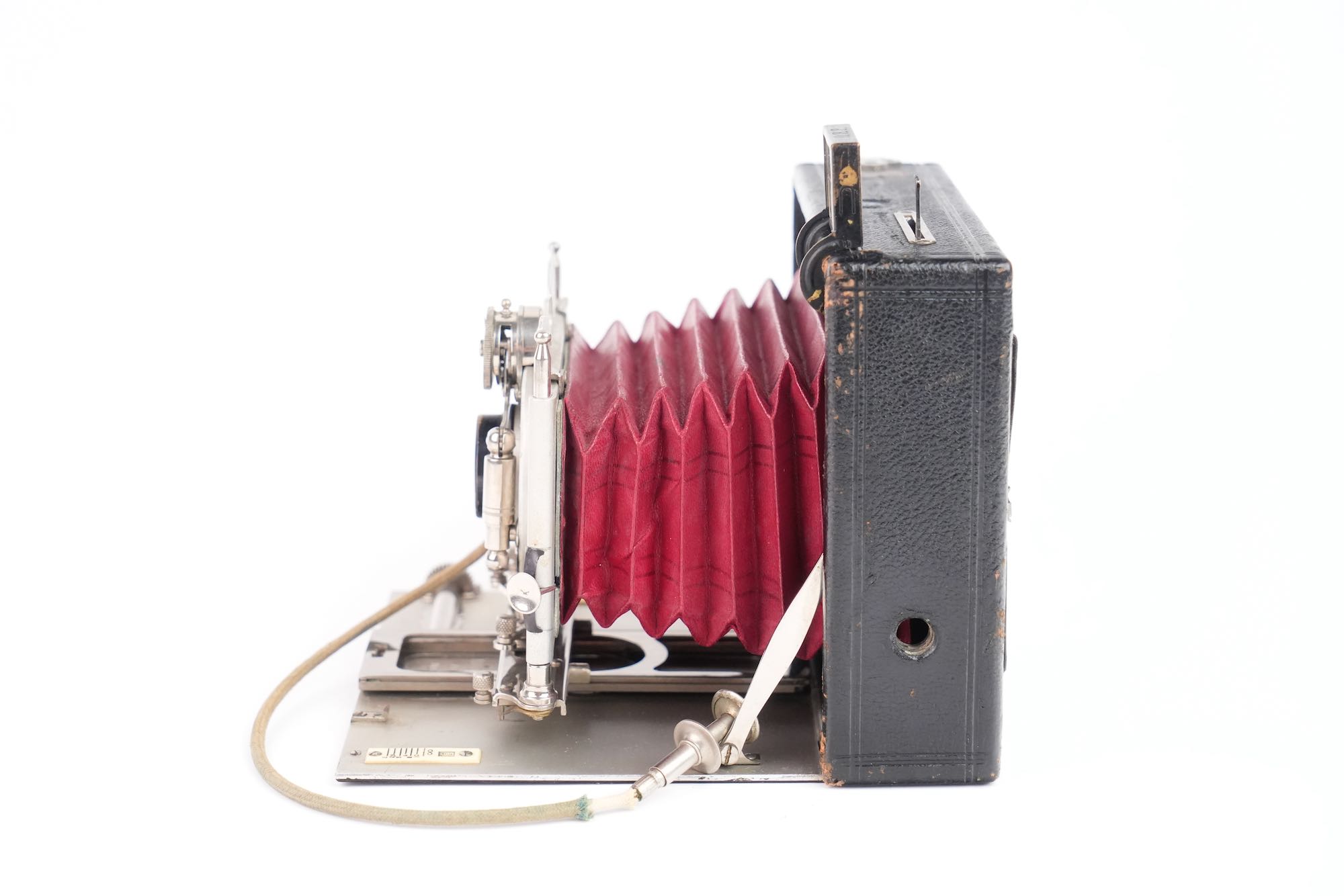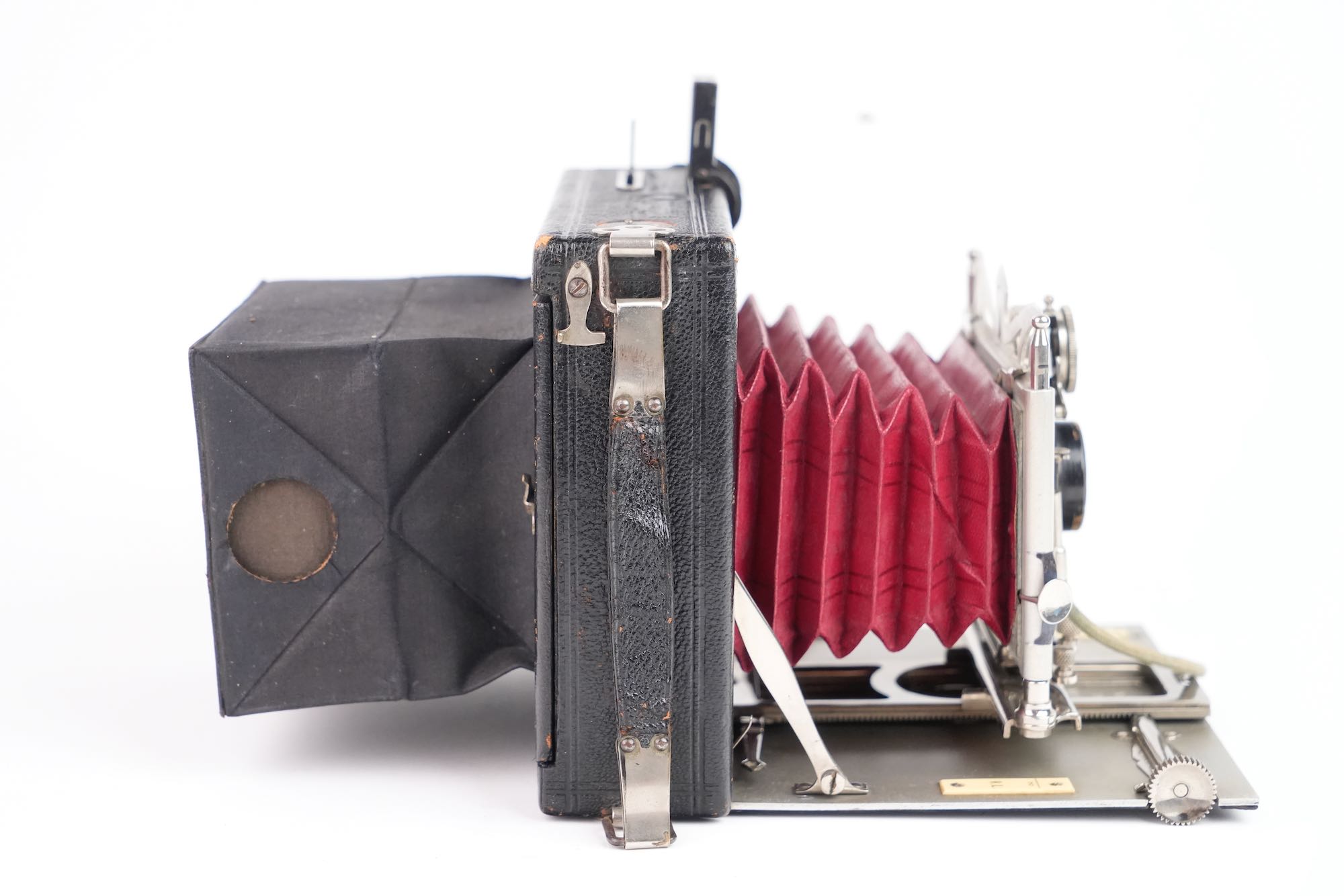 L’Ernemann Heag XII, appareil photographique pliant à plaques au format 9×12 cm horizontal, fabriqué par la firme allemande Ernemann à Dresde vers 1910–1915, avant la création de Zeiss Ikon. Construit sur un châssis en bois gainé avec une façade métallique nickelée, il se distingue par son soufflet rouge, équipé d’un objectif Ernemann Detektiv-Aplanat f/6,8 monté sur obturateur central “Bob” avec déclenchement par poire pneumatique.
