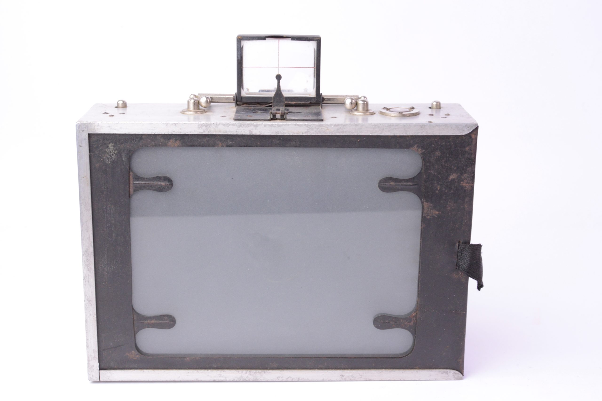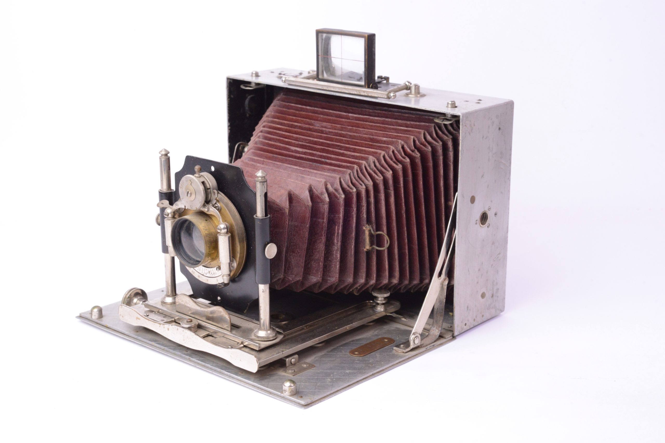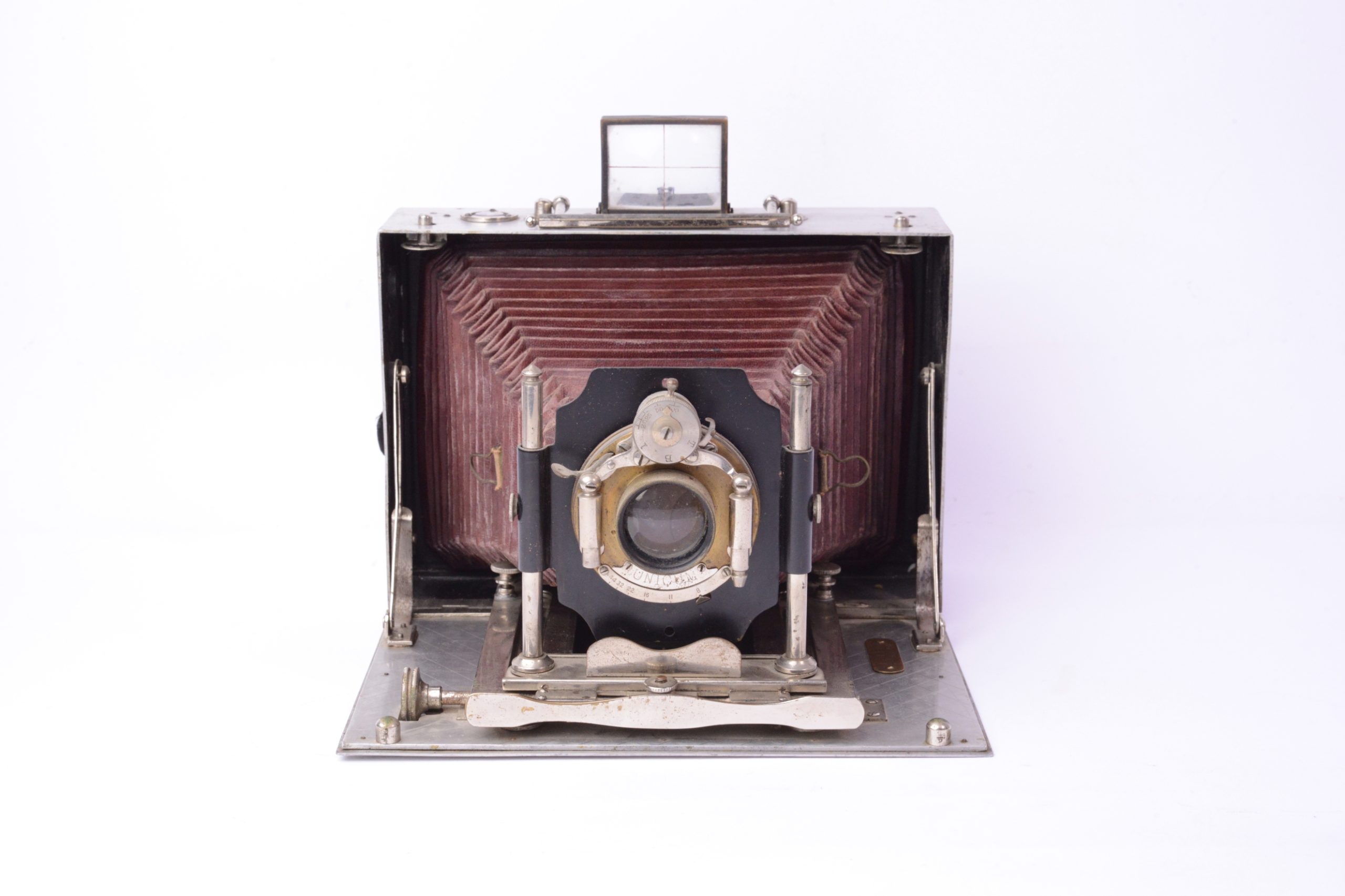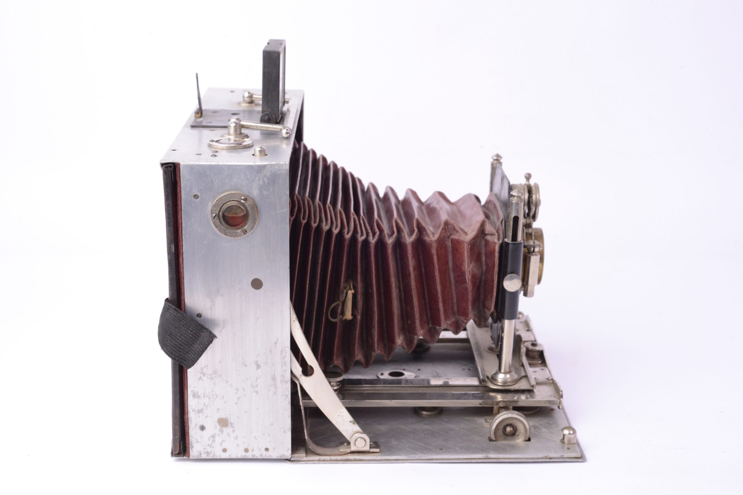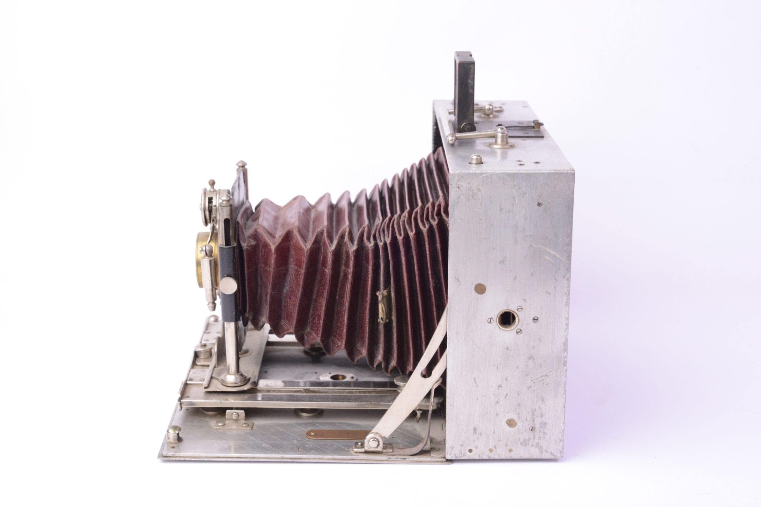 Folding Dandrieux. Appareil de format horizontal 13x18 cm, Construction en aluminium poli et verni. Soufflet en cuir bordeaux. Obturateur pneumatique Unicum de Bausch & Lomb (poses et vitesse variable de 1sec. à 1/100<sup>ème</sup>). Viseur clair direct réticulé. Décentrements horizontal et vertical. Mise au point par déplacement du chariot avant mû par bouton agissant sur crémaillère. Présence d’un niveau pour l’horizontalité. Présence du cadre avec verre dépoli.  Peu d'appareils de ce constructeur sont connus. Ils sont mentionnés dans certains catalogues des grands magasins Dufayel à paris, vers 1905 et Photo-Hall de 1908. Peu courant dans ce format. Très bel état.