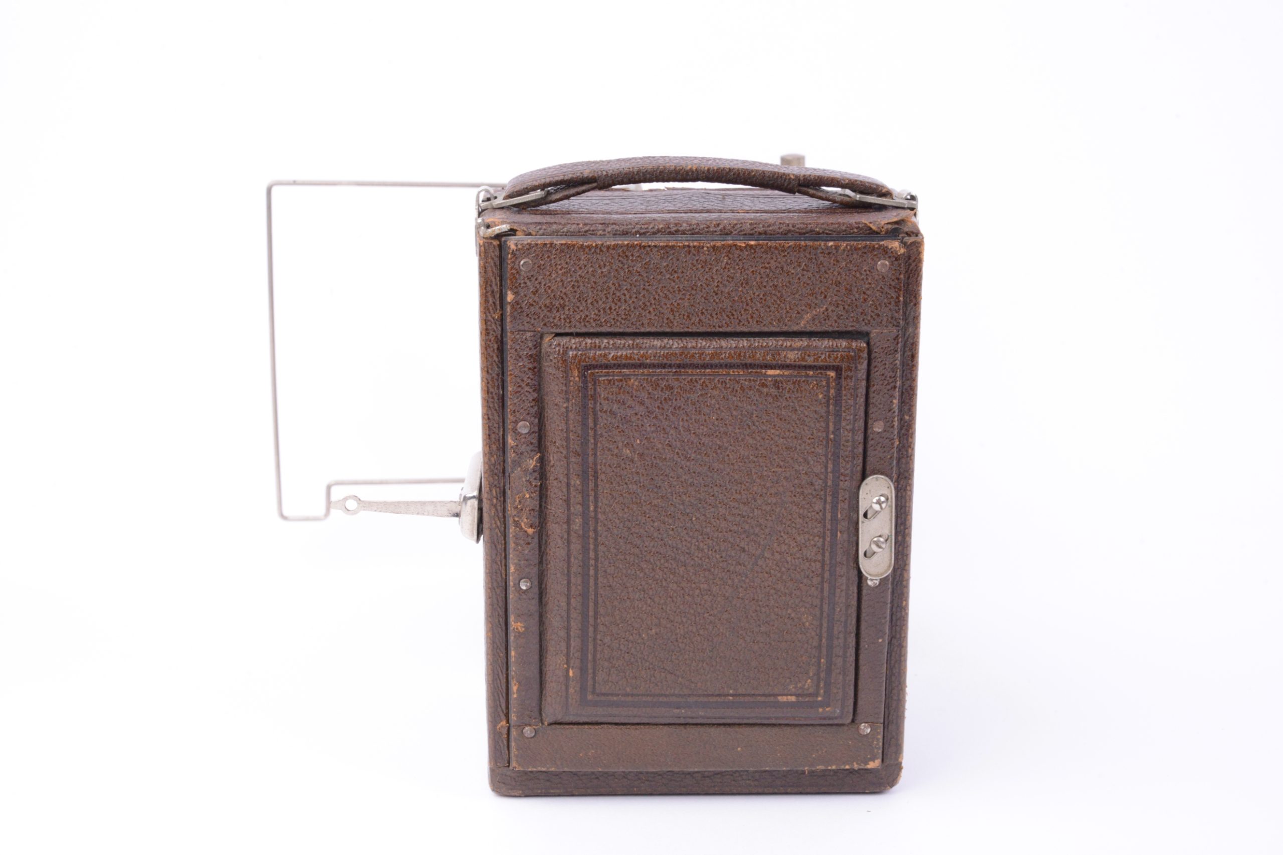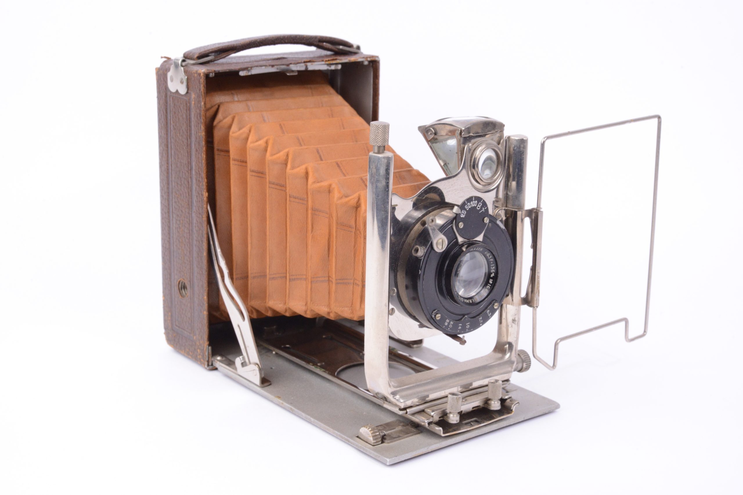 Bel appareil folding havane 9x12. Boitier et abattant gainé en maroquin marron gros grains. Parties métalliques chromées. Viseur réflex clair pliant et pivotant et viseur sportif avec mire. Objectif Hermagis Anastigmat Magir 1 : 6,3 : 136 mm monté sur obturateur central. Aucune marque n’apparait sur l’appareil. On note que certains catalogues Lumière présentent un type identique d’appareil en version métallique laquée noir. Vers 1930. Très bel état.