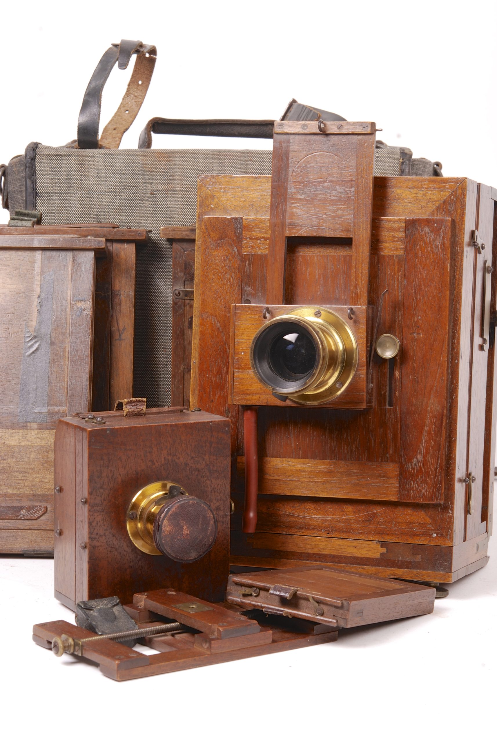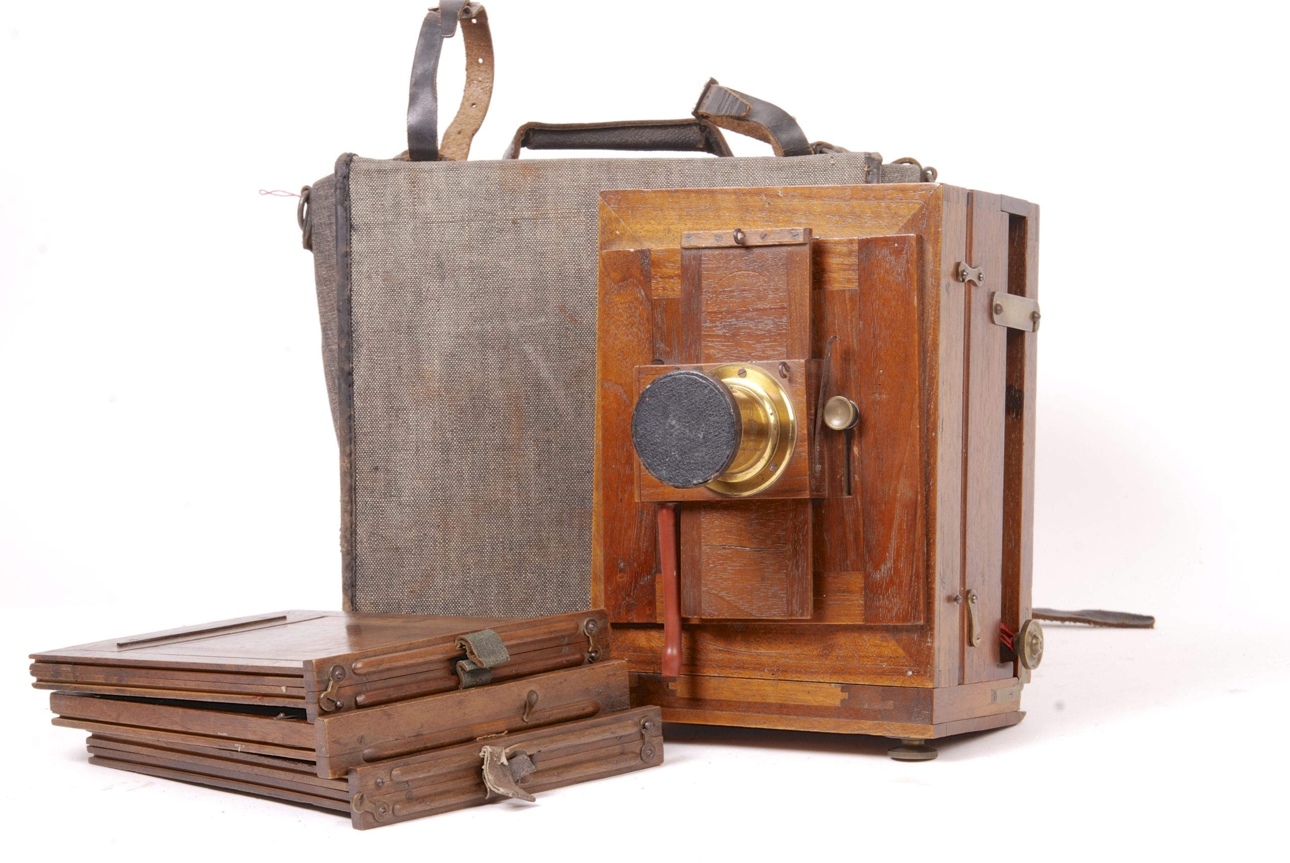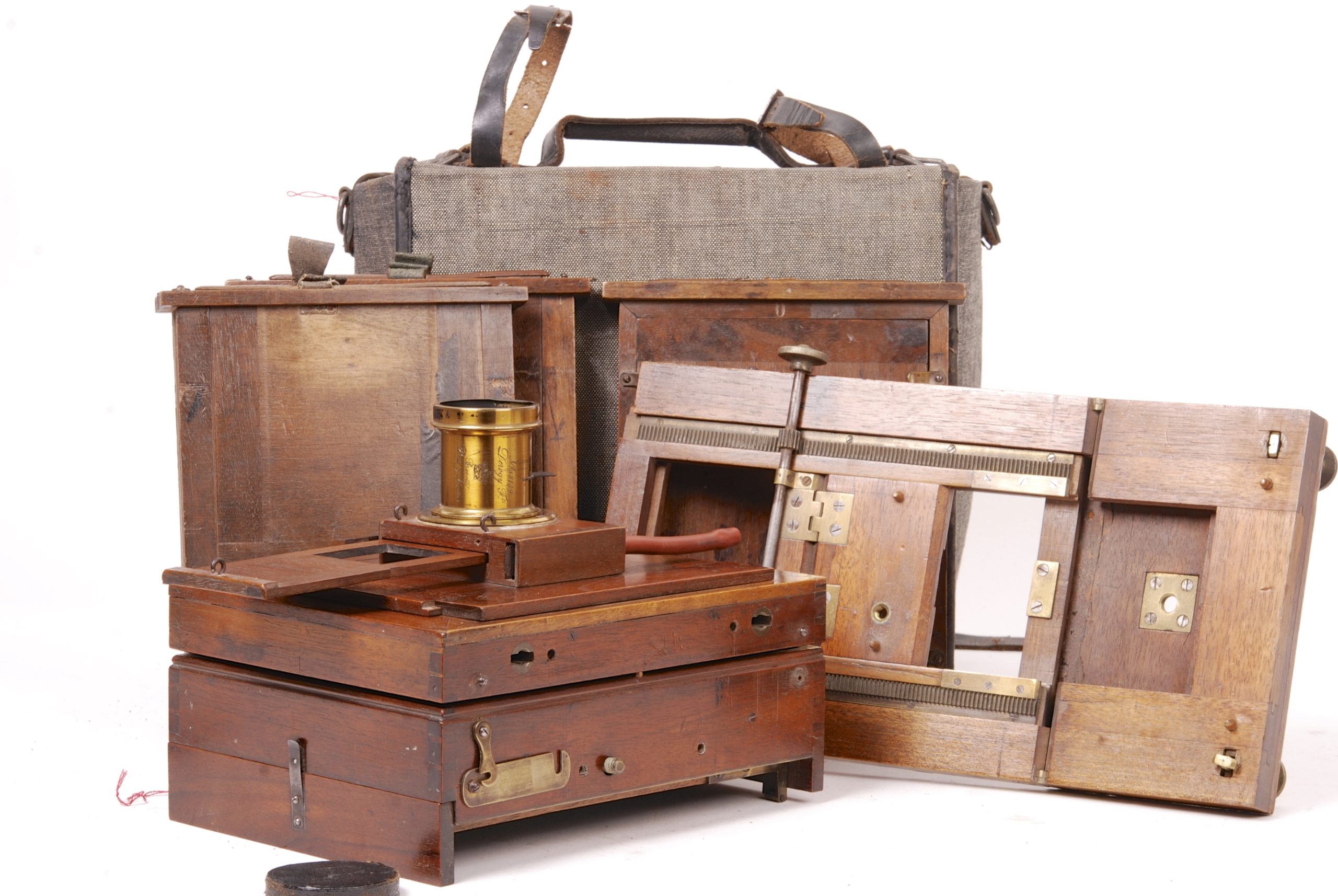 Chambre 13x18 au collodion sec avec sa boite à escamoter les plaques fermant à clef et son châssis attenant. Les deux marqués "Gilles Frères 7 bis rue Fromentin Paris". Belle ébénisterie en vieux noyer. Soufflet typique conique à coins non rabattus. Objectif signé "Eugène Faller 6 rue du Temple Paris". Mise au point par action sur le chariot avec manivelle à vis sans fin.