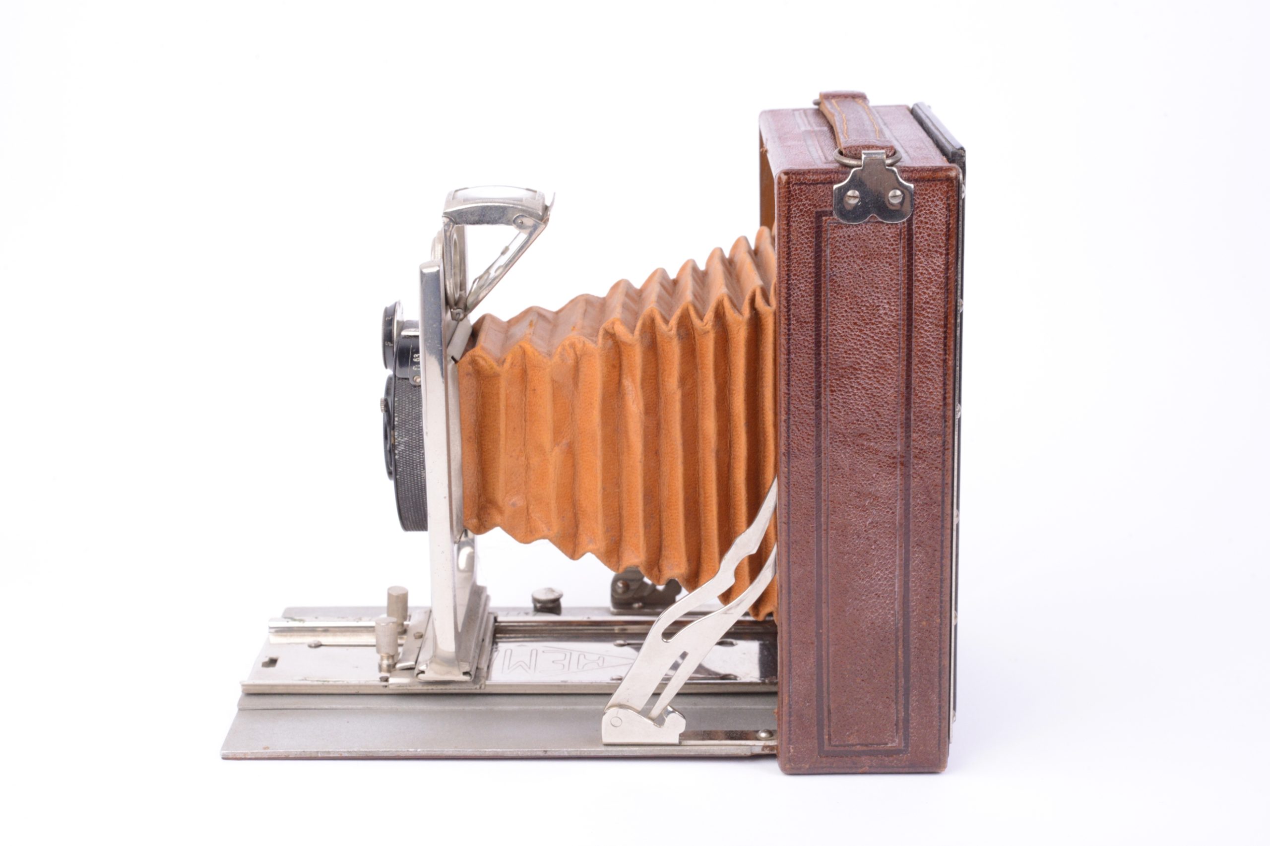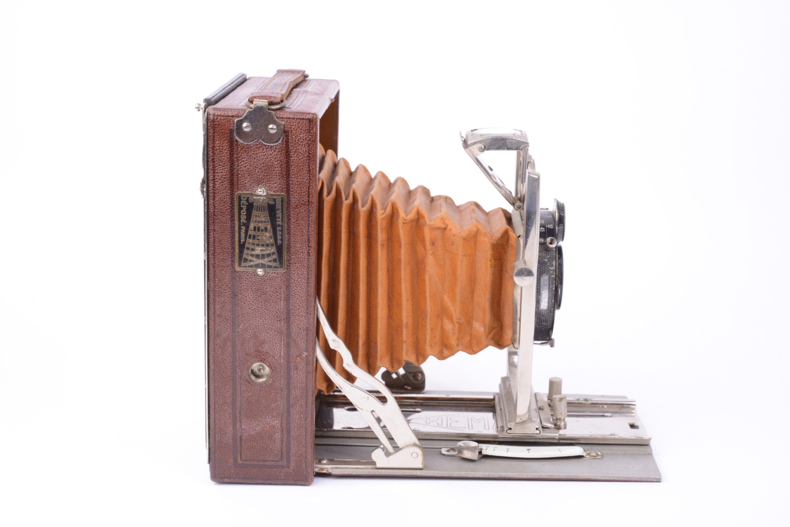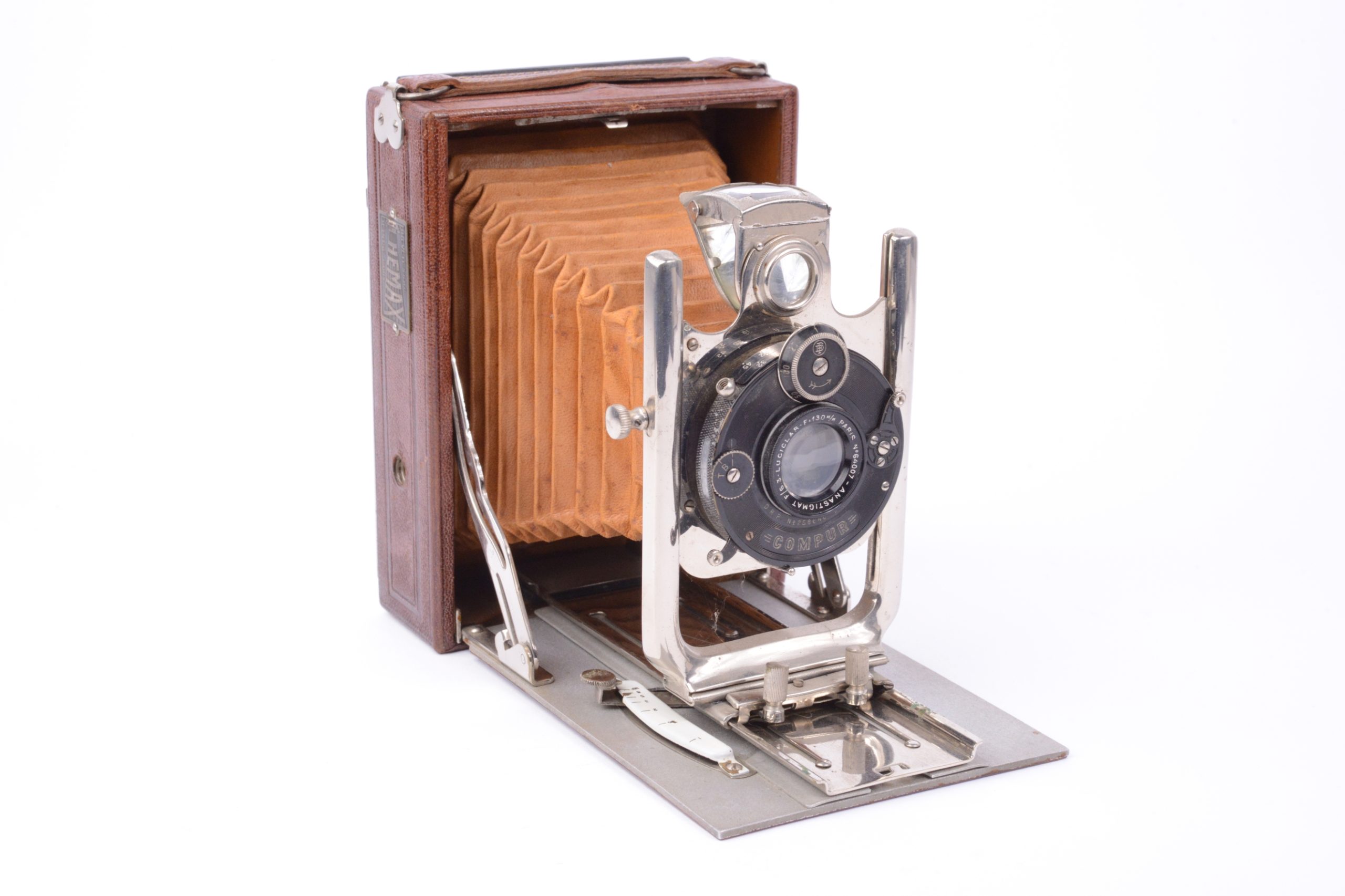 Folding Hemax fabriqué par Héard & Mallinjod vers 1930. Format 9x12. Très belle construction avec un corps en bois gainé cuir marron, soufflet cuir de couleur havane, abattant aluminium également recouvert de cuir marron. Toutes les pièces de la platine avant sont en métal chromé. L’objectif est un Anastigmat Luciclar 1 : 6,3 / 130 mm monté sur obturateur dial set Compur. Viseur réflex clair pliant et pivotant. Très bel appareil en excellent état.