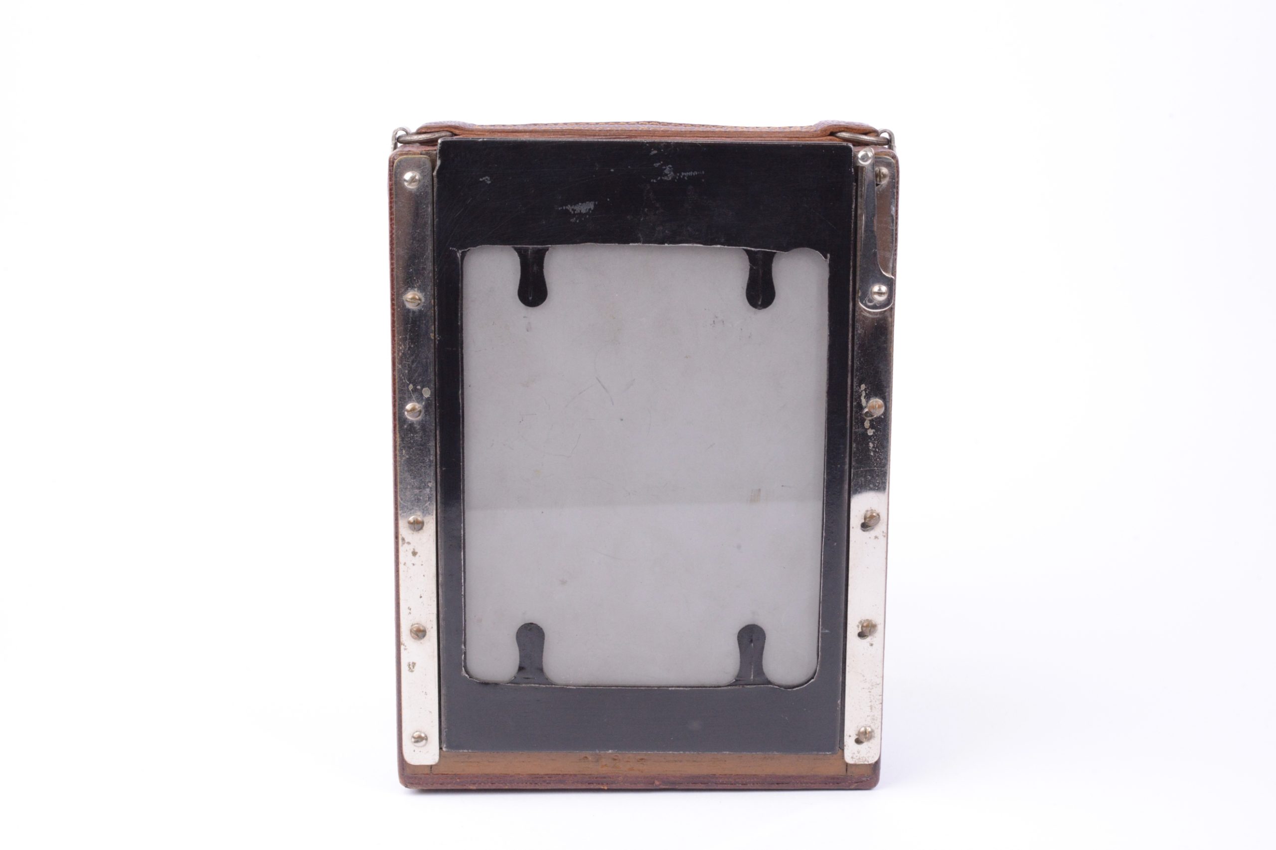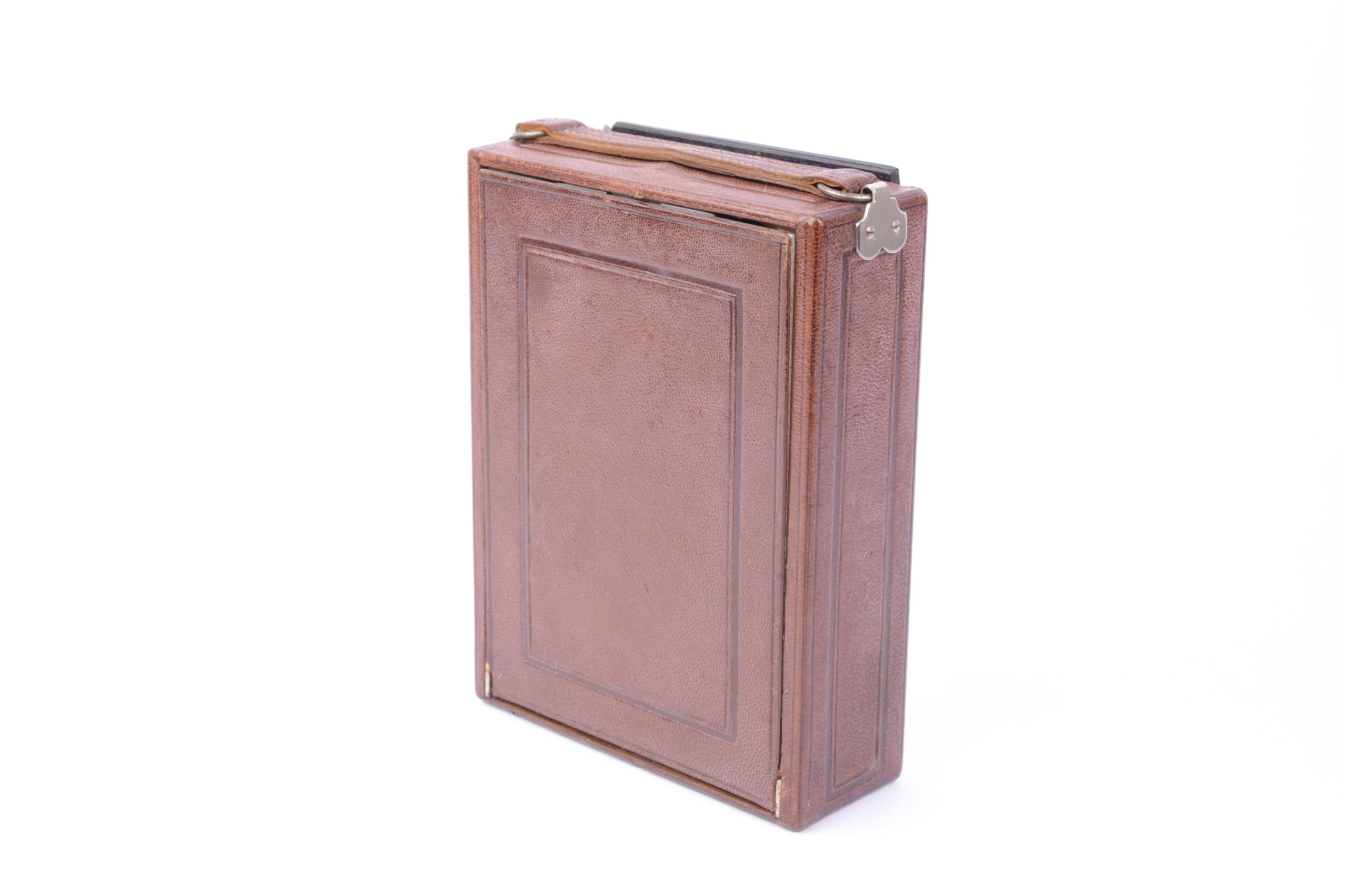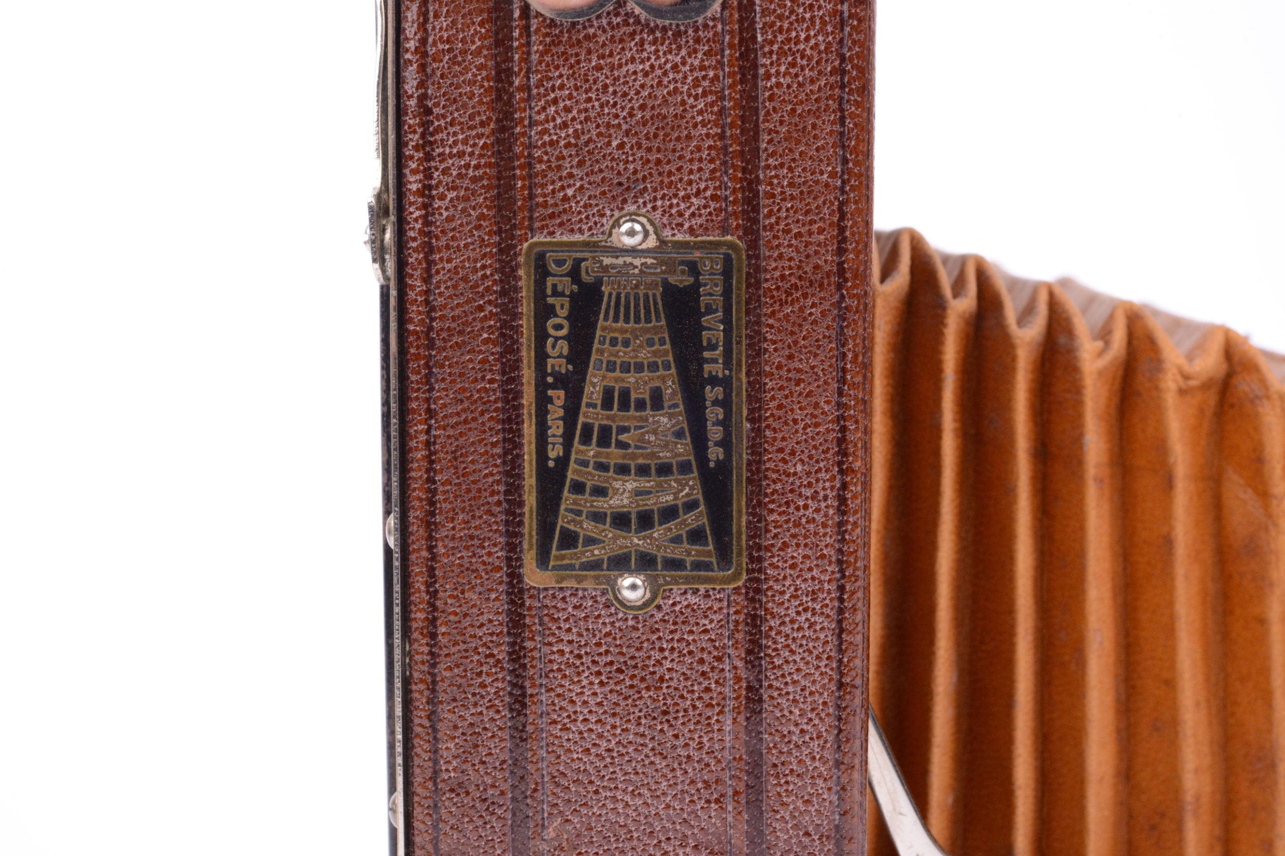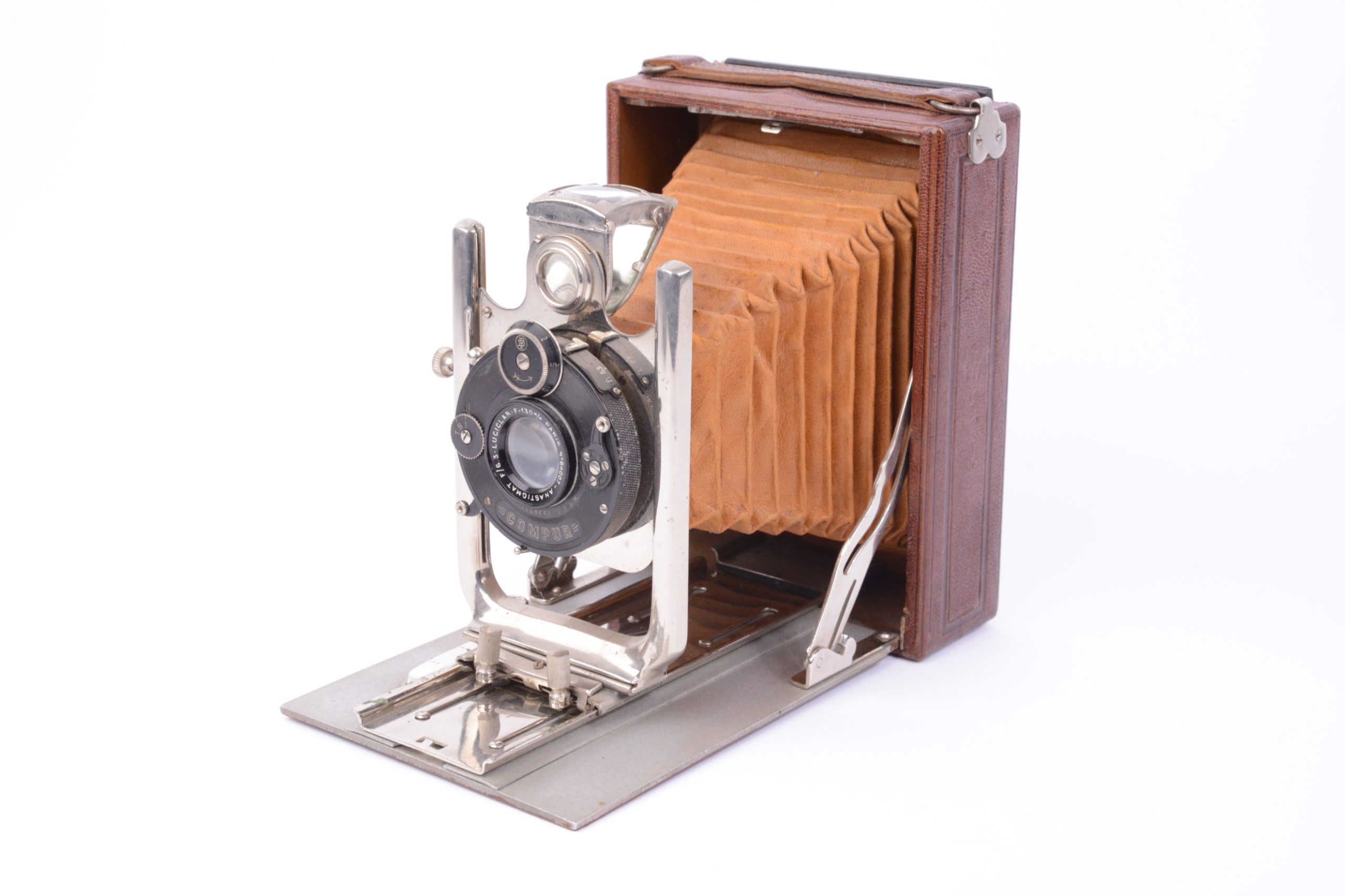 Folding Hemax fabriqué par Héard & Mallinjod vers 1930. Format 9x12. Très belle construction avec un corps en bois gainé cuir marron, soufflet cuir de couleur havane, abattant aluminium également recouvert de cuir marron. Toutes les pièces de la platine avant sont en métal chromé. L’objectif est un Anastigmat Luciclar 1 : 6,3 / 130 mm monté sur obturateur dial set Compur. Viseur réflex clair pliant et pivotant. Très bel appareil en excellent état.