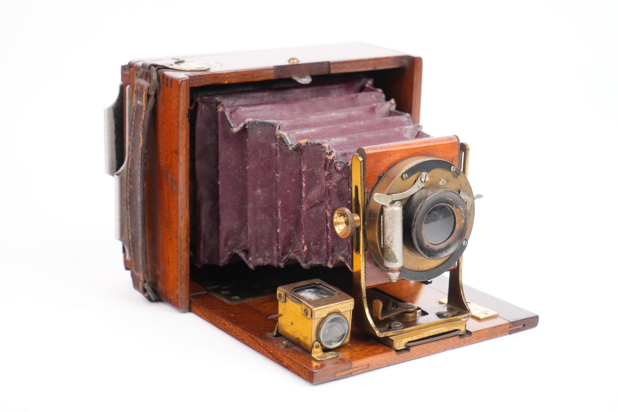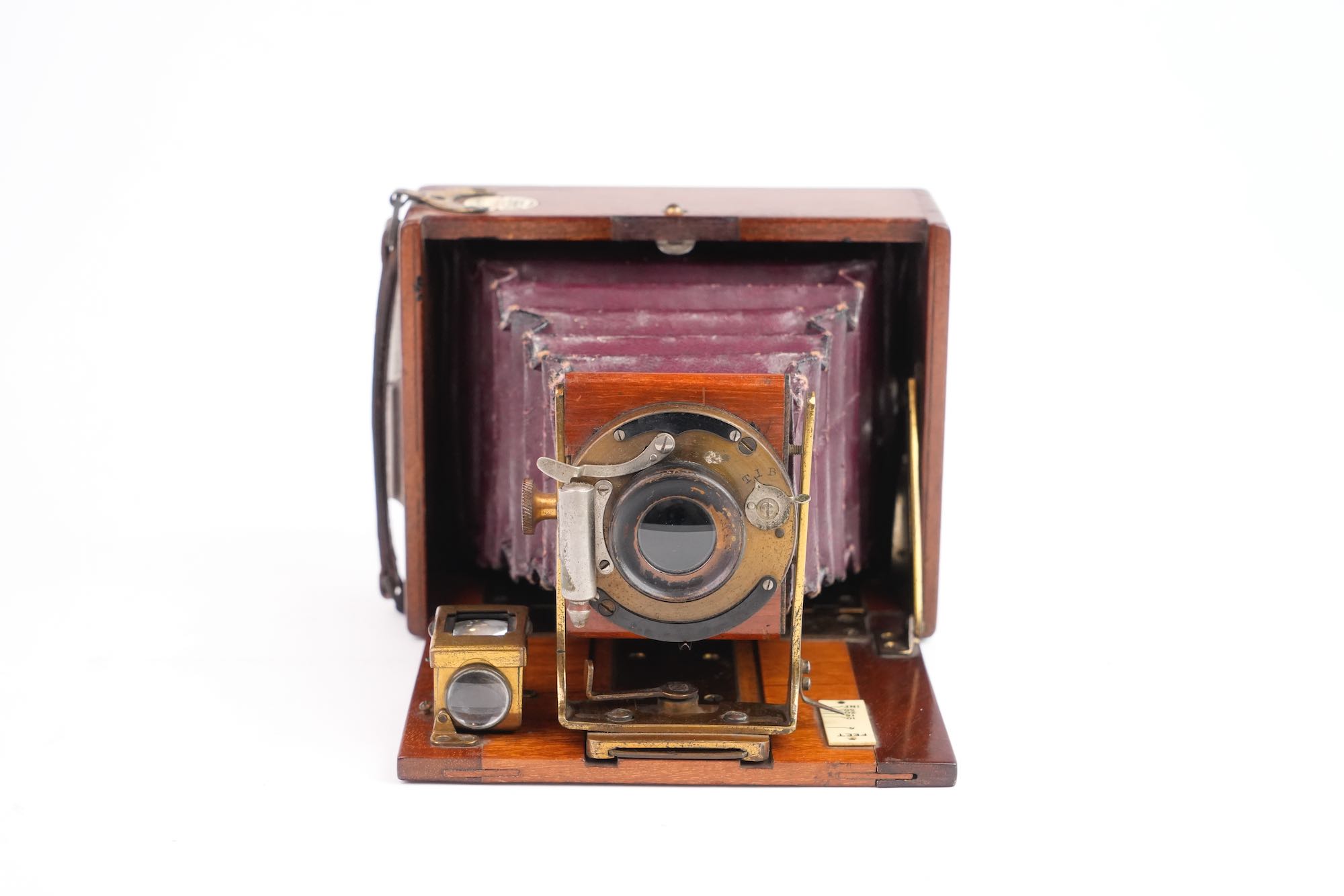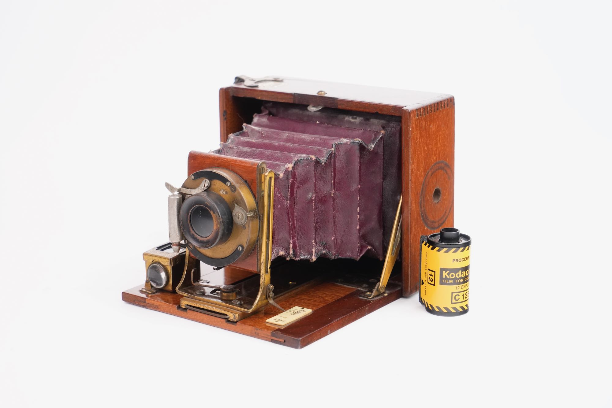 Appareil photographique pliant J. Lizars « Challenge », format 6 × 9 cm, début du XXᵉ siècle. Ce modèle se distingue par son boîtier en bois verni, repliable, et son soufflet en cuir teinté, permettant de réduire considérablement l’encombrement lors du transport. L’appareil est équipé d’un objectif monté sur une platine frontale en laiton, associé à un obturateur mécanique à réglages manuels, complété par un viseur optique simple en façade. Destiné à l’usage de plaques ou de films au format 10,5 x 8,5 cm.
