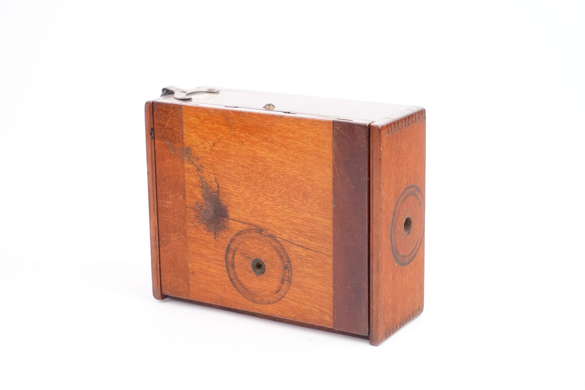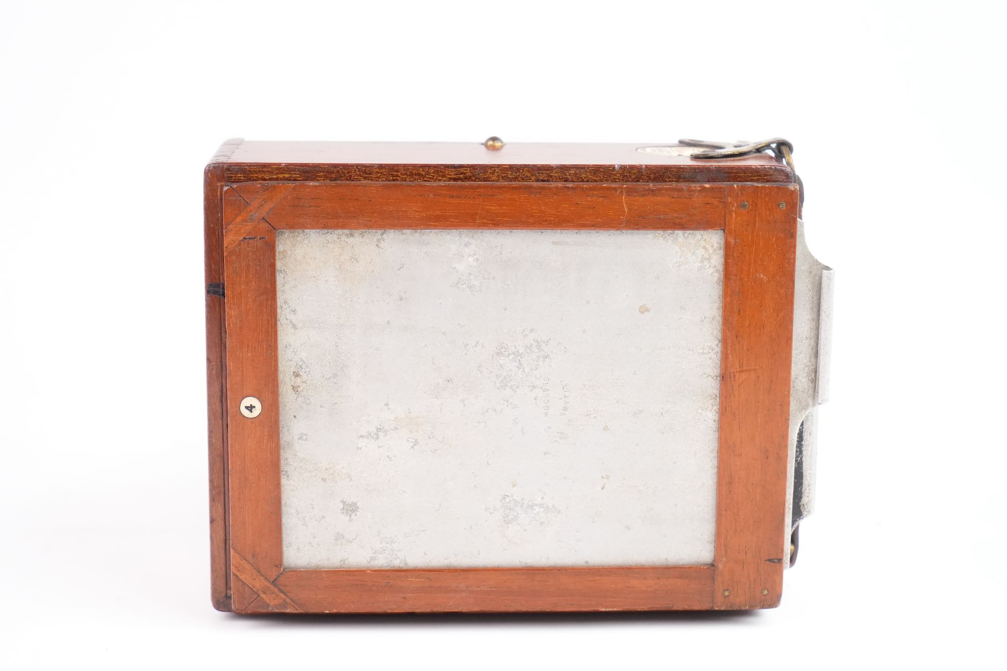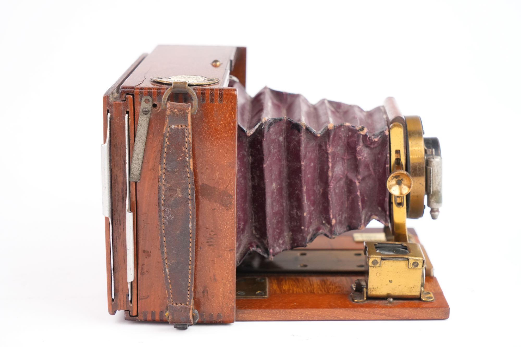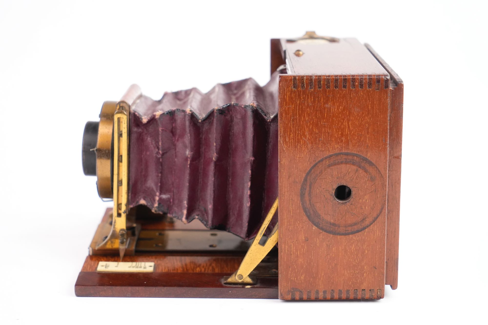 Appareil photographique pliant J. Lizars « Challenge », format 6 × 9 cm, début du XXᵉ siècle. Ce modèle se distingue par son boîtier en bois verni, repliable, et son soufflet en cuir teinté, permettant de réduire considérablement l’encombrement lors du transport. L’appareil est équipé d’un objectif monté sur une platine frontale en laiton, associé à un obturateur mécanique à réglages manuels, complété par un viseur optique simple en façade. Destiné à l’usage de plaques ou de films au format 10,5 x 8,5 cm.