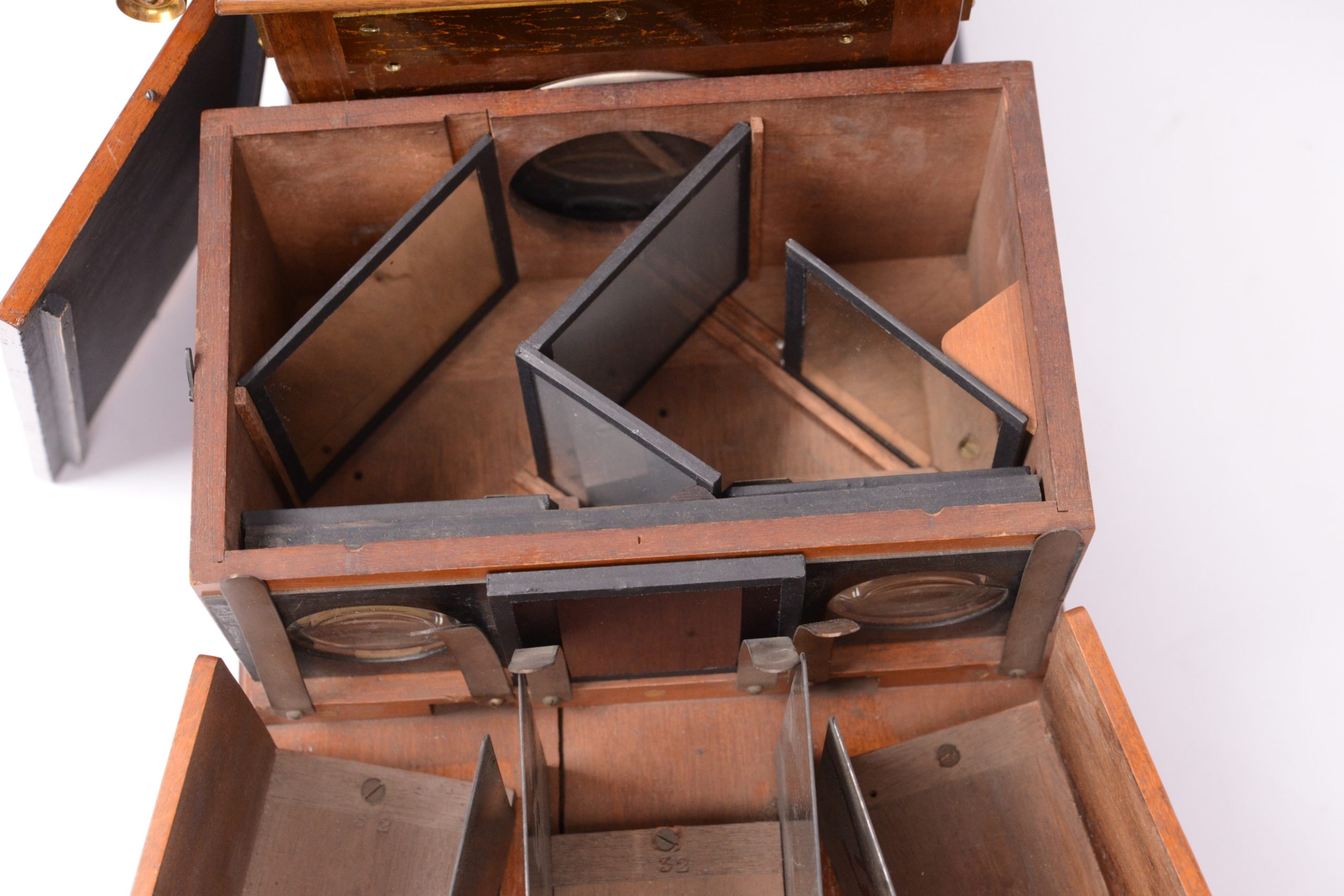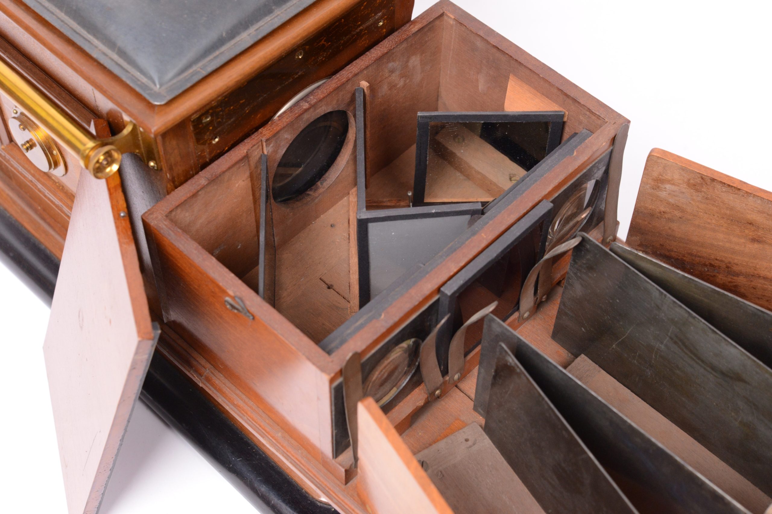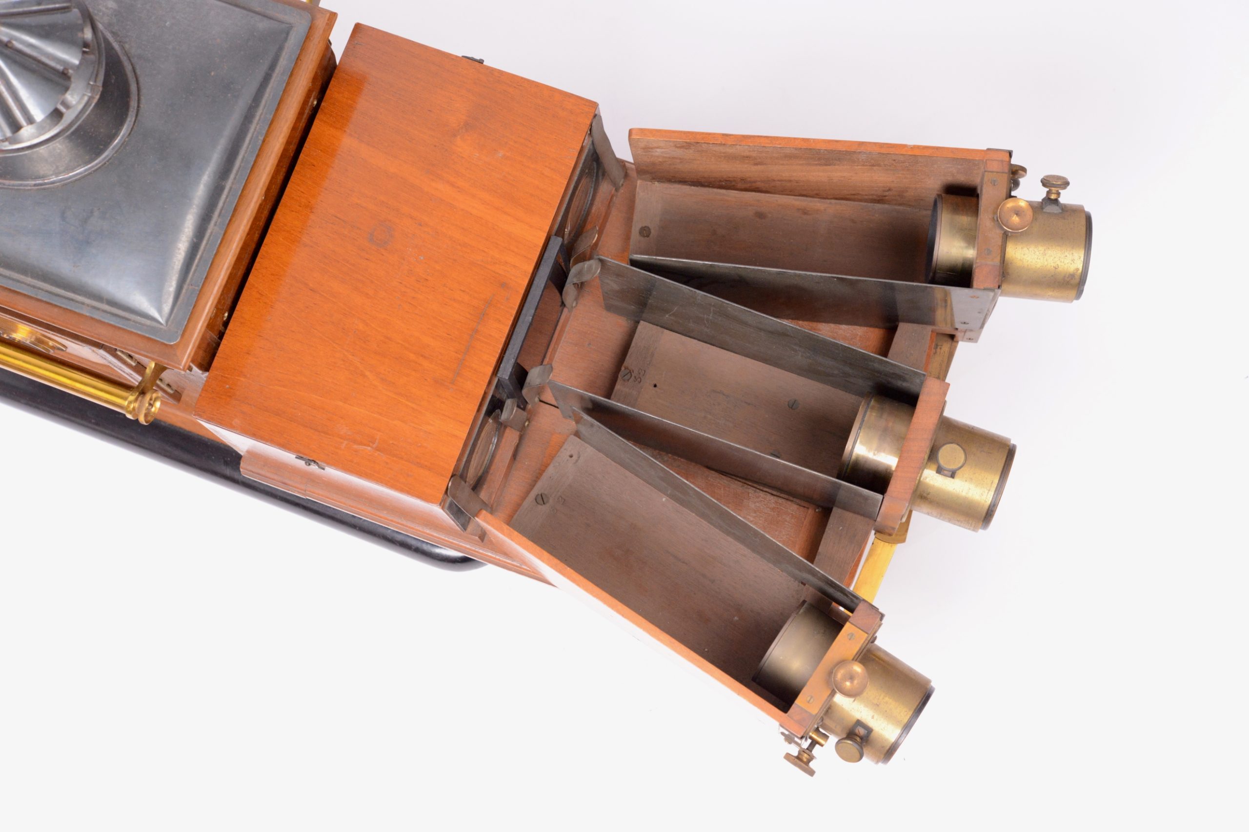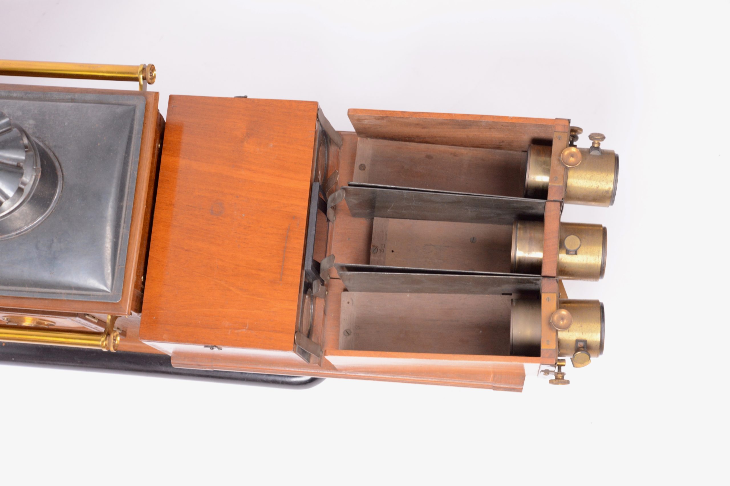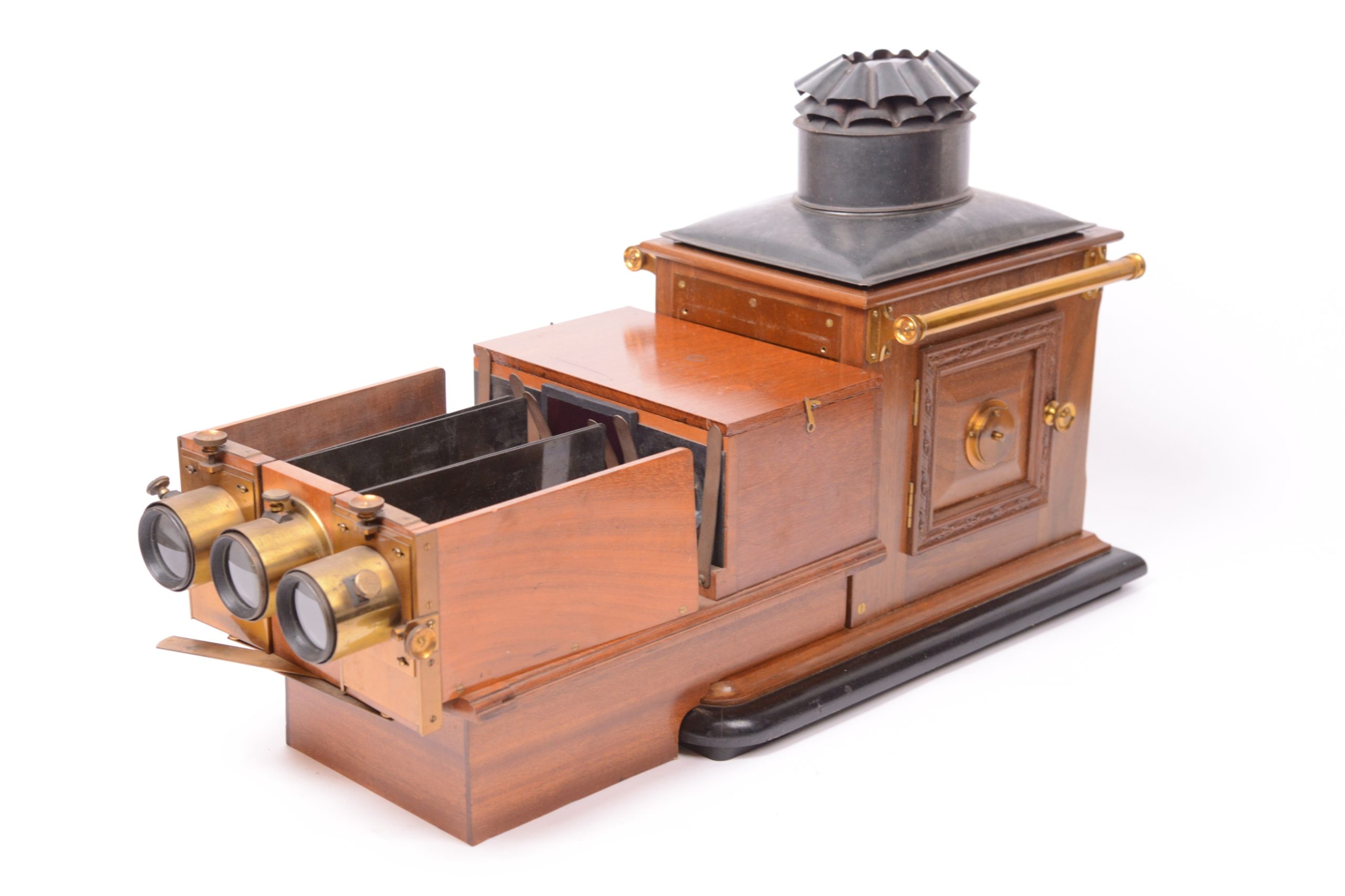 Le Chromoscope (ou Kromoscope) de projection de de Ives est un projecteur pour photographies en couleurs selon le procédé trichrome. A l’arrière, se trouve une lanterne de projection classique. Devant cette dernière, prend place, dans un coffret, un dispositif de filtres rouge, vert, bleu, chargé de décomposer le faisceau de lumière sortant de la lanterne sur trois directions différentes. Les trois faisceaux ainsi créés progressent ensuite de façon indépendante, chacun dans une chambre de projection après avoir traversé une épreuve sur verre en noir et blanc propre à leur couleur. La réunion des trois images sur un écran permet de voir la scène projetée dans ses couleurs originales. Belle fabrication anglaise en acajou et tôle de Russie.