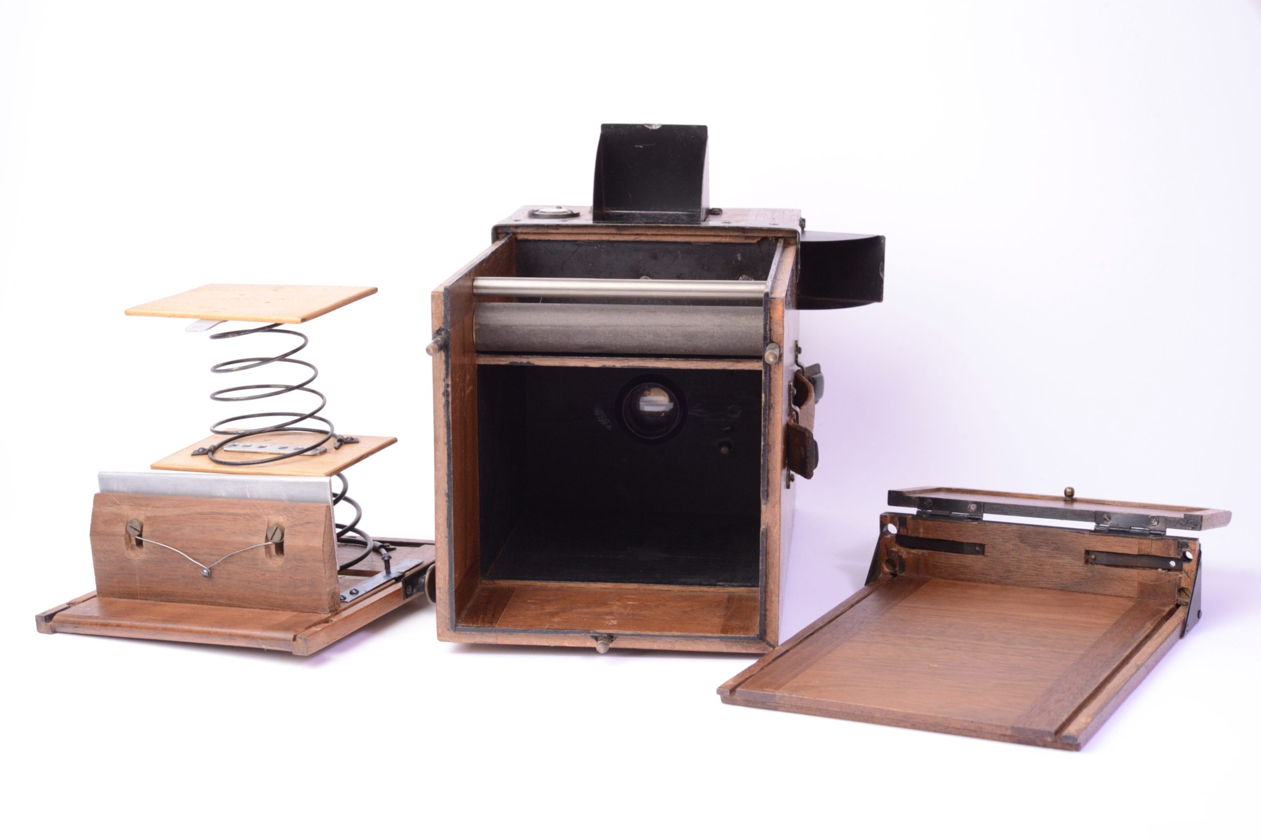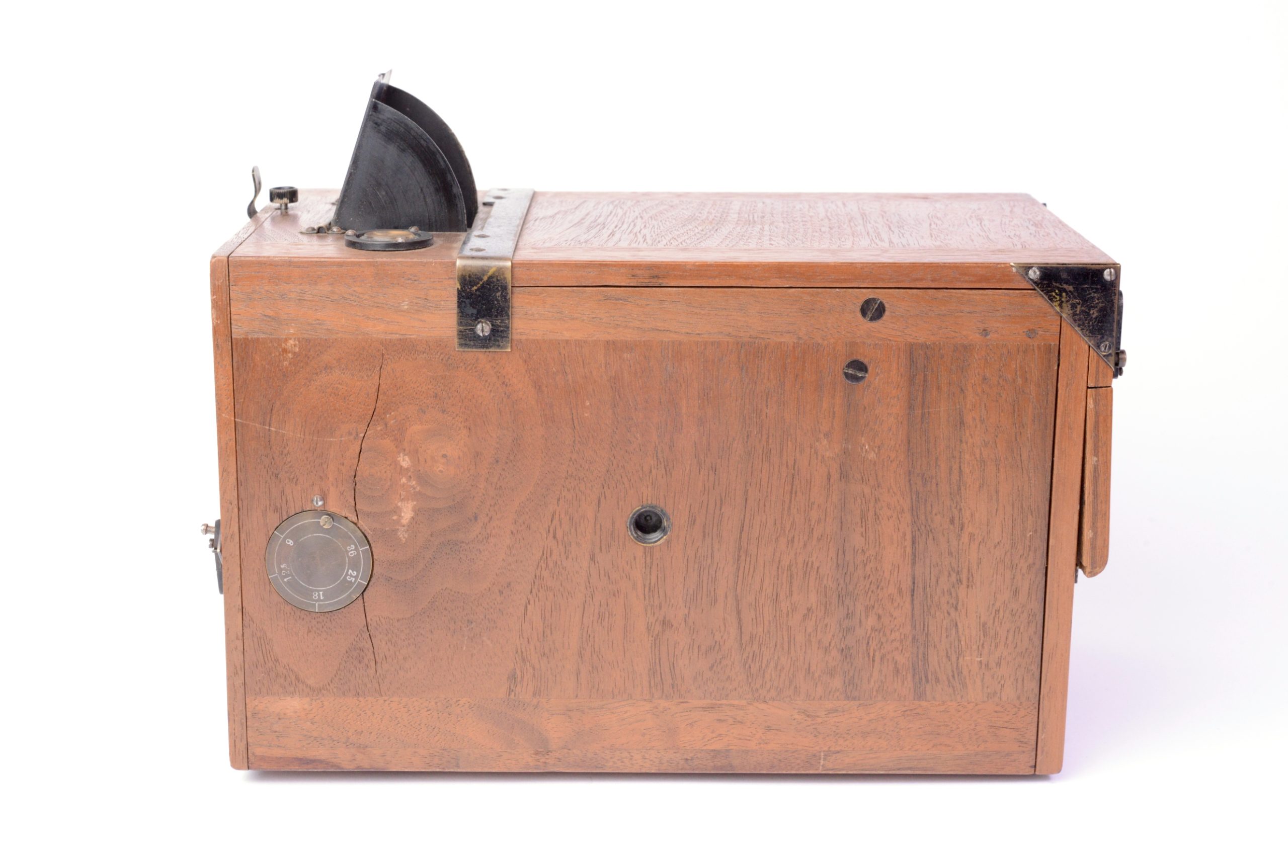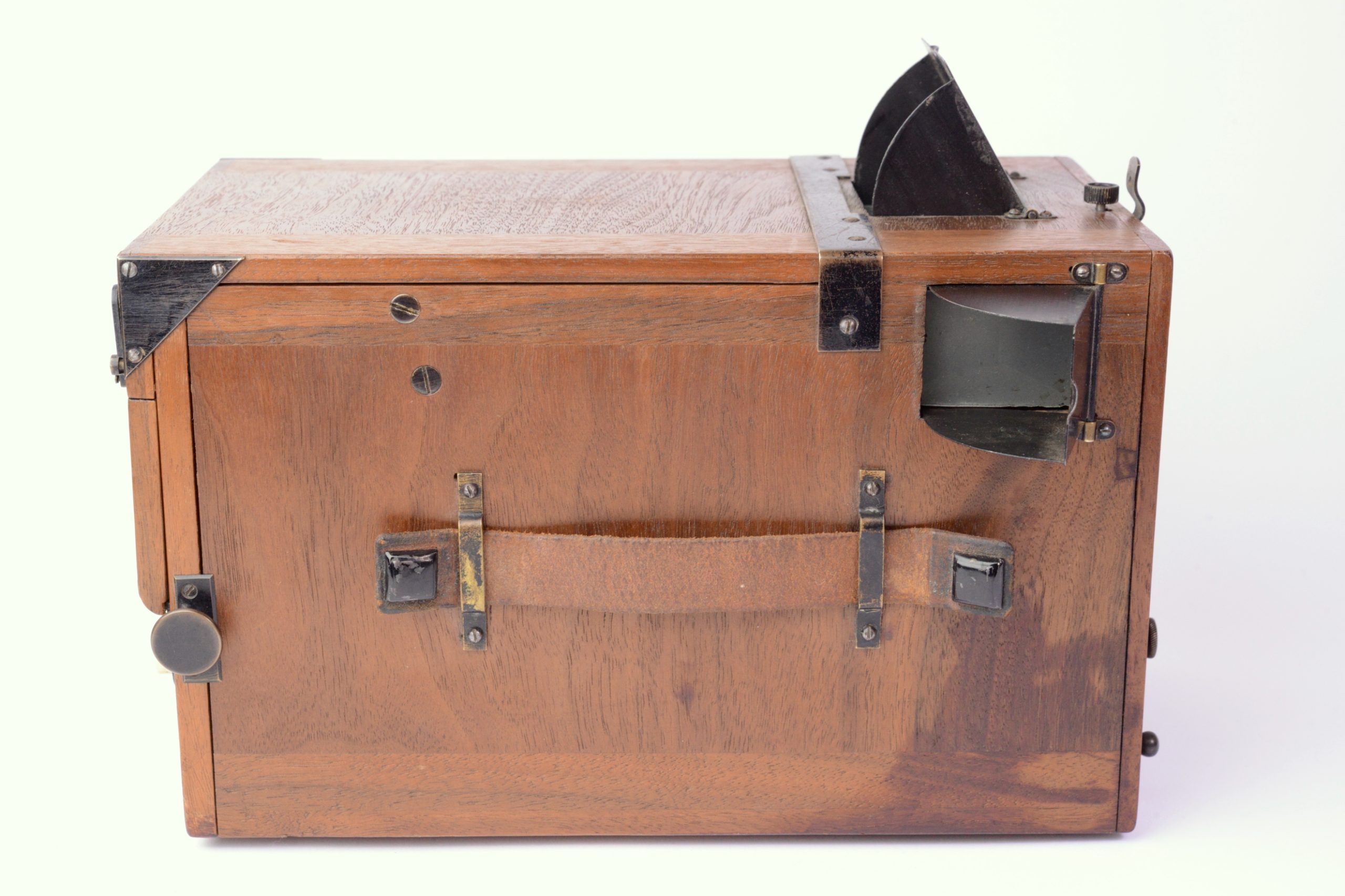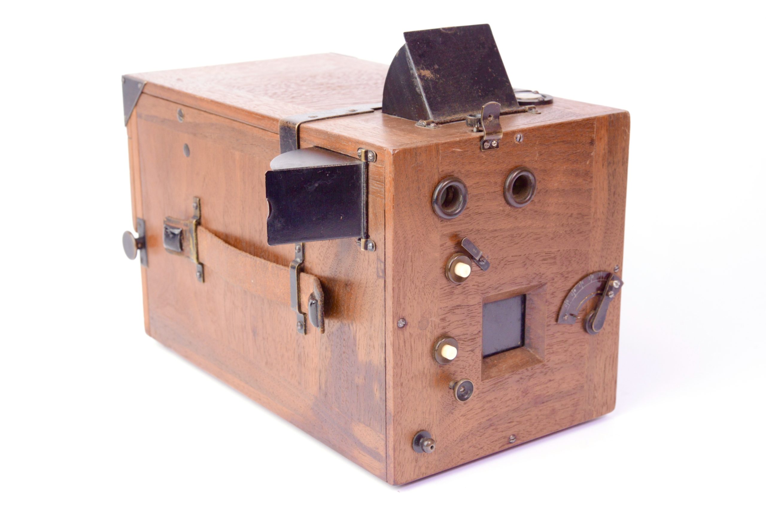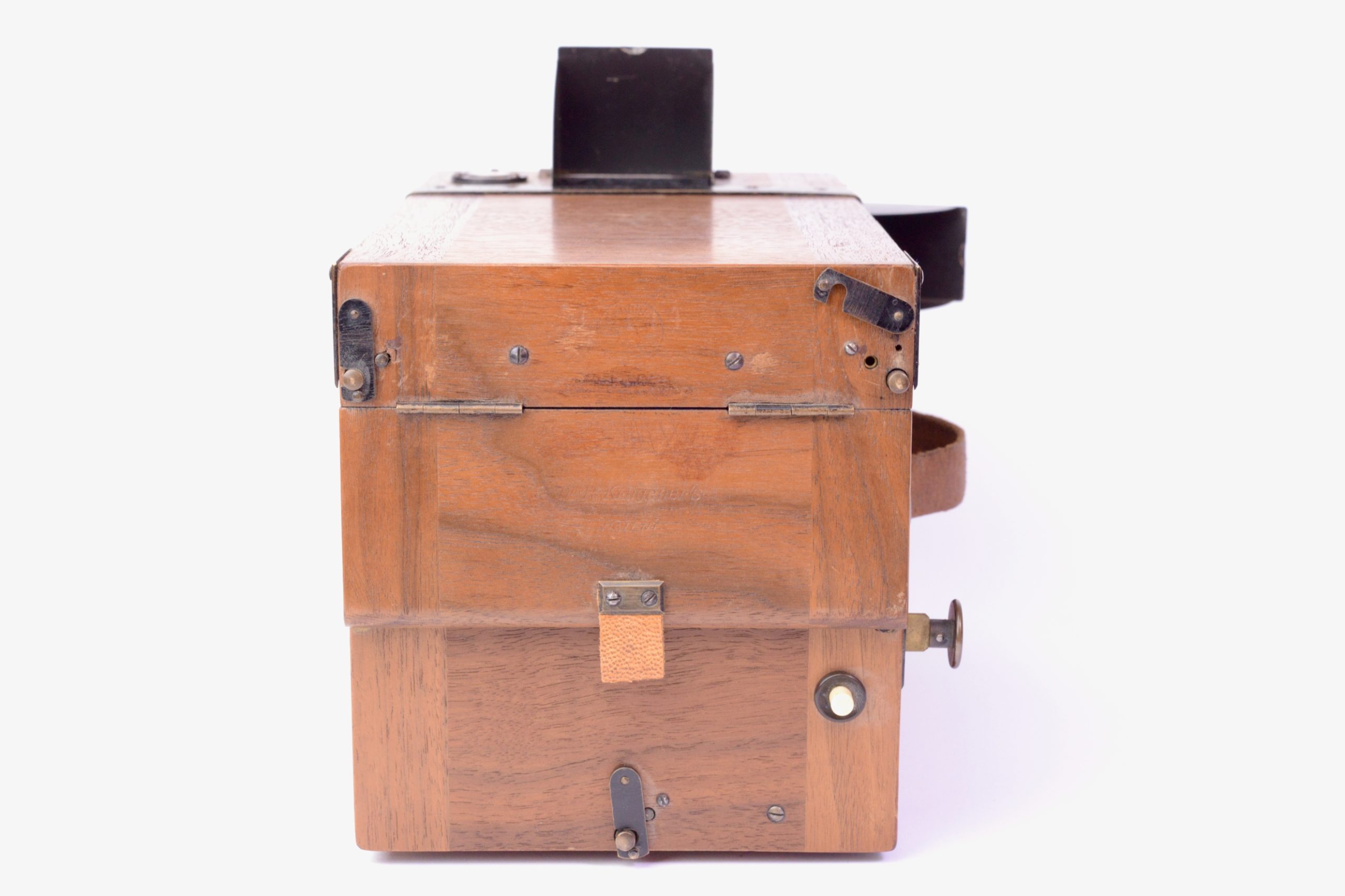 Krügener Delta Magazine Detective 9x12 camera. Marque estampée dans le bois « Dr. Krügener’s patent ». Belle réalisation, construit en bois d’acajou poli verni. Obturateur à vitesses variables indexées. Il Possède deux viseurs réflex protégés par capuchon pivotant. Niveau à bulle sur le dessus. Poignée de transport en cuir. Format 9x12. Appareil détective peu commun.