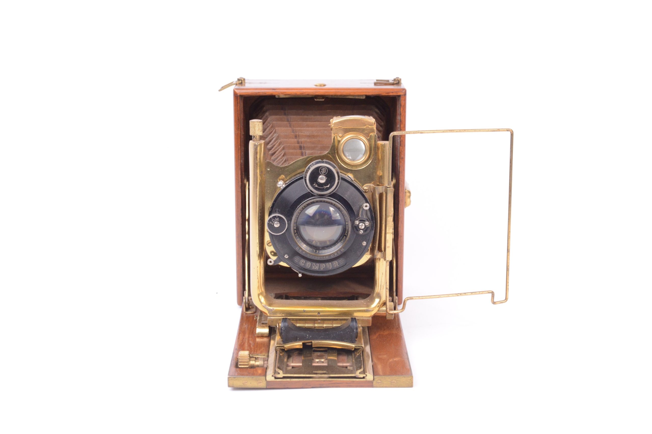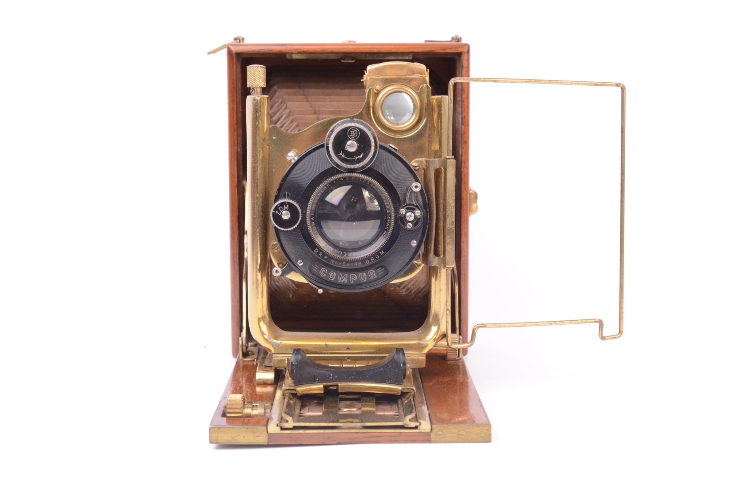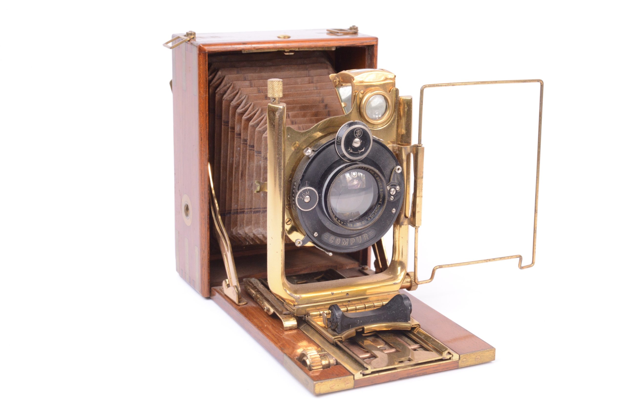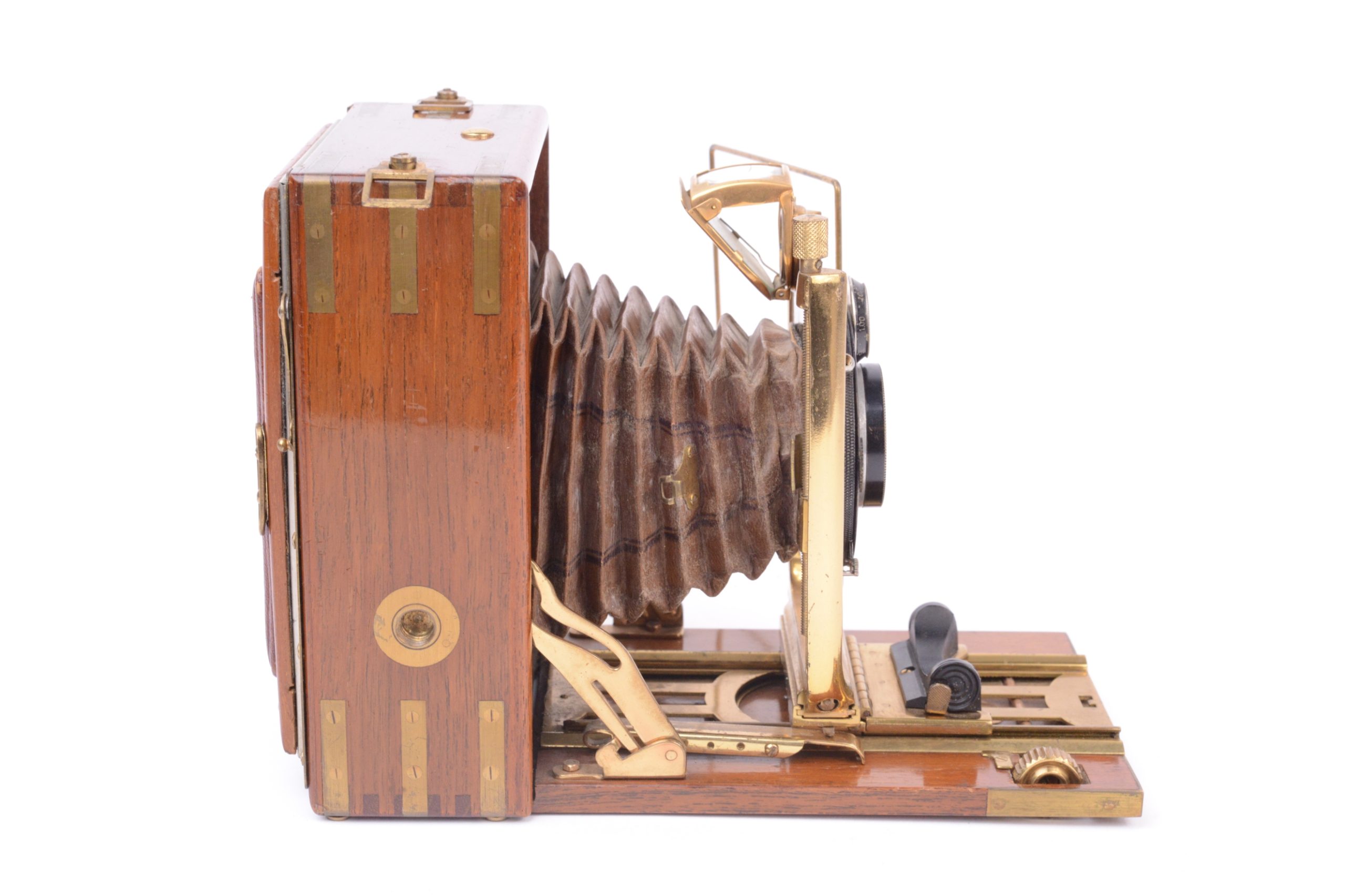 Le « Colonial » Lumière. Vers 1925. Format 9xl2 cm. Construction en bois de Teck verni renforcé, avec parties métalliques en laiton verni. Soufflet en cuir havane traité spécialement pour les colonies. Il est présenté ainsi dans le catalogue Lumière de l’époque :  Spécialement construit pour résister aux climats chauds et humides, cet appareil présente une rigidité à toute épreuve et une précision ra rement atteinte dans les appareils à main. Il est recommandé, non seulement aux opérateurs habitant les colonies, mais encore à tous les amateurs soucieux de posséder un matériel, luxueux et robuste à la fois, susceptible de conserver indéfiniment ses qualités initiales ». Principales caractéristiques techniques : « Double tirage - Corps en bois de teck, coins renforcés par équerres en laiton, abattant armé, toutes pièces polies et vernies d'un fini parfait - Chariot à double crémaillère taillée, noyé dans l'abattant. Toutes vis fixées freinées par doubles plots. Grand U porte-objectif à double décentrement par vis micrométriques. Soufflet renforcé et vissé sous cadre protecteur Grand viseur clair réversible et redresseur - Vis e u r iconométrique - Deux écrous Congrès ».  Cet appareil a probablement été fabriqué par Hirlemann & Moreau commercialisé sous l’appellation « Hemax ». Très bel appareil.