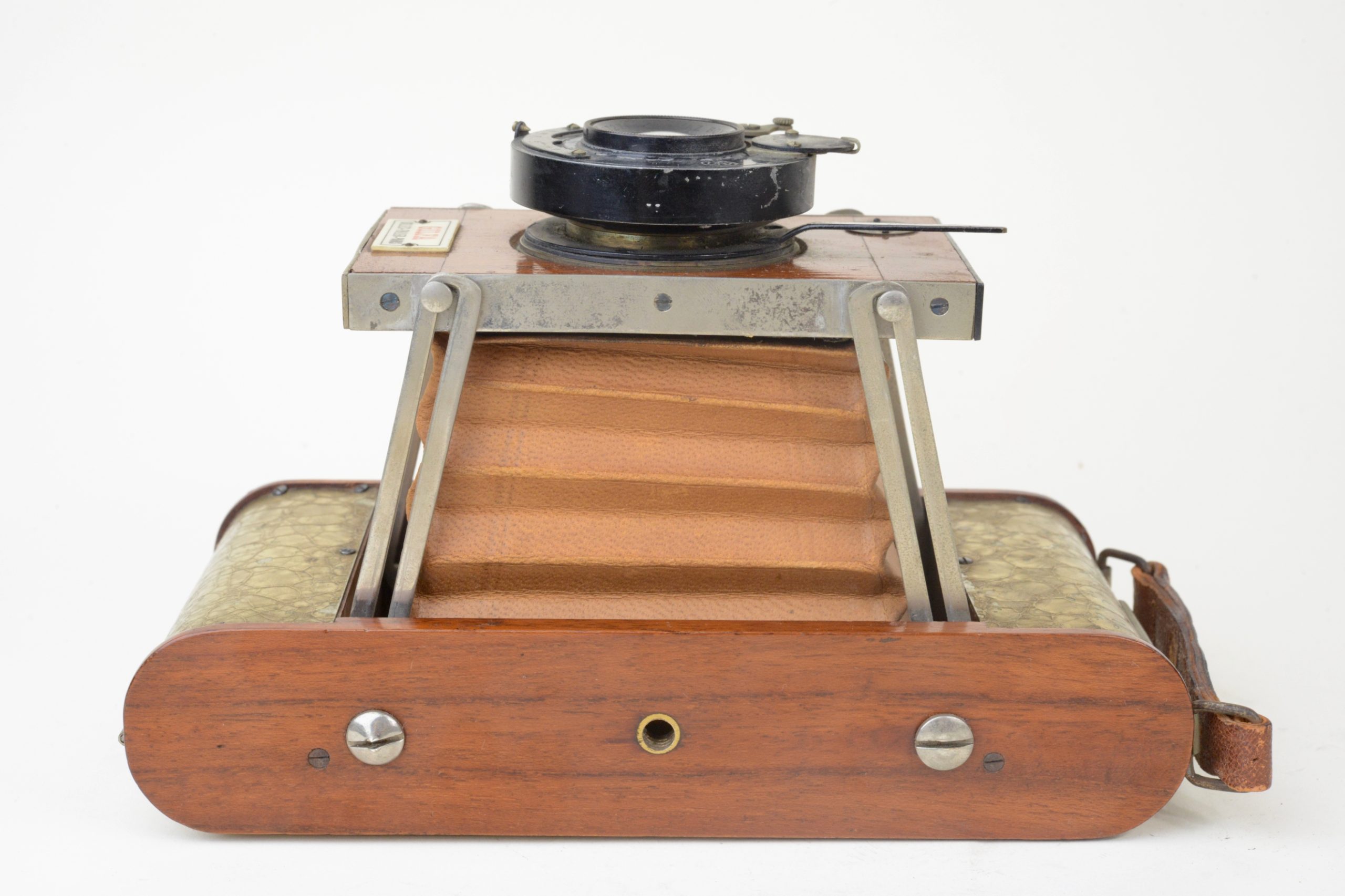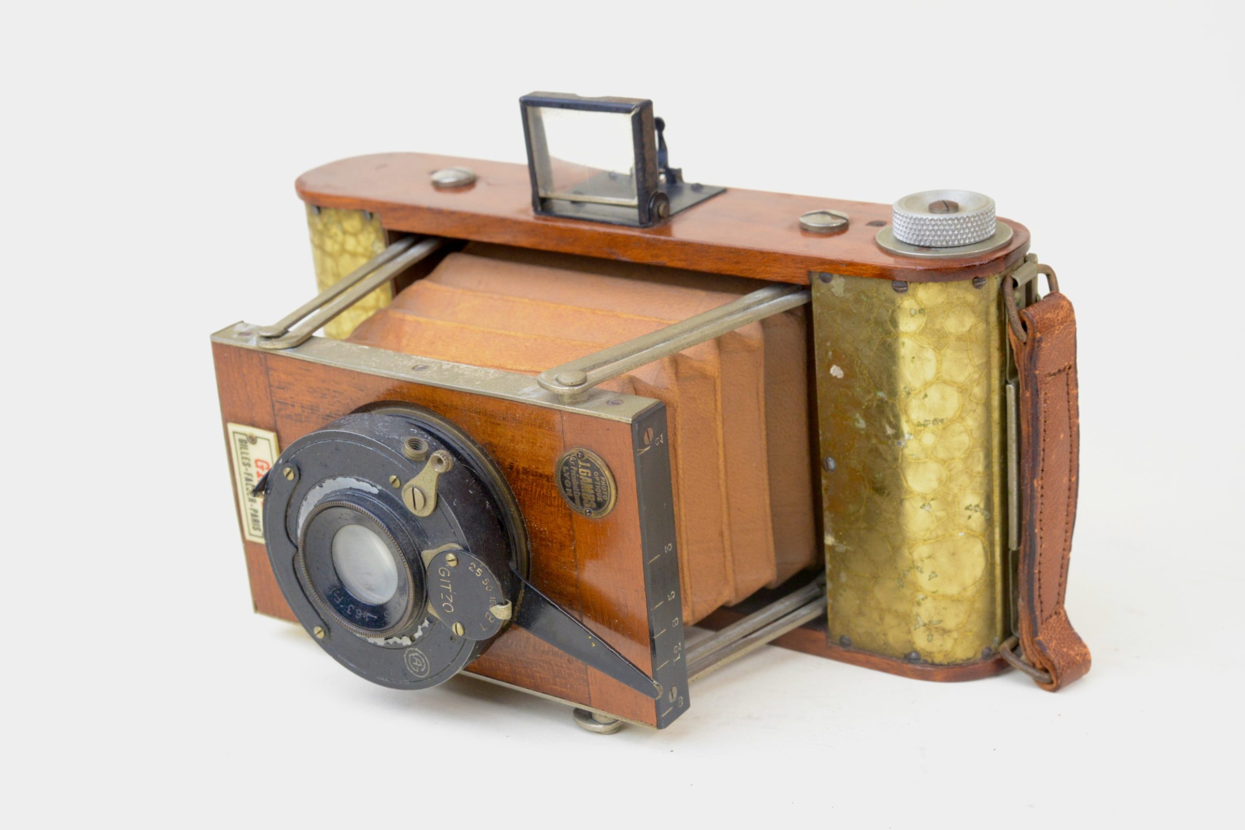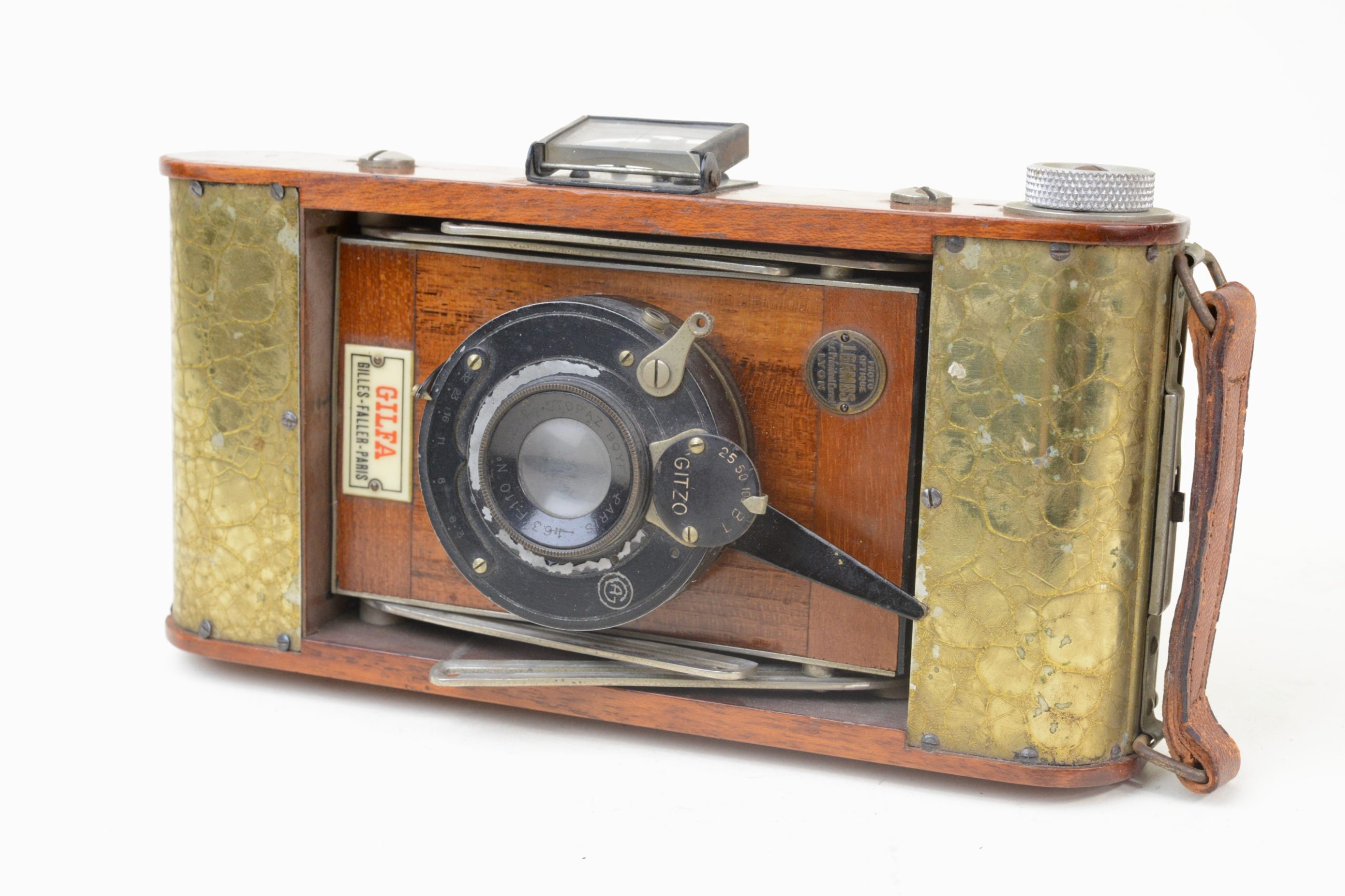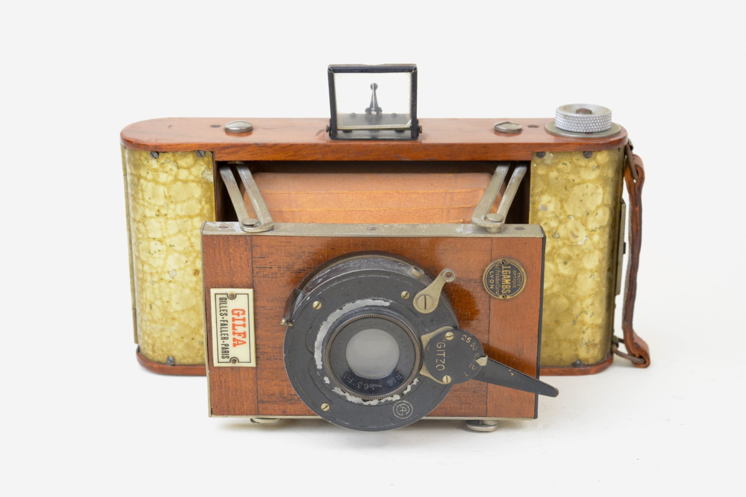 Très rare version à film du Gilfa de Gilles-Faller. Fin des années 1920. Appareil de grand luxe à tendeurs 6,5x9, construit en acajou verni, soufflet en peau de couleur havane, ferrures nickelées. Corps de l’appareil rehaussé d’une couverture métallique recouverte d’un vernis craquelé jaune. Appareil à mise au point hélicoïdale. Obturateur Gitzo, pose et instantané 1/25, 1/50, 1/100 de seconde. ». Objectif Topaz Boyer, 1 : 6,3 F=110 mm.  Viseur clair direct à lentille négative. Utilise des bobines à film 620. A notre connaissance, seul exemplaire rencontré à ce jour, bel état.