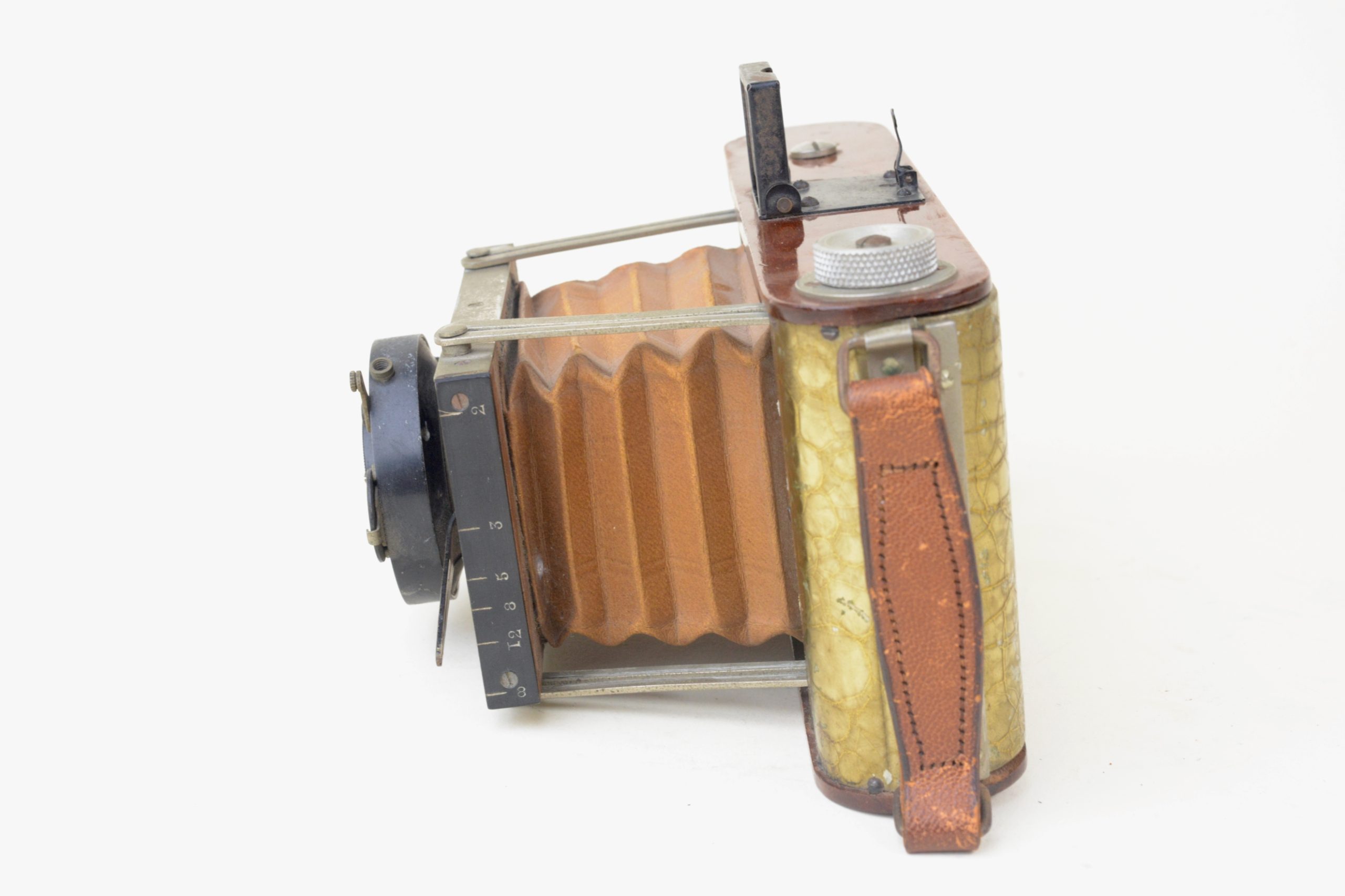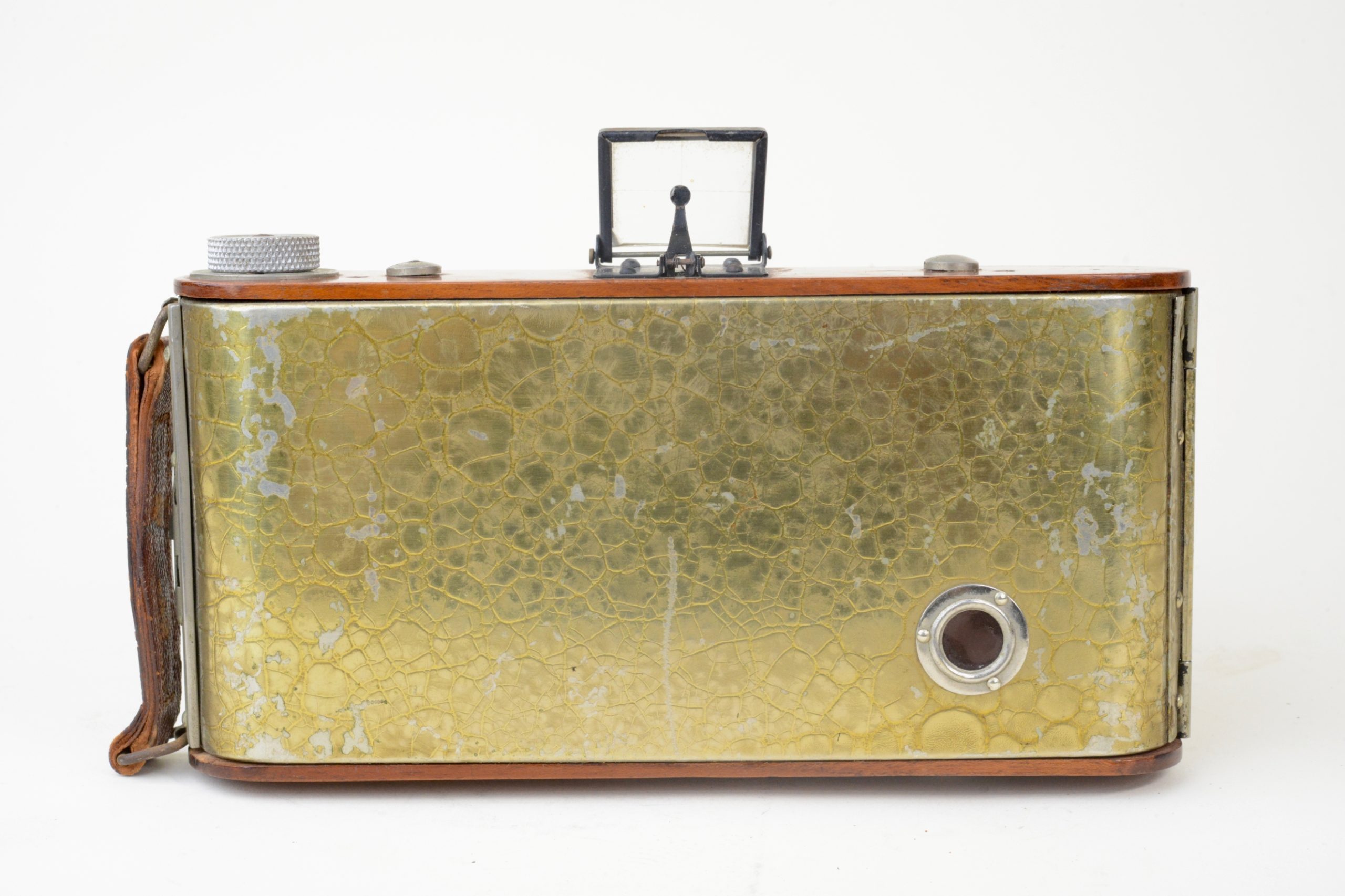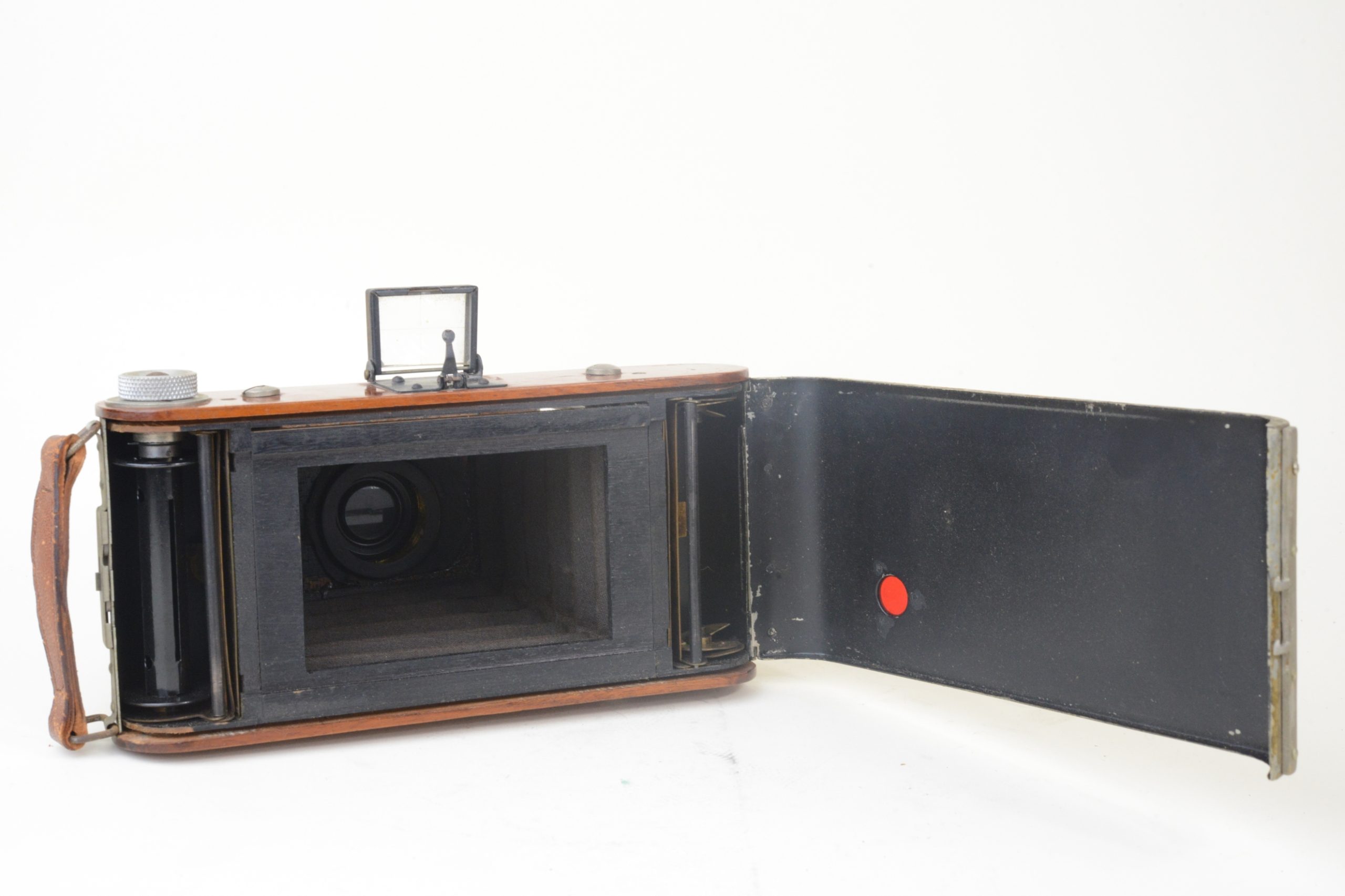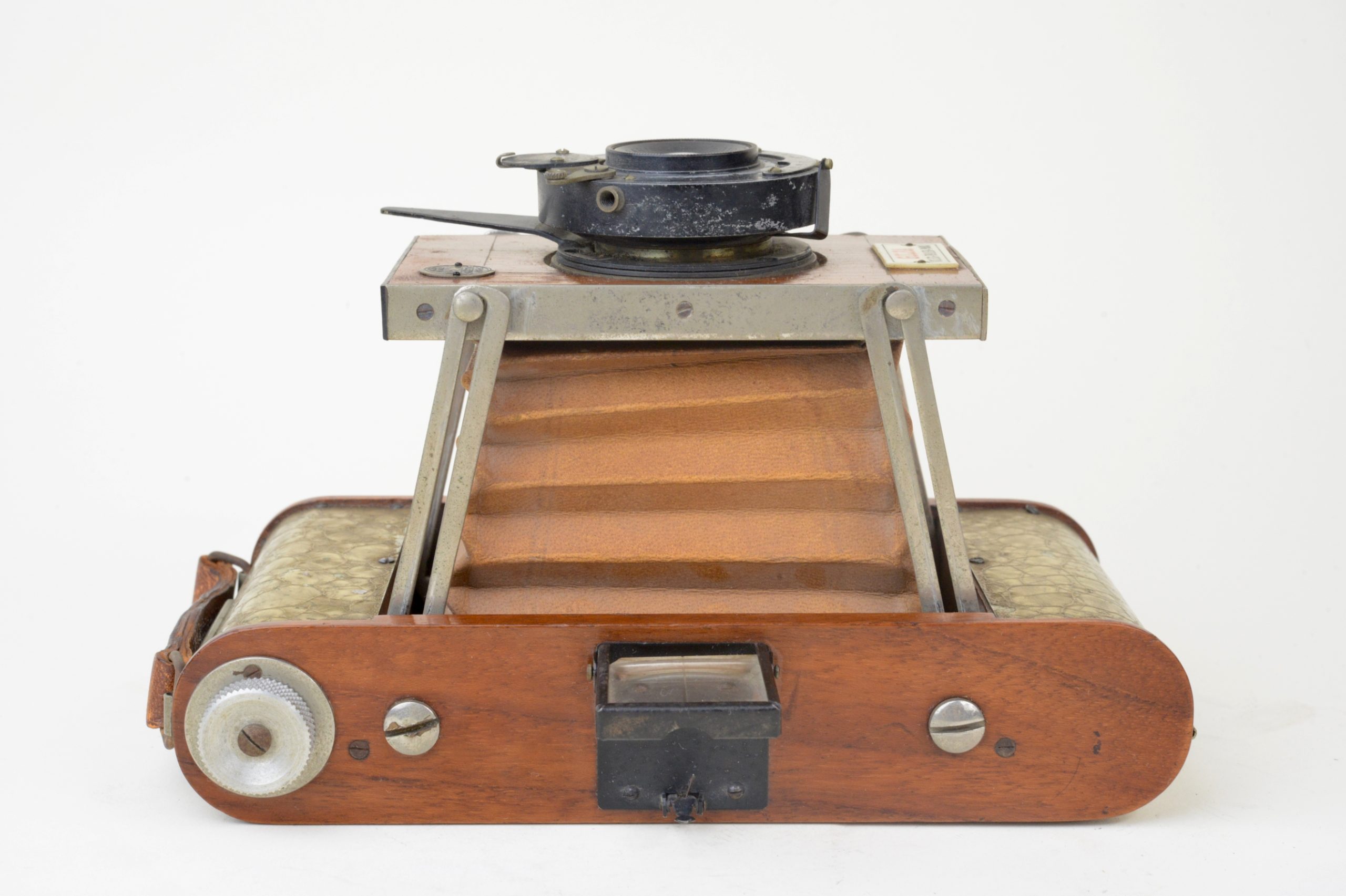 Très rare version à film du Gilfa de Gilles-Faller. Fin des années 1920. Appareil de grand luxe à tendeurs 6,5x9, construit en acajou verni, soufflet en peau de couleur havane, ferrures nickelées. Corps de l’appareil rehaussé d’une couverture métallique recouverte d’un vernis craquelé jaune. Appareil à mise au point hélicoïdale. Obturateur Gitzo, pose et instantané 1/25, 1/50, 1/100 de seconde. ». Objectif Topaz Boyer, 1 : 6,3 F=110 mm.  Viseur clair direct à lentille négative. Utilise des bobines à film 620. A notre connaissance, seul exemplaire rencontré à ce jour, bel état.