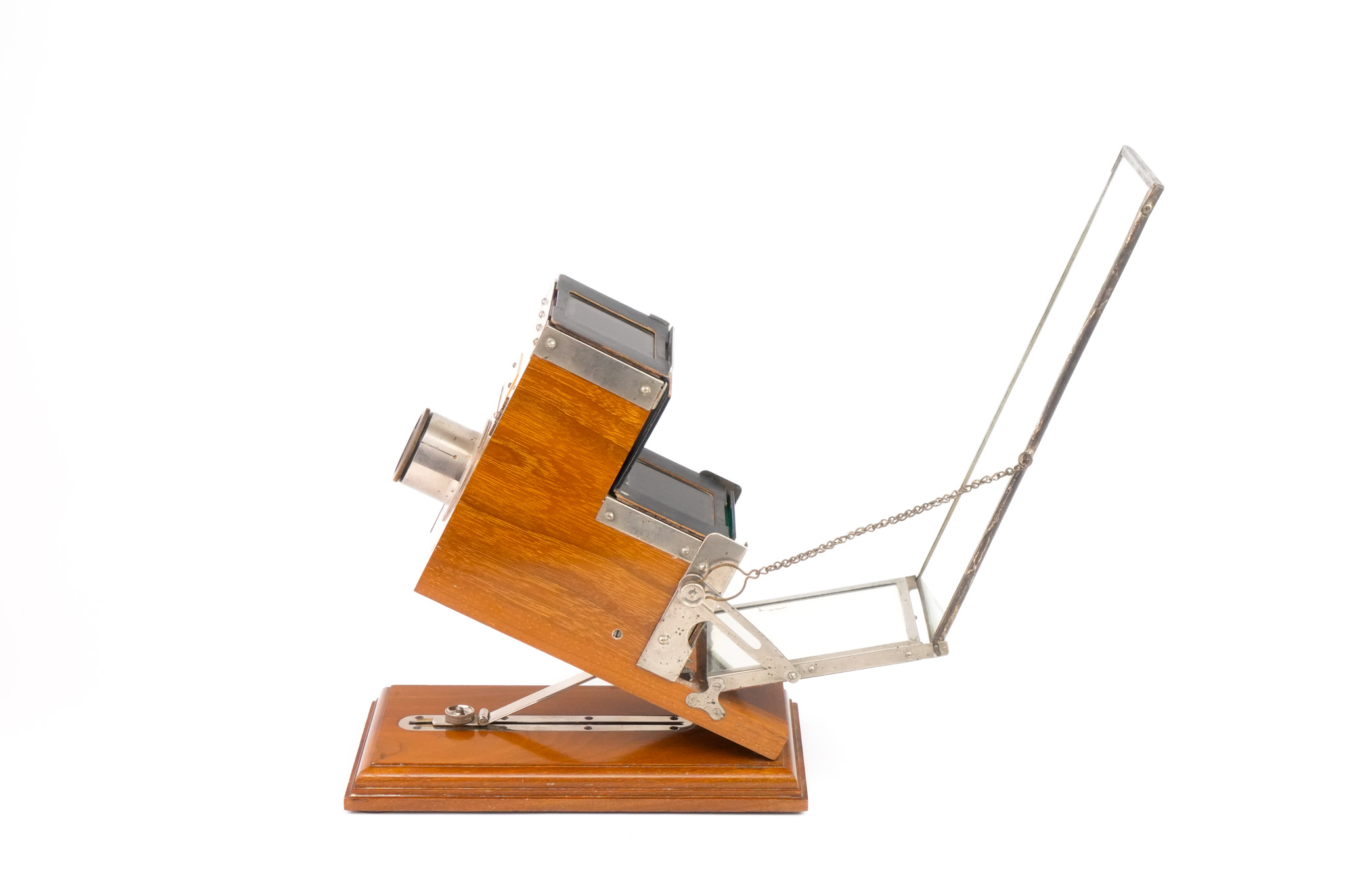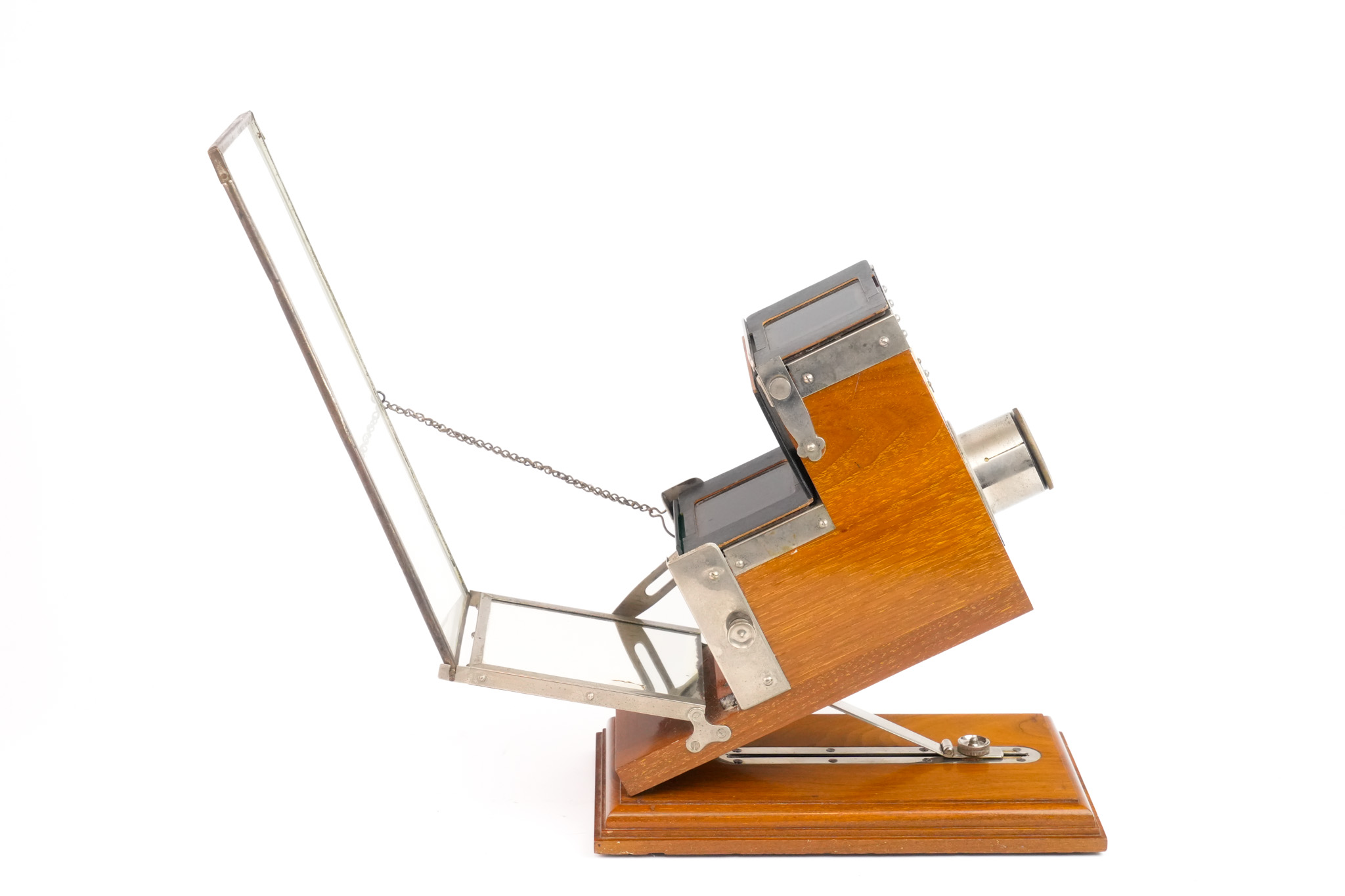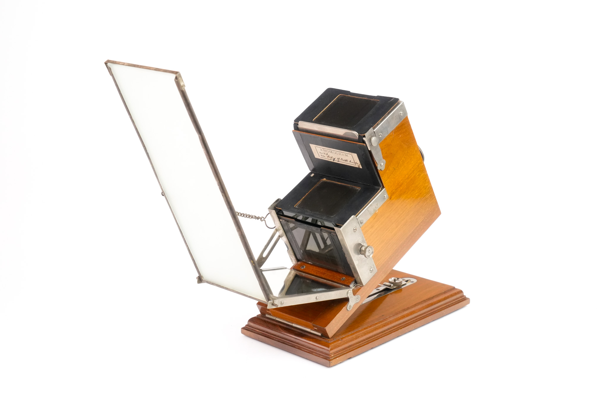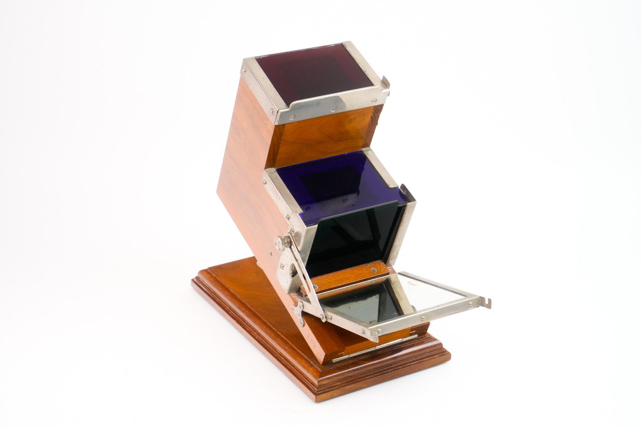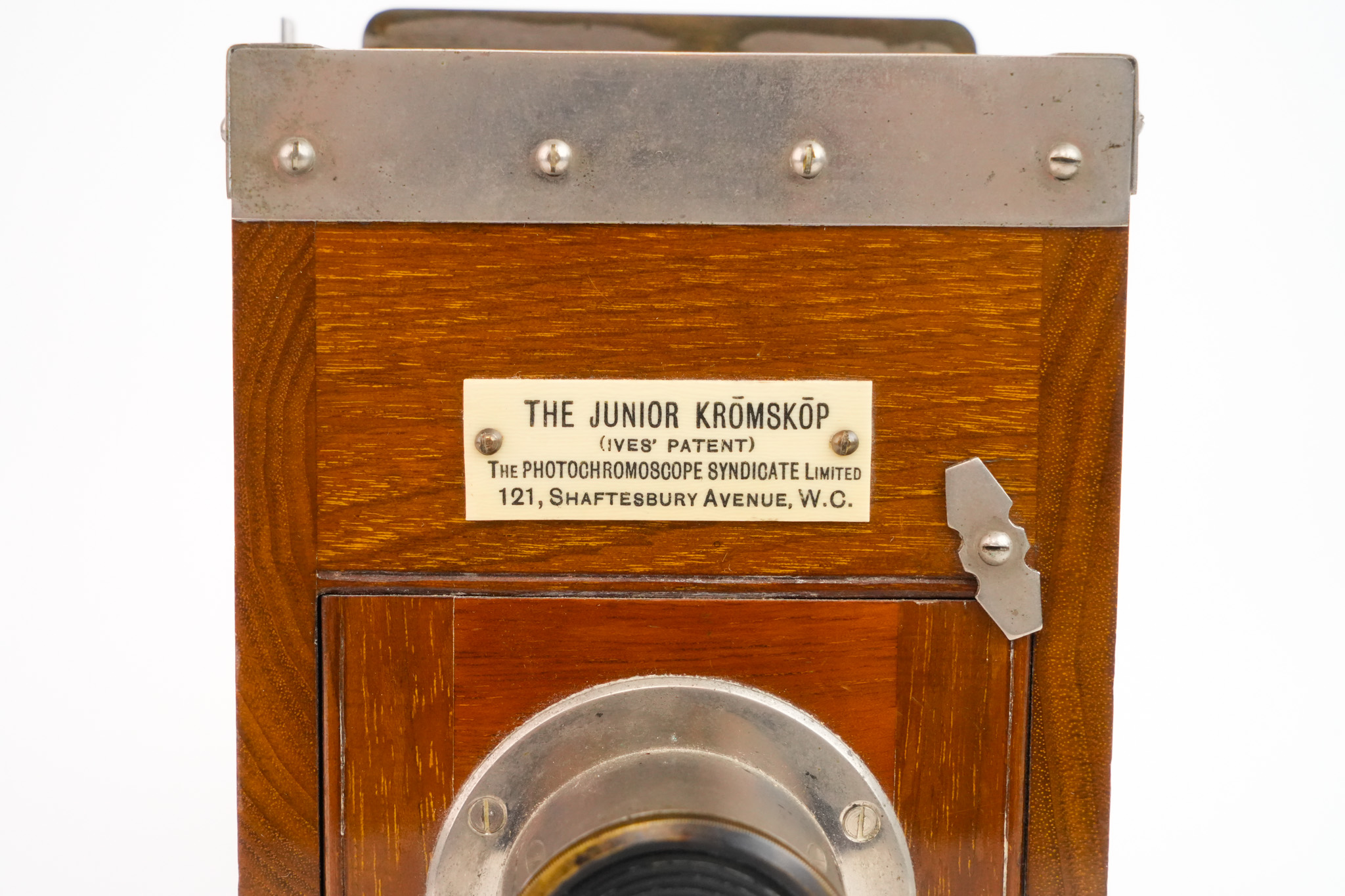 Le Kromskop, ou photochromoscope, mis au point dans les années 1890 par l’inventeur américain Frederic Eugene Ives, est une visionneuse destinée à restituer des images photographiques en couleurs selon le principe de la synthèse additive trichrome : trois plaques identiques en noir et blanc, prises à travers des filtres rouge, vert et bleu, sont introduites dans l’appareil et mises en correspondance avec ces mêmes filtres afin de recomposer visuellement une image colorée d’un grand réalisme. Le modèle présenté, en coffret de bois avec éléments métalliques et optiques, correspond à une version dite « Junior Kromskop », compacte et destinée à un usage individuel, dans laquelle les trois images sont mécaniquement liées entre elles par des bandes de tissu assurant leur synchronisation lors de l’observation. Ce dispositif ingénieux, constitue une étape majeure dans l’histoire de la photographie avant l’apparition des procédés directs comme l’autochrome ; il existe également une version stéréoscopique cet exemplaire correspond à une rare version monoculaire.