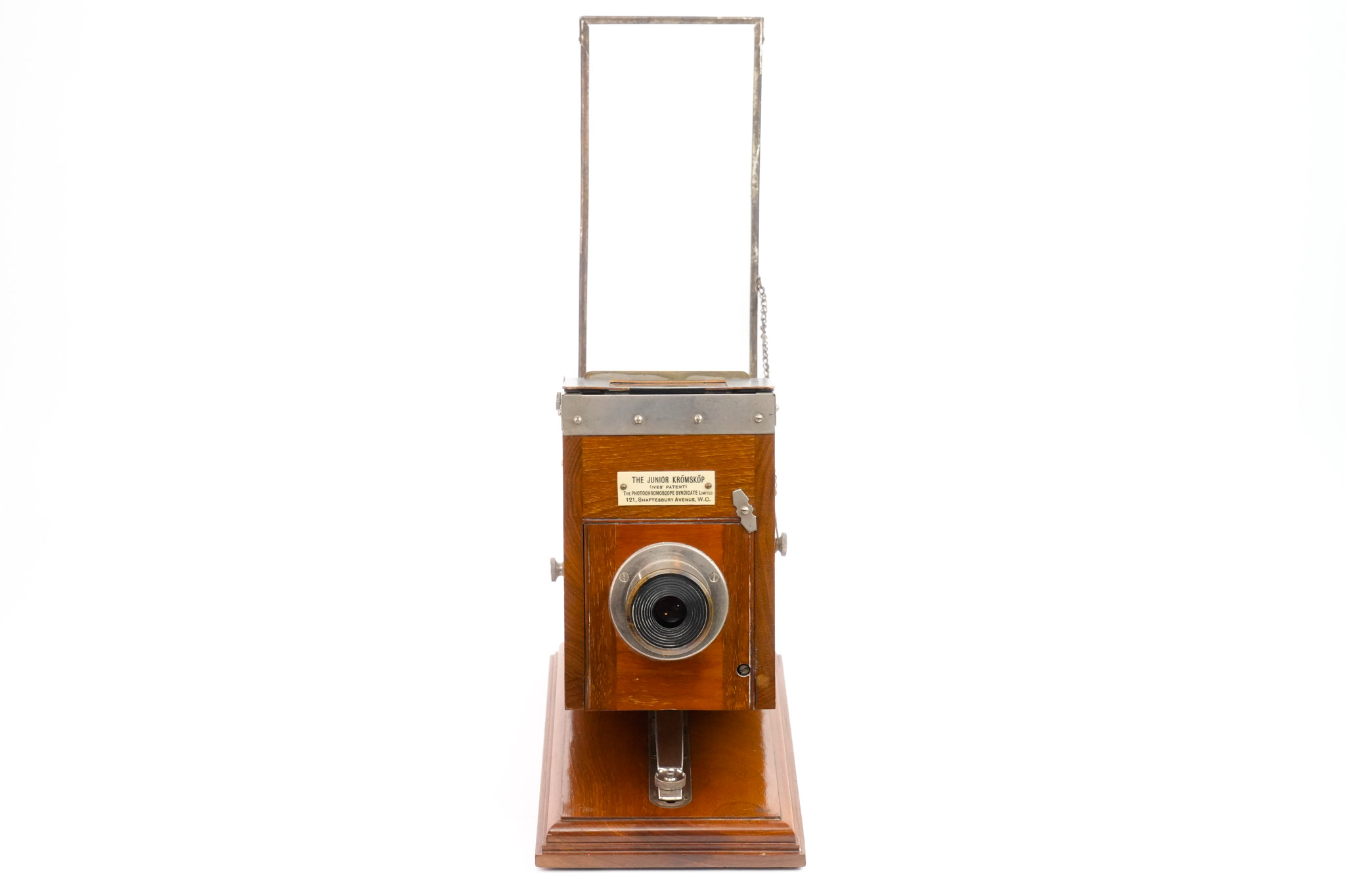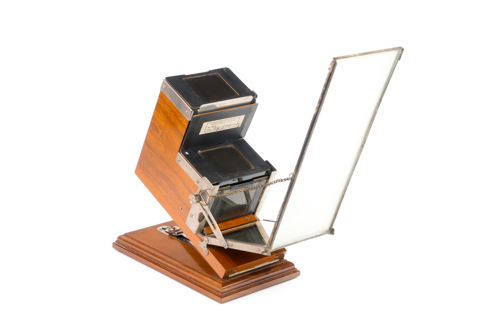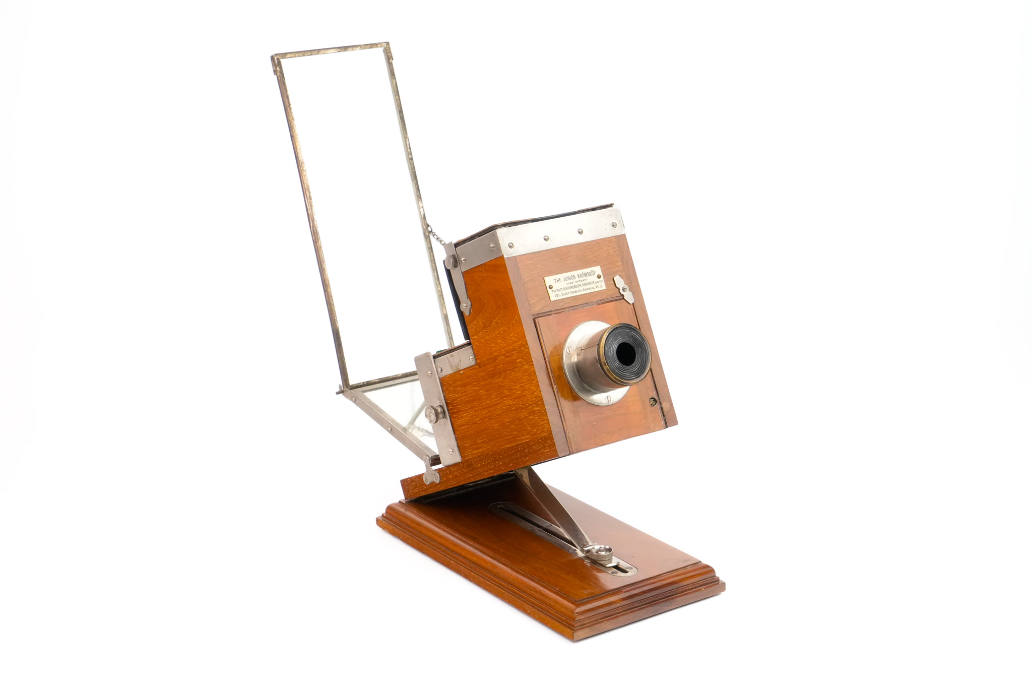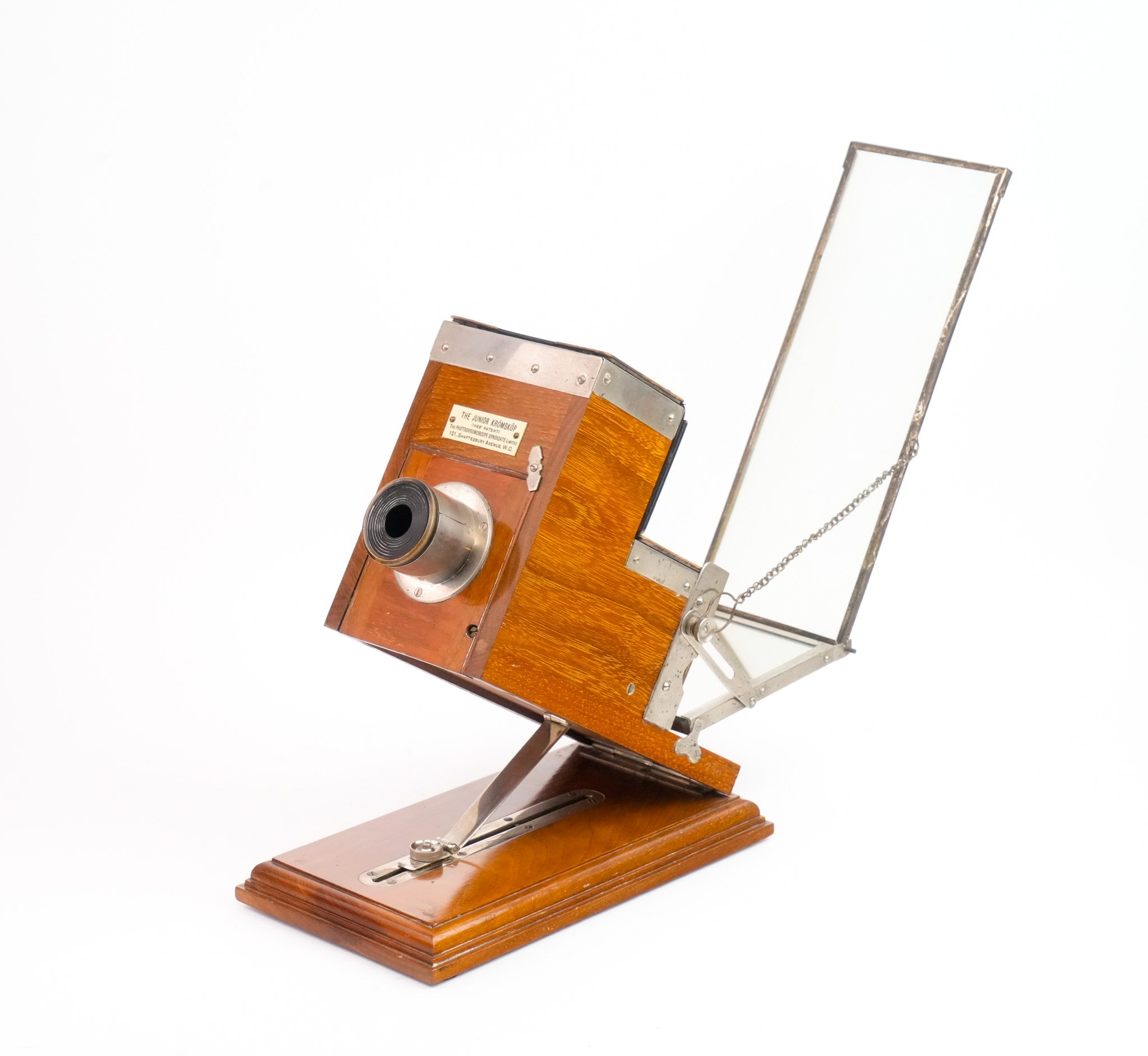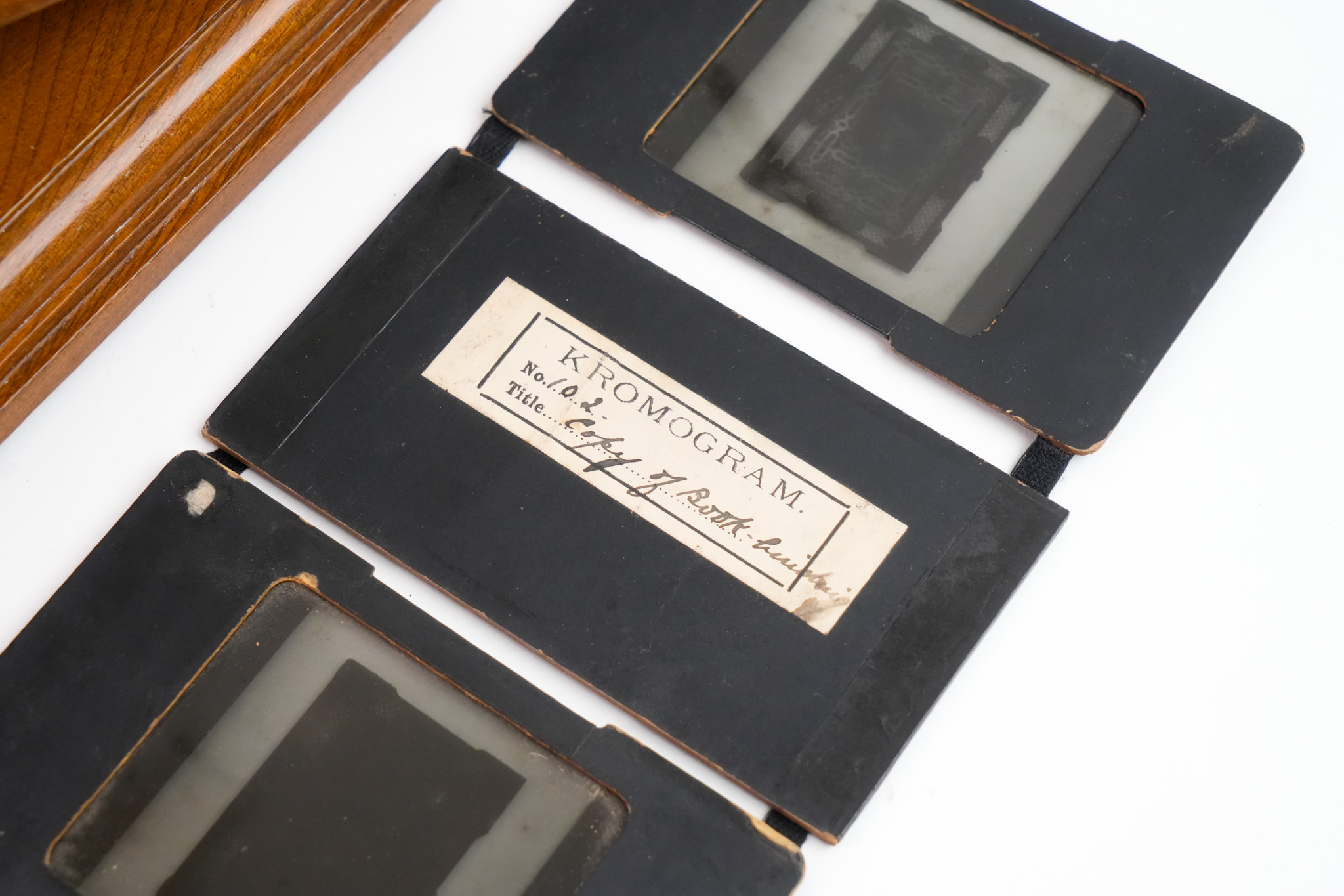 Le Kromskop, ou photochromoscope, mis au point dans les années 1890 par l’inventeur américain Frederic Eugene Ives, est une visionneuse destinée à restituer des images photographiques en couleurs selon le principe de la synthèse additive trichrome : trois plaques identiques en noir et blanc, prises à travers des filtres rouge, vert et bleu, sont introduites dans l’appareil et mises en correspondance avec ces mêmes filtres afin de recomposer visuellement une image colorée d’un grand réalisme. Le modèle présenté, en coffret de bois avec éléments métalliques et optiques, correspond à une version dite « Junior Kromskop », compacte et destinée à un usage individuel, dans laquelle les trois images sont mécaniquement liées entre elles par des bandes de tissu assurant leur synchronisation lors de l’observation. Ce dispositif ingénieux, constitue une étape majeure dans l’histoire de la photographie avant l’apparition des procédés directs comme l’autochrome ; il existe également une version stéréoscopique cet exemplaire correspond à une rare version monoculaire.