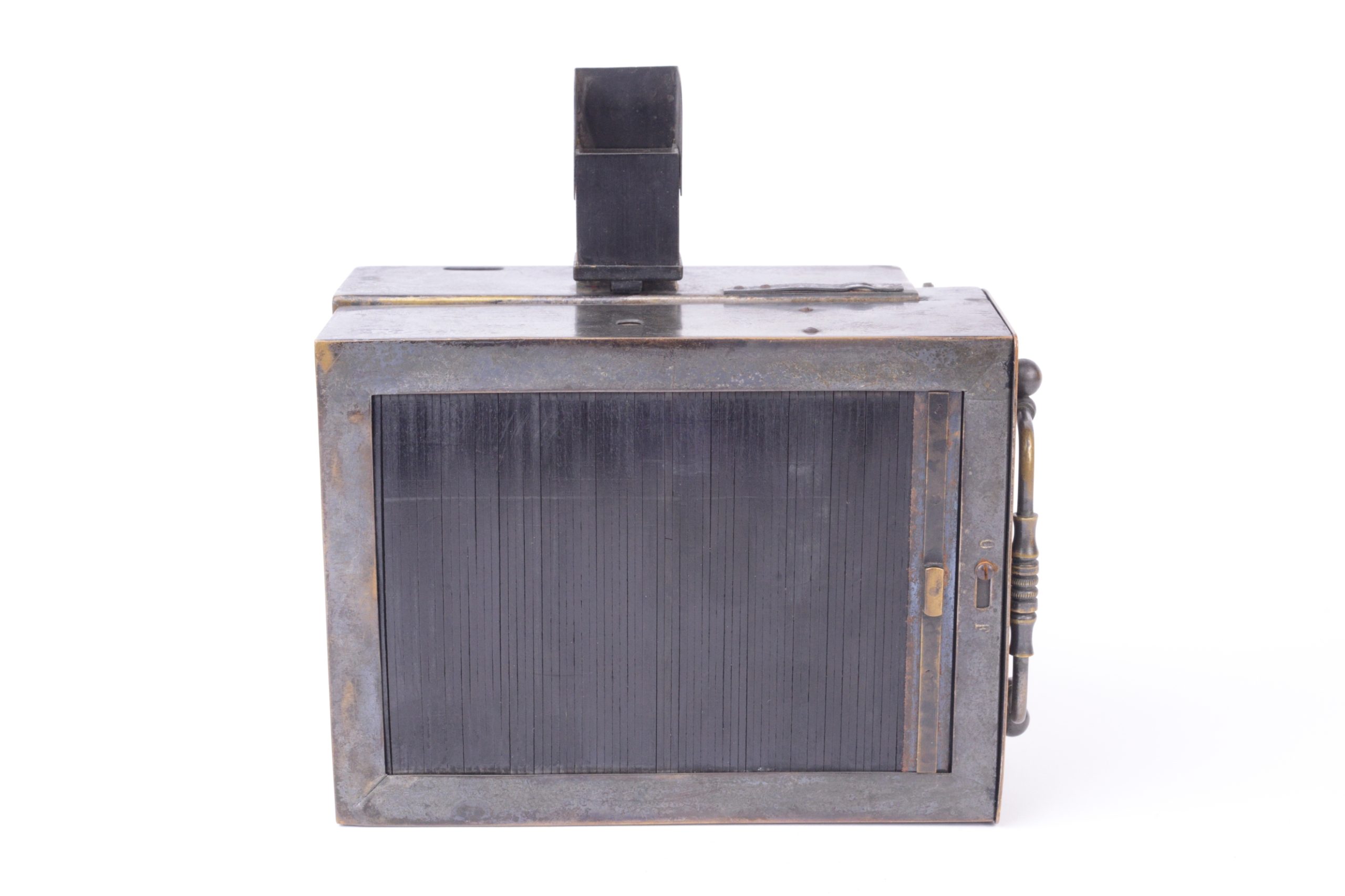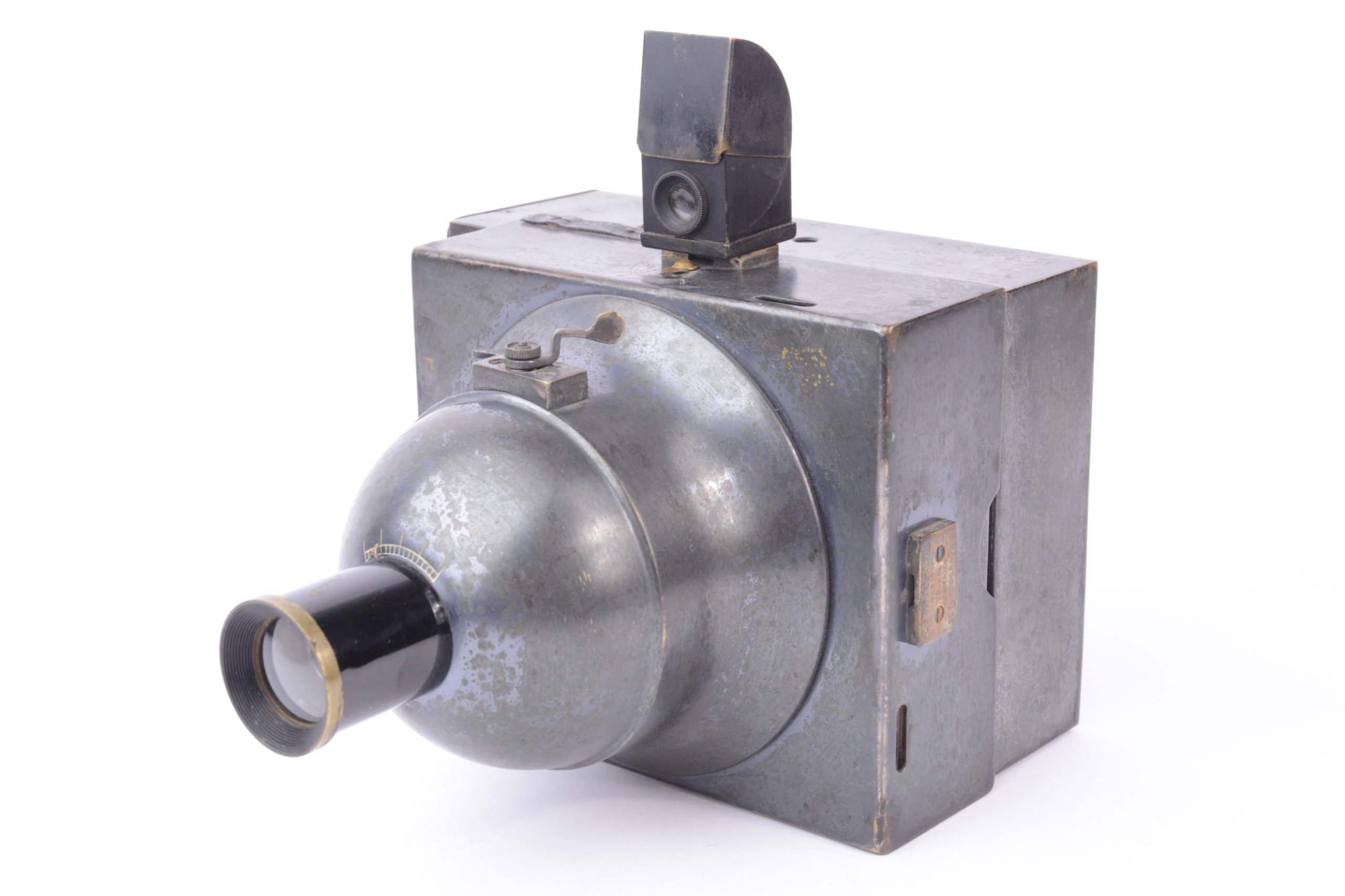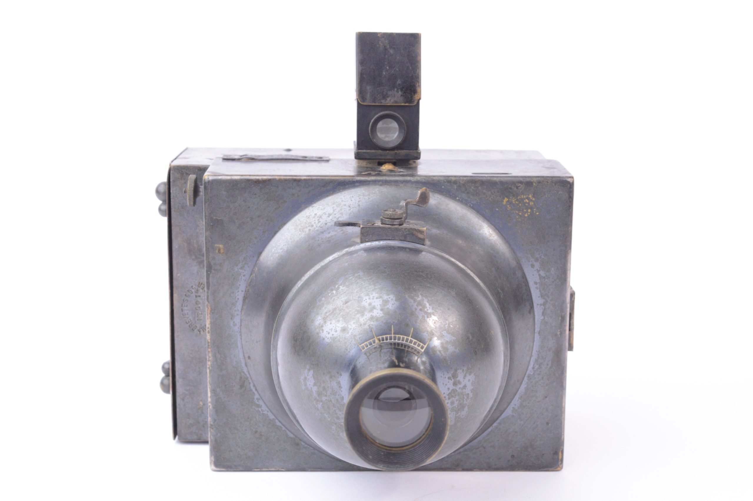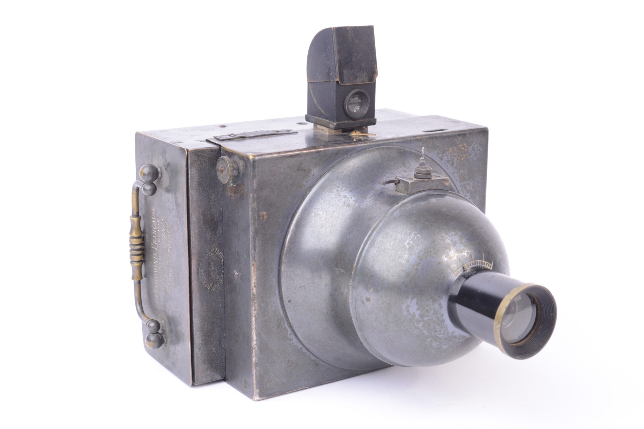 Photosphère 9x12 de la Compagnie Française de Photographie, inventé par Napoléon Conti en 1887. L'appareil est en cuivre argenté oxydé verni. Il était particulièrement employé par les officiers et les explorateurs dans les contrées coloniales de la fin du XIXème siècle. Dans la presse de cette époque, on n'a pas hésité à rapporter le succès de l'emploi de cet appareil. C'est le cas, notamment, lors de la célèbre mission du Capitaine Binger en Afrique et au cours de laquelle il a pu ramener, grâce au Photosphère, un millier de clichés des territoires coloniaux. L’appareil présenté est équipé d’un châssis magasin (peu courant). L'appareil est muni du viseur clair à réflexion à capuchon (d’origine). L’appareil porte le numéro 2955. Très belle patine.