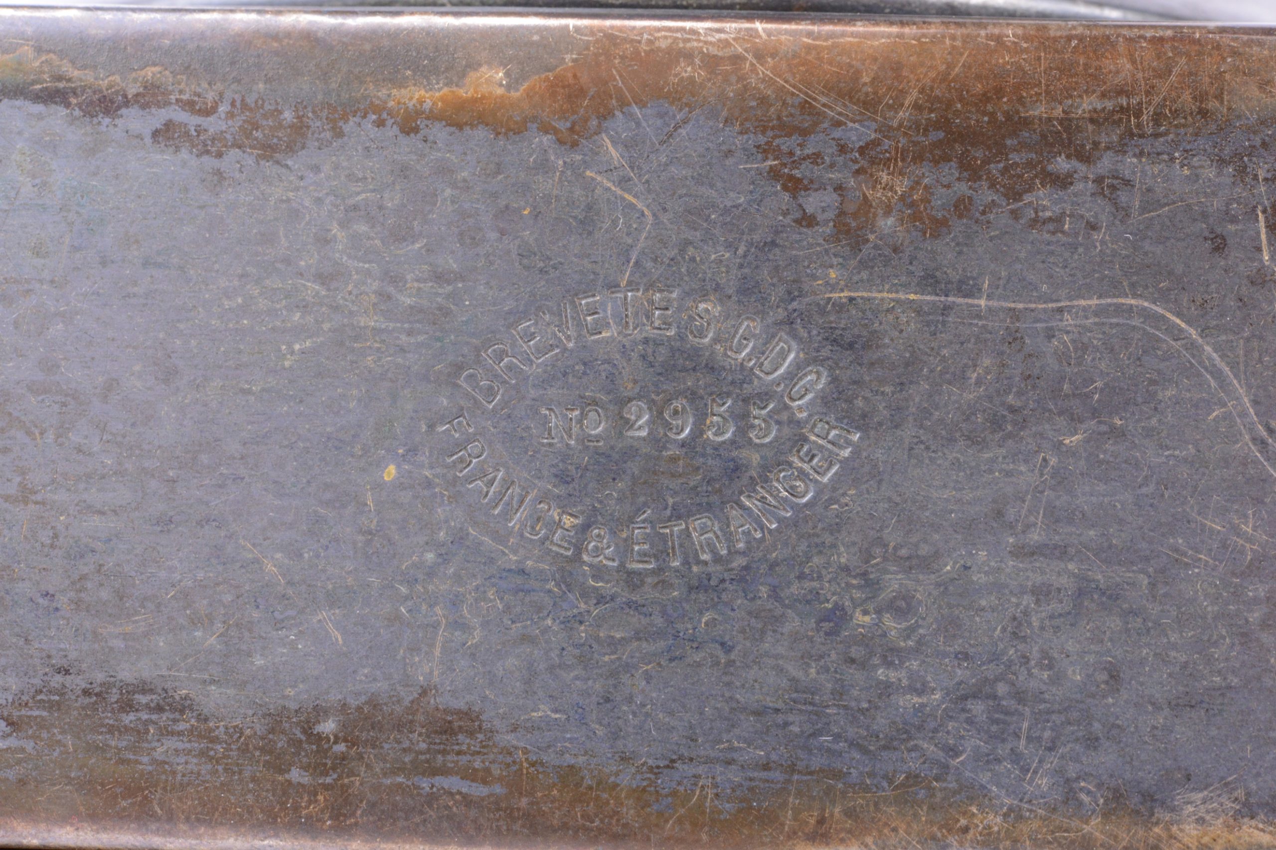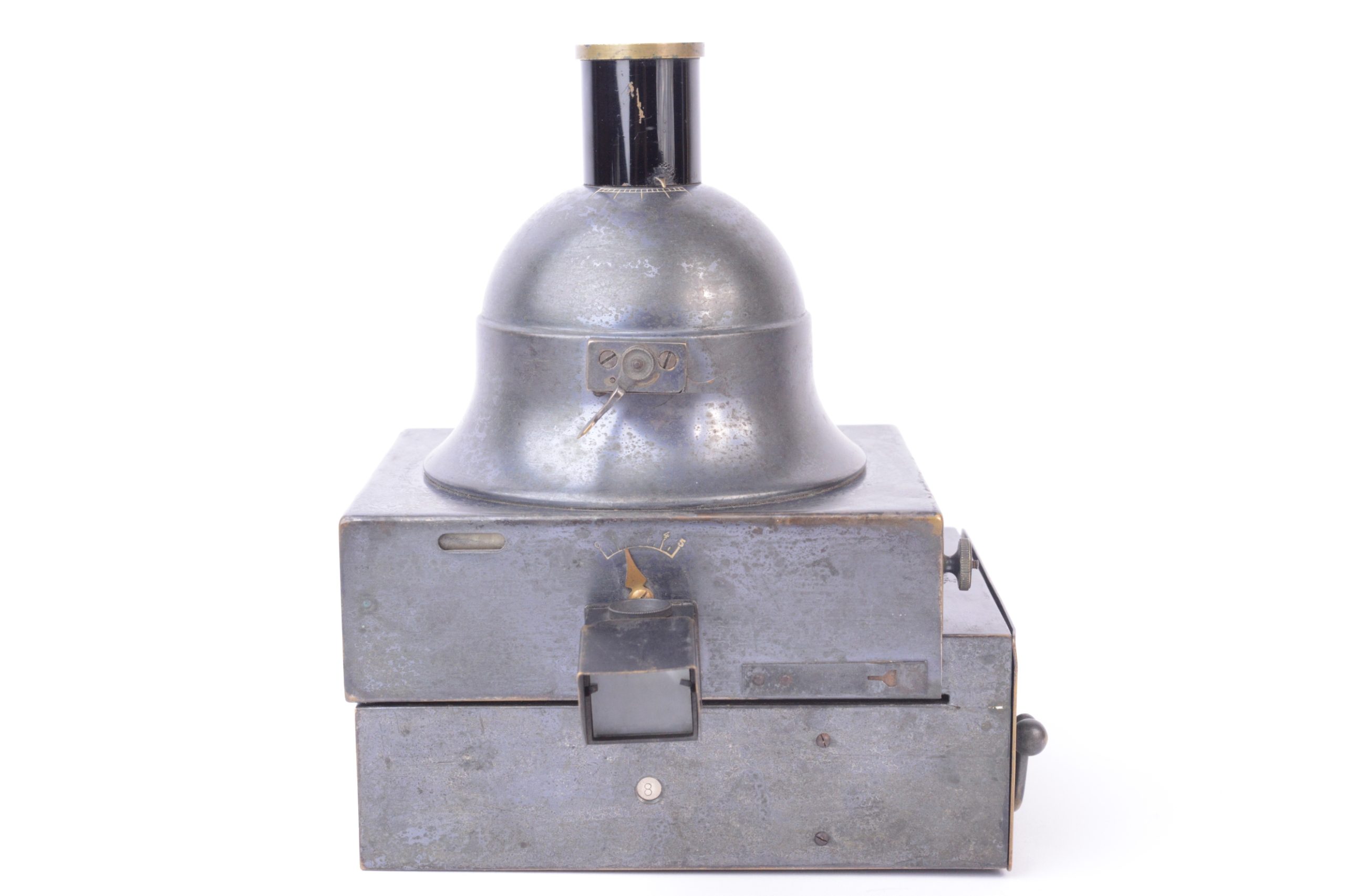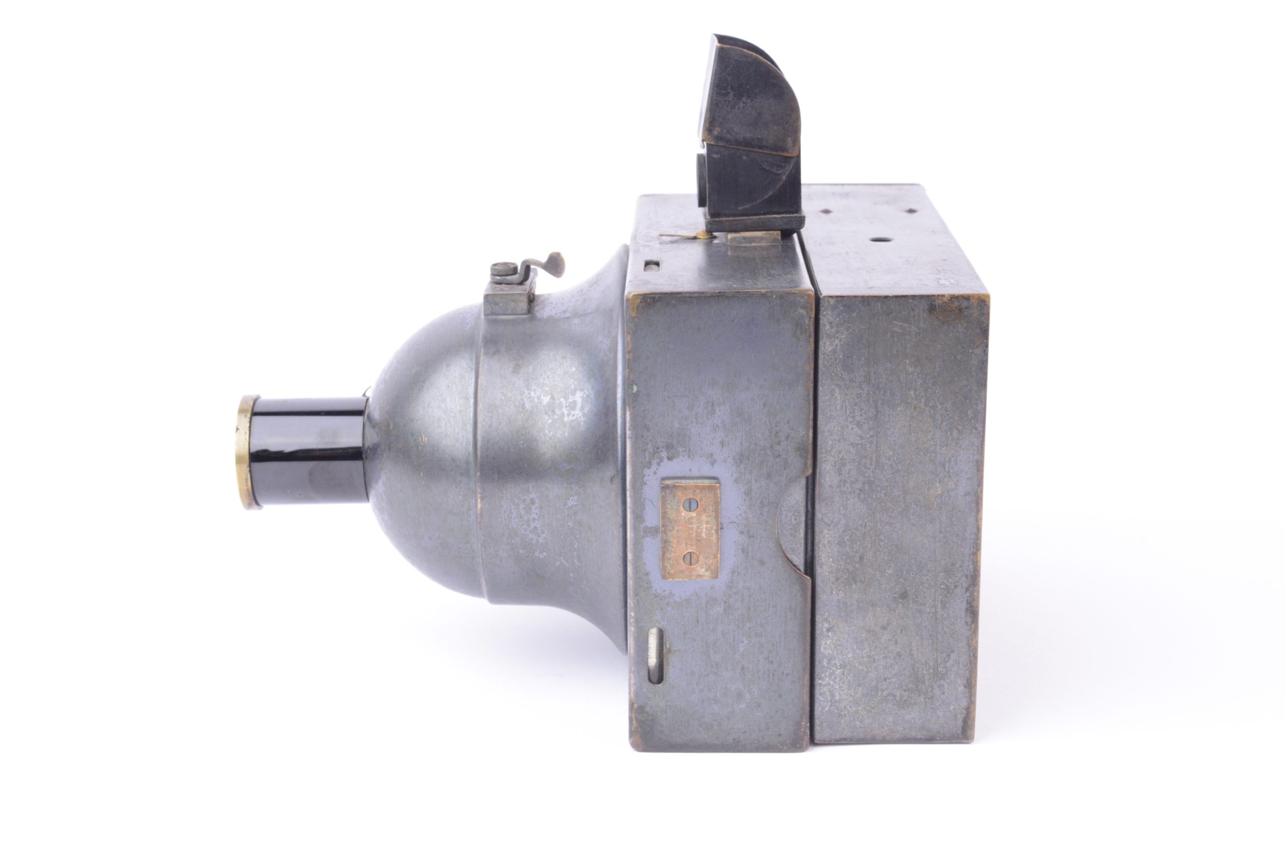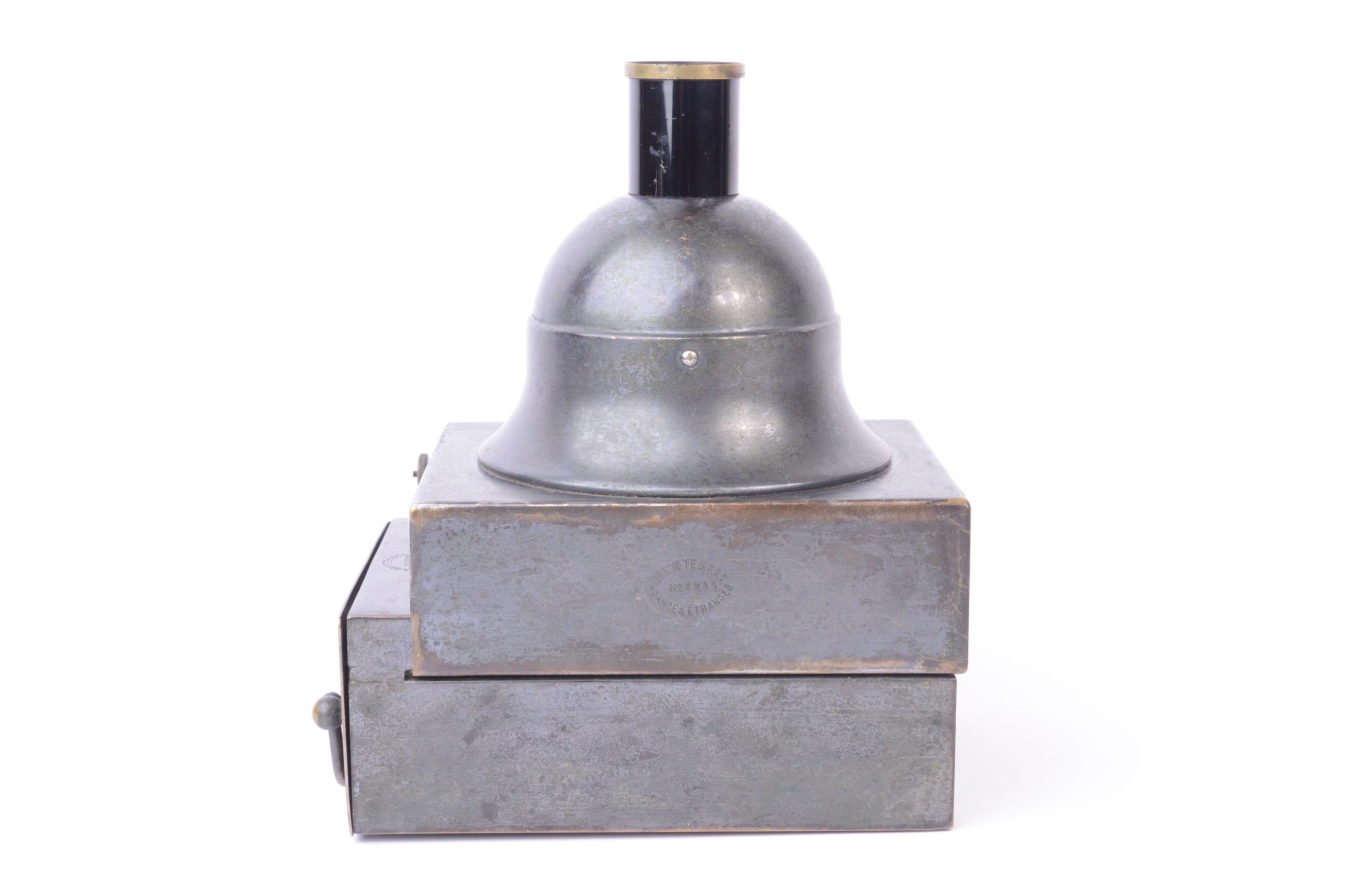 Photosphère 9x12 de la Compagnie Française de Photographie, inventé par Napoléon Conti en 1887. L'appareil est en cuivre argenté oxydé verni. Il était particulièrement employé par les officiers et les explorateurs dans les contrées coloniales de la fin du XIXème siècle. Dans la presse de cette époque, on n'a pas hésité à rapporter le succès de l'emploi de cet appareil. C'est le cas, notamment, lors de la célèbre mission du Capitaine Binger en Afrique et au cours de laquelle il a pu ramener, grâce au Photosphère, un millier de clichés des territoires coloniaux. L’appareil présenté est équipé d’un châssis magasin (peu courant). L'appareil est muni du viseur clair à réflexion à capuchon (d’origine). L’appareil porte le numéro 2955. Très belle patine.