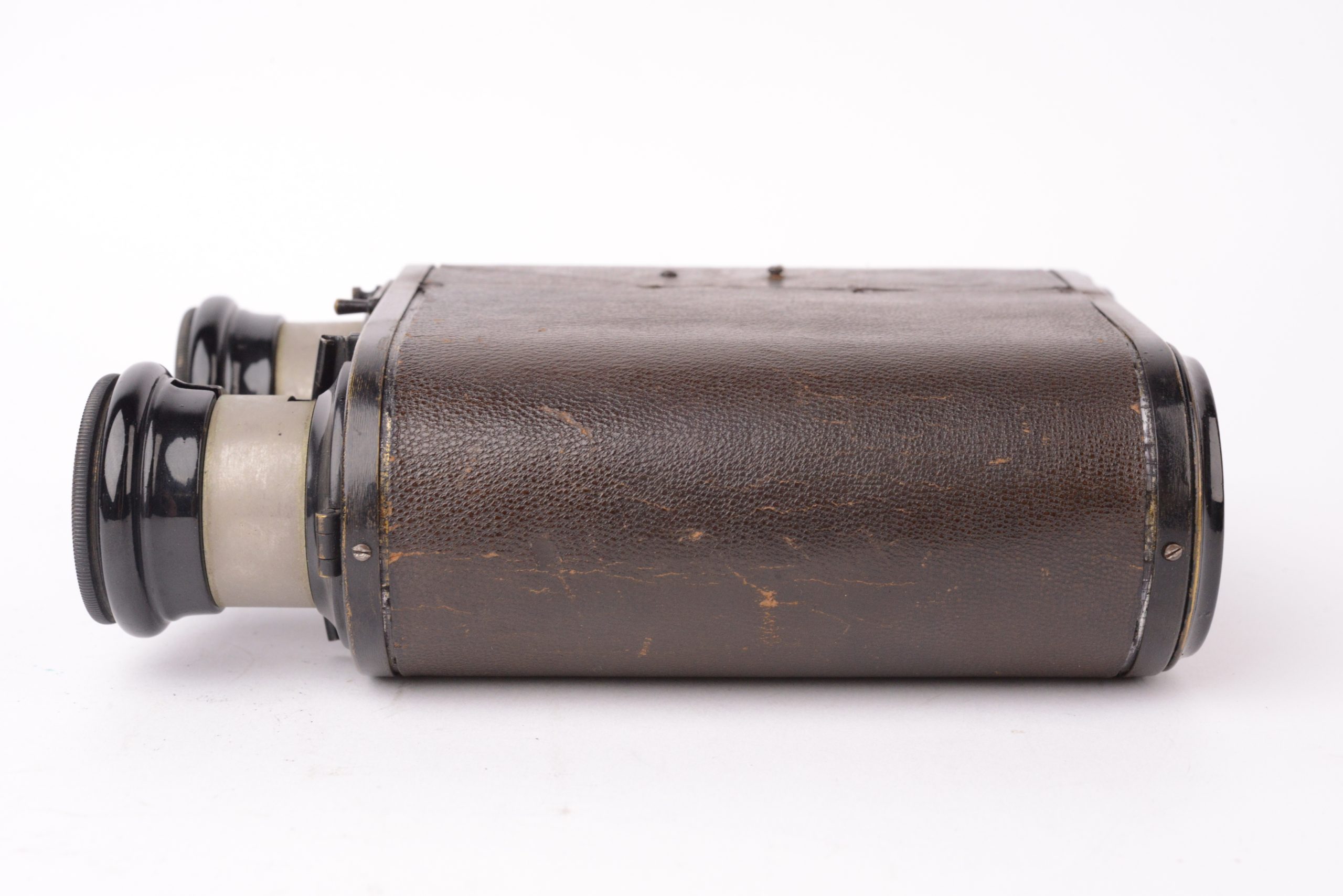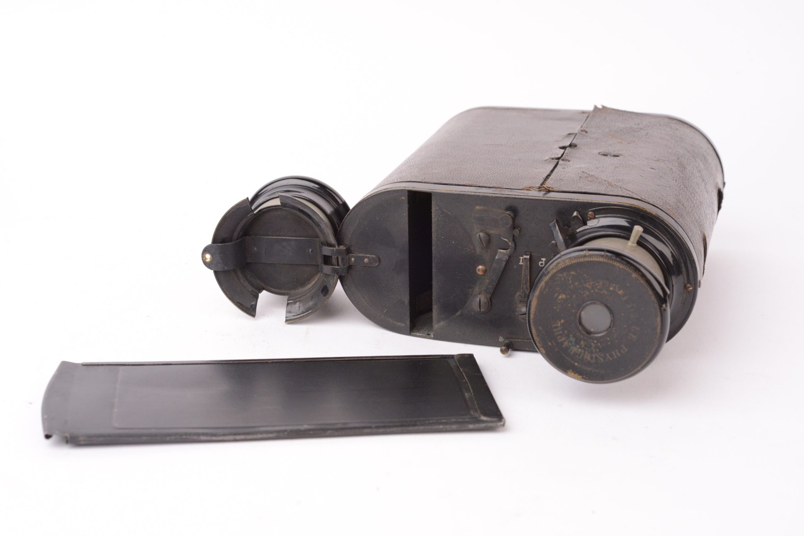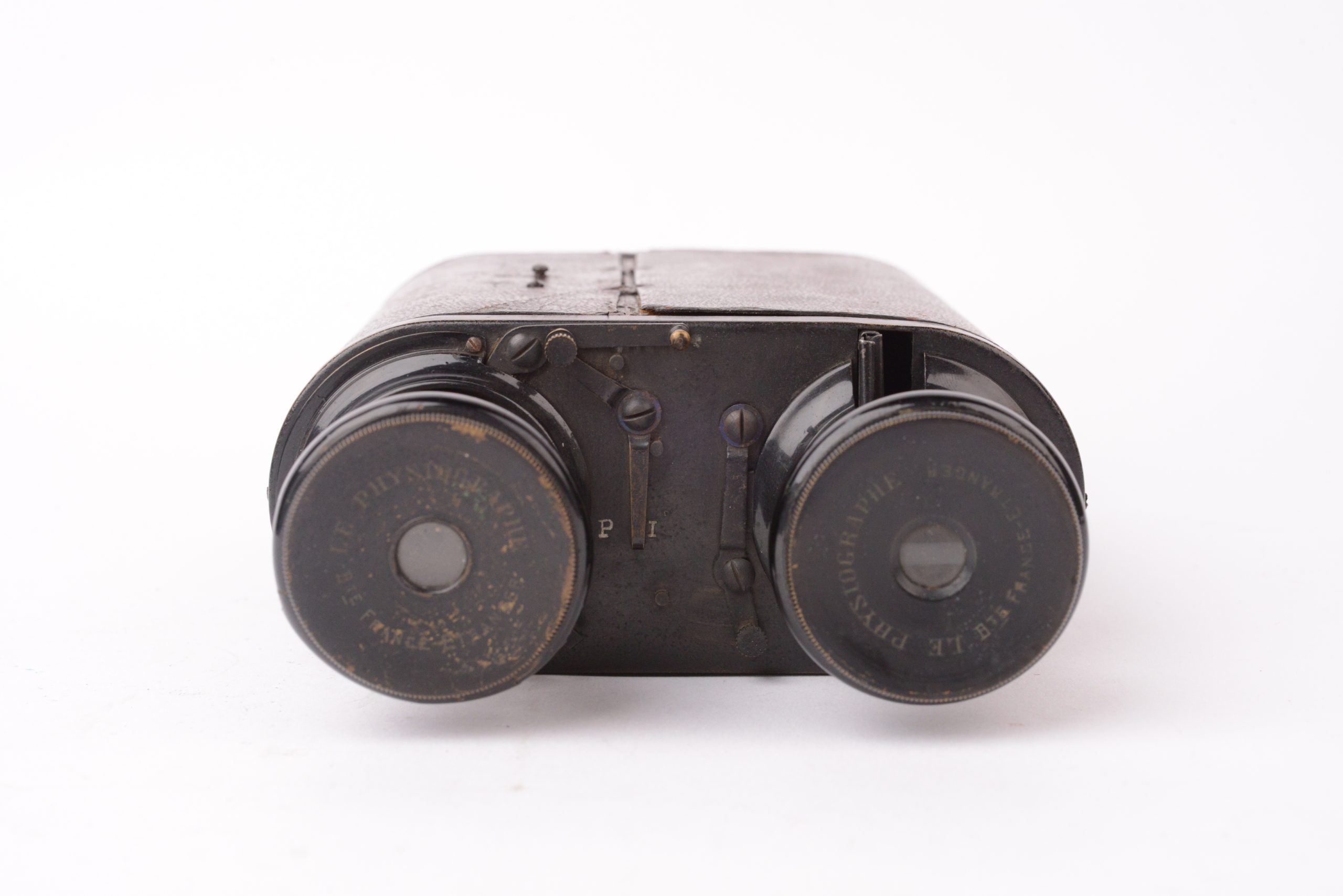 Le Physiographe stéréoscopique 45x107 est conçu et construit par l’ingénieur Léon Bloch. Vers 1900. Il s’agit d’un appareil de type « espion » affectant l’apparence d’une jumelle ; il opère sur le côté sans éveiller l’attention. L’appareil est de construction entièrement métallique, recouvert de maroquin. Il possède un viseur à renvoi d’angle permettant d’opérer en toute discrétion. Le modèle présenté utilise des châssis simples recevant des plaques 45x107. Numéro de série 201. Les objectifs sont des achromatiques en verre d’Iéna. Appareil espion original.