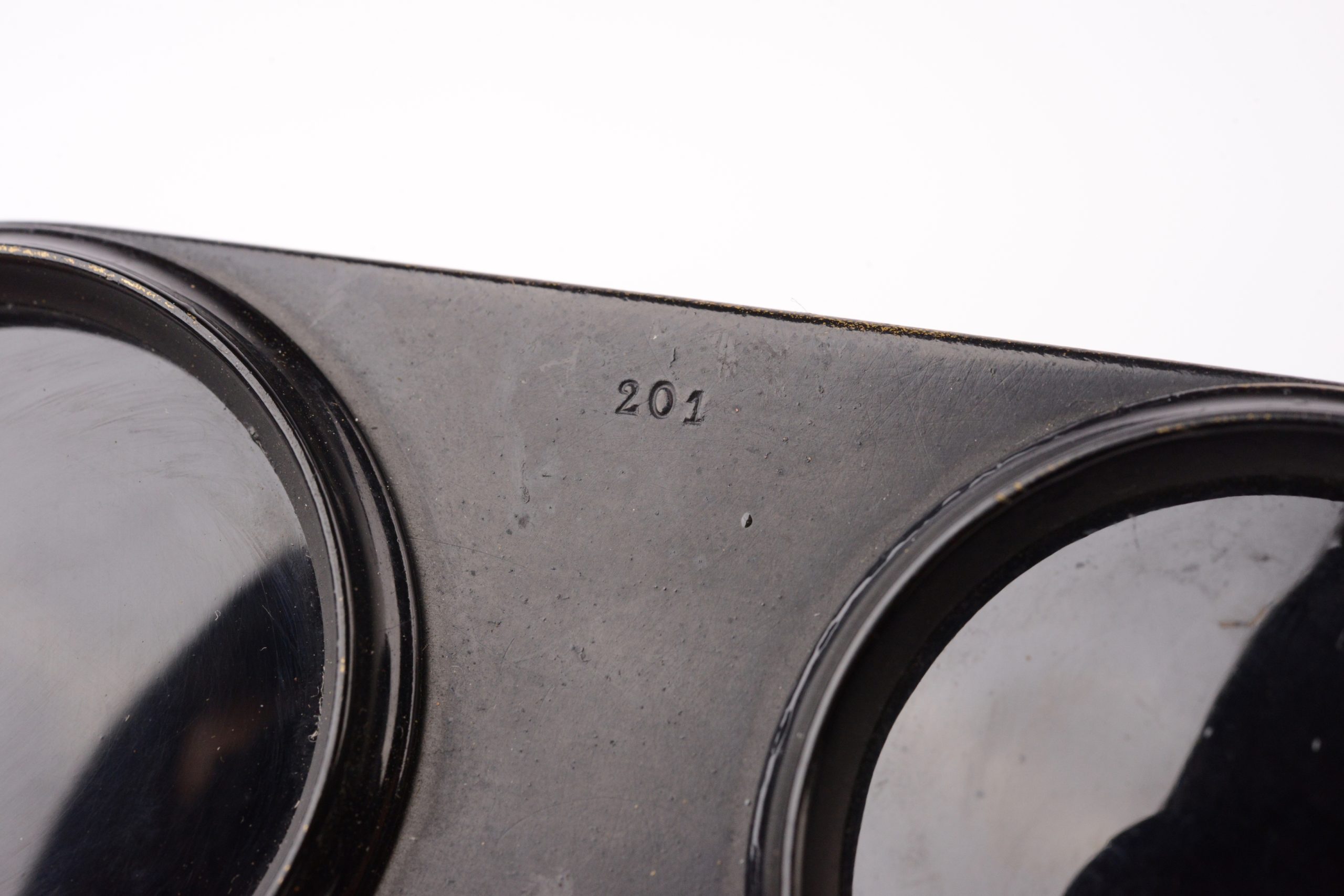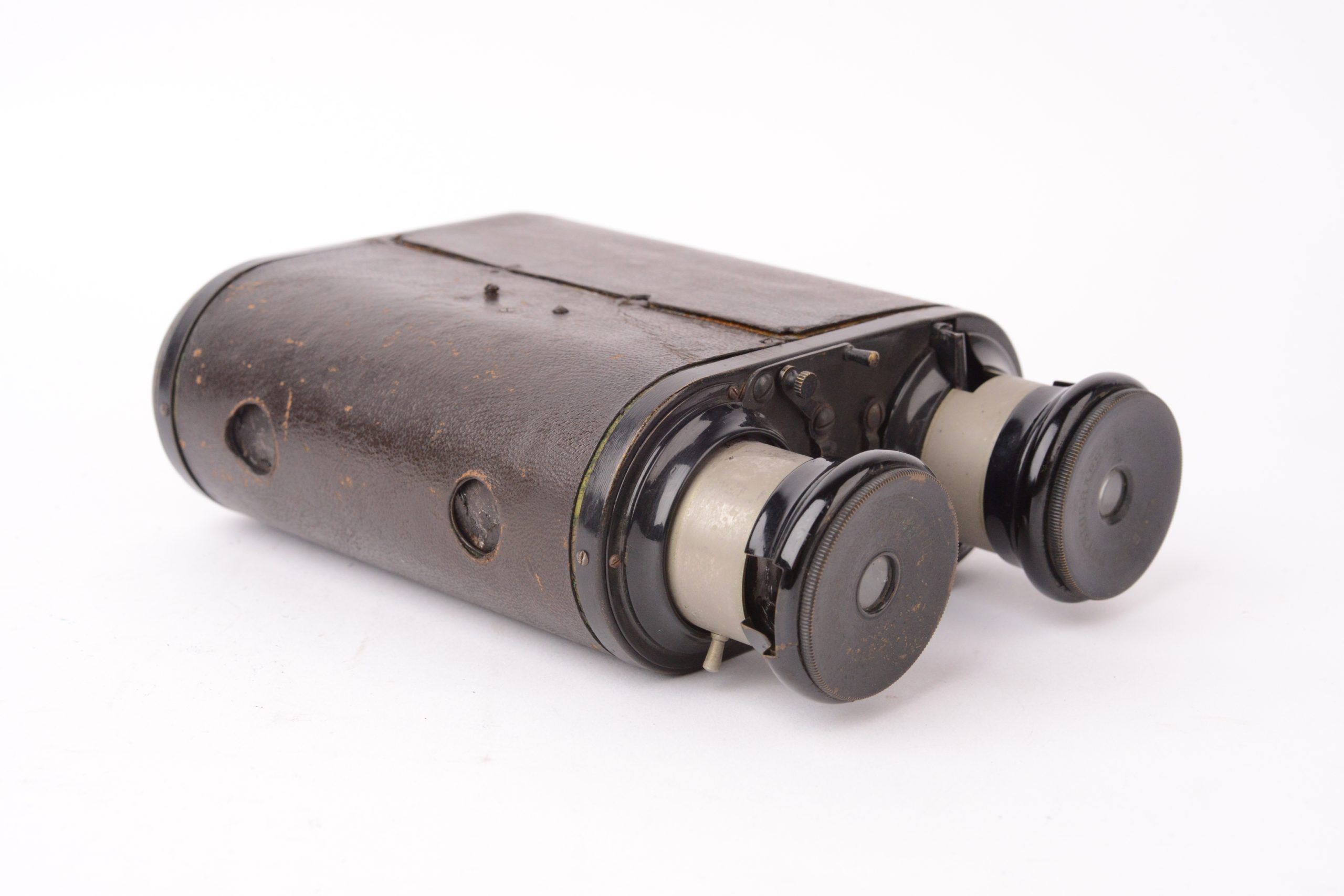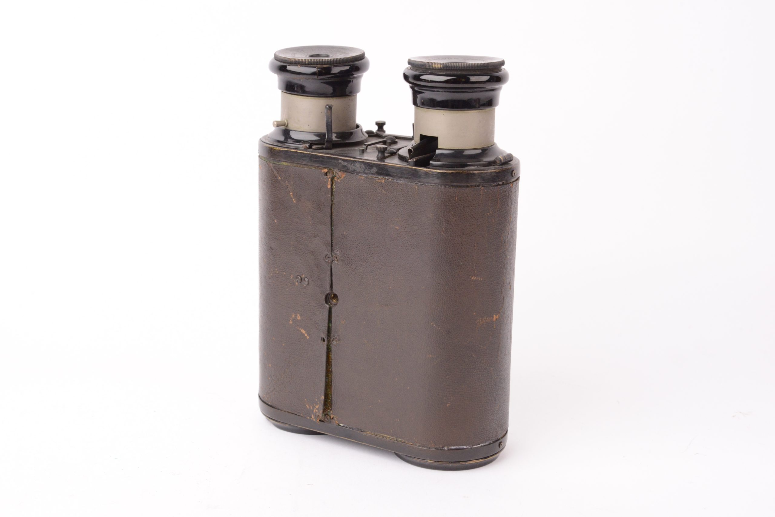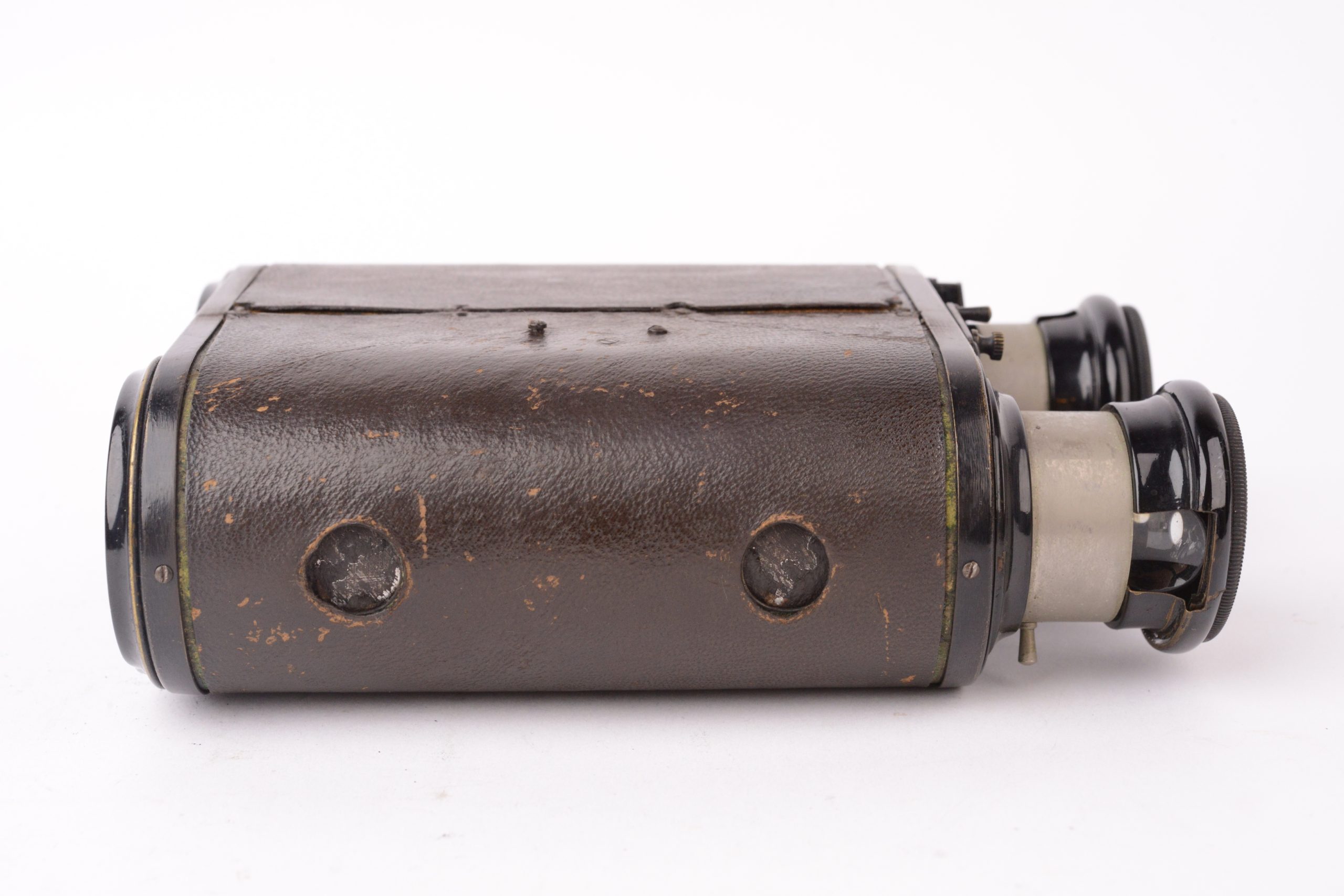 Le Physiographe stéréoscopique 45x107 est conçu et construit par l’ingénieur Léon Bloch. Vers 1900. Il s’agit d’un appareil de type « espion » affectant l’apparence d’une jumelle ; il opère sur le côté sans éveiller l’attention. L’appareil est de construction entièrement métallique, recouvert de maroquin. Il possède un viseur à renvoi d’angle permettant d’opérer en toute discrétion. Le modèle présenté utilise des châssis simples recevant des plaques 45x107. Numéro de série 201. Les objectifs sont des achromatiques en verre d’Iéna. Appareil espion original.