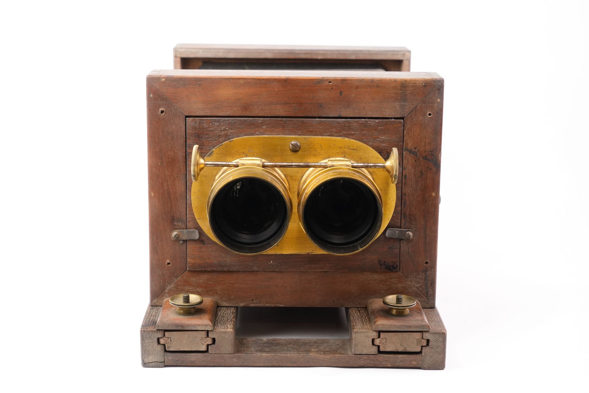 <p data-start="179" data-end="561">Superbe chambre stéréoscopique primitive à soufflet d’époque collodion, signée Lerebours & Secretan, l’un des plus prestigieux ateliers d’optique français du XIXᵉ siècle. Réalisée vers 1855, elle est équipée de deux objectifs en laiton, utilisant une molette à pignons commune pour la mise au point. Le dépoli comme les châssis sont au format 8,5 x 17 cm.</p>