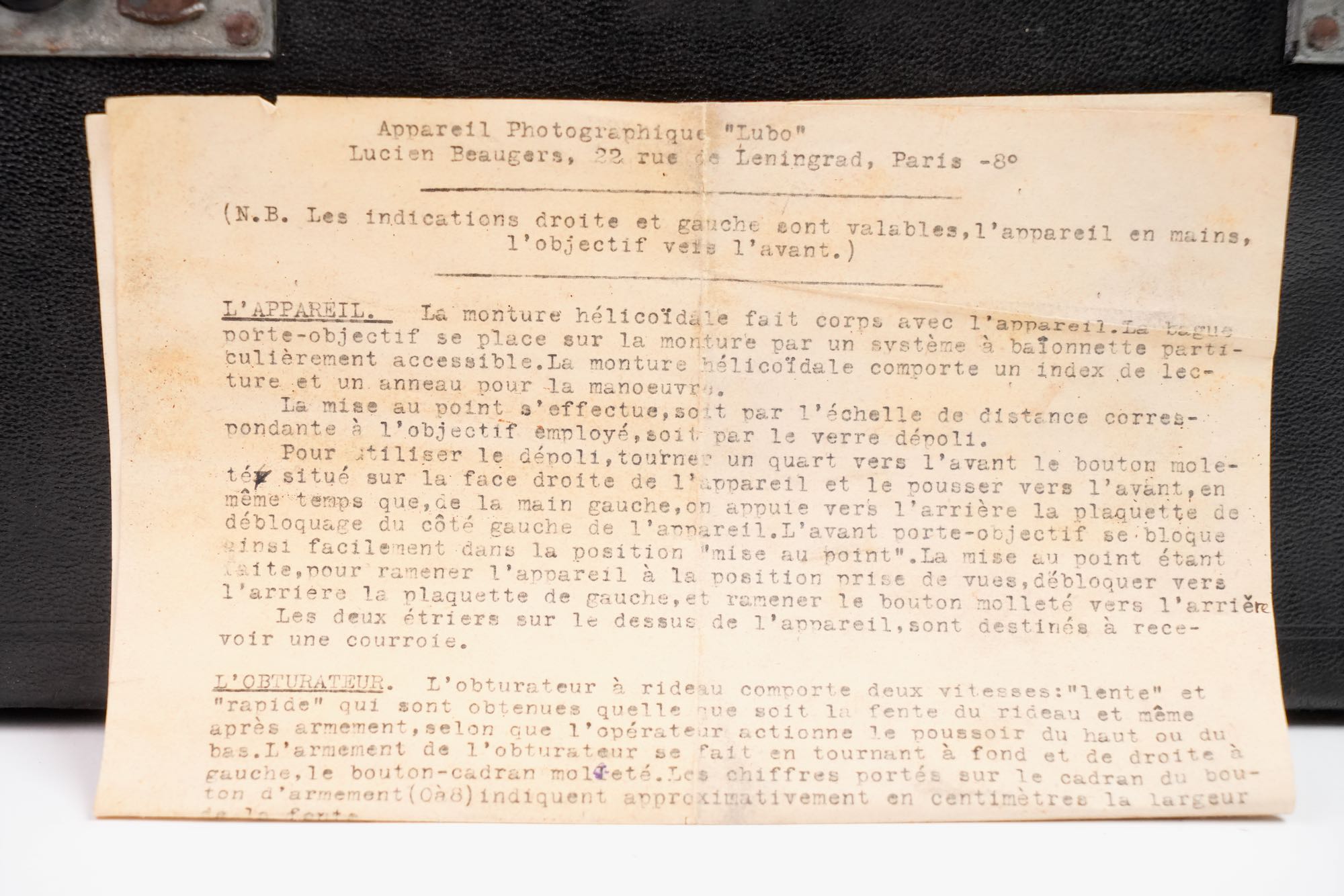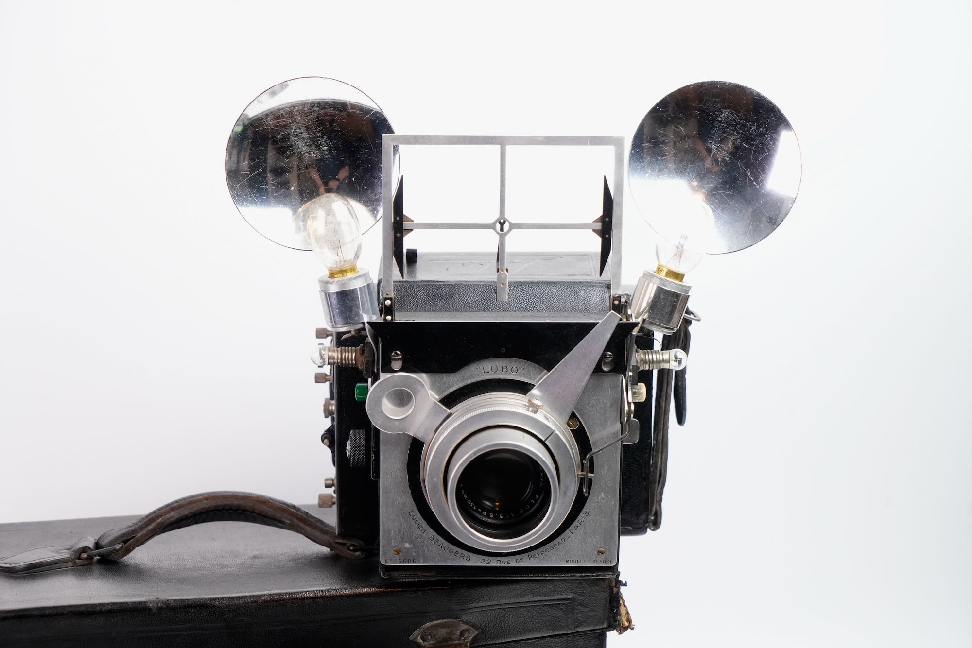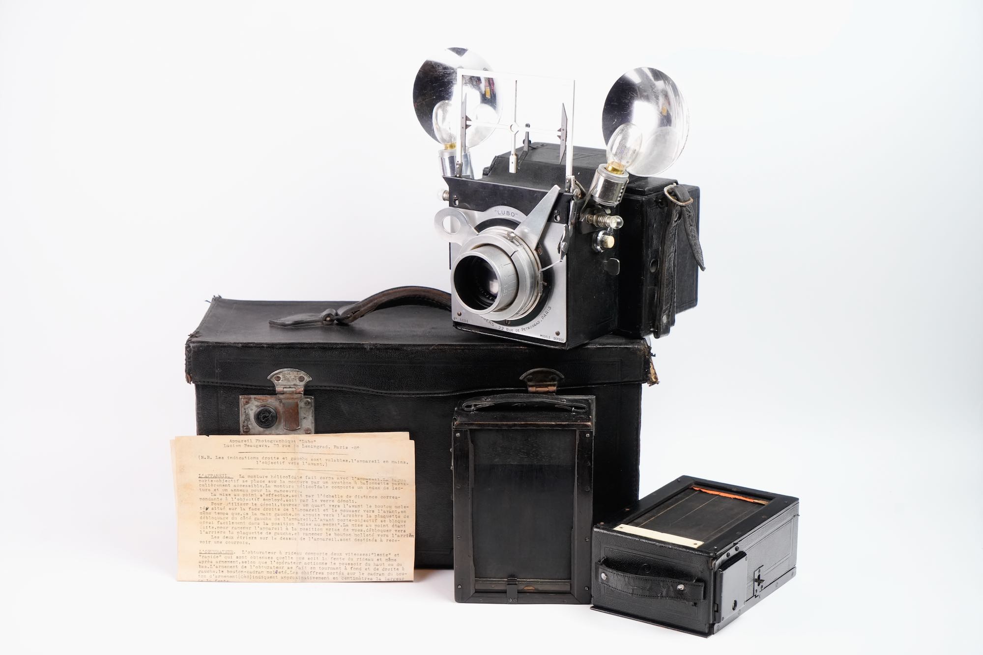 Appareil photographique « Lubo », conçu et commercialisé par Lucien Beaugers, première adresse : 22 rue de Léningrad (anciennement rue de Petrograd), Paris, vers la fin des années 1920 – début des années 1930. Cet appareil de conception moderne pour son époque se distingue par une construction métallique gainée, robuste et fonctionnelle, pensée pour un usage professionnel ou amateur averti. Le Lubo est équipé d’un obturateur à rideau (plan focal) intégré au boîtier, offrant deux régimes de vitesse, lent et rapide, réglables par commande latérale graduée, comme décrit dans la notice d’origine conservée avec l’appareil. La mise au point s’effectue par monture hélicoïdale couplée à l’objectif, avec possibilité de contrôle soit par l’échelle de distances, soit par verre dépoli escamotable, accessible via un mécanisme ingénieux décrit dans la documentation. L’appareil est également doté d’un viseur sportif rabattable en façade, complété par un cadre de visée métallique. Un élément particulièrement remarquable est la présence de deux lampes à réflecteurs intégrées, destinées à la photographie au flash magnésique ou à l’éclairage auxiliaire, témoignant de l’orientation résolument moderne et polyvalente du modèle. L’ensemble est accompagné de châssis porte-plaques, d’accessoires et de sa mallette de transport d’origine. Le Lubo illustre parfaitement l’ingéniosité de Lucien Beaugers, fabricant parisien inventif, dont les productions se caractérisent par des solutions mécaniques avancées et une volonté d’adapter la photographie aux exigences de rapidité et de mobilité du XXᵉ siècle naissant.