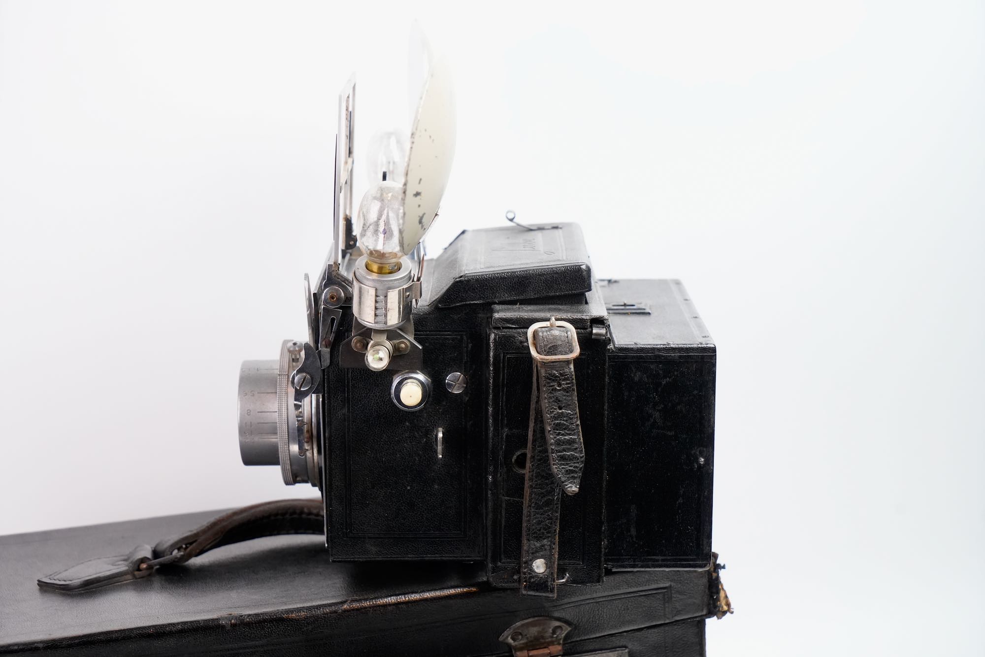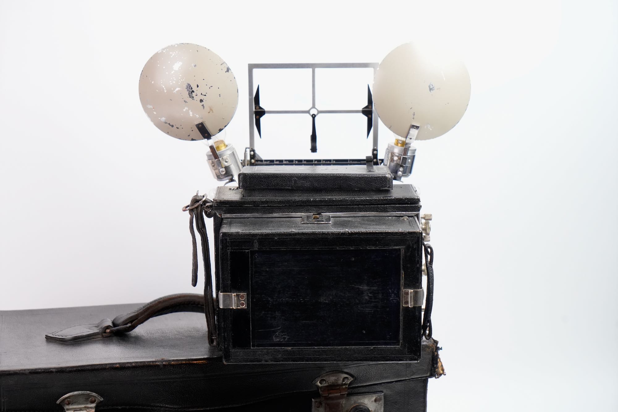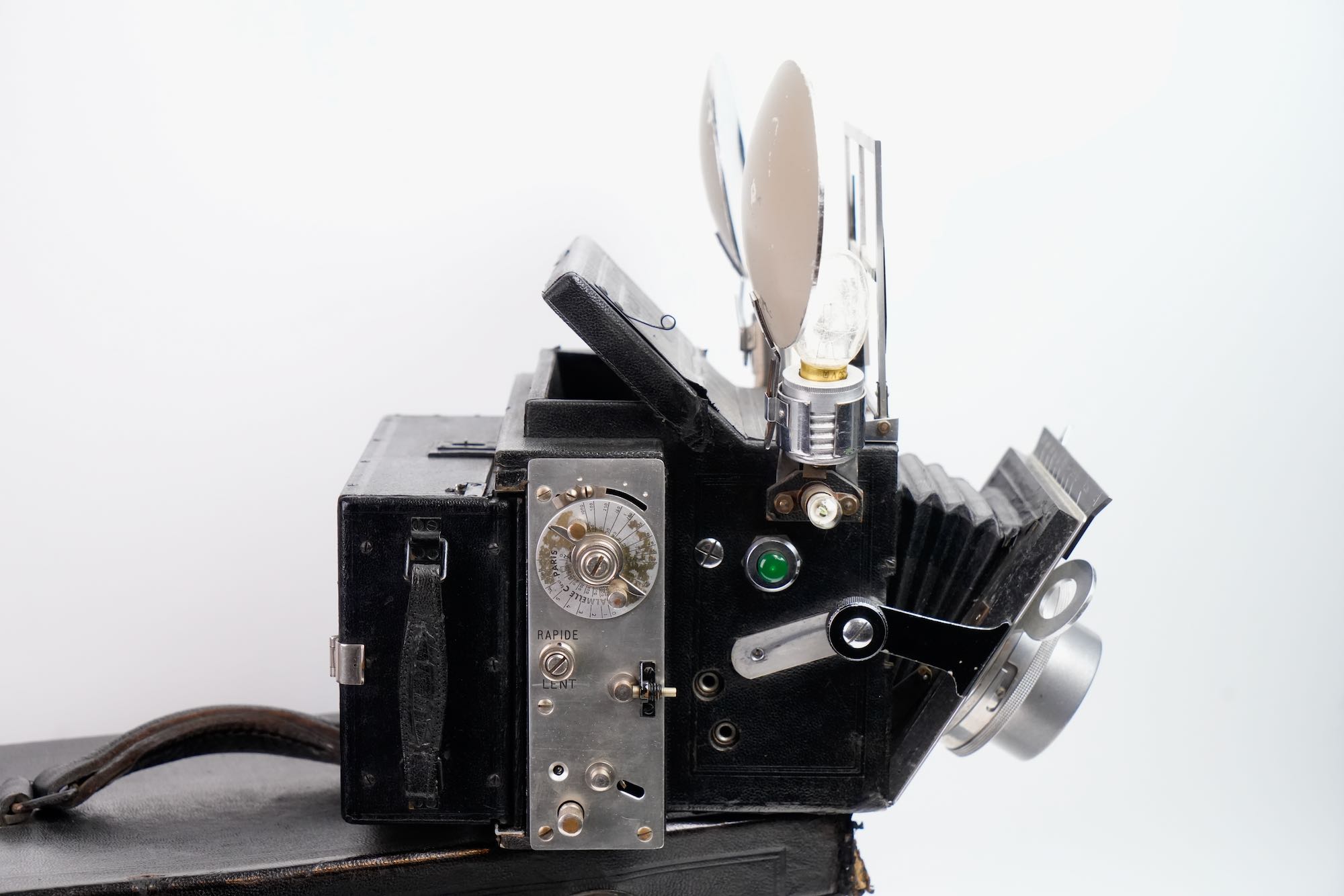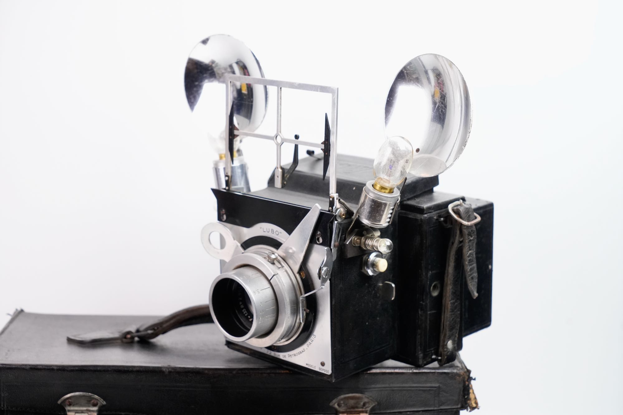 Appareil photographique « Lubo », conçu et commercialisé par Lucien Beaugers, première adresse : 22 rue de Léningrad (anciennement rue de Petrograd), Paris, vers la fin des années 1920 – début des années 1930. Cet appareil de conception moderne pour son époque se distingue par une construction métallique gainée, robuste et fonctionnelle, pensée pour un usage professionnel ou amateur averti. Le Lubo est équipé d’un obturateur à rideau (plan focal) intégré au boîtier, offrant deux régimes de vitesse, lent et rapide, réglables par commande latérale graduée, comme décrit dans la notice d’origine conservée avec l’appareil. La mise au point s’effectue par monture hélicoïdale couplée à l’objectif, avec possibilité de contrôle soit par l’échelle de distances, soit par verre dépoli escamotable, accessible via un mécanisme ingénieux décrit dans la documentation. L’appareil est également doté d’un viseur sportif rabattable en façade, complété par un cadre de visée métallique. Un élément particulièrement remarquable est la présence de deux lampes à réflecteurs intégrées, destinées à la photographie au flash magnésique ou à l’éclairage auxiliaire, témoignant de l’orientation résolument moderne et polyvalente du modèle. L’ensemble est accompagné de châssis porte-plaques, d’accessoires et de sa mallette de transport d’origine. Le Lubo illustre parfaitement l’ingéniosité de Lucien Beaugers, fabricant parisien inventif, dont les productions se caractérisent par des solutions mécaniques avancées et une volonté d’adapter la photographie aux exigences de rapidité et de mobilité du XXᵉ siècle naissant.