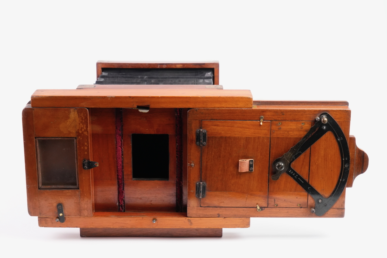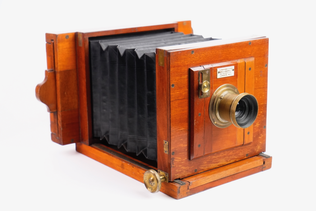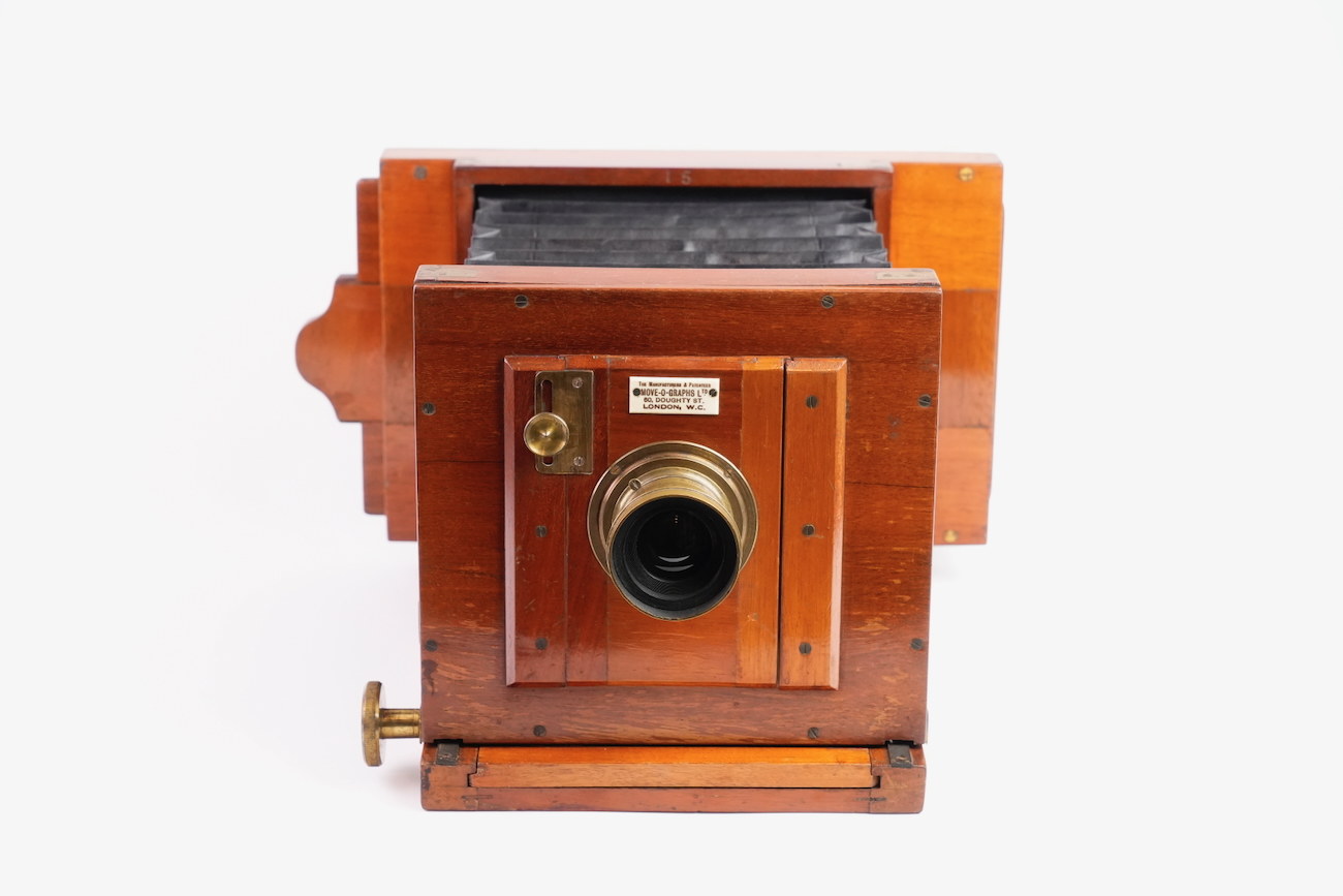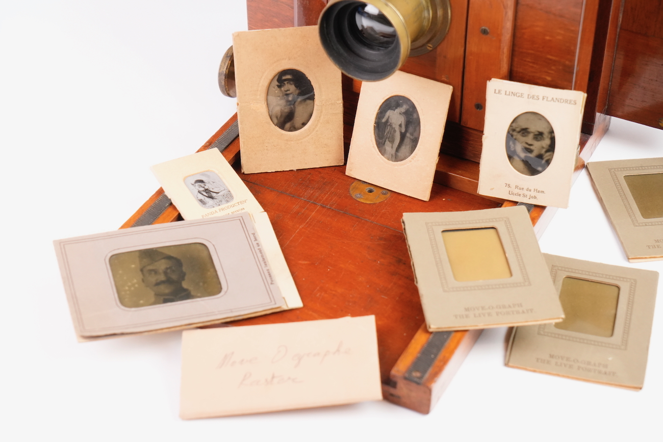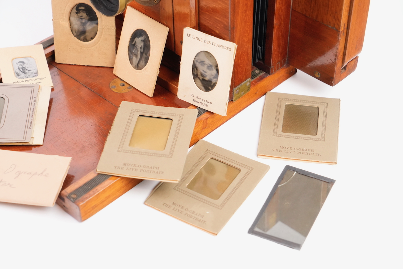 Appareil anglais de la société Move-O-Graph Ltd, établie au 60 Doughty Street, Londres. Cette chambre permet la prise de photographies donnant à voir plusieurs images consécutives, donnant une impression de mouvement lors du visionnage : "the live portrait" précisent les cartons. Les images sont réalisées à l'aide de trames, de sorte que lorsque l'on appuie alternativement sur les emplacements indiqués au dos du carton de montage, différentes expressions apparaissent, donnant un effet d'animation. La chambre jouit d'une construction en acajou et d'une finition soignée. Un dos coulissant permet la réalisation de trois clichés à la suite. Le soufflet en cuir est en bel état. L'objectif est un Dallmeyer stigmatic N°4 (série II).