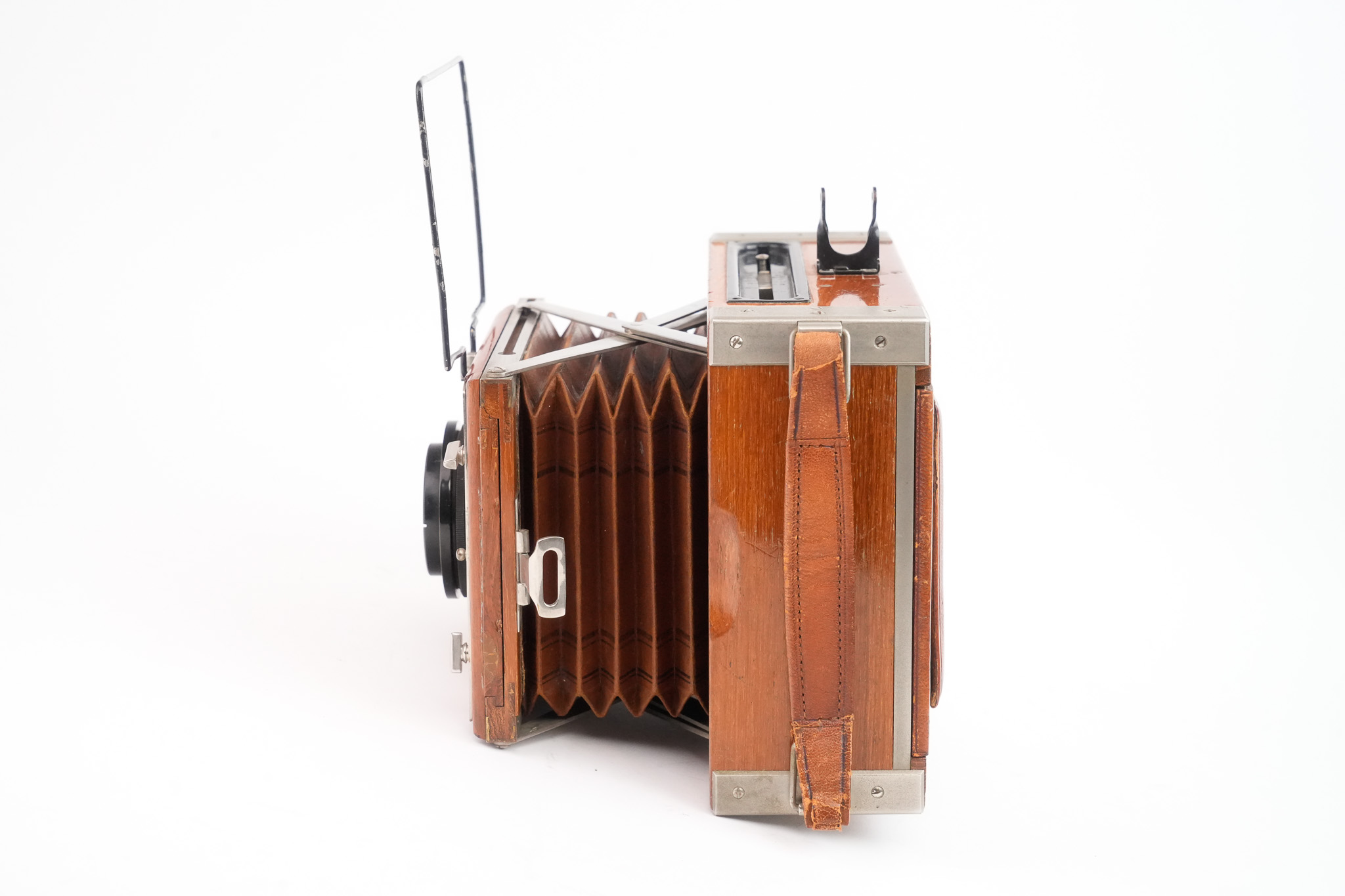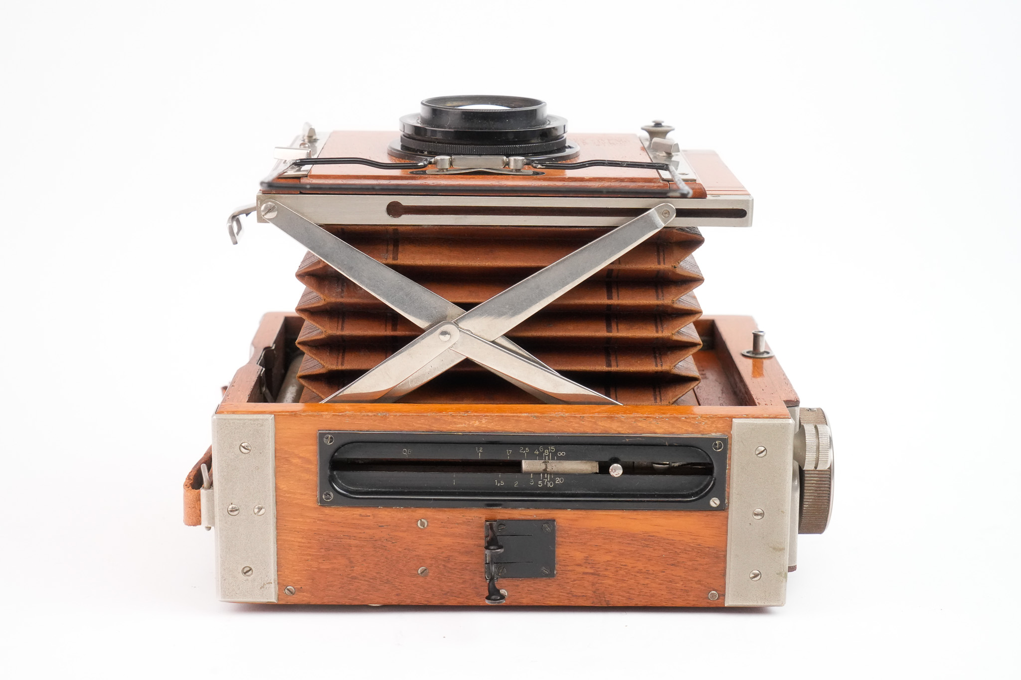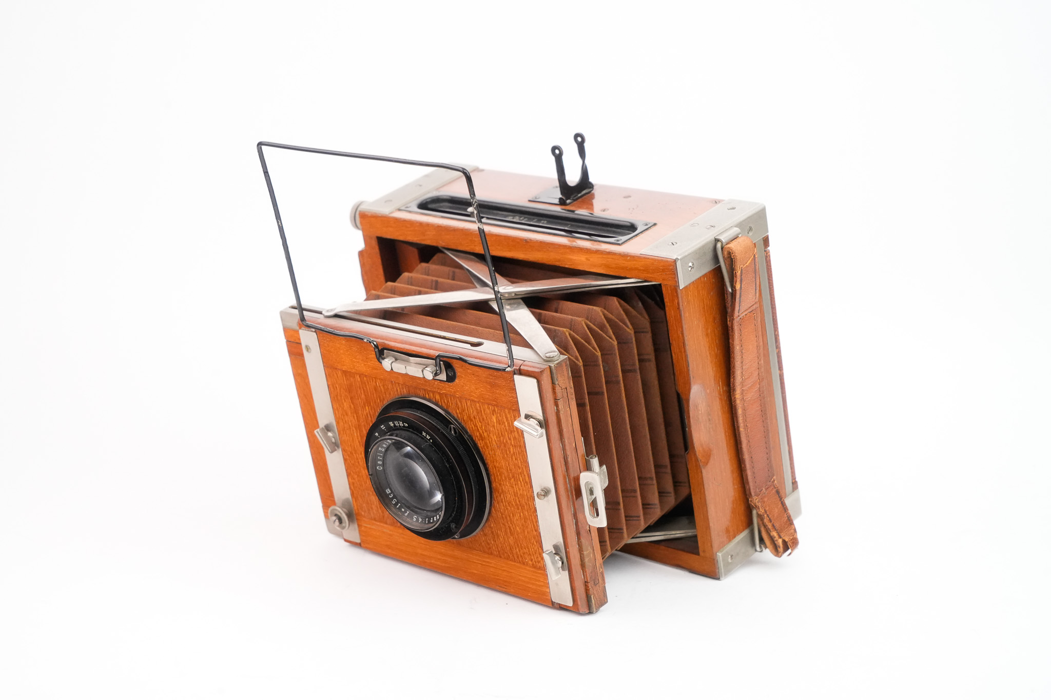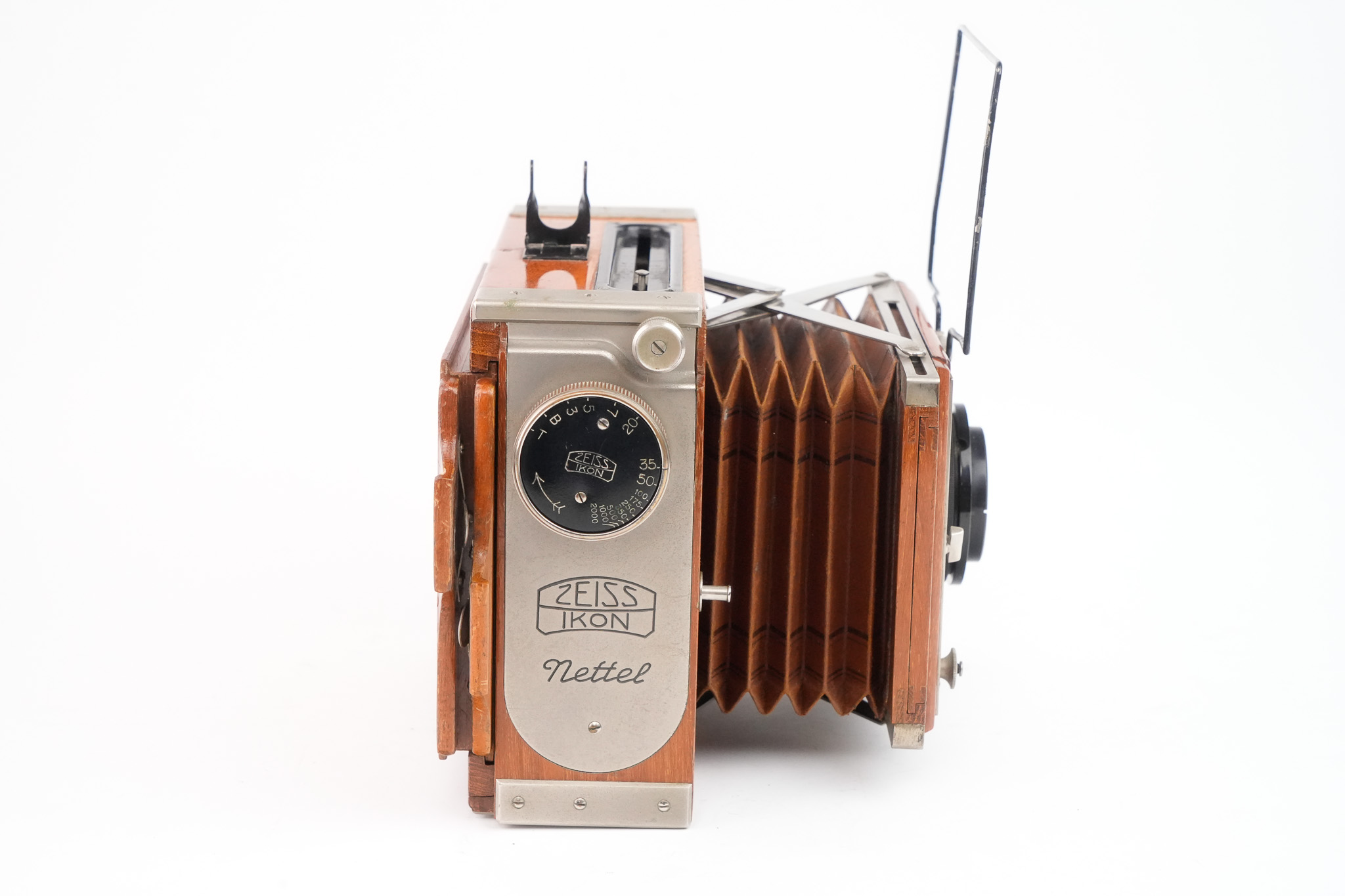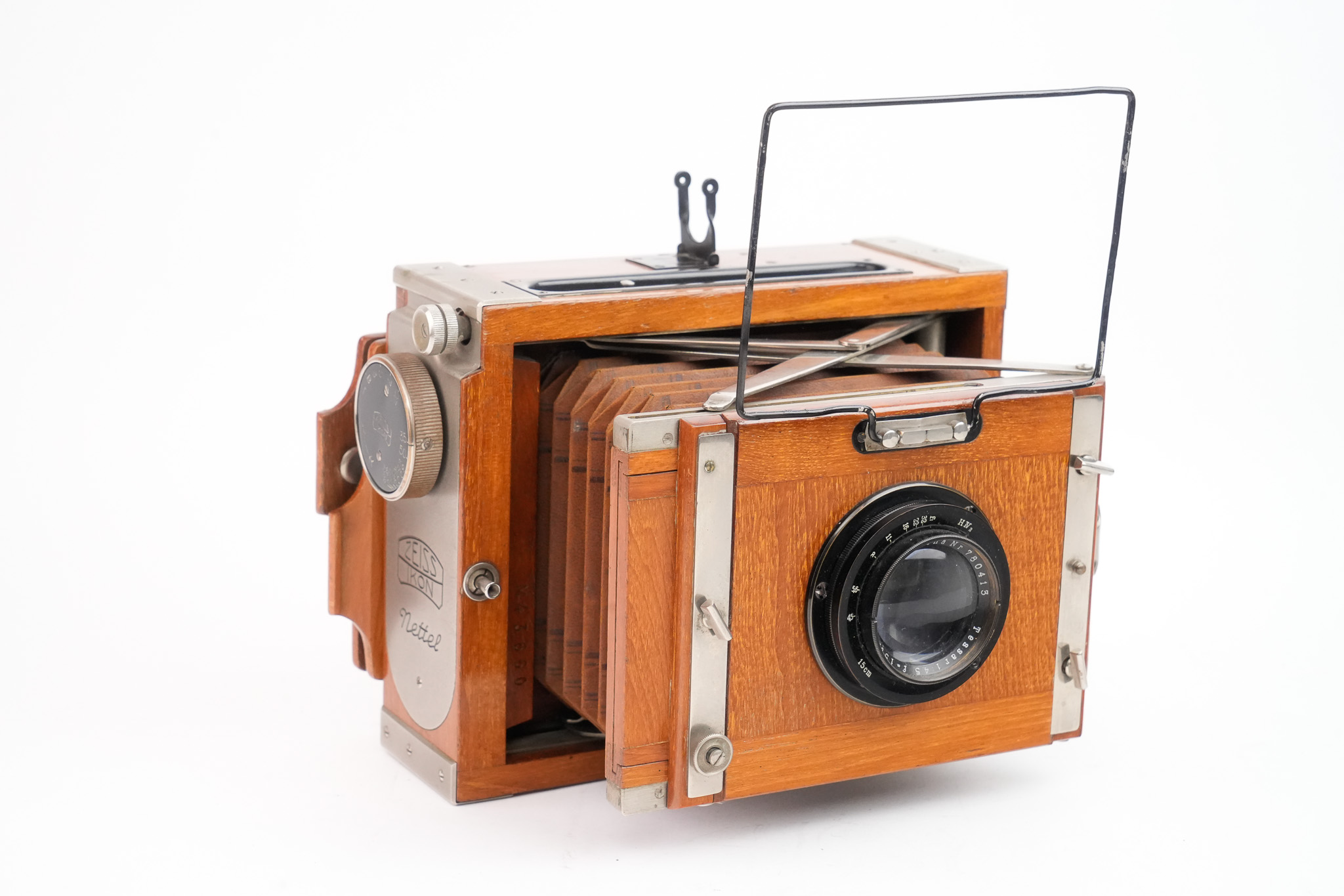 Appareil photographique Nettel Deckrullo tropical 9x12 cm. Appareil de reportage à ciseaux utilisant des châssis à plaques au format 9x12 cm. Version tropicale en bois de teck verni, renforcé par ferrures nickelées. Obturateur focal à rideau (1/3 – 1/2000 T, B). Objectif Carl Zeiss Jéna f/4.5 - 150mm. Mise au point par déplacement du corps avant par vis sans fin agissant sur les ciseaux. Viseur sportif à cadre et mire. Dépoli avec capuchon en cuir havane. Proposé ici avec un chassis porte plaque. Assez bel état général avec présence de quelques traces d'usure. Le soufflet présente de petits trous et il est légèrement décollé de la planchette avant. Le rideau d'obturation est très fatigué et ne fonctionne pas correctement. La bague de diaphragme et la molette de mise au point fonctionnent correctement. Les lentilles de l'objectif sont sans rayure, sans décollement, sans brume, sans champignon.