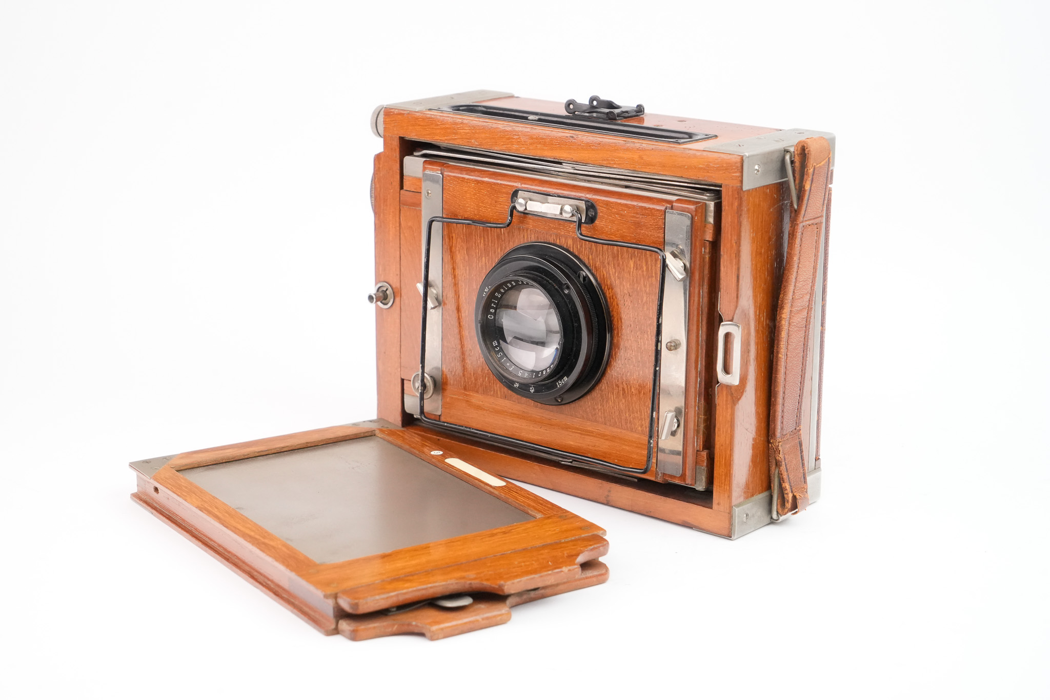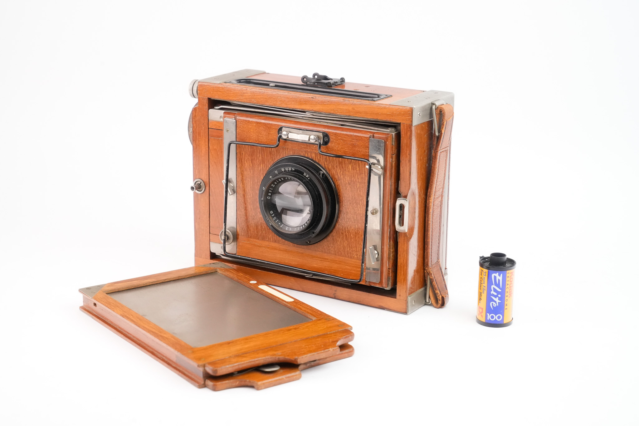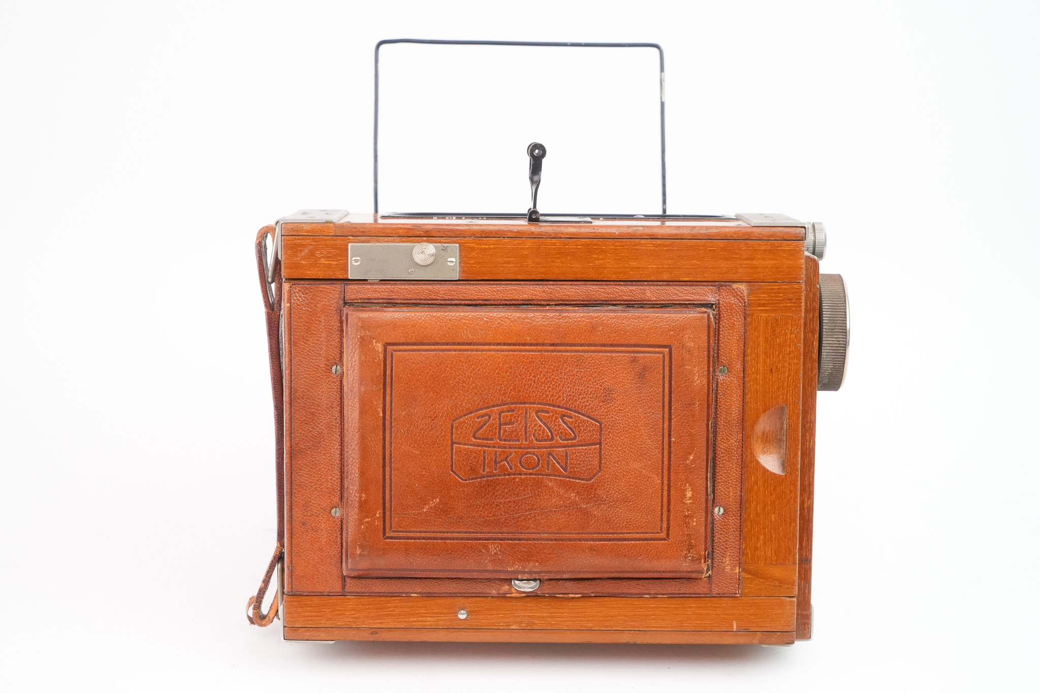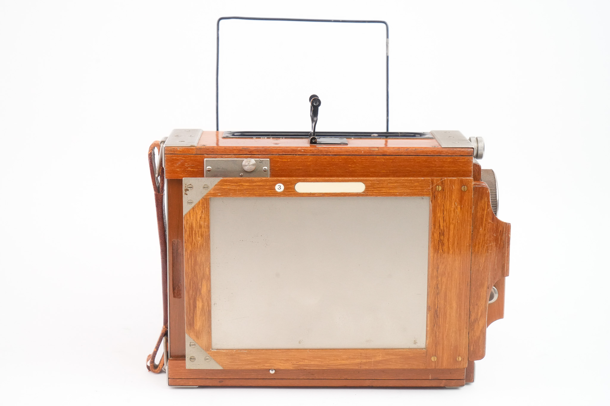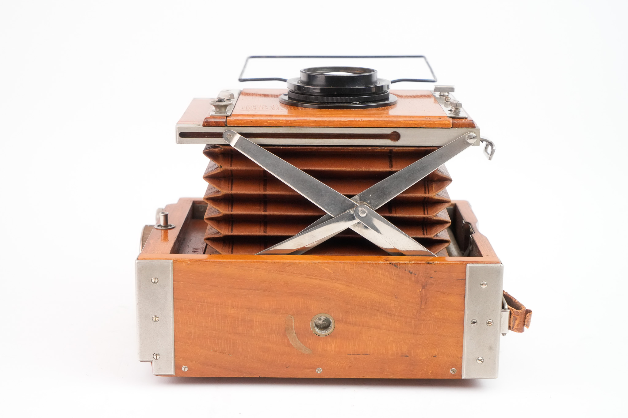 Appareil photographique Nettel Deckrullo tropical 9x12 cm. Appareil de reportage à ciseaux utilisant des châssis à plaques au format 9x12 cm. Version tropicale en bois de teck verni, renforcé par ferrures nickelées. Obturateur focal à rideau (1/3 – 1/2000 T, B). Objectif Carl Zeiss Jéna f/4.5 - 150mm. Mise au point par déplacement du corps avant par vis sans fin agissant sur les ciseaux. Viseur sportif à cadre et mire. Dépoli avec capuchon en cuir havane. Proposé ici avec un chassis porte plaque. Assez bel état général avec présence de quelques traces d'usure. Le soufflet présente de petits trous et il est légèrement décollé de la planchette avant. Le rideau d'obturation est très fatigué et ne fonctionne pas correctement. La bague de diaphragme et la molette de mise au point fonctionnent correctement. Les lentilles de l'objectif sont sans rayure, sans décollement, sans brume, sans champignon.