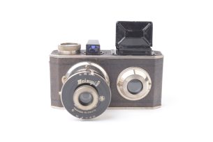 Surprenant appareil photographique bi-objectif horizontal pour film spécial (vues au format 3x4 cm) auto-révélateur. Viseur (...)Ce produit m'intéresse -