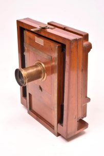 Chambre photographique Dallmeyer en acajou. Format 9x12 cm. Soufflet en cuir bordeaux. Pièces de renforcement (...)Ce produit m'intéresse -