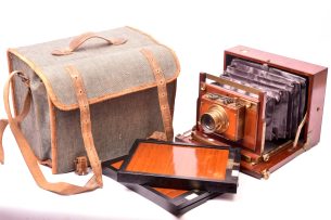 Chambre photographique de voyage en acajou. Format 13x18 cm. Soufflet en cuir rouge pyramidal à (...)Ce produit m'intéresse -