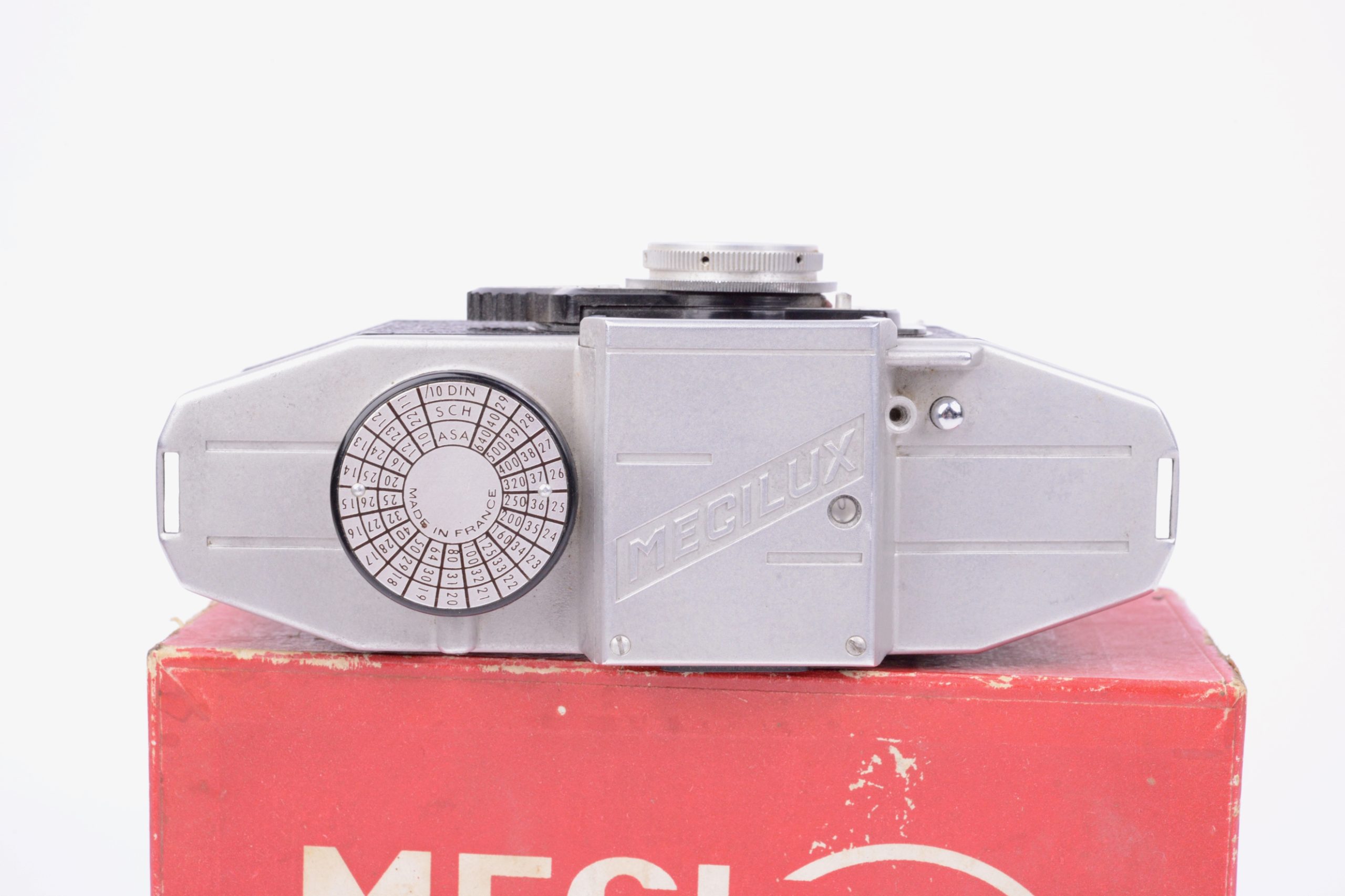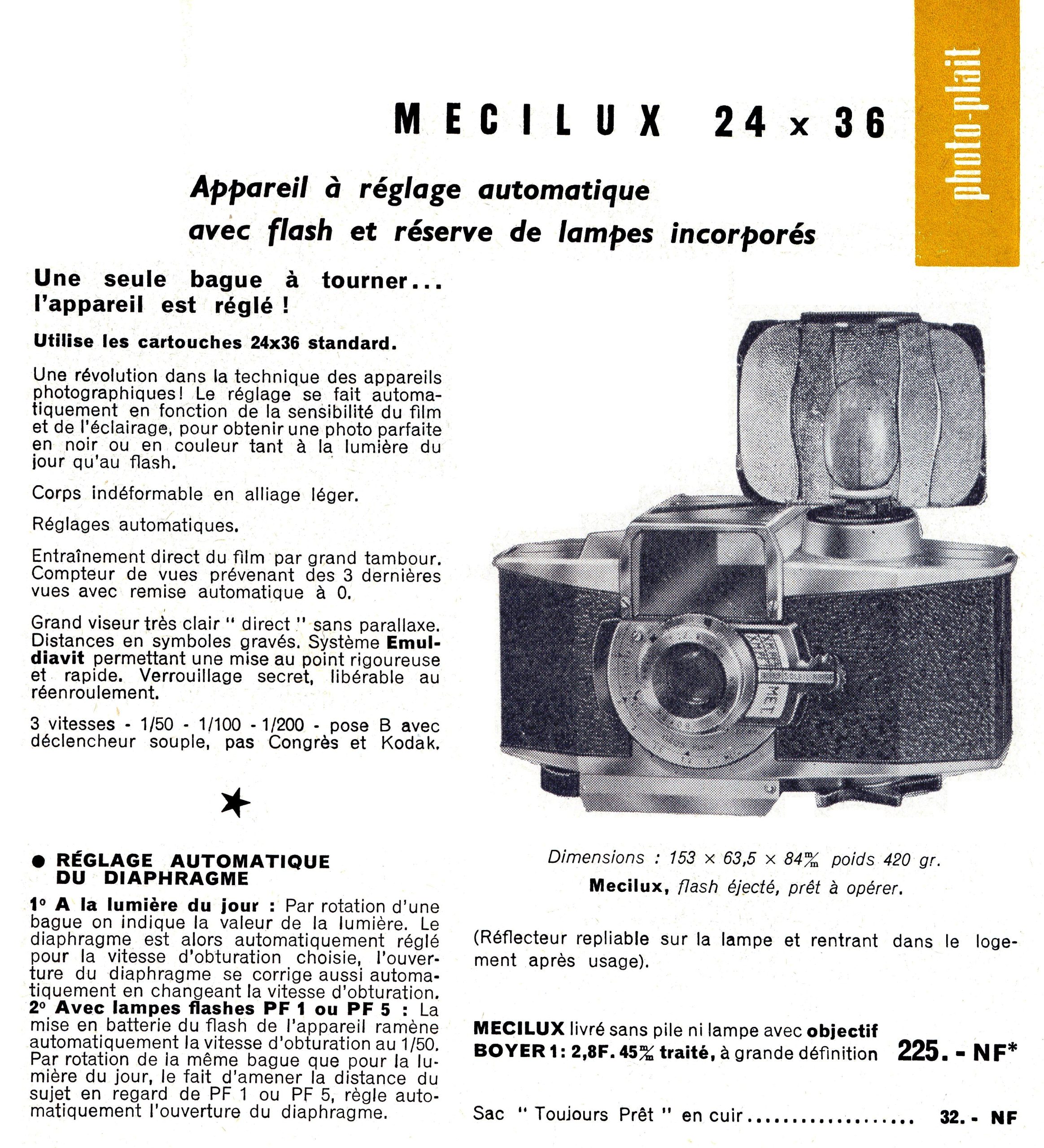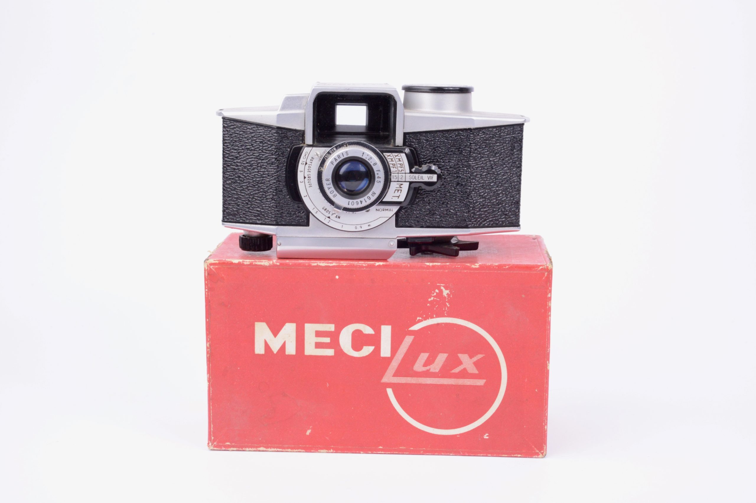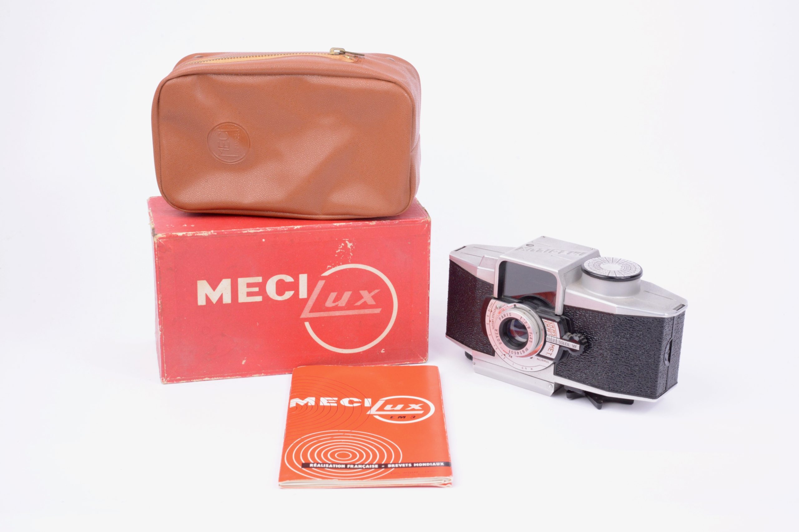 Paul Lachaize Le Mécilux 24x36 dès 1955. Appareil au « look » particulier, il est destiné à une clientèle débutante en photographie. Ainsi, la simplification des manipulations est mise en avant avec, par exemple, le système d’exposition appelé « Émuldiavit » où il suffit d’afficher le temps, vitesse et diaphragme se trouvant alors automatiquement couplés pour une bonne exposition. L’objectif est un Boyer – Paris 1 : 2,8 / 45 mm. L’appareil vient avec sa notice d’emploi, sa sacoche en simili brun, le tout renfermé dans sa boite de conditionnement en carton. Rare ensemble dans cette condition.