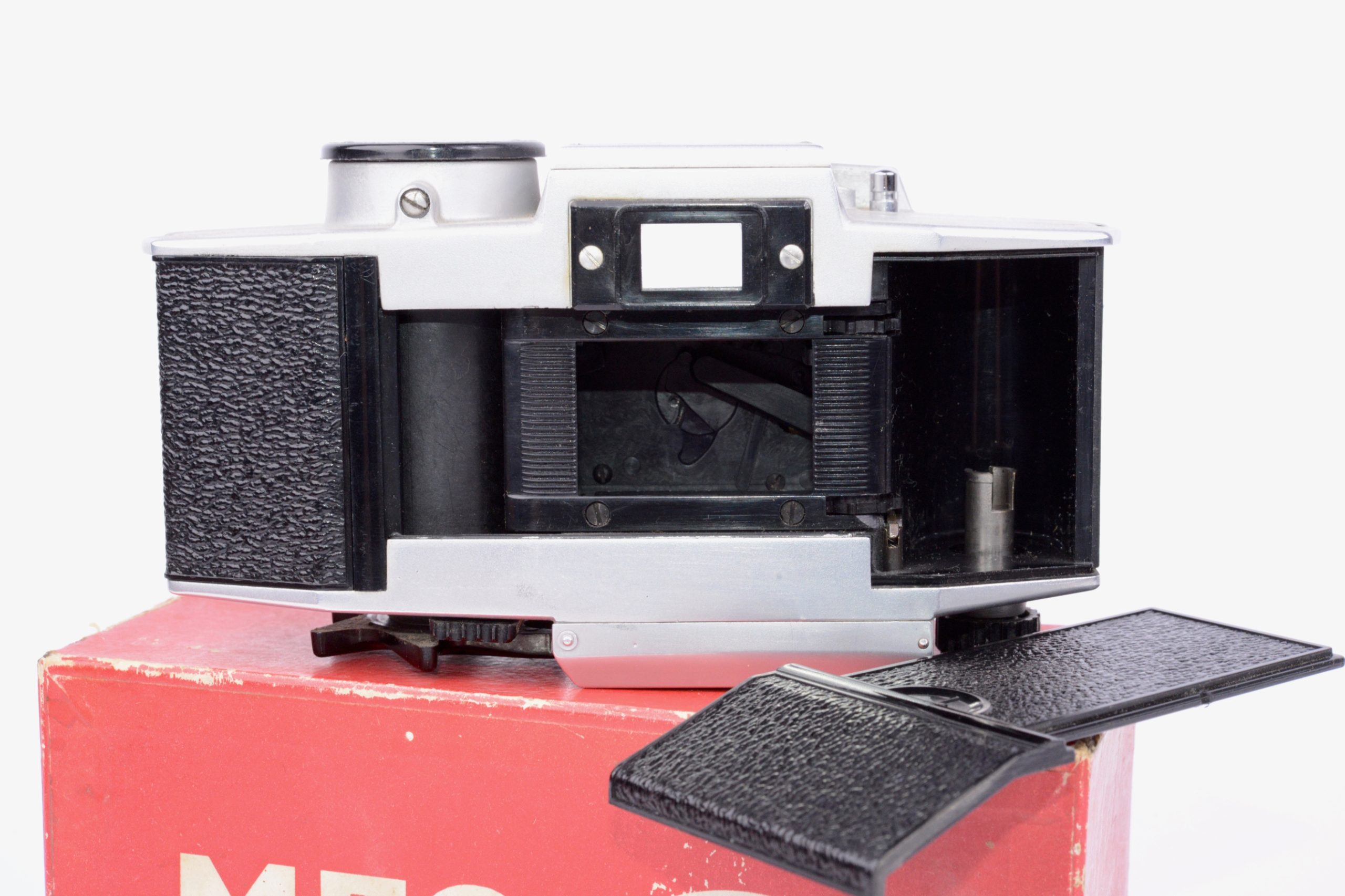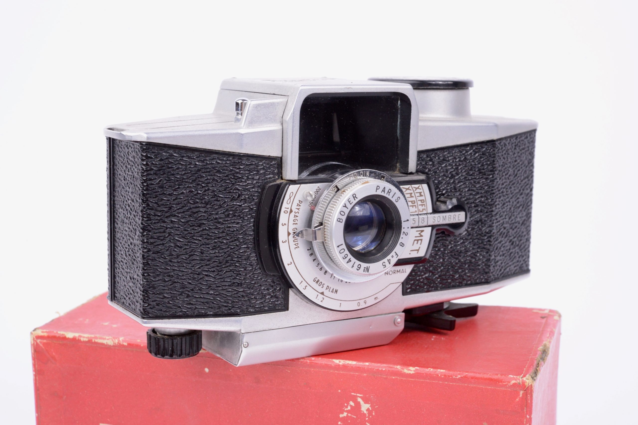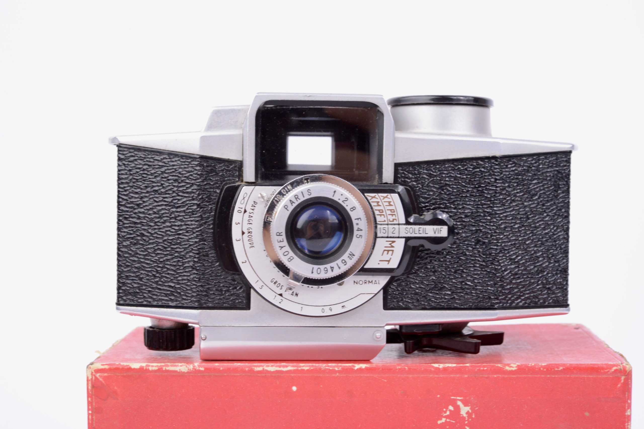 Paul Lachaize Le Mécilux 24x36 dès 1955. Appareil au « look » particulier, il est destiné à une clientèle débutante en photographie. Ainsi, la simplification des manipulations est mise en avant avec, par exemple, le système d’exposition appelé « Émuldiavit » où il suffit d’afficher le temps, vitesse et diaphragme se trouvant alors automatiquement couplés pour une bonne exposition. L’objectif est un Boyer – Paris 1 : 2,8 / 45 mm. L’appareil vient avec sa notice d’emploi, sa sacoche en simili brun, le tout renfermé dans sa boite de conditionnement en carton. Rare ensemble dans cette condition.