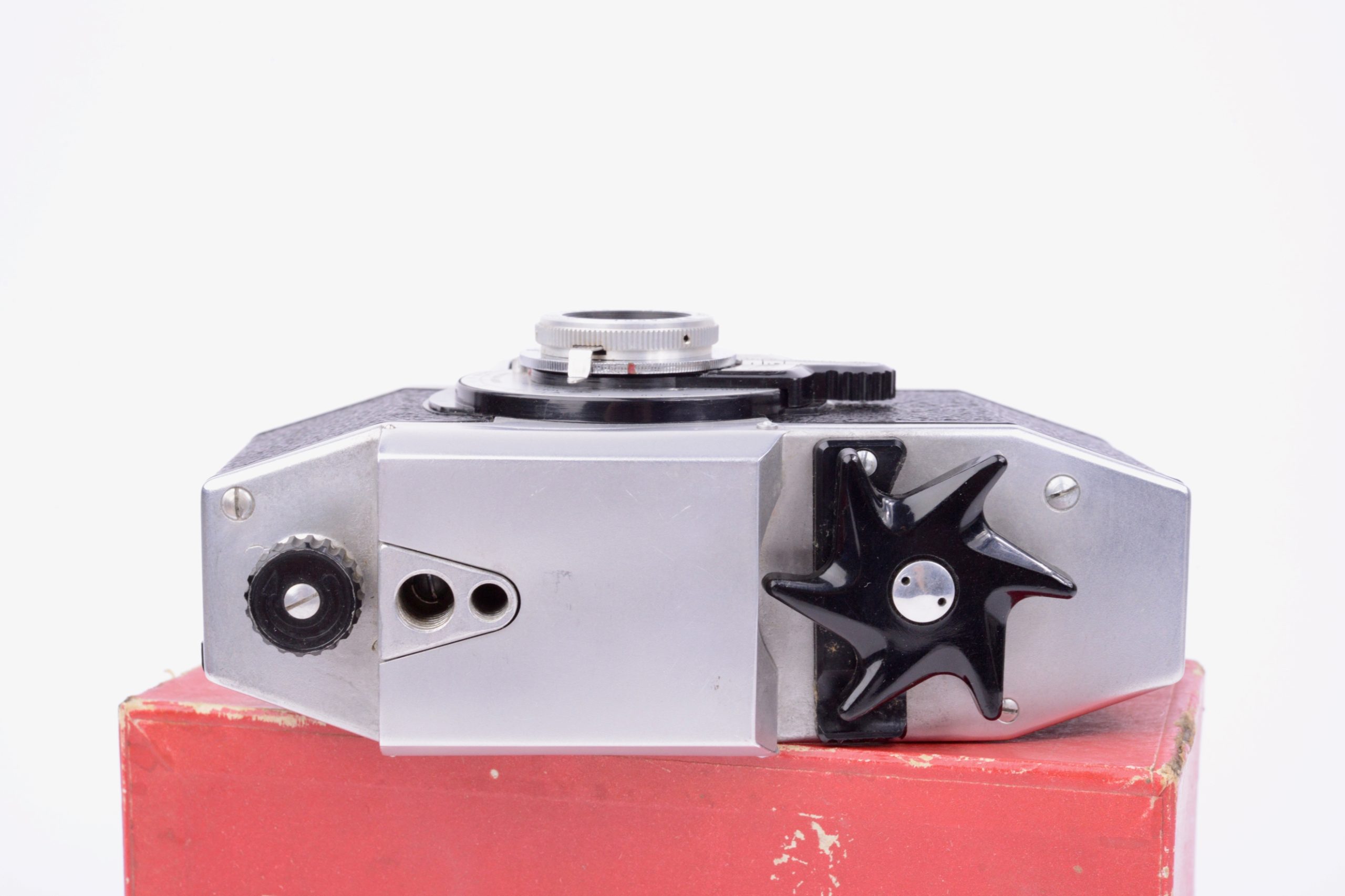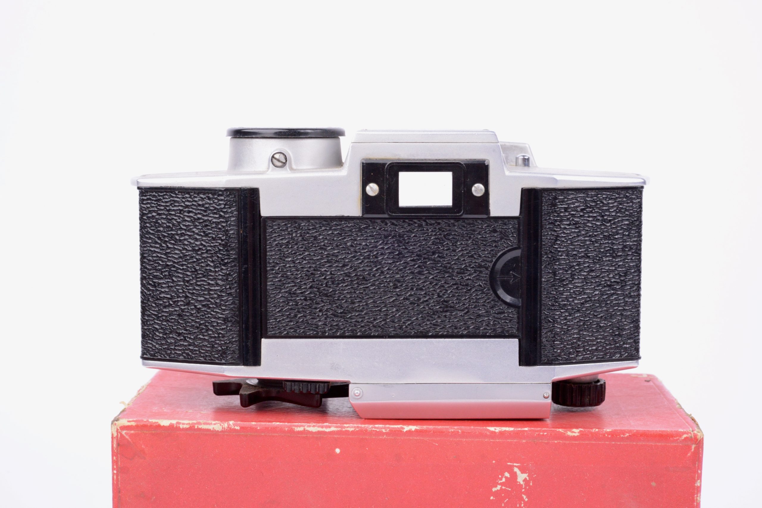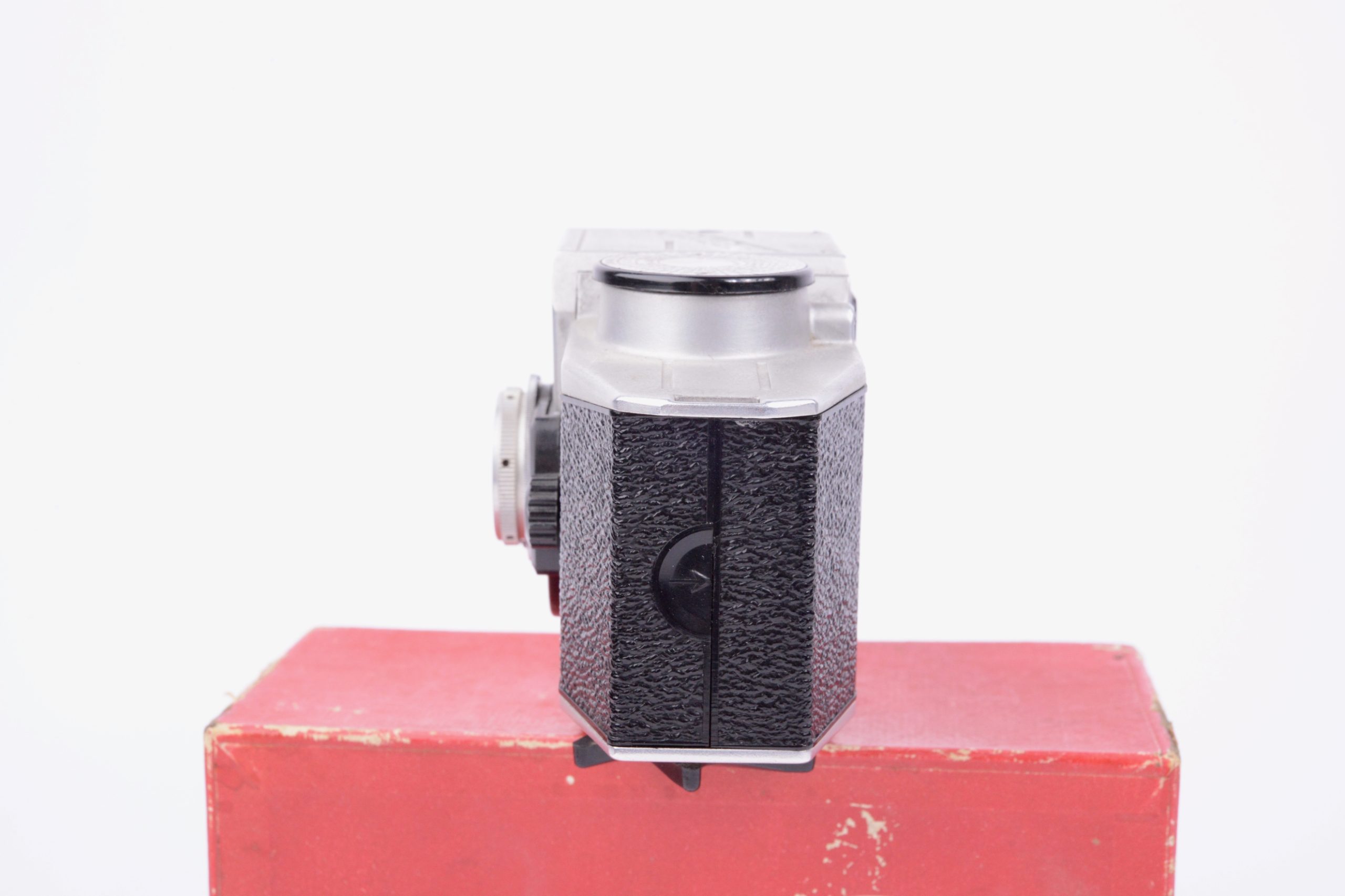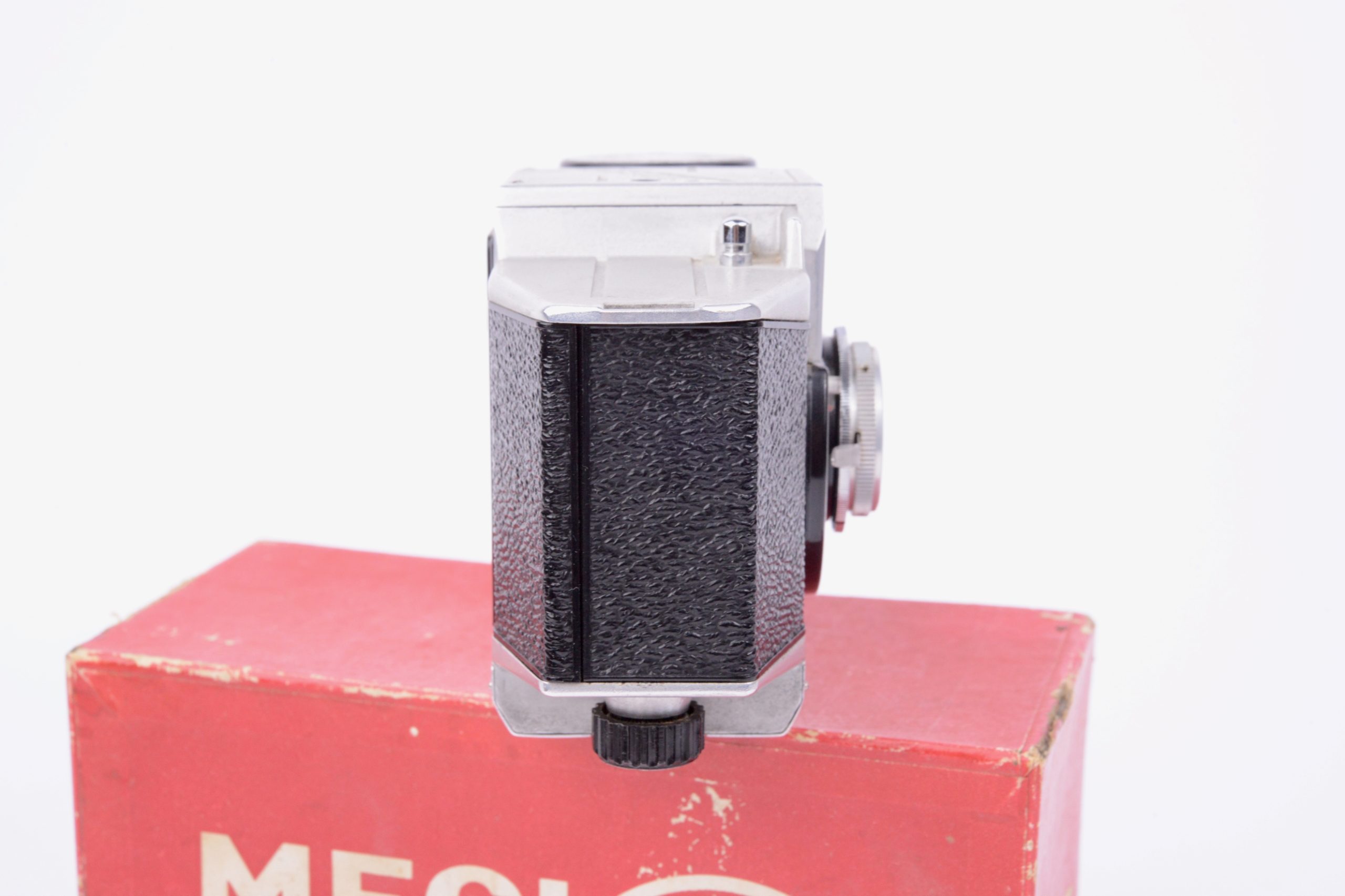 Paul Lachaize Le Mécilux 24x36 dès 1955. Appareil au « look » particulier, il est destiné à une clientèle débutante en photographie. Ainsi, la simplification des manipulations est mise en avant avec, par exemple, le système d’exposition appelé « Émuldiavit » où il suffit d’afficher le temps, vitesse et diaphragme se trouvant alors automatiquement couplés pour une bonne exposition. L’objectif est un Boyer – Paris 1 : 2,8 / 45 mm. L’appareil vient avec sa notice d’emploi, sa sacoche en simili brun, le tout renfermé dans sa boite de conditionnement en carton. Rare ensemble dans cette condition.