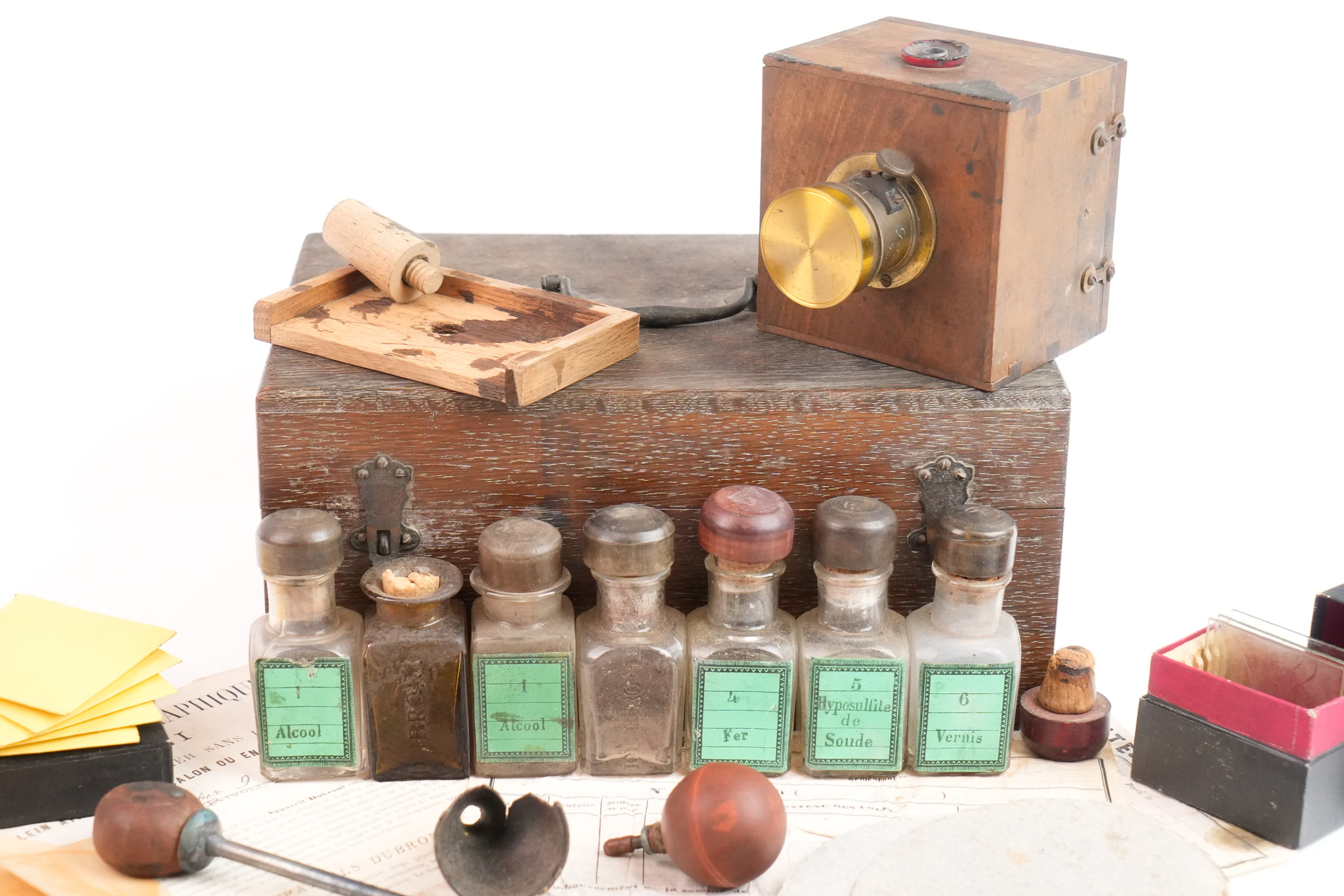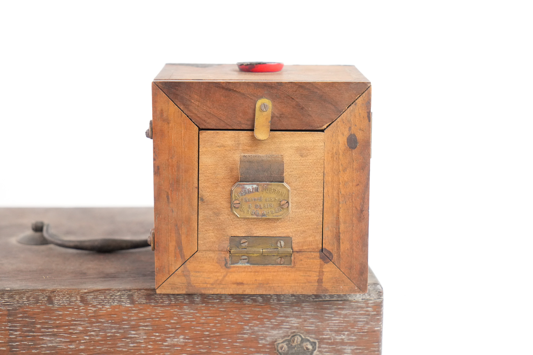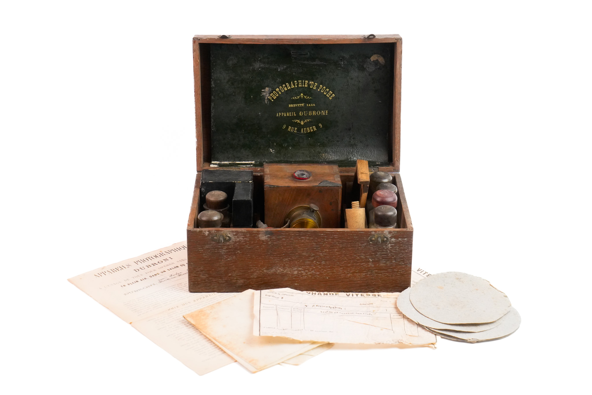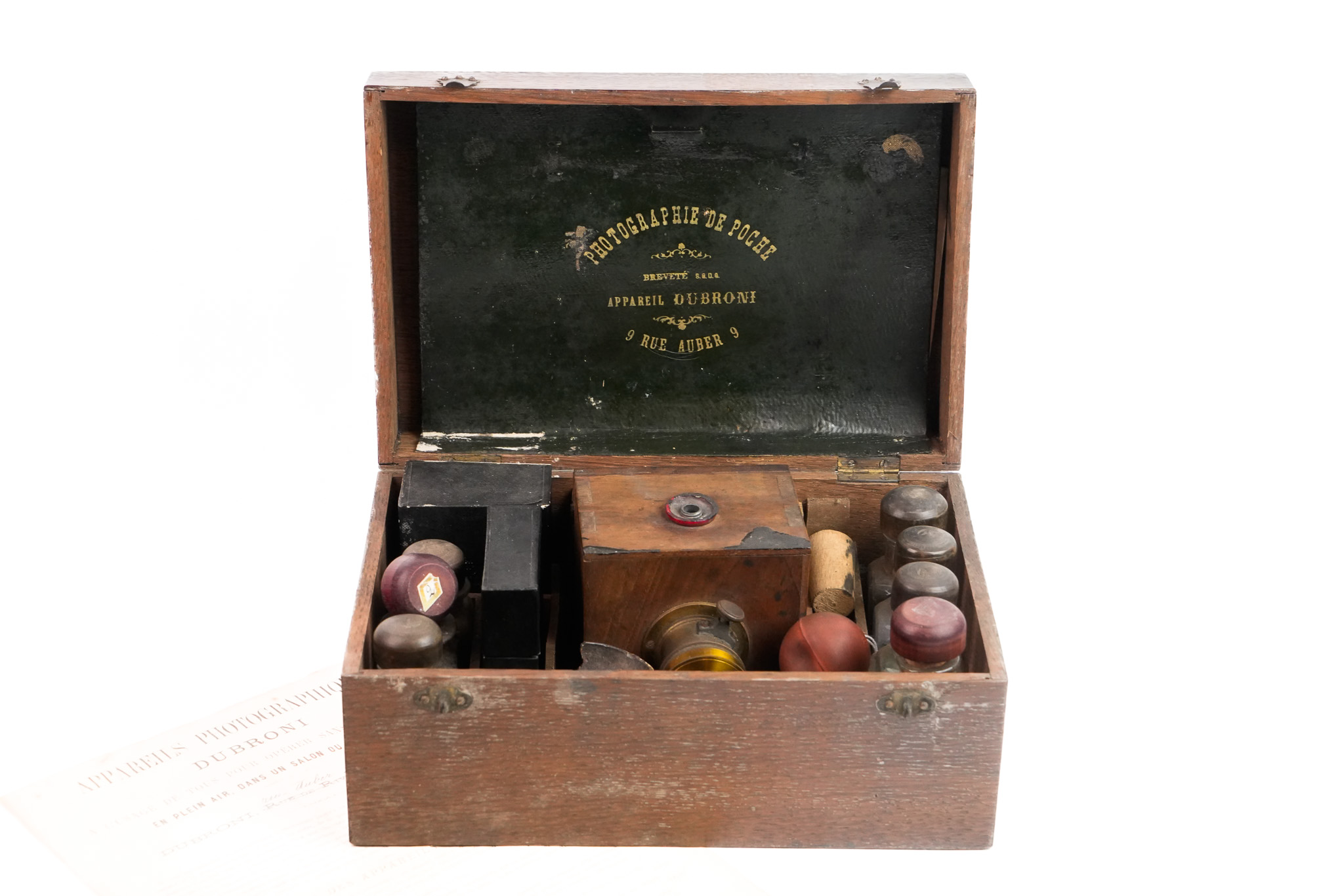 Rare « Photographe de Poche » de Jules Bourdin, appareil DUBRONI Modèle 2a dans son coffret en bois de chêne. Rabat cartonné vert portant les inscriptions. Appareil laboratoire avec bouteille interne en verre jaune orangé. Format circulaire de 4 cm de diamètre. Verre inactinique orangé protégé par volet pivotant portant inscriptions de la raison sociale au 9 rue Aubert à Paris à cette adresse en . (Commercialisation en 1864 à cette adresse). L’appareil est équipé d’un objectif à portrait Darlot. Le coffret renferme sept flacons en verre fermés par bouchon en buis noirci numéroté (numéros de 1 à7). Présence de deux pipettes avec poire caoutchouc, d'un entonnoir (en l’état), d’une boite contenant des glaces, d’une boite à rainures et de la petite tablette an bois recevant l’appareil ; le petit embout conique sert à la fixer sur un bougeoir faisant alors fonction de pied. La notice est également présente. Rare ensemble de collection dans cet état, complet de toutes ses pièces et accessoires.