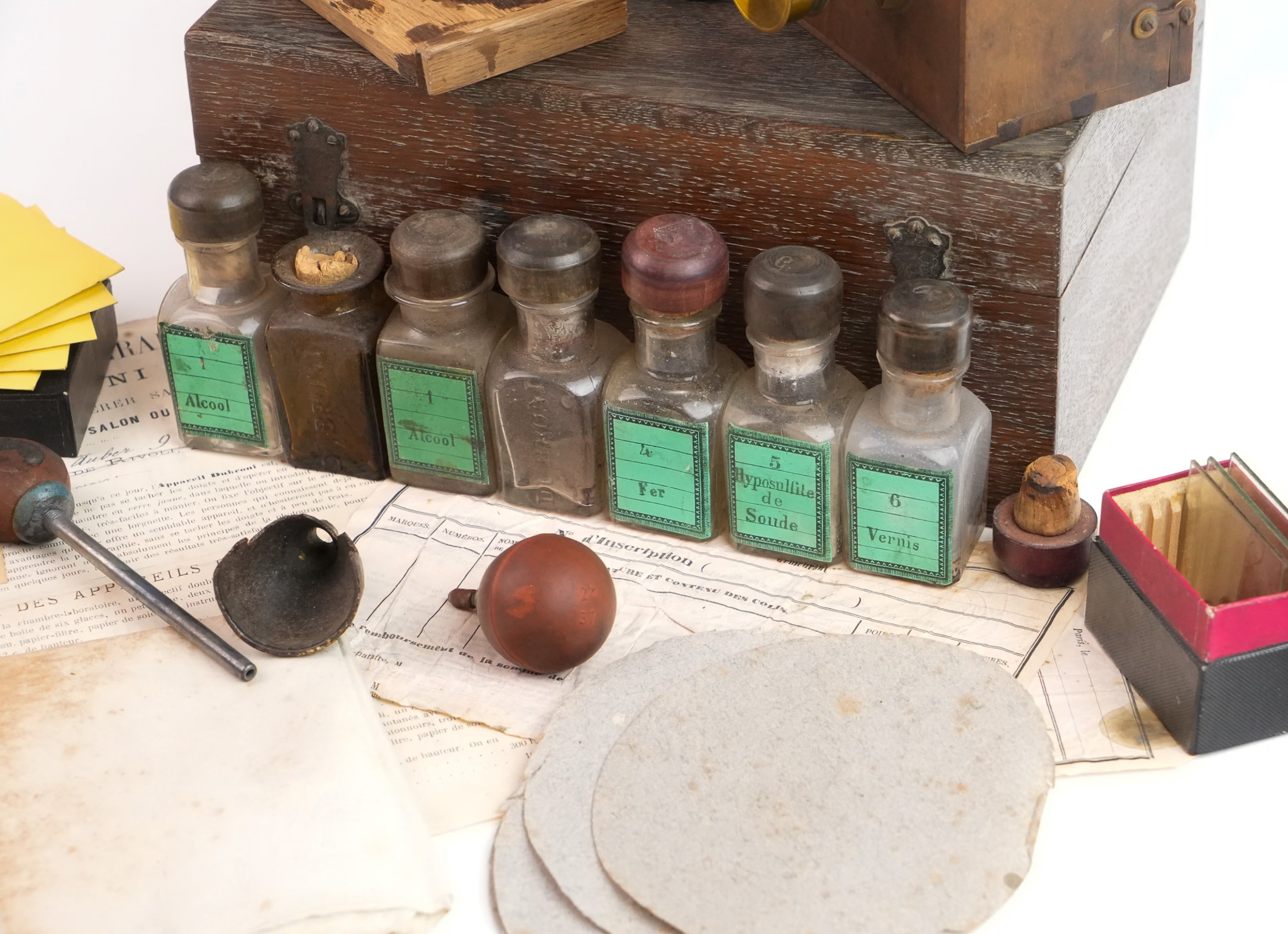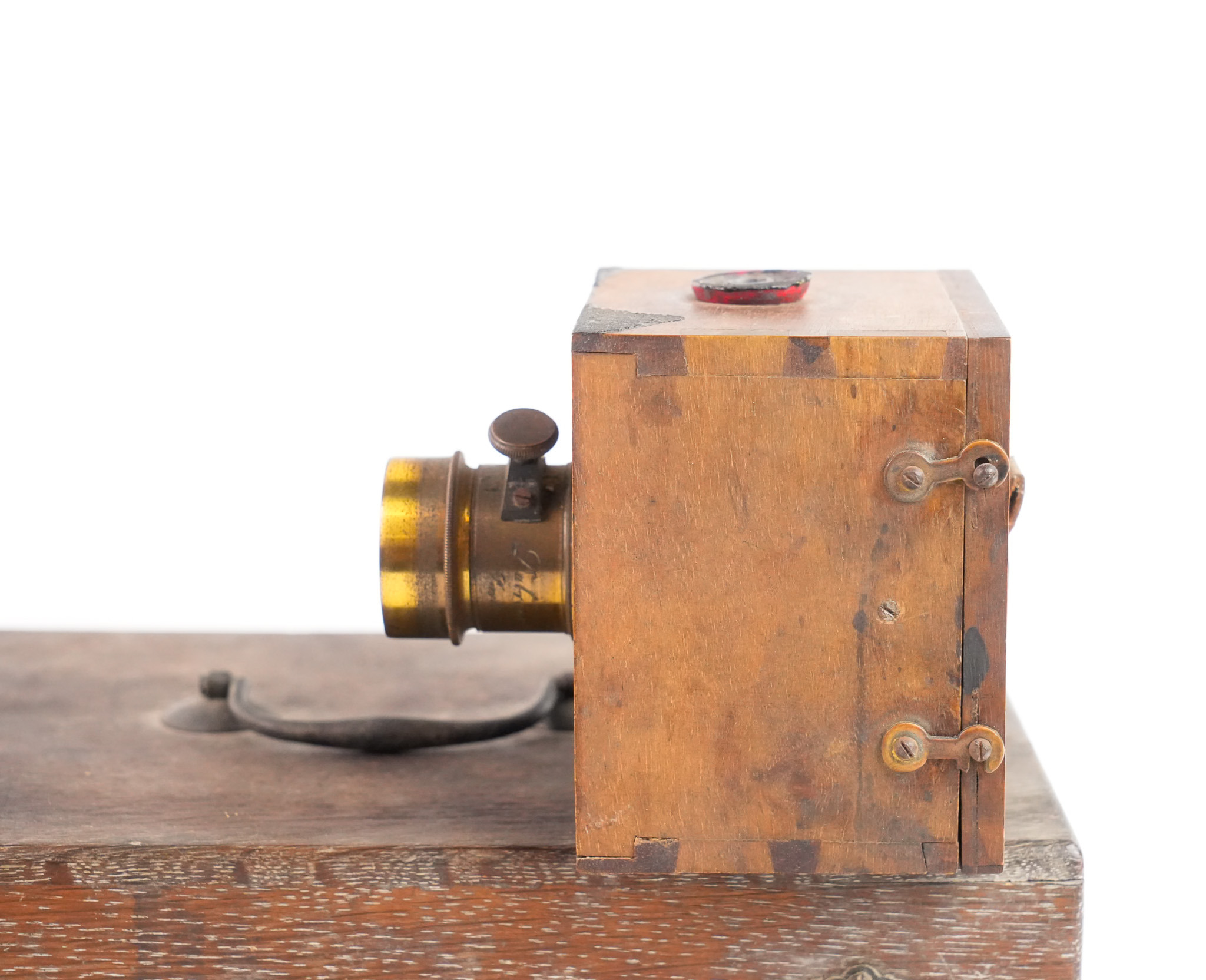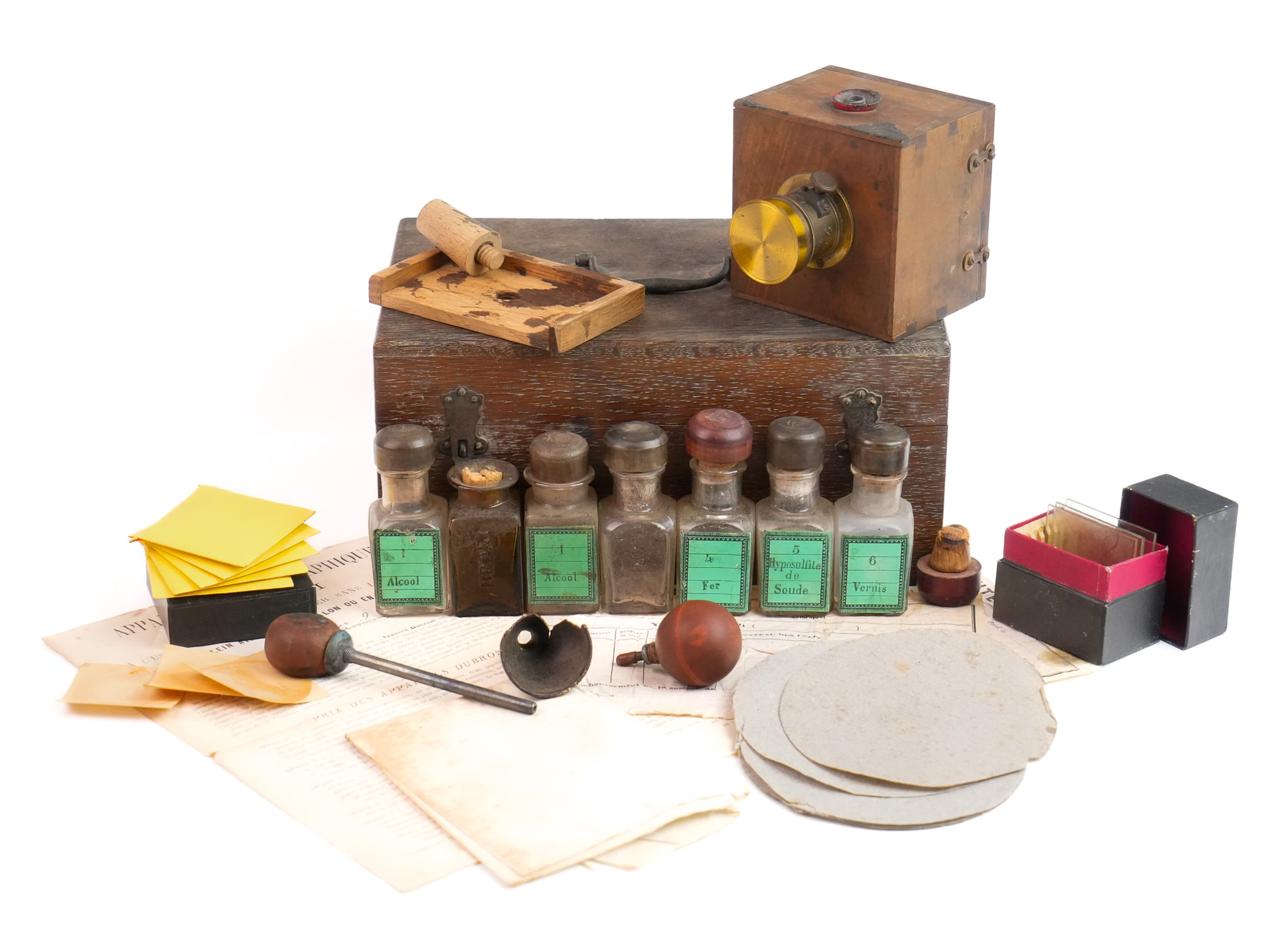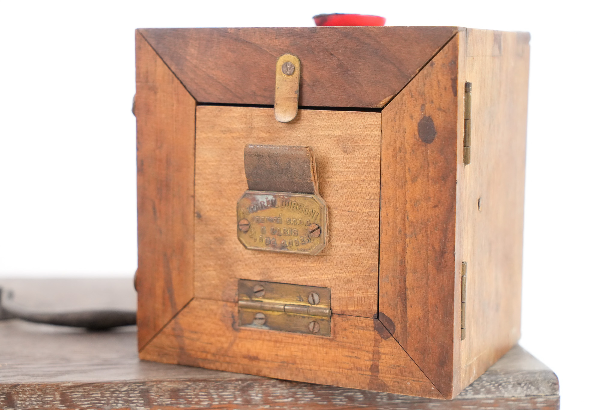 Rare « Photographe de Poche » de Jules Bourdin, appareil DUBRONI Modèle 2a dans son coffret en bois de chêne. Rabat cartonné vert portant les inscriptions. Appareil laboratoire avec bouteille interne en verre jaune orangé. Format circulaire de 4 cm de diamètre. Verre inactinique orangé protégé par volet pivotant portant inscriptions de la raison sociale au 9 rue Aubert à Paris à cette adresse en . (Commercialisation en 1864 à cette adresse). L’appareil est équipé d’un objectif à portrait Darlot. Le coffret renferme sept flacons en verre fermés par bouchon en buis noirci numéroté (numéros de 1 à7). Présence de deux pipettes avec poire caoutchouc, d'un entonnoir (en l’état), d’une boite contenant des glaces, d’une boite à rainures et de la petite tablette an bois recevant l’appareil ; le petit embout conique sert à la fixer sur un bougeoir faisant alors fonction de pied. La notice est également présente. Rare ensemble de collection dans cet état, complet de toutes ses pièces et accessoires.