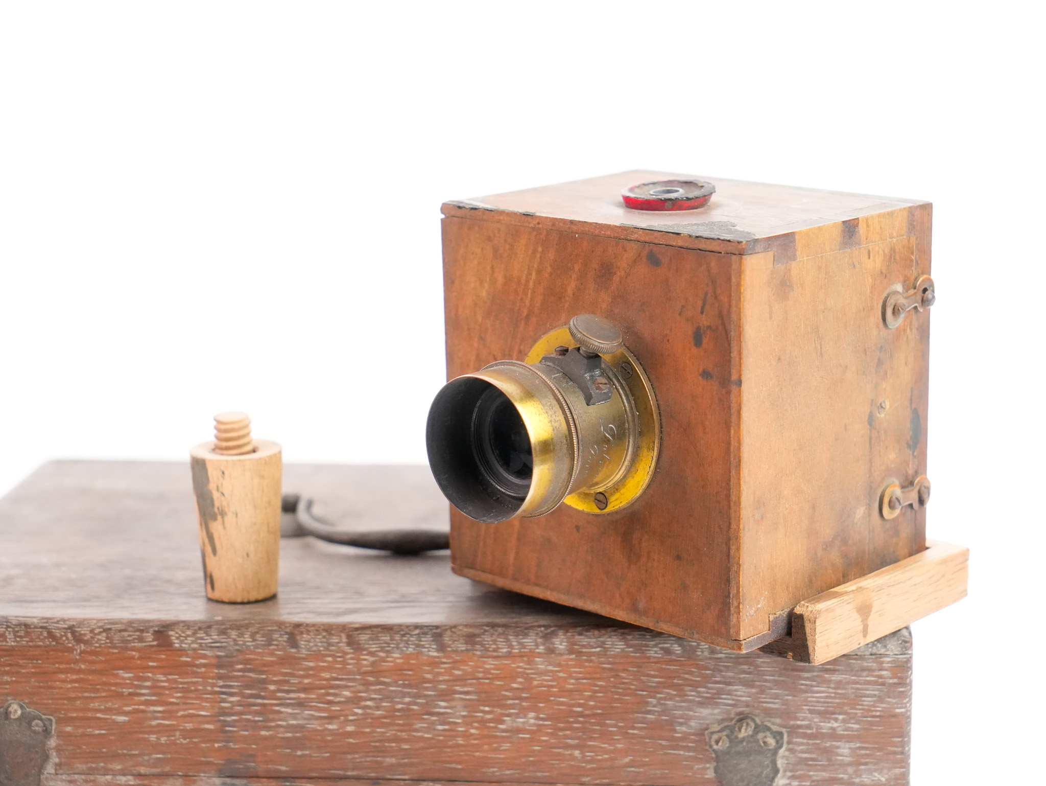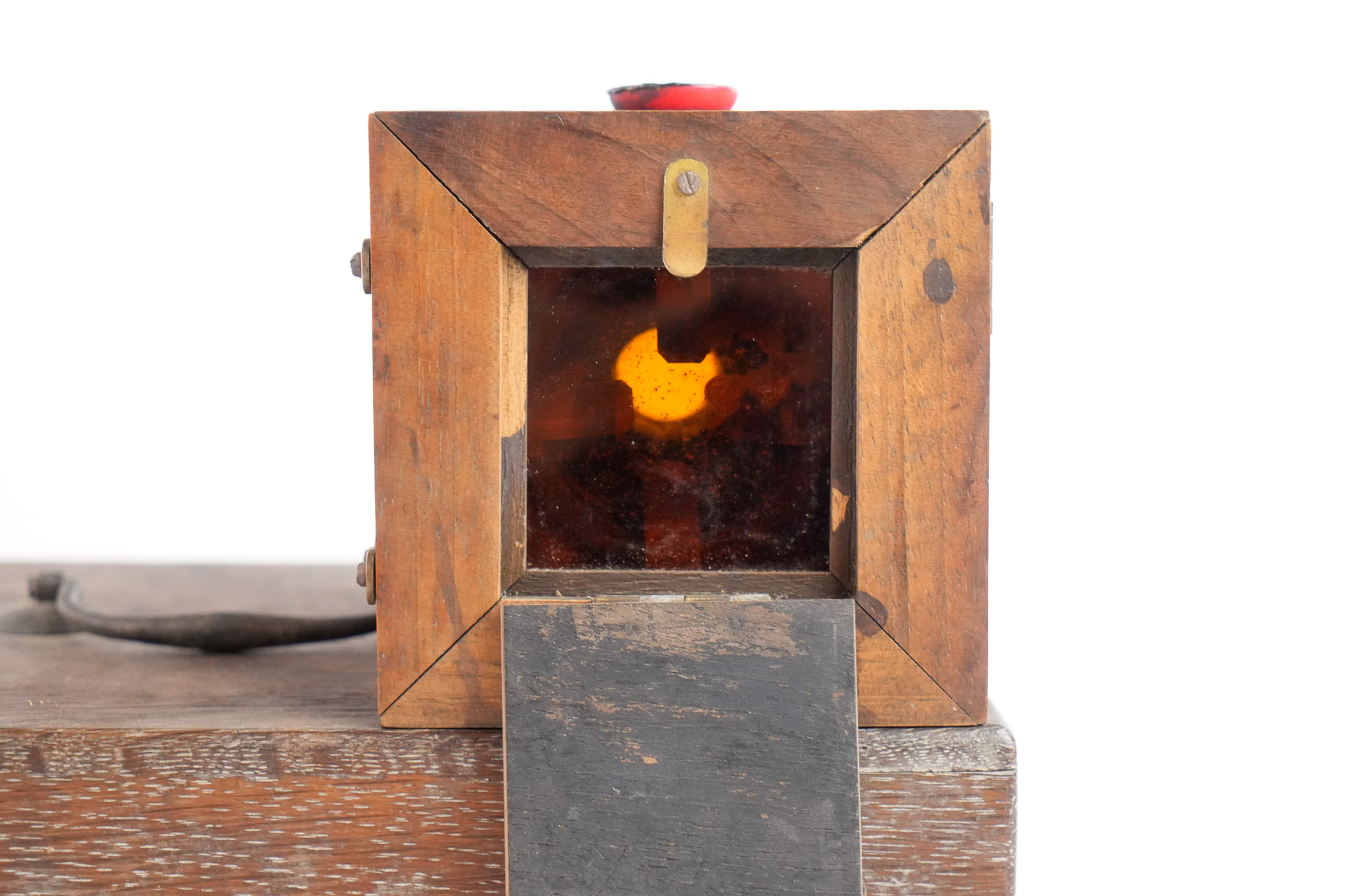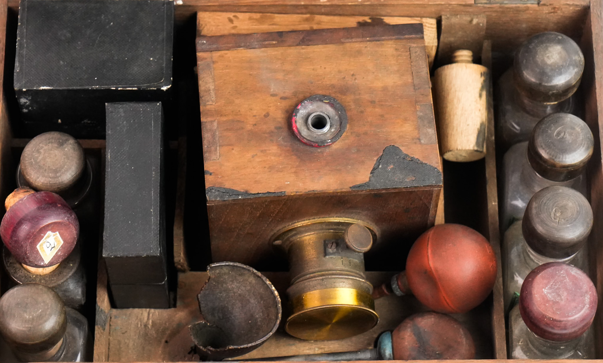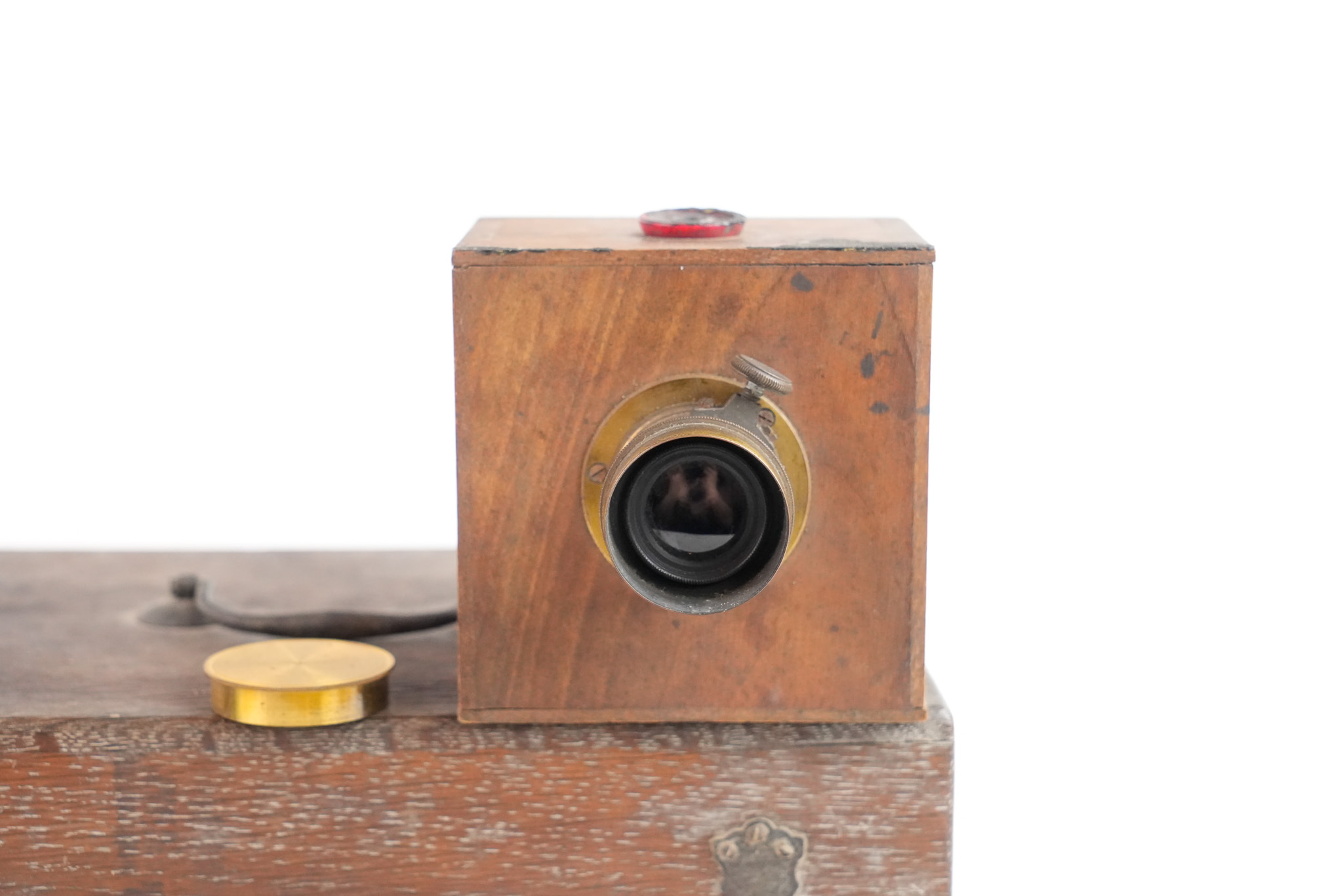 Rare « Photographe de Poche » de Jules Bourdin, appareil DUBRONI Modèle 2a dans son coffret en bois de chêne. Rabat cartonné vert portant les inscriptions. Appareil laboratoire avec bouteille interne en verre jaune orangé. Format circulaire de 4 cm de diamètre. Verre inactinique orangé protégé par volet pivotant portant inscriptions de la raison sociale au 9 rue Aubert à Paris à cette adresse en . (Commercialisation en 1864 à cette adresse). L’appareil est équipé d’un objectif à portrait Darlot. Le coffret renferme sept flacons en verre fermés par bouchon en buis noirci numéroté (numéros de 1 à7). Présence de deux pipettes avec poire caoutchouc, d'un entonnoir (en l’état), d’une boite contenant des glaces, d’une boite à rainures et de la petite tablette an bois recevant l’appareil ; le petit embout conique sert à la fixer sur un bougeoir faisant alors fonction de pied. La notice est également présente. Rare ensemble de collection dans cet état, complet de toutes ses pièces et accessoires.