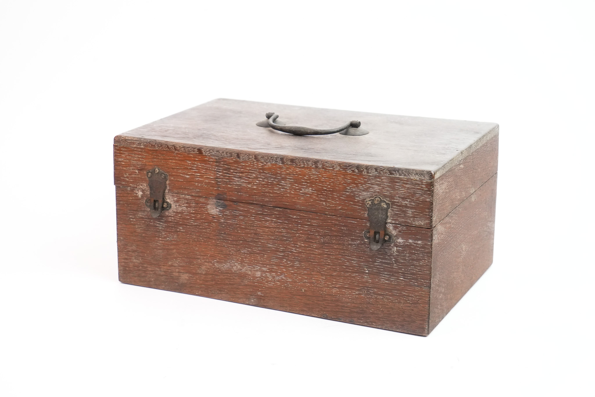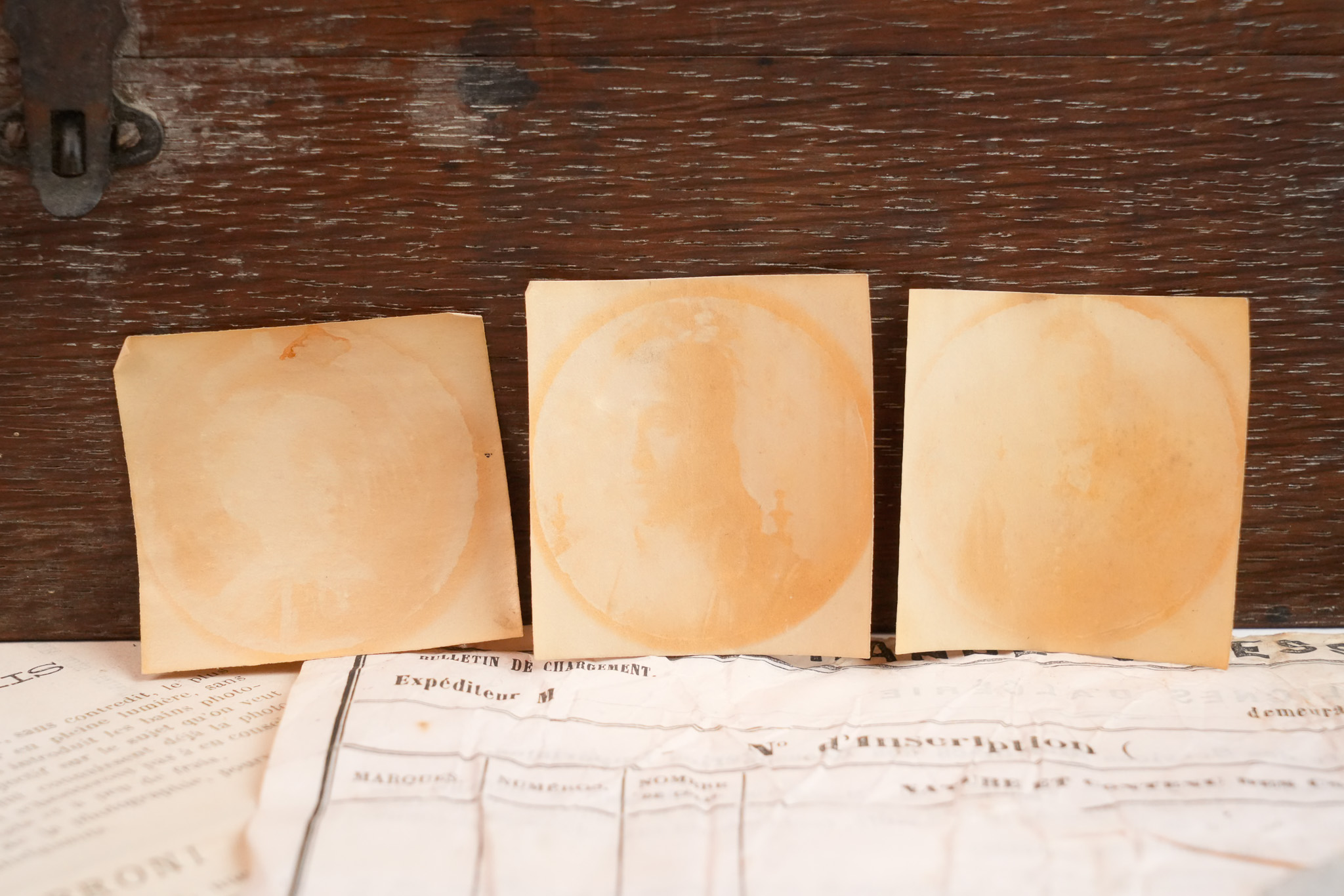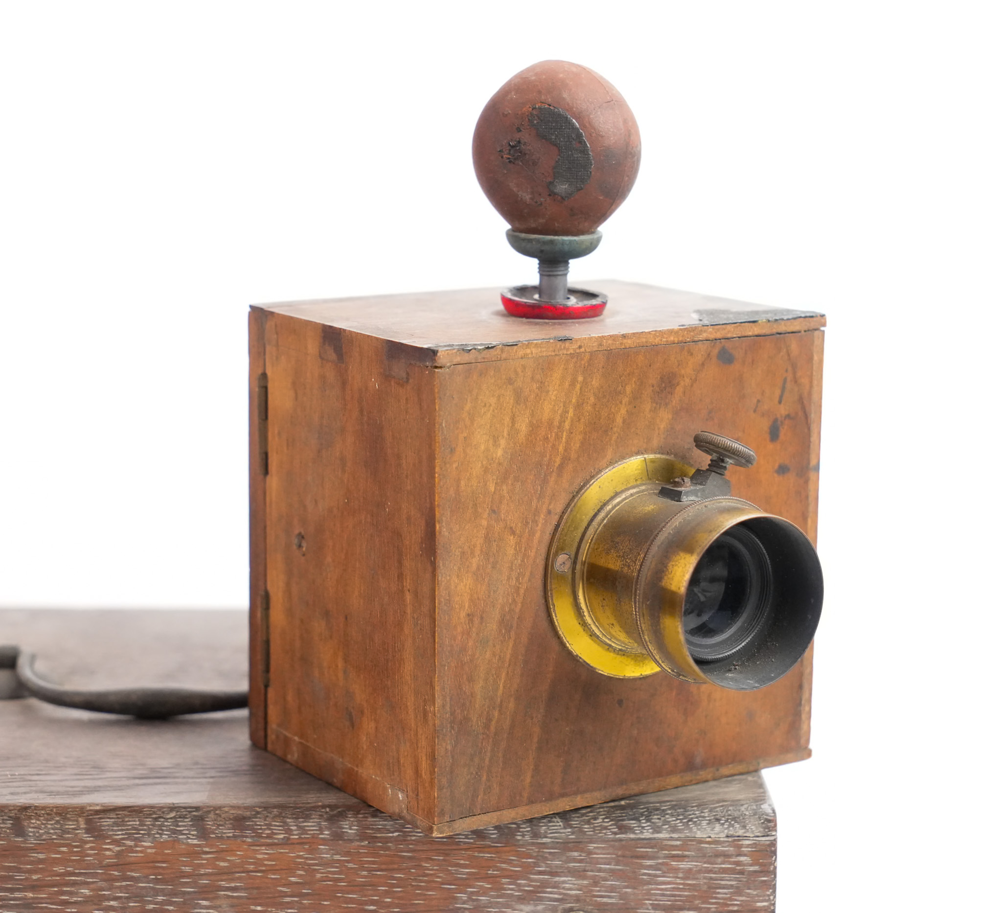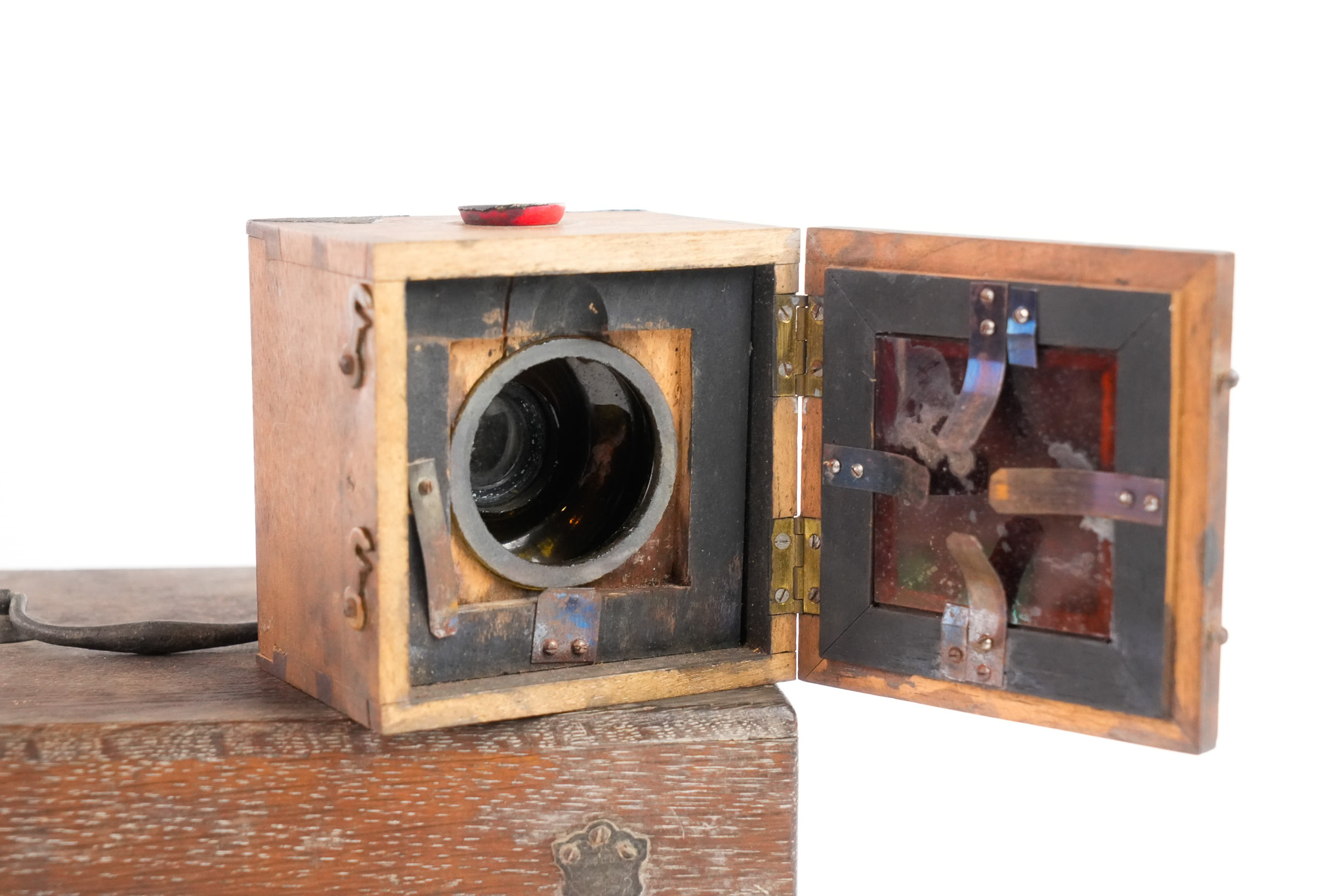 Rare « Photographe de Poche » de Jules Bourdin, appareil DUBRONI Modèle 2a dans son coffret en bois de chêne. Rabat cartonné vert portant les inscriptions. Appareil laboratoire avec bouteille interne en verre jaune orangé. Format circulaire de 4 cm de diamètre. Verre inactinique orangé protégé par volet pivotant portant inscriptions de la raison sociale au 9 rue Aubert à Paris à cette adresse en . (Commercialisation en 1864 à cette adresse). L’appareil est équipé d’un objectif à portrait Darlot. Le coffret renferme sept flacons en verre fermés par bouchon en buis noirci numéroté (numéros de 1 à7). Présence de deux pipettes avec poire caoutchouc, d'un entonnoir (en l’état), d’une boite contenant des glaces, d’une boite à rainures et de la petite tablette an bois recevant l’appareil ; le petit embout conique sert à la fixer sur un bougeoir faisant alors fonction de pied. La notice est également présente. Rare ensemble de collection dans cet état, complet de toutes ses pièces et accessoires.