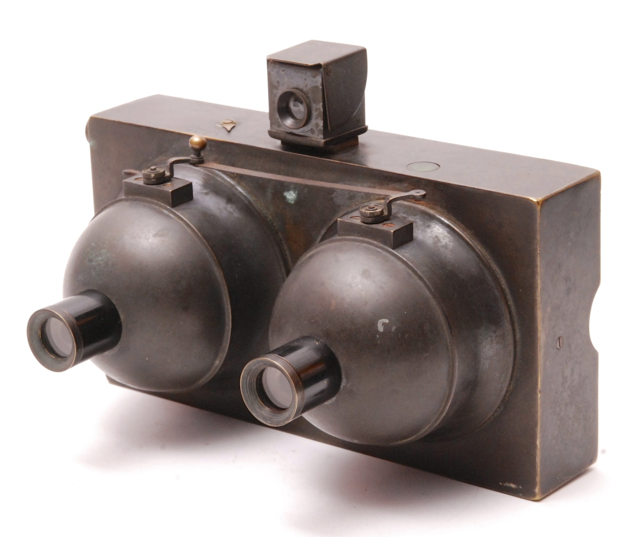 Très rare exemplaire du Photosphère stéréoscopique inventé par napoléon Conti et proposé par la Compagnie Française de Photographie, au format 9x18 cm. L'appareil possède un niveau. les deux obturateurs hémisphériques sont couplés par une barrette. La construction est tout en cuivre, argenté et oxydé. Mise au point hélicoïdale des objectifs. Viseur sur l'appareil.
