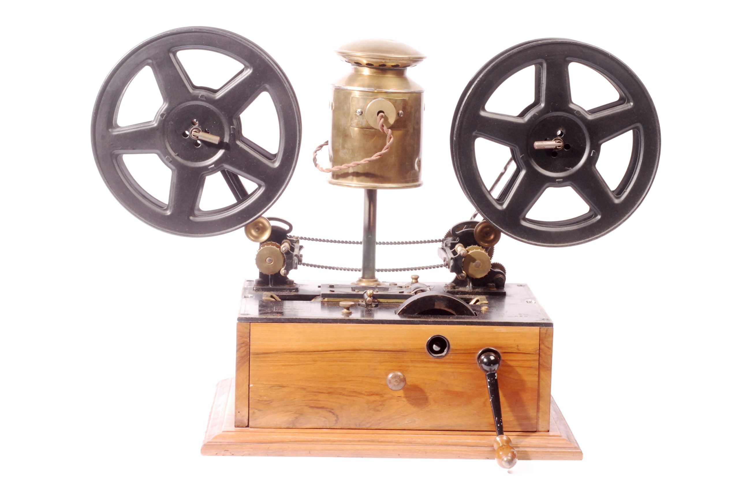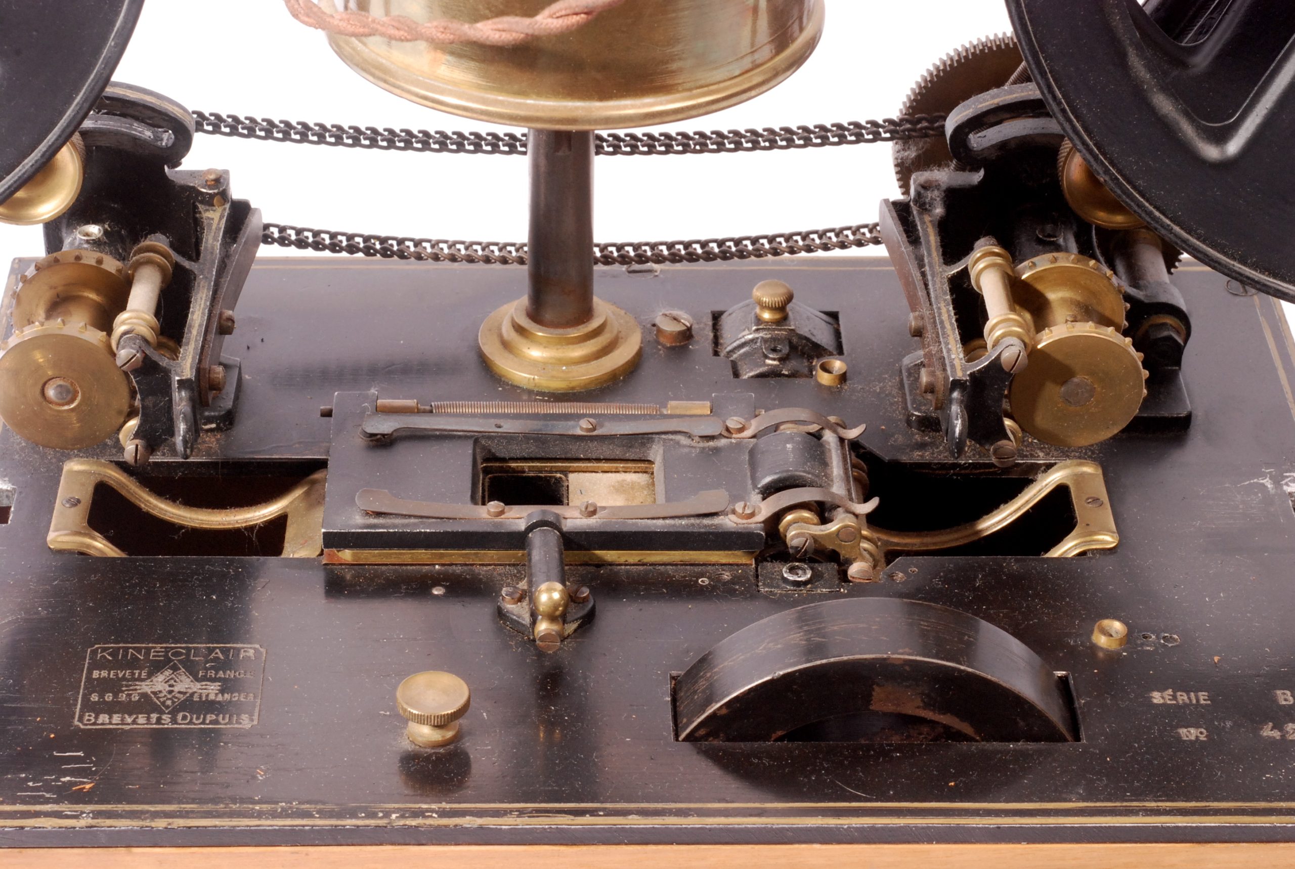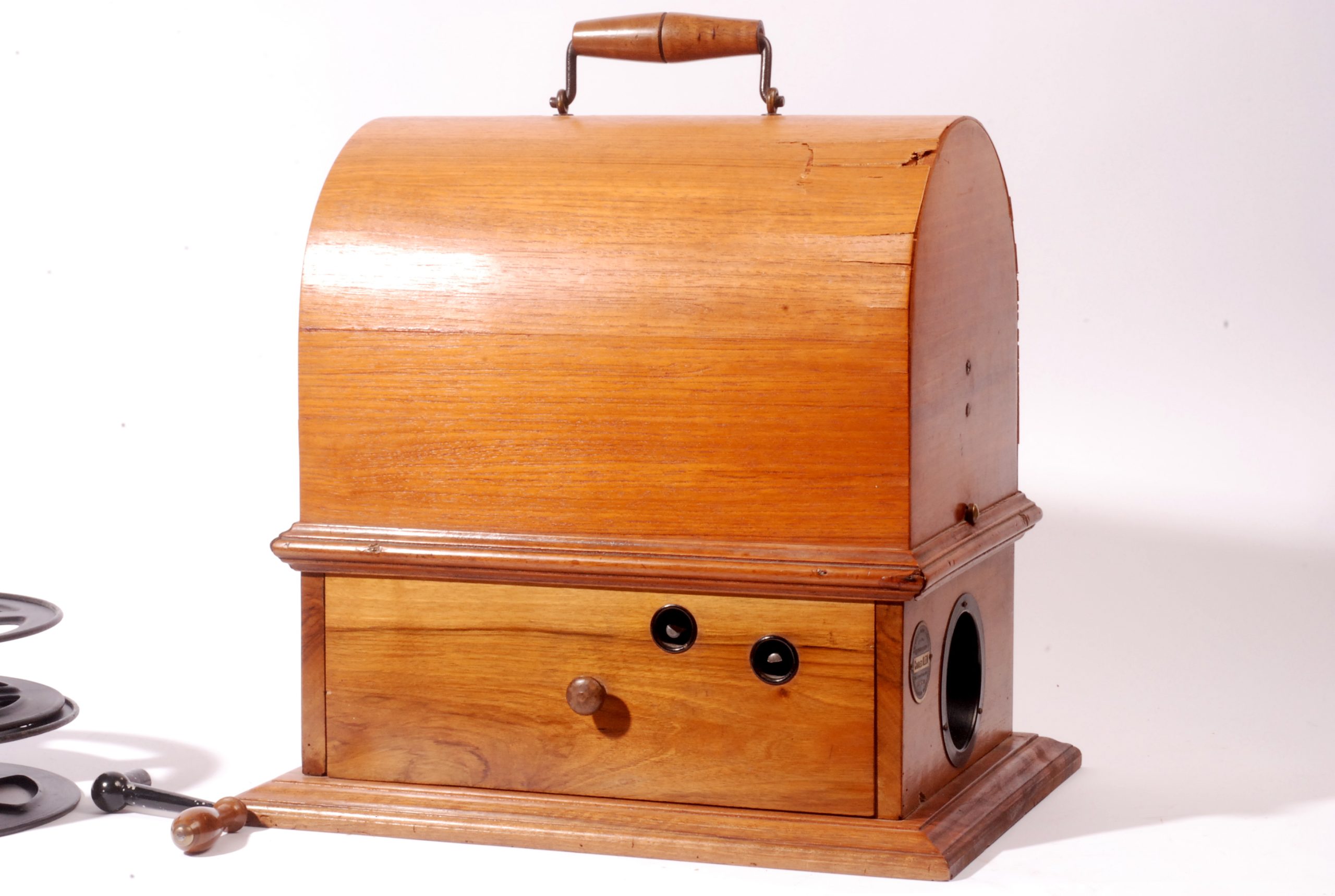 Curieux et rare projecteur de salon Kineclair en forme de phonographe, dans sa caisse fermée, commercialisé par Eclair en 1913 et inventé par Charles Dupuis. Le film défile horizontalement, éclairé par une source lumineuse verticale.