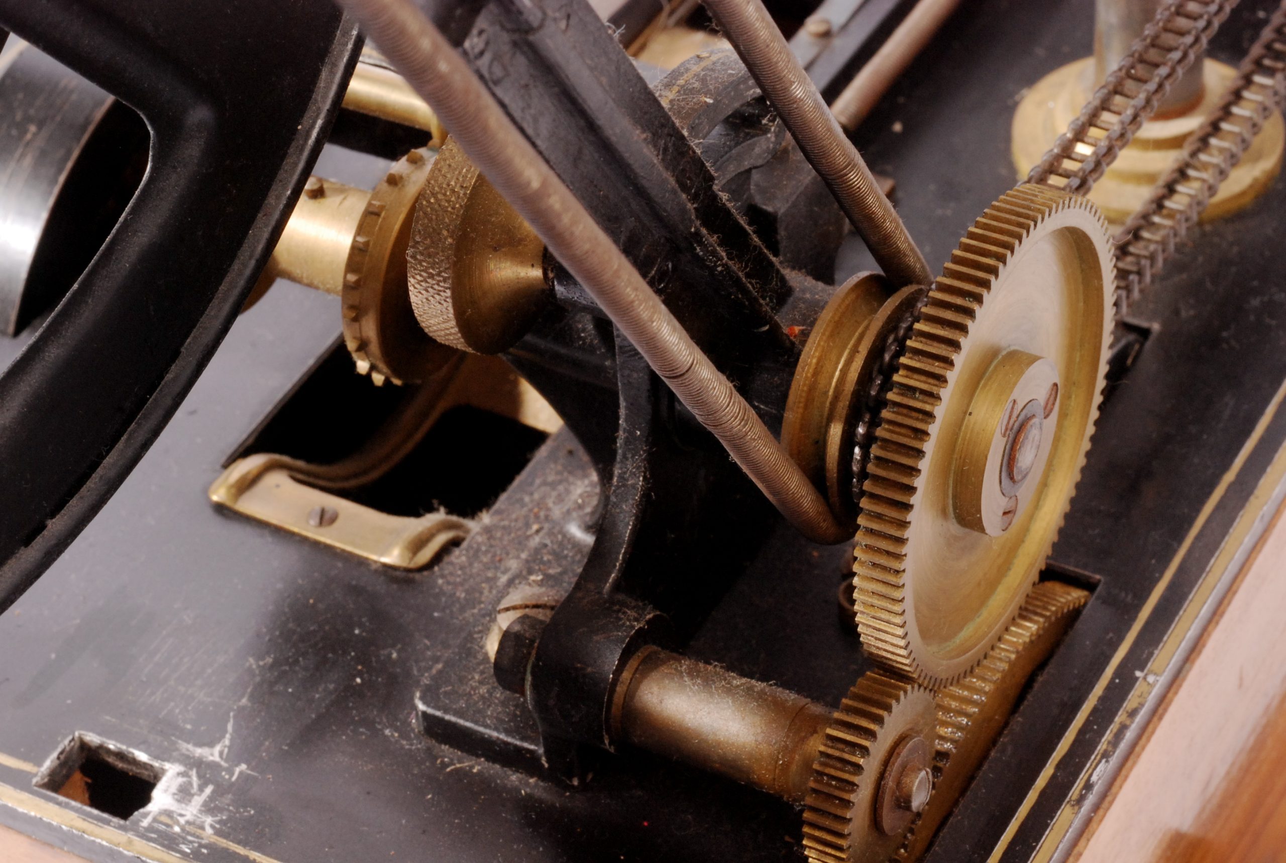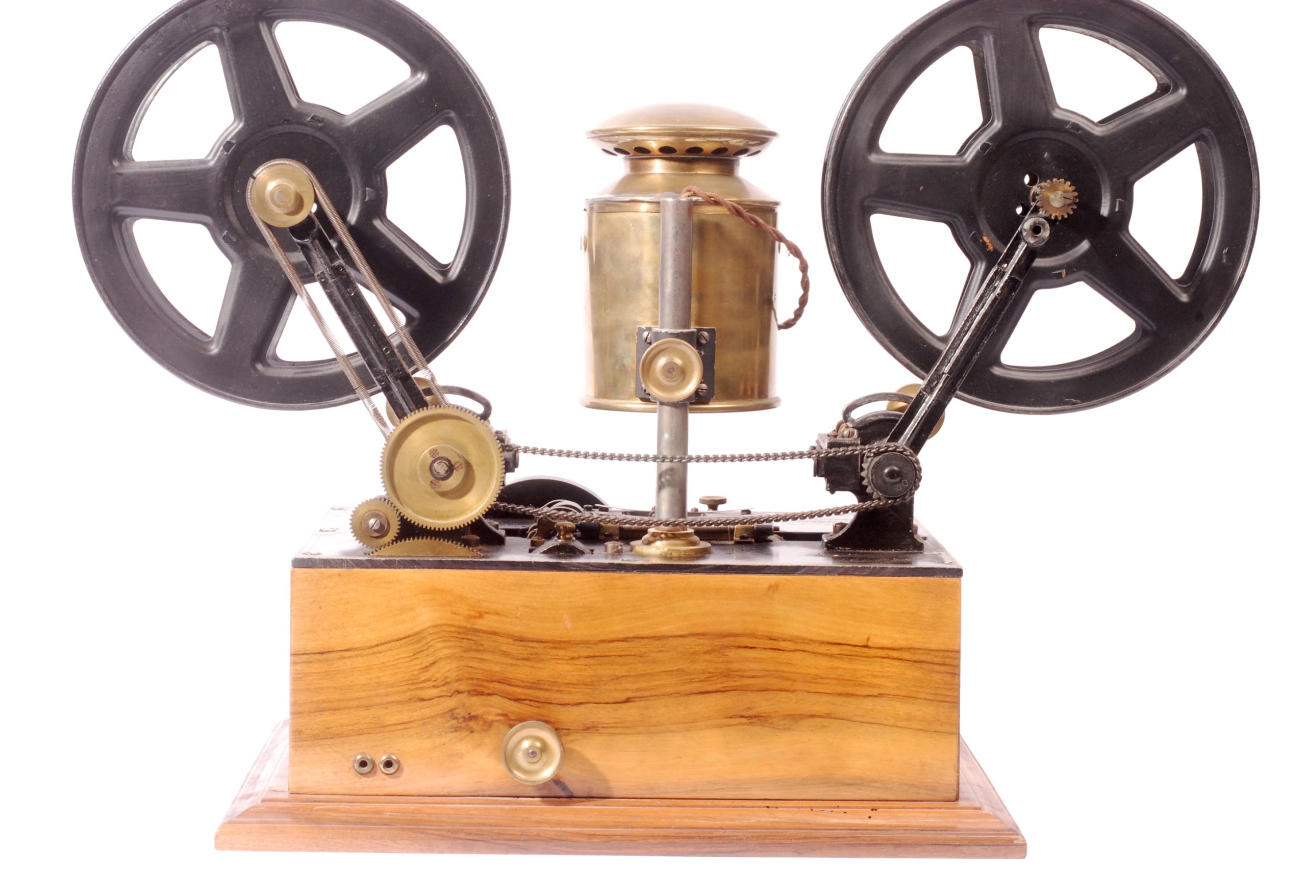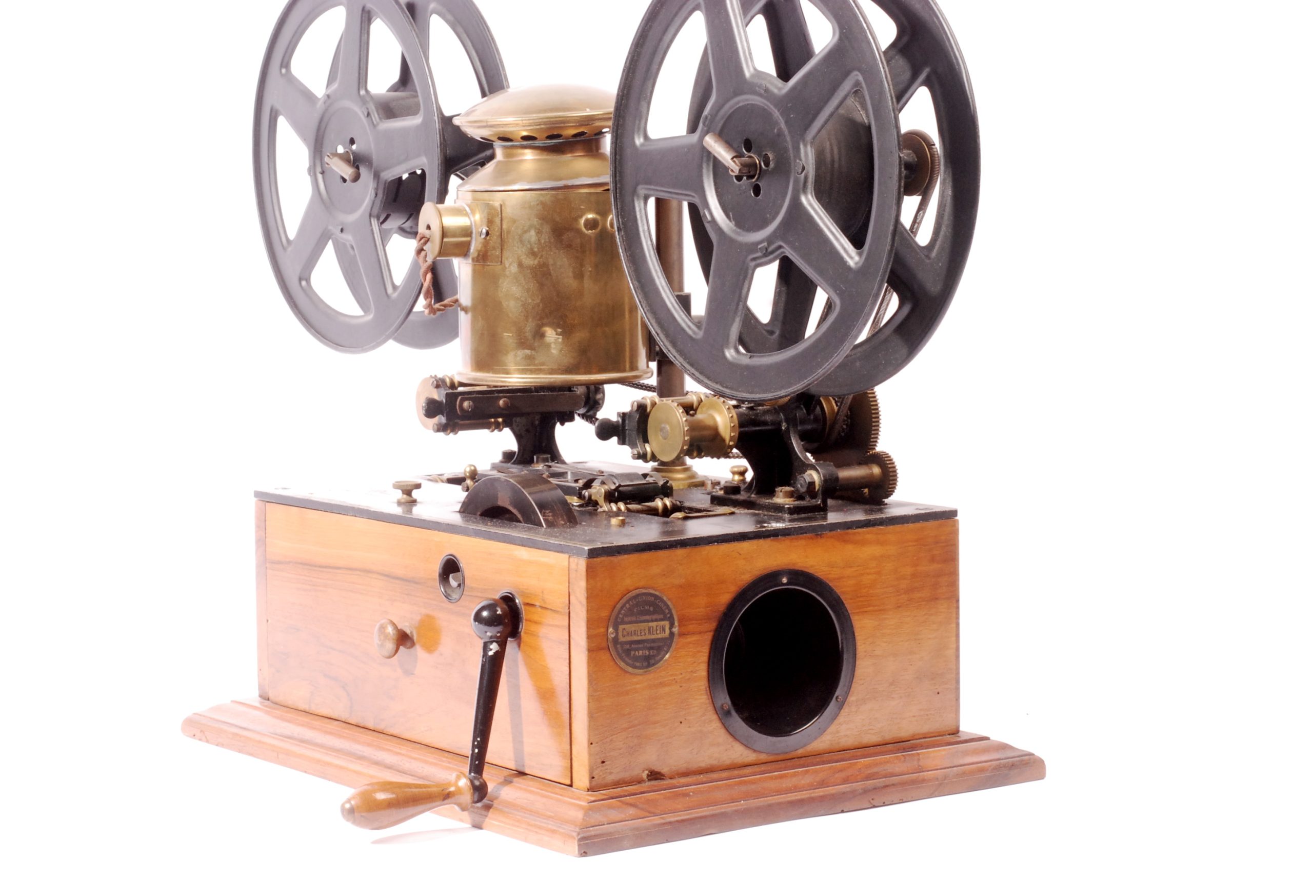 Curieux et rare projecteur de salon Kineclair en forme de phonographe, dans sa caisse fermée, commercialisé par Eclair en 1913 et inventé par Charles Dupuis. Le film défile horizontalement, éclairé par une source lumineuse verticale.