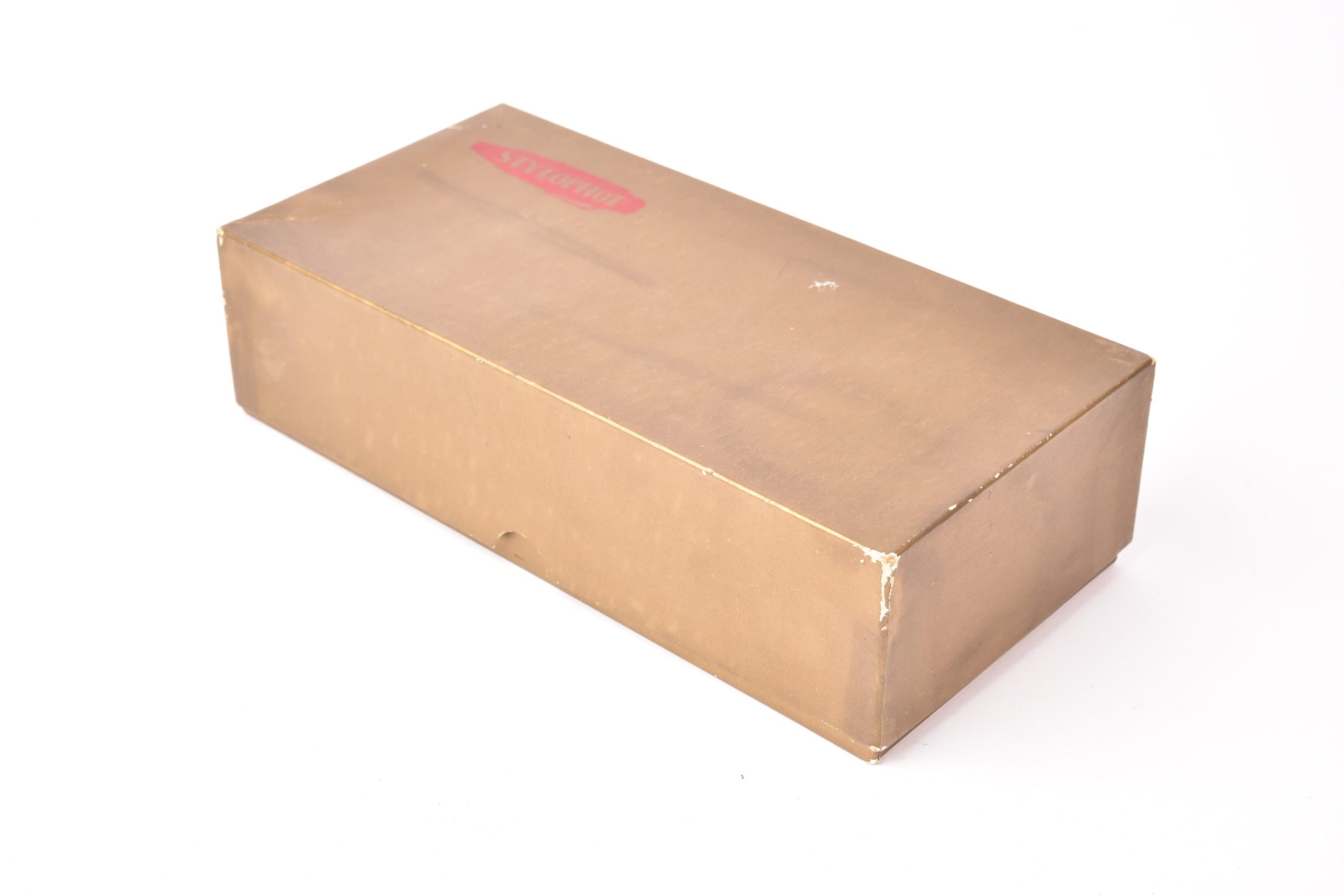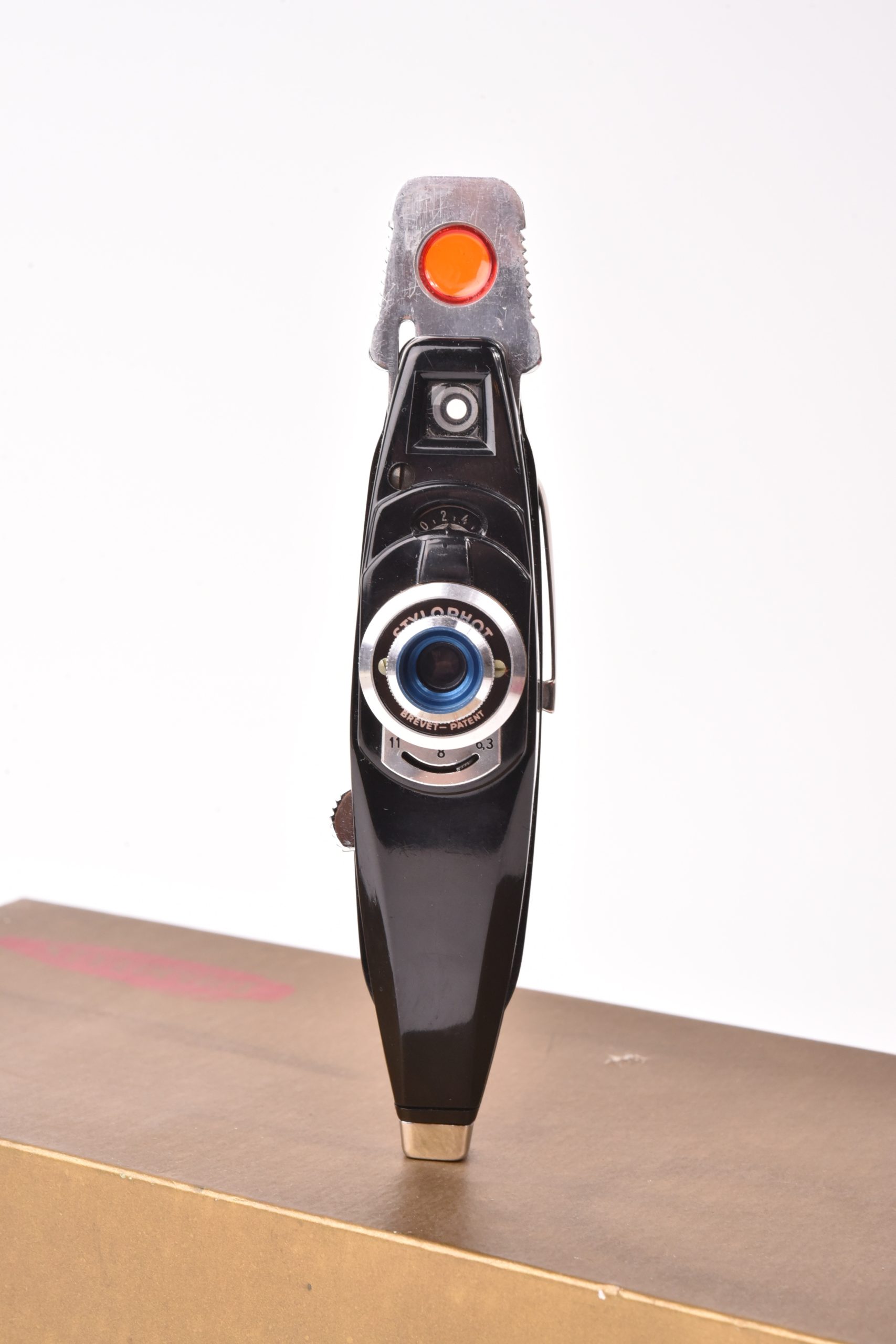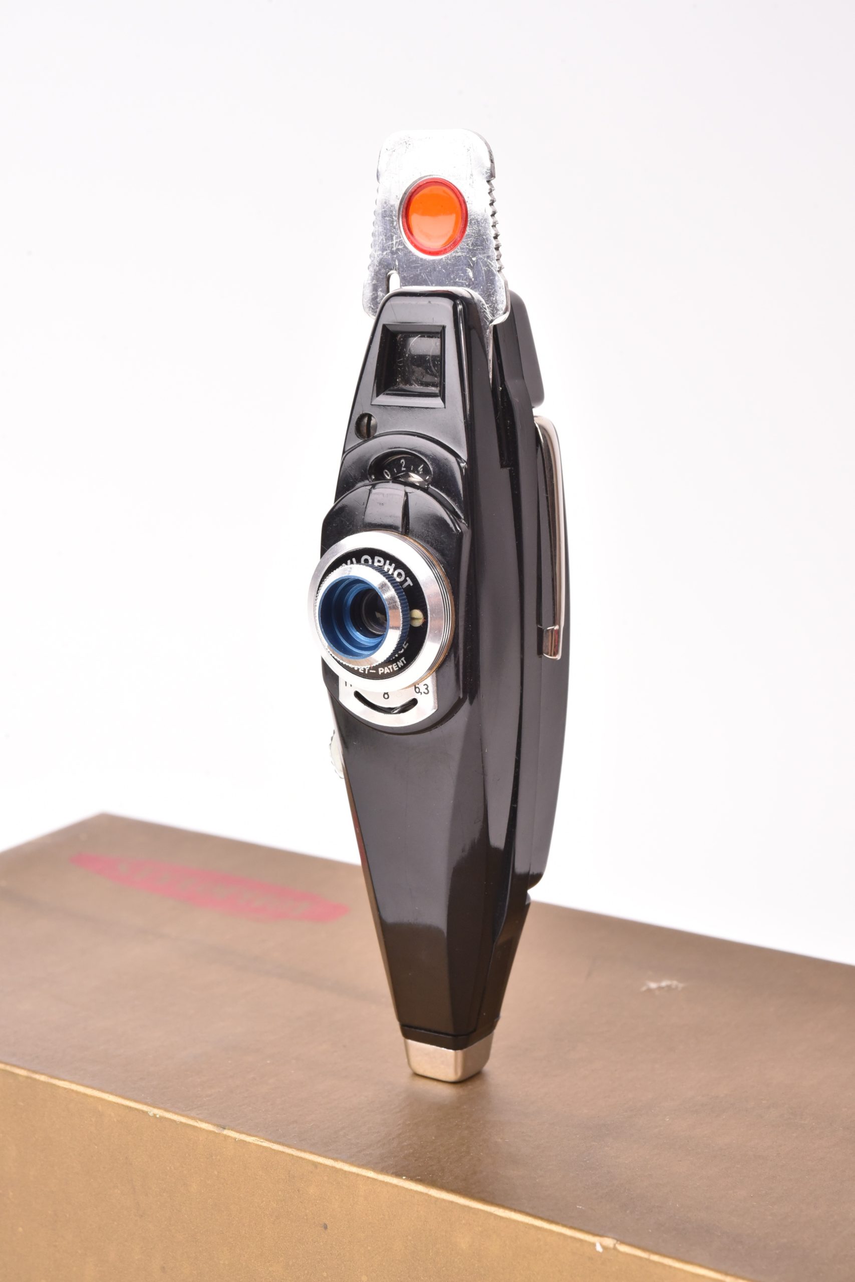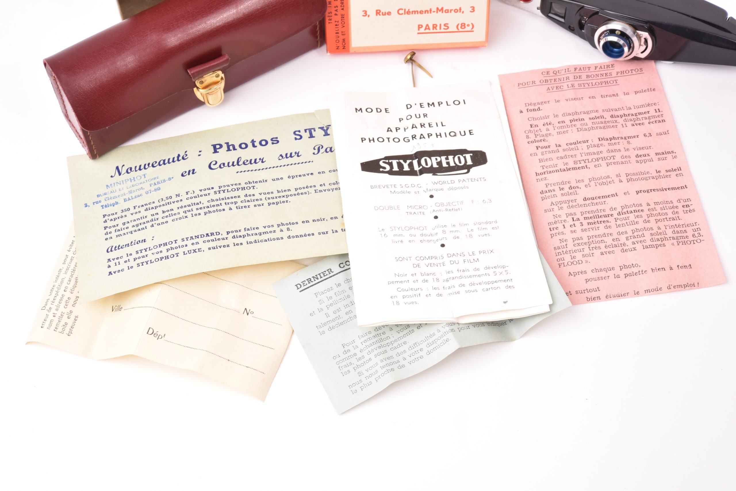 The Stylophot is a pocketable mini camera which takes 16mm film. The pictures are 10 x 10 mm, one roll allows for 18 exposures. The lens is a fixed focus 27mm f/6.3. The featured complete set comprises the pen-camera, a lens extension, instructions and various leaflets as well as a carrying case and cardboard box.